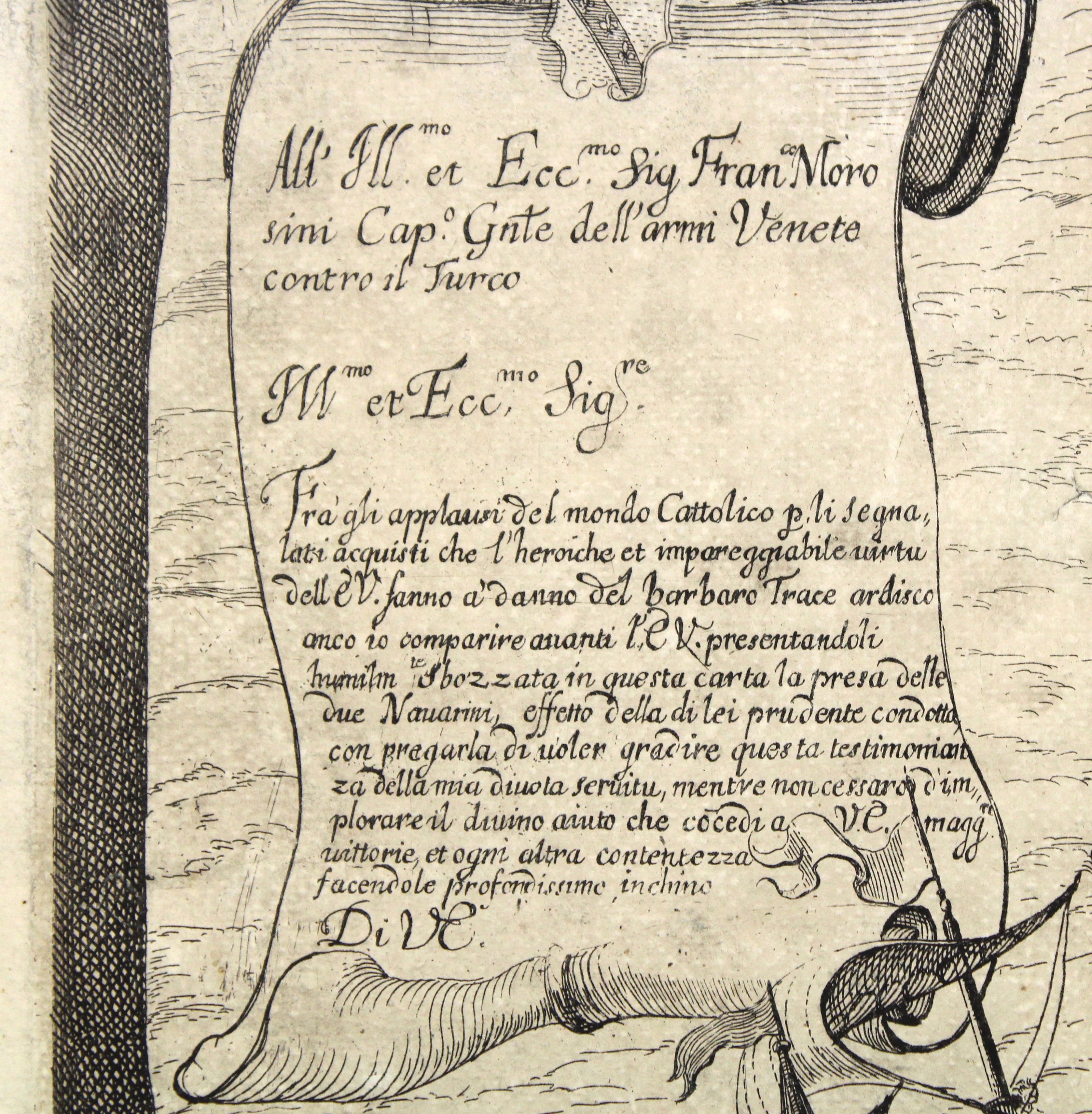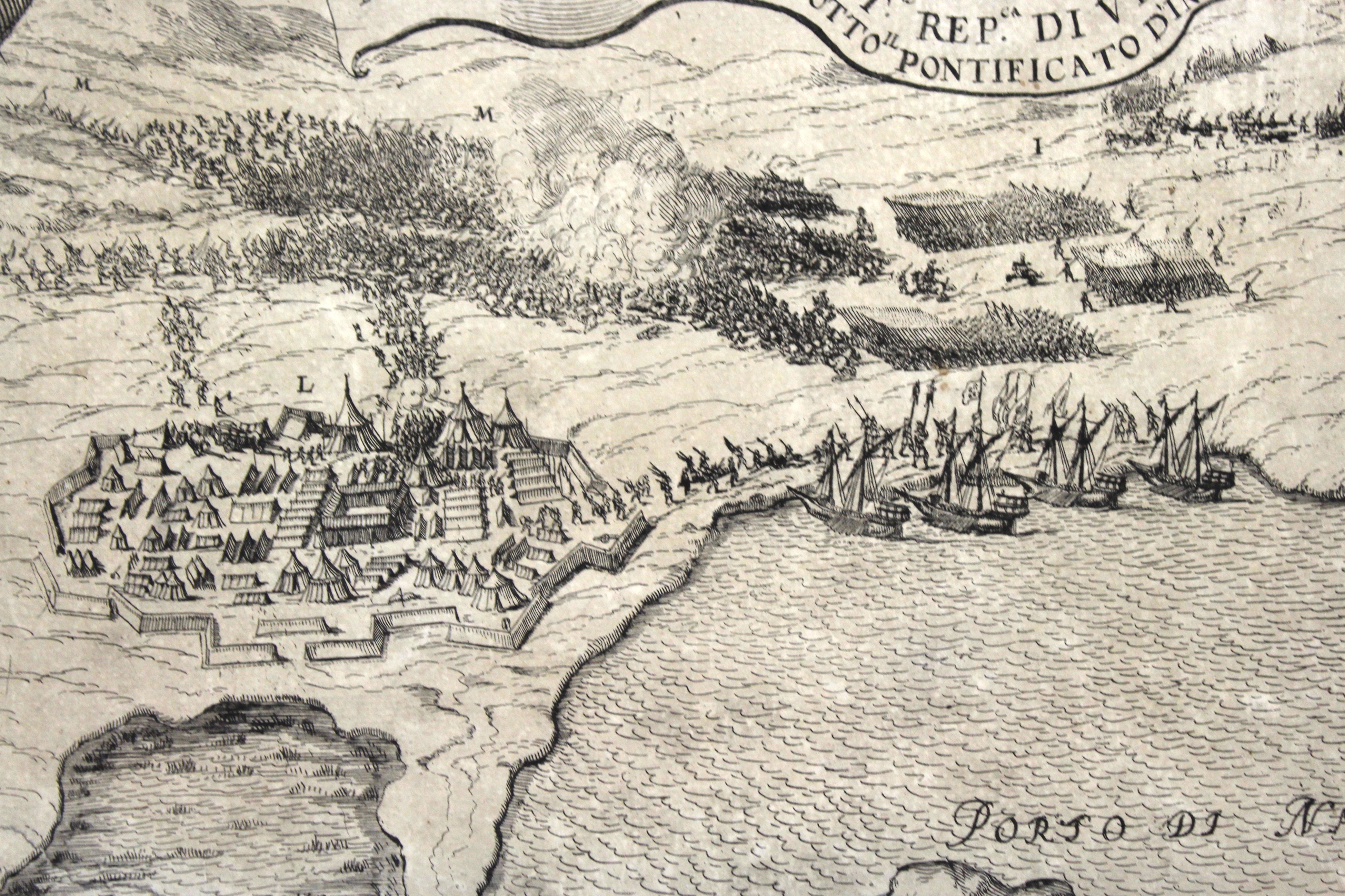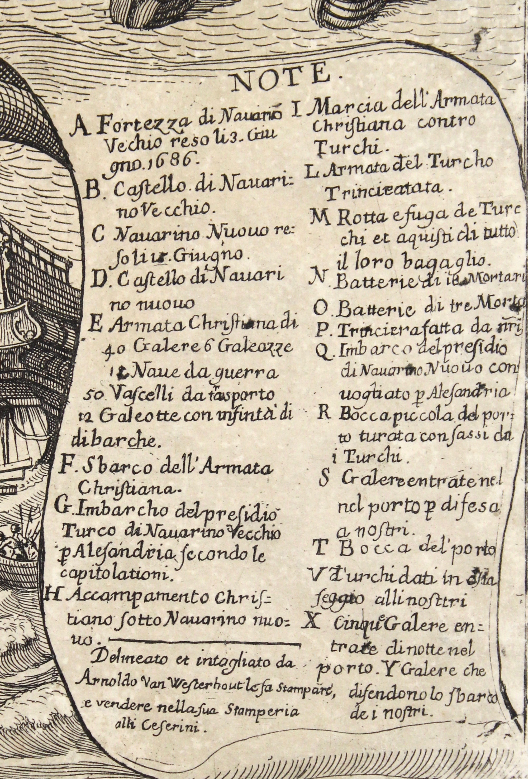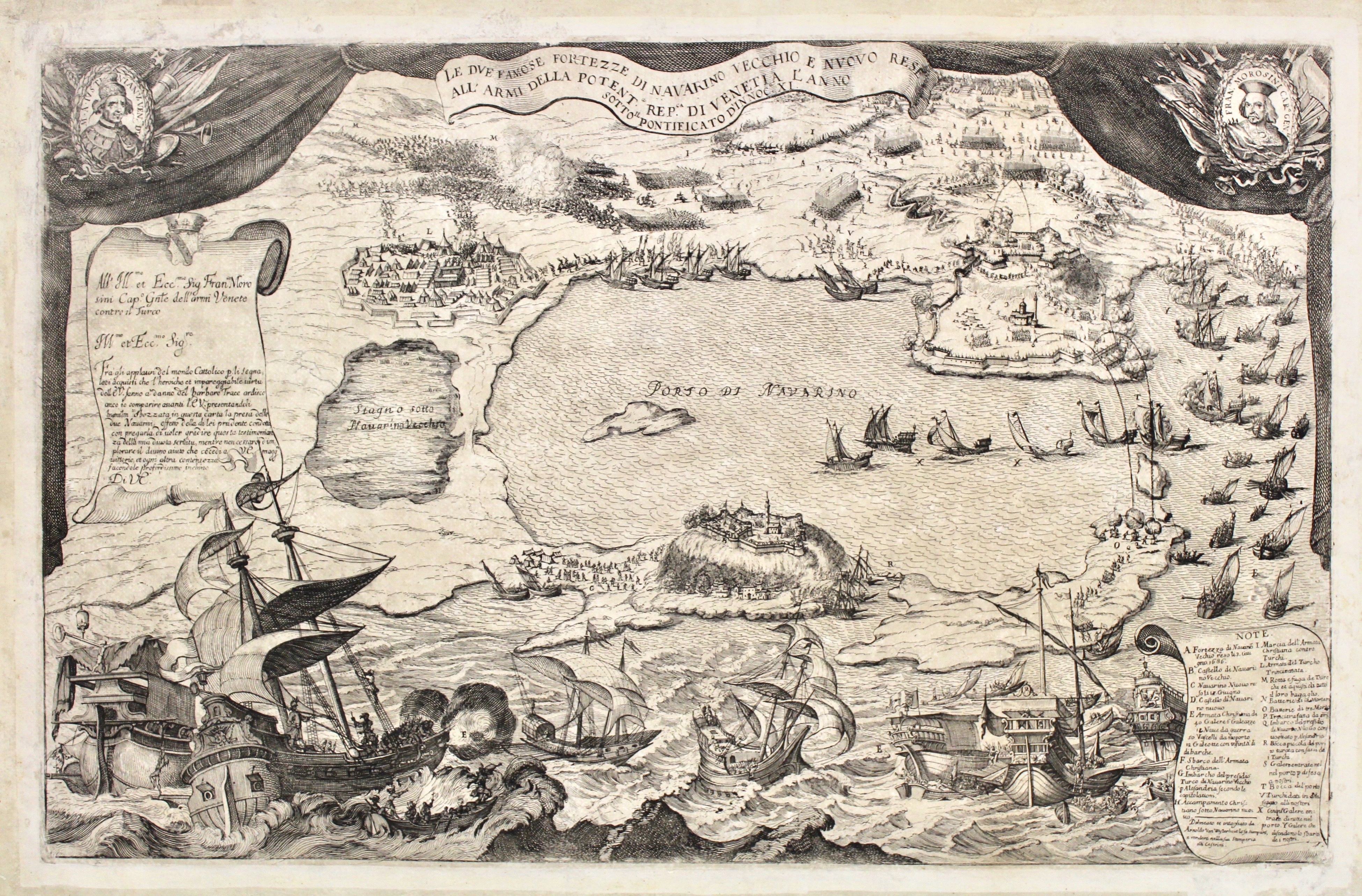 Splendida scenografica stampa d’occasione, pubblicata singolarmente, ma nell’ambito di una serie sulle battaglie contro i turchi; celebra la grande vittoria navale veneziana contro l’Impero Ottomano, battaglia svoltasi nel contesto della guerra Austro-Turca combattuta dalla Lega Santa fra il 1684 e il 1699 con cui la Serenissima contese la Morea ai Turchi. Il 4 giugno 1686 il veneziano Francesco Morosini che al comando di un gruppo di spedizione cristiano aveva occupato il giorno prima Navarino Vecchio, impegna violenta battaglia contro i turchi a Navarino Nuovo e uscito vittorioso si impossessa di quell’ importante porto. La guerra di Morea fu l'ultima grande campagna espansionistica della Serenissima e si concluse con la pace di Carlowitz nel 1699, che sancì la vittoria della Lega Santa e, tra l'altro, la cessione della Morea ai Veneziani. Apparentemente molto rara, siamo riusciti a localizzare solo una copia presso il museo nazionale istorico di Atene ed una presso la Australian Library, oltre ad una copia mutila in pessime condizioni in una vendita in asta.