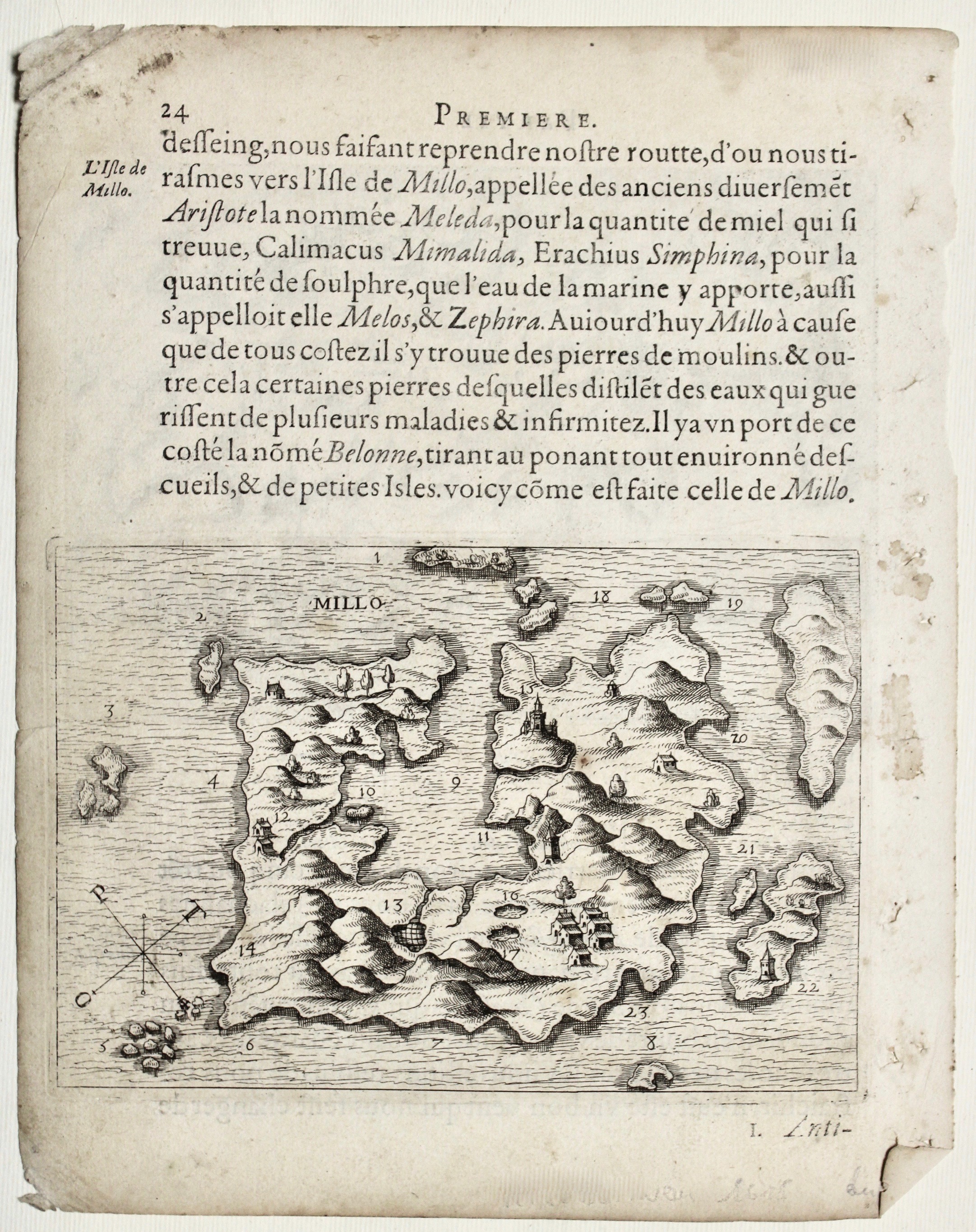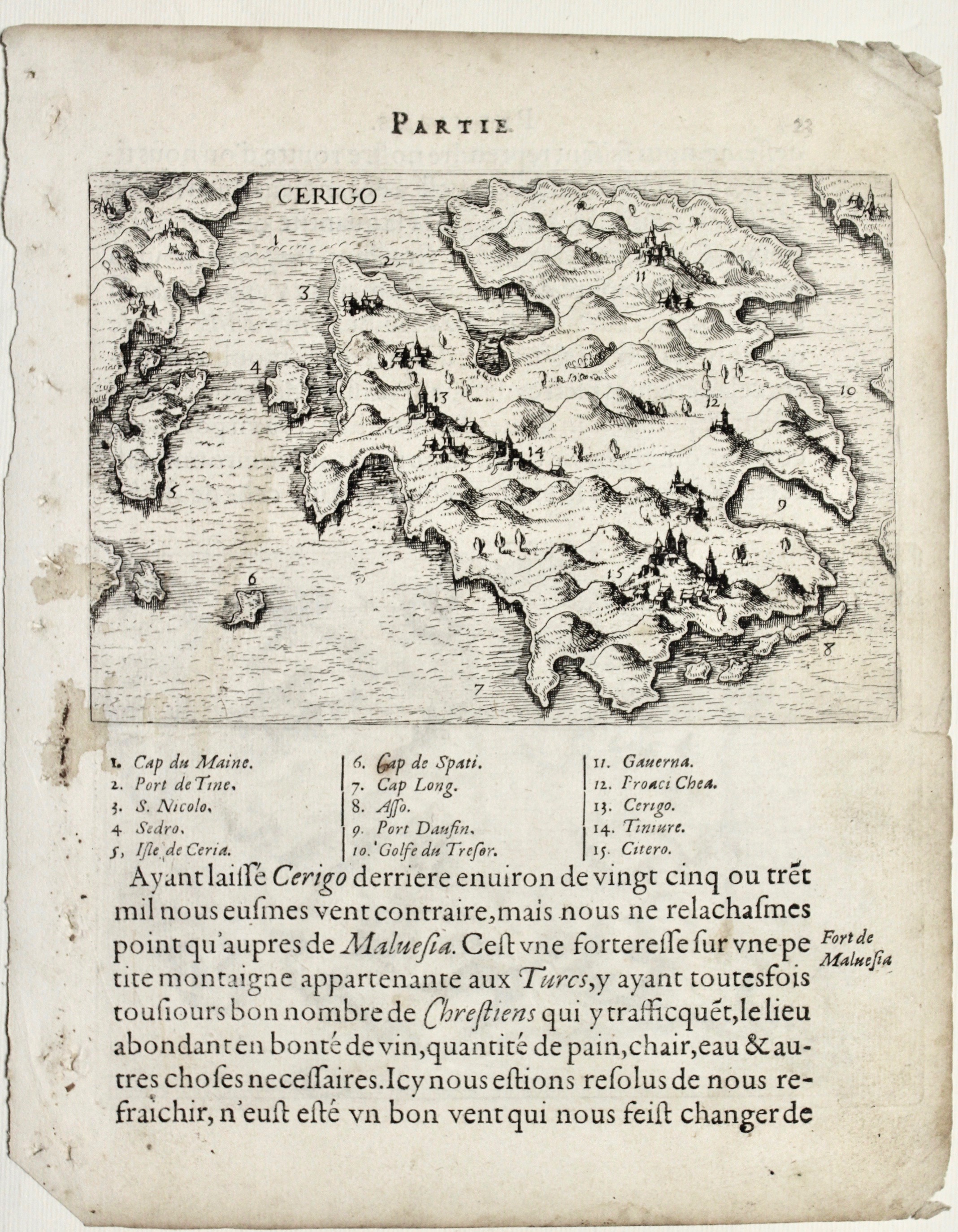 Incisione in rame su foglio mm 230x180, lastra mm 110x155, di Jean Appier Hanzelet tratta da «Relation journaliere du voyage du levant faict & descrit…» L’incisione inserita nel testo francese, riguarda l’isola di Milo ed al verso l’isola di Cerigo.