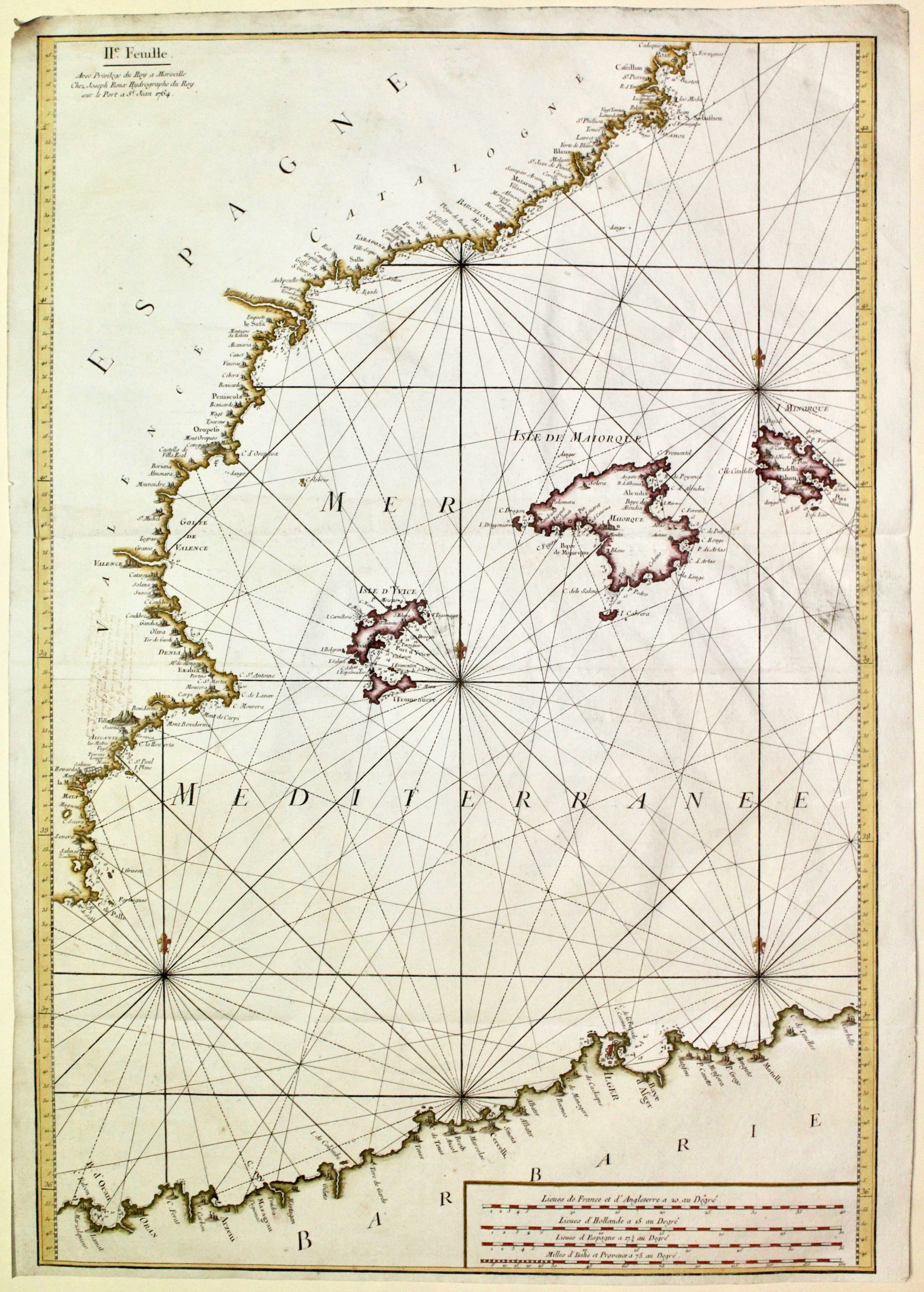 Incisione in rame, mm 805x555. Ottimo esemplare con i consueti margini brevi, raffigurante le Baleari e il Mediterraneo occidentale. In alto a sinistra è riportata la nota "IIe Feuille. Avec Privilege du Roy a Marseille. Chez Joseph Roux Hydrographe du Roy sur le Port a St. Jean 1764". Proveniente da: "Recueil des principaux plans, des ports, et rades de la mer Mediterranèe...” La tavola costituisce il foglio n. 2 della grande carta del Mediterraneo in dodici fogli realizzata a Marsiglia da Joseph Roux nel 1764 pubblicata sotto forma di atlante in 12 tavole nelle quali è rappresentato l'intero bacino del Mediterraneo ed il mar di Marmara. L’opera era dedicata al ministro della guerra e della Marina duca di Choiseul. Bell’esemplare con due restauri all’estremità delle pieghe a sinistra.