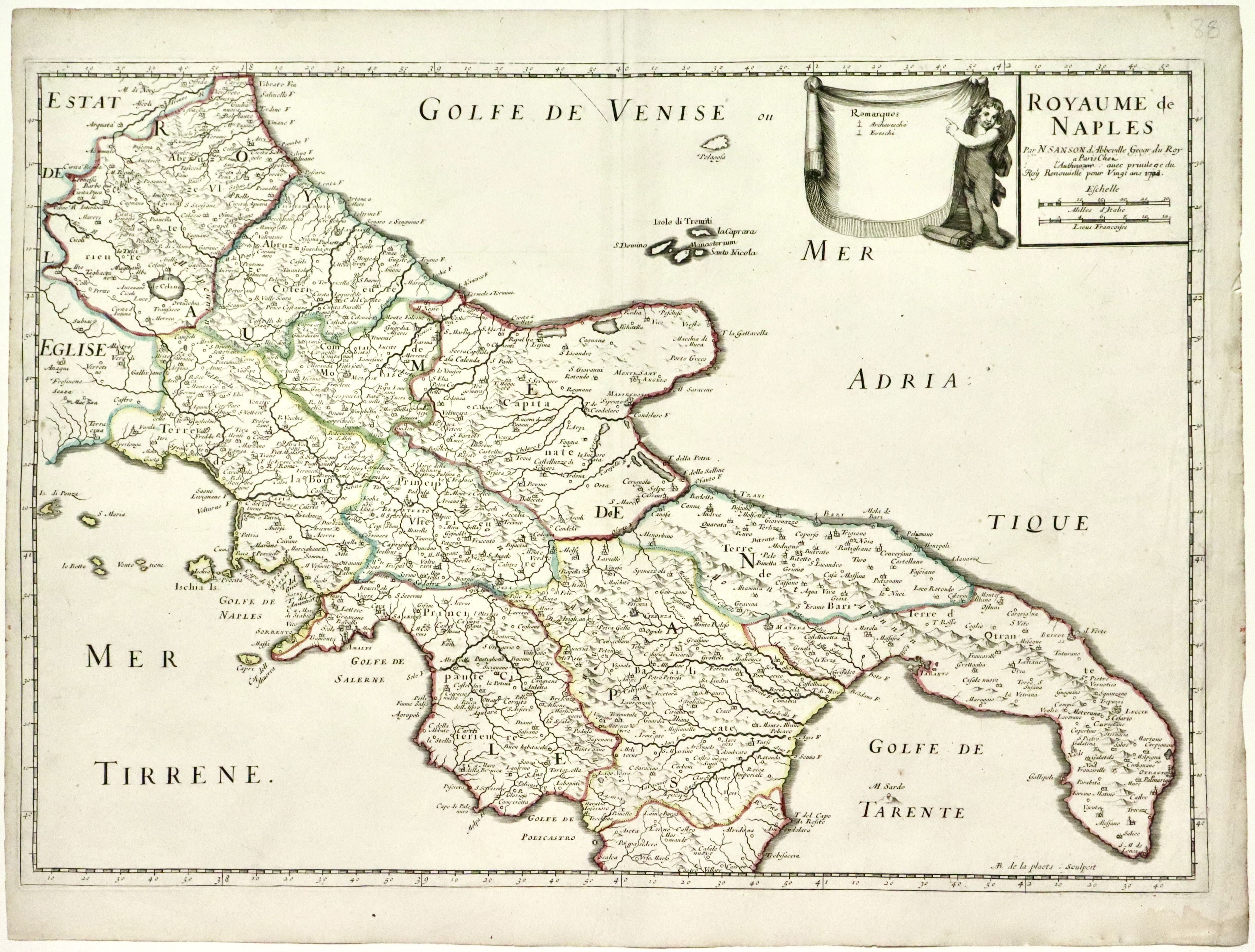 Coppia di incisioni in rame che formano una carta del Regno unite, colorata d’epoca ai confini, mm 415x585 circa ognuna. Rara edizione, che presenta cancellature al titolo, relative al nome del re che concesse il privilegio ed allo stampatore, con data variata a 1703, rispetto all’edizione seicentesca. Inoltre alla carta è stato aggiunto il putto che sorregge il drappo. Sanson, geografo del Re Luigi XIII è considerato il fondatore della cartografia francese, tra i primi ad applicare la trigonometria nelle misurazioni geodetiche; infatti Nicolas Sanson e i suoi collaboratori realizzarono nuove proiezioni geografiche e pubblicarono numerosi atlanti, mentre si affermava l’impiego dei sistemi di misura indiretta mediante i procedimenti trigonometrici applicati in Olanda da Snellius fin dal 1617. Il rilevamento geodetico-topografico basato sulla triangolazione prese rapidamente piede dando alle carte geografiche un aspetto sempre più aderente alla realtà che rappresentavano.