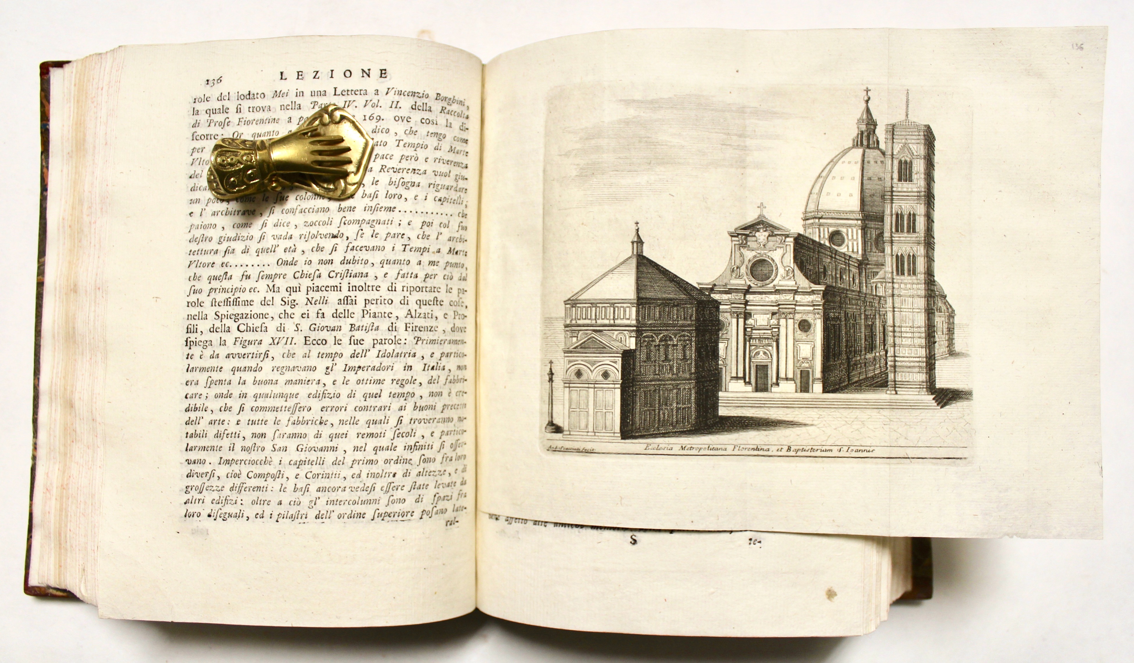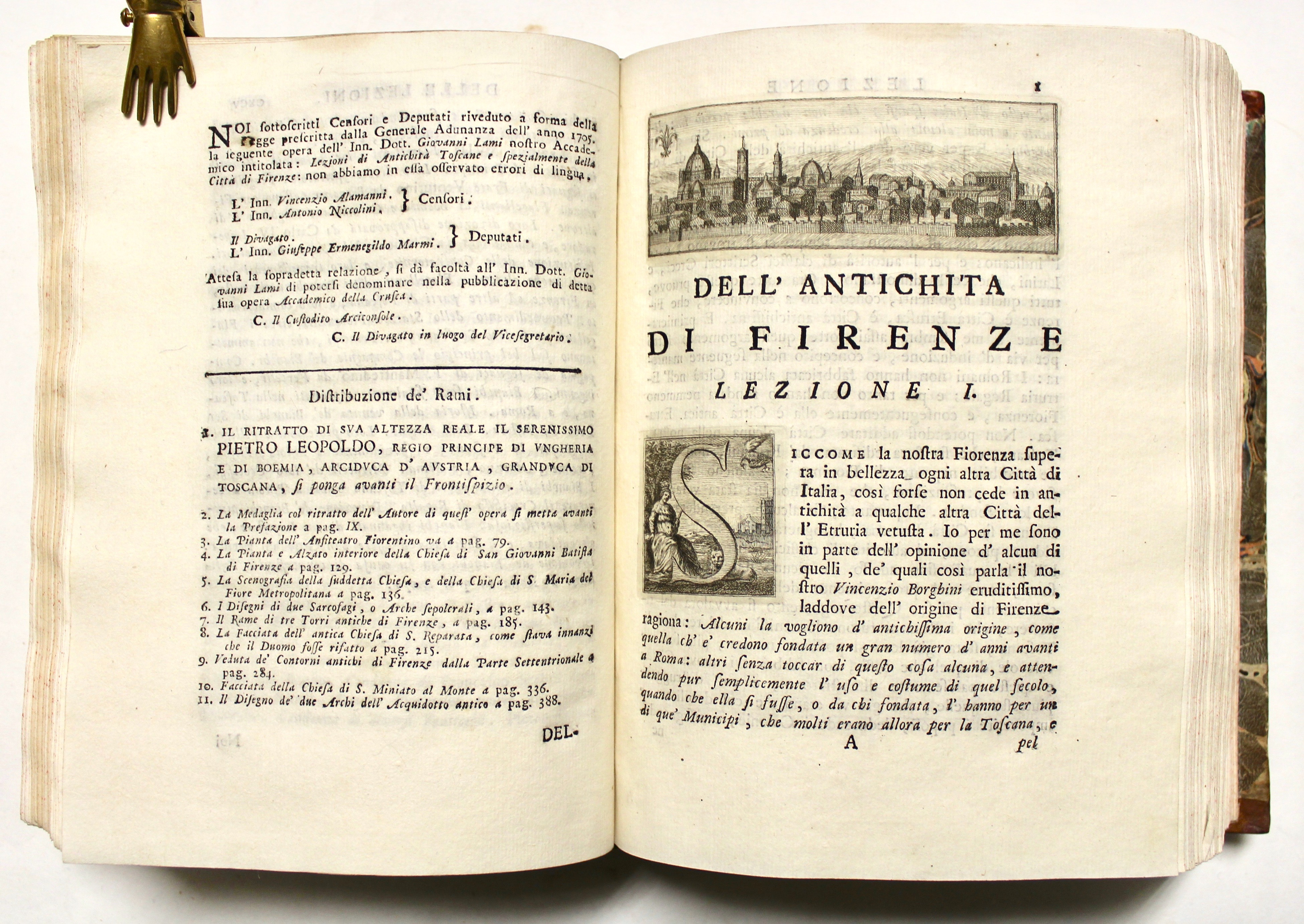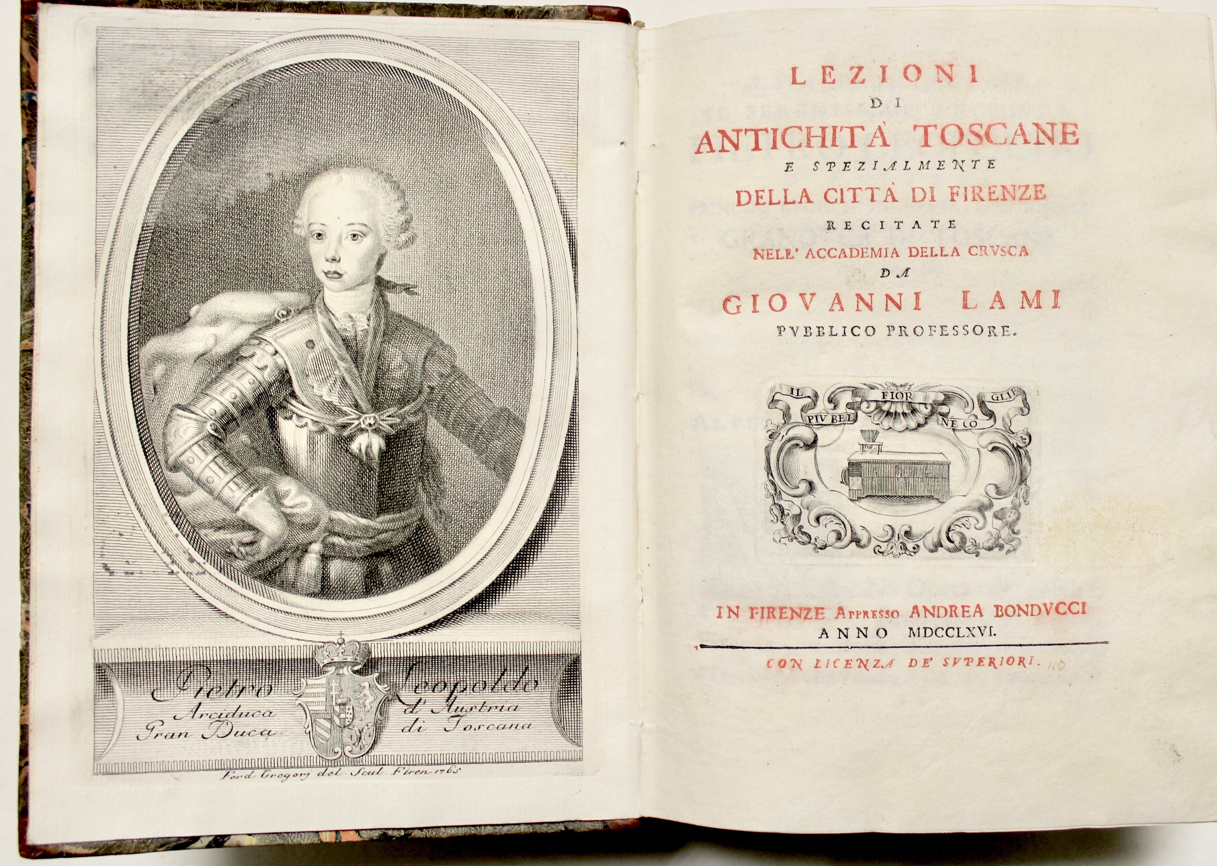 2 volumi in 8° (mm 225x165). Pagine CXCV, (1), 296, (2), 299-718. Con 15 tavole fuori testo, compresi il ritratto dell'Autore e quello del dedicatario Pietro Leopoldo Granduca di Toscana, disegnate ed incise da Ferdinando Gregori e Gaspero Pecchioni. Una tavola raffigura la pianta della città di Firenze com'era nel 1529. Frontespizio in rosso e nero con frullone della Crusca, 2 vedute di Firenze usate come testatine, capilettera e fregi xilografici. Prima edizione. Legatura coeva in mezza pelle con titolo impresso in oro su tassello al dorso, piatti marmorizzati, qualche spellatura e abrasione ai piatti, dorso rifatto con applicazione dell’originale coevo. Ottimo esemplare
