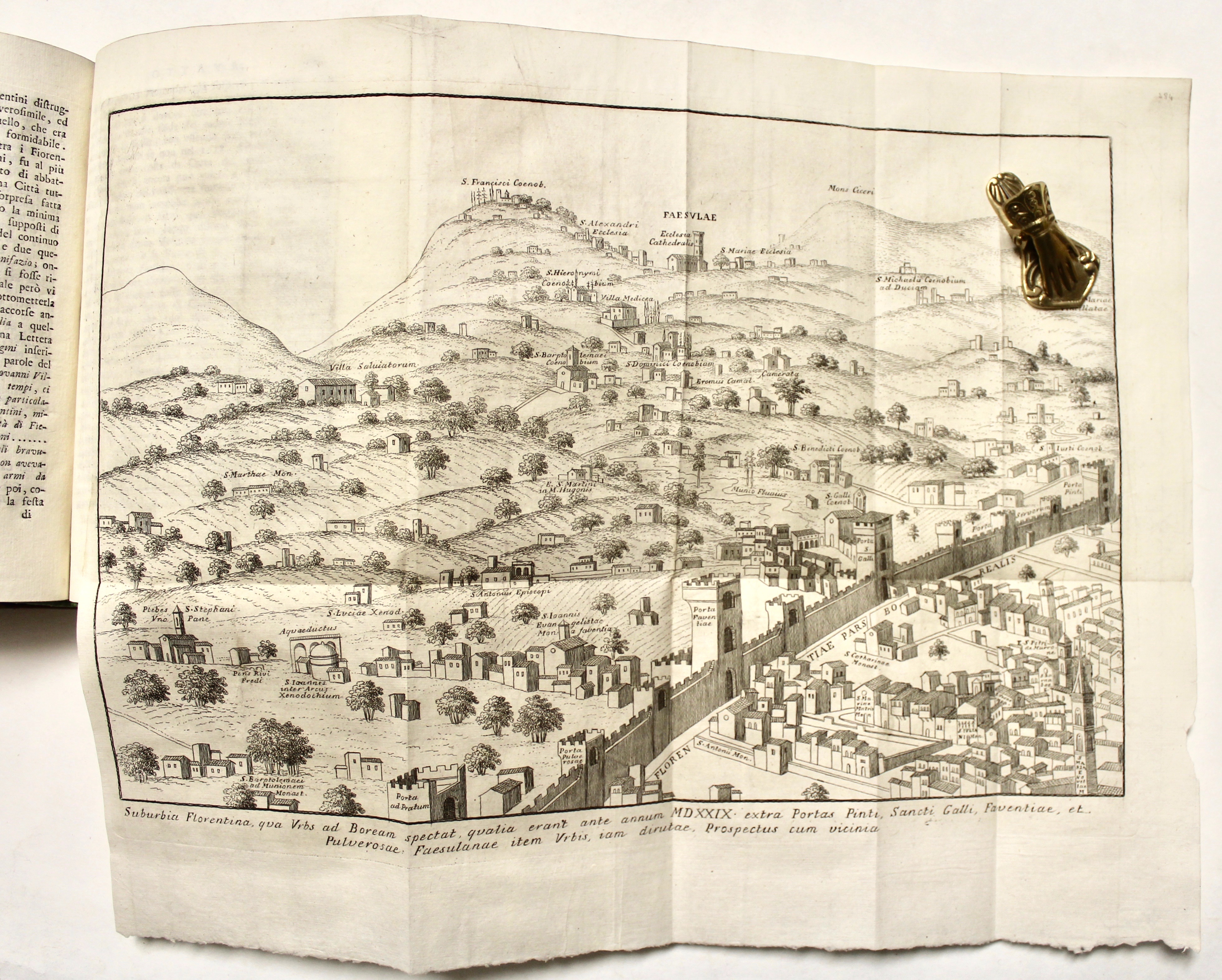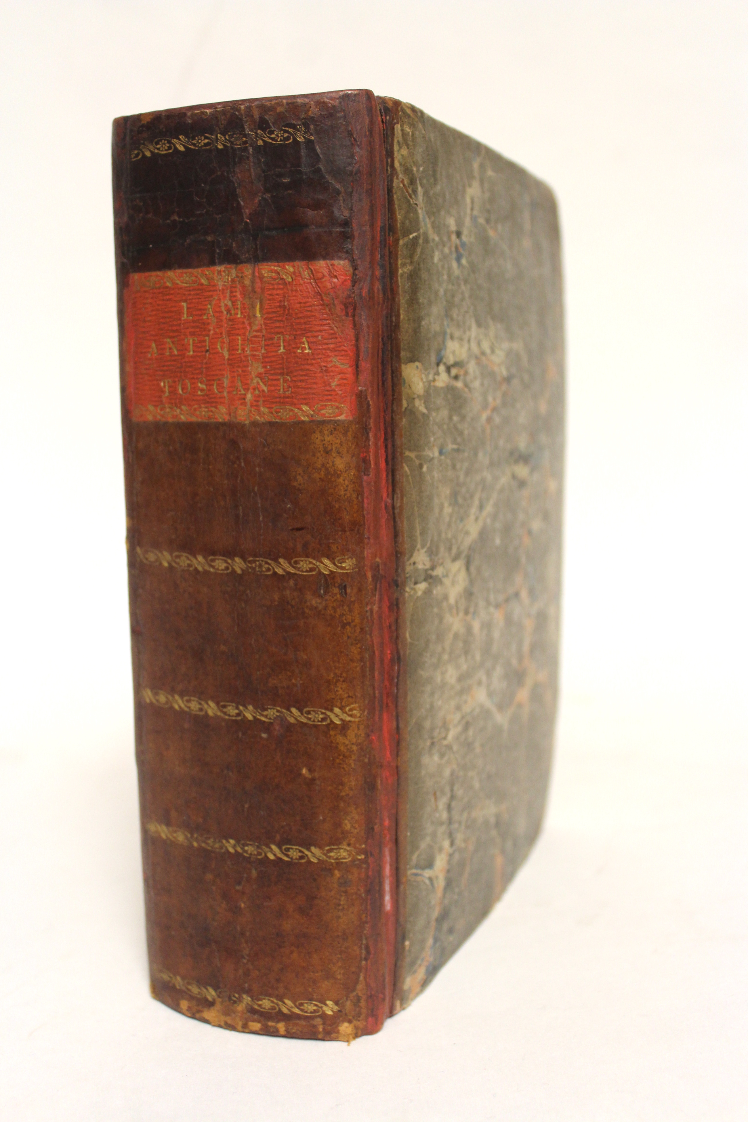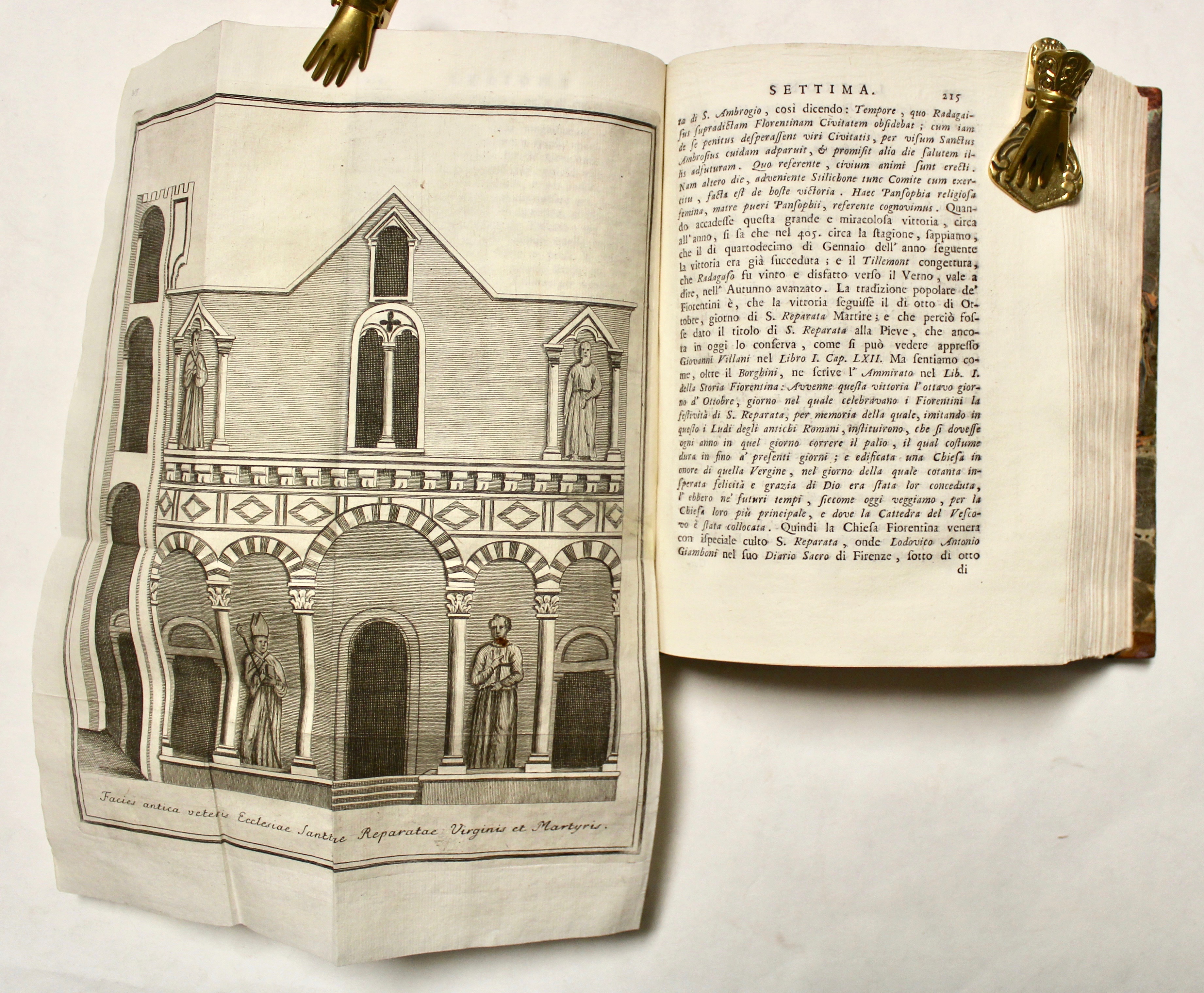 2 volumi in 8° (mm 225x165). Pagine CXCV, (1), 296, (2), 299-718. Con 15 tavole fuori testo, compresi il ritratto dell'Autore e quello del dedicatario Pietro Leopoldo Granduca di Toscana, disegnate ed incise da Ferdinando Gregori e Gaspero Pecchioni. Una tavola raffigura la pianta della città di Firenze com'era nel 1529. Frontespizio in rosso e nero con frullone della Crusca, 2 vedute di Firenze usate come testatine, capilettera e fregi xilografici. Prima edizione. Legatura coeva in mezza pelle con titolo impresso in oro su tassello al dorso, piatti marmorizzati, qualche spellatura e abrasione ai piatti, dorso rifatto con applicazione dell’originale coevo. Ottimo esemplare