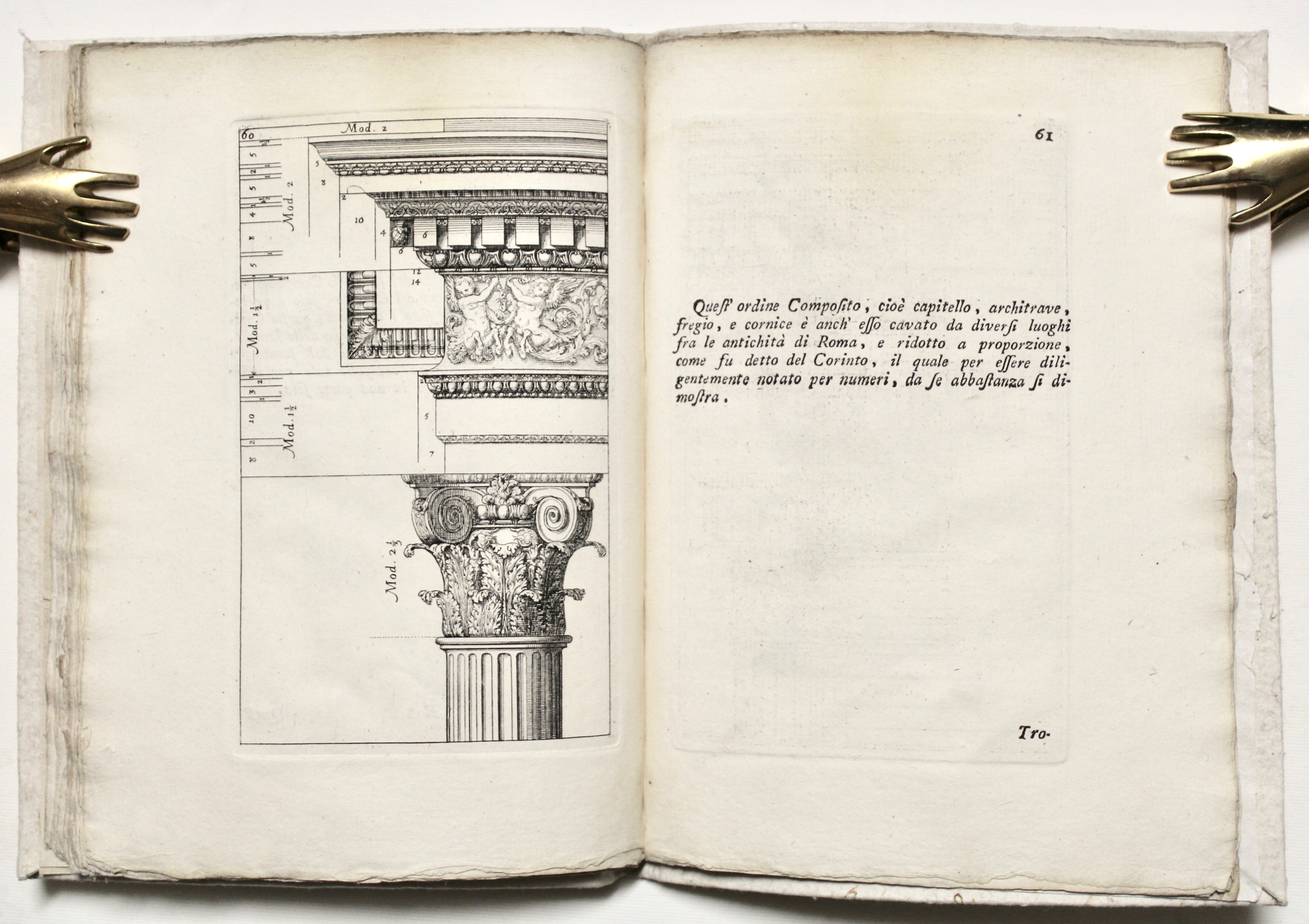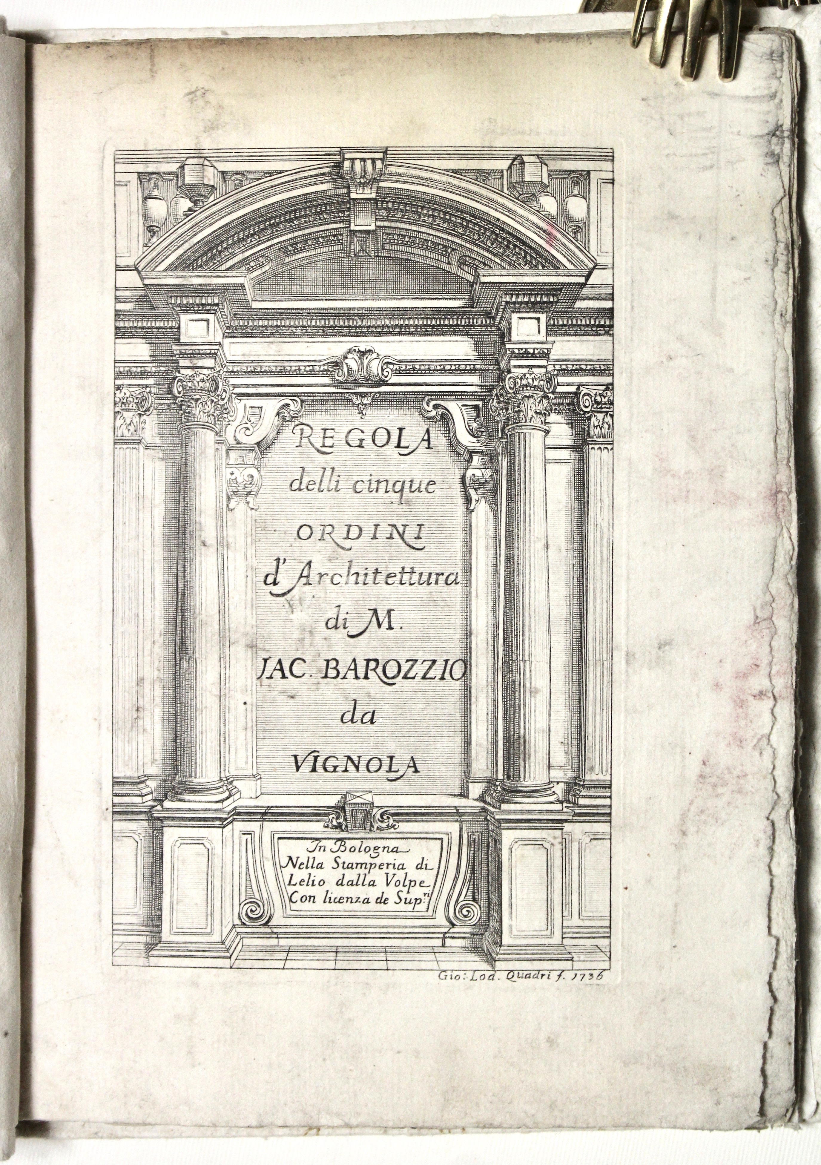 Il frontespizio è firmato “Gio. Lod. Quadri f. 1736” incisore cui vengono attribuite tutte le tavole del volume (Nagler, Künstler-Lexicon, Vol. 12, p. 134). Giacomo Barozzi da Vignola fu uno dei più grandi architetti del Rinascimento italiano, e il suo lavoro sui cinque ordini d’architettura, costituisce uno dei trattati basilari sulla materia assieme a quelli di Serlio, Palladio e Scamozzi.