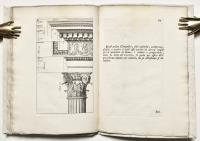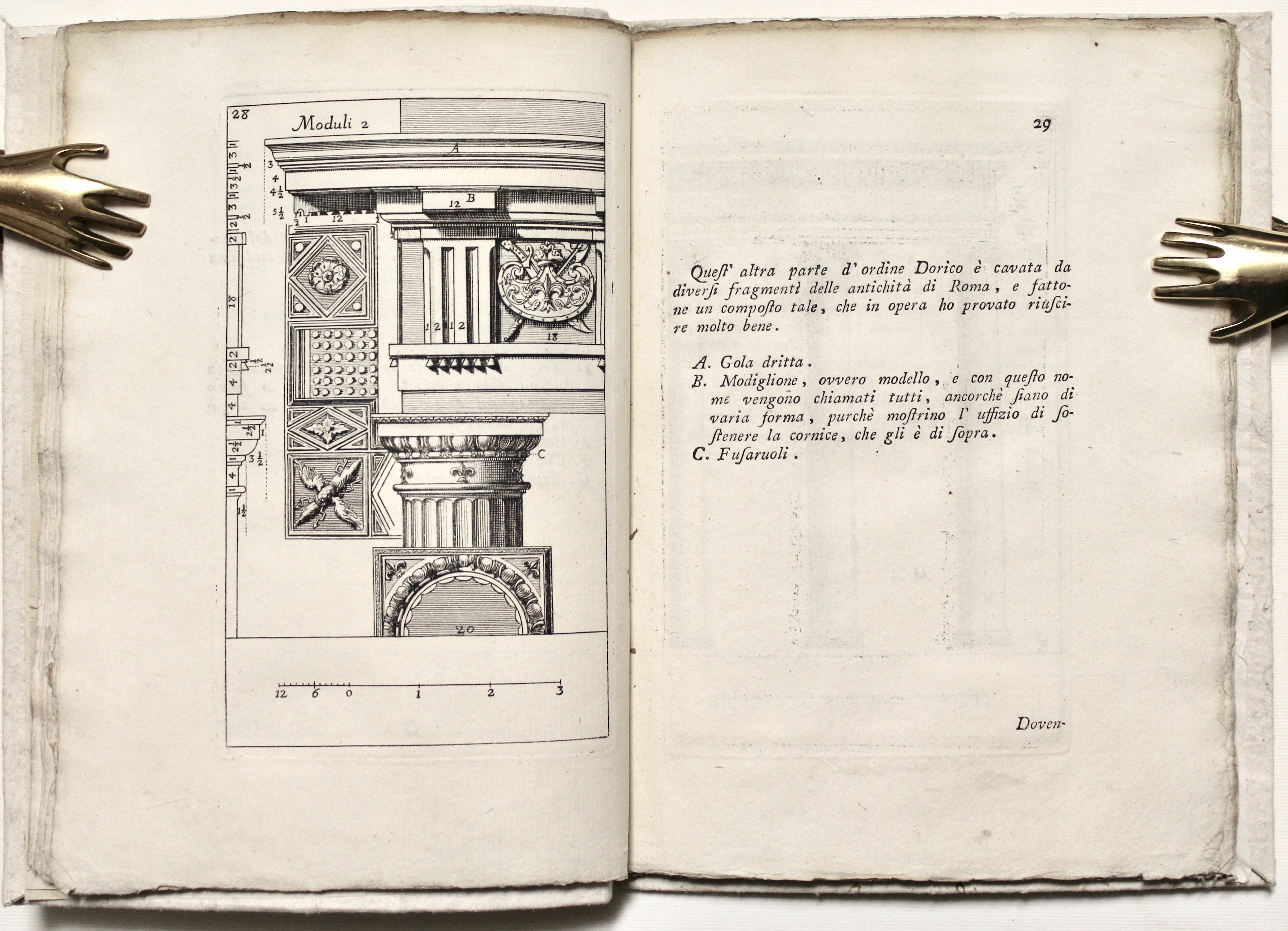 In 4° (mm 225x160); pagg. 76, con frontespizio architettonico completamente inciso su lastra e 36 incisioni raffiguranti colonne, fregi e monumenti propri dei cinque ordini toscano, dorico, ionico, corinzio e composito. A fronte dell’immagine la legenda e la spiegazione. Elegante piena pergamena in stile inizio Ottocento con tassello in pelle recante titolo impresso in oro.