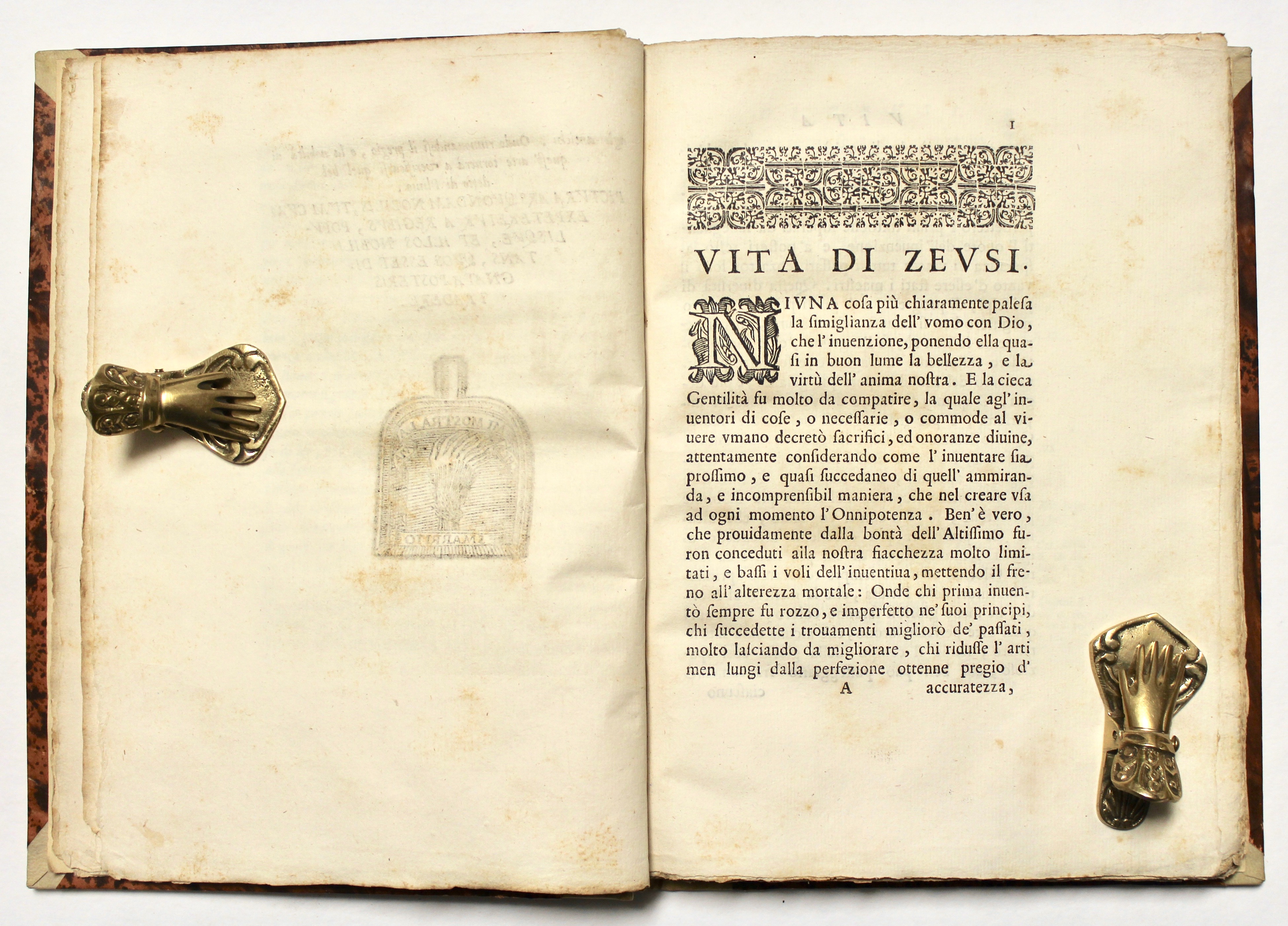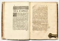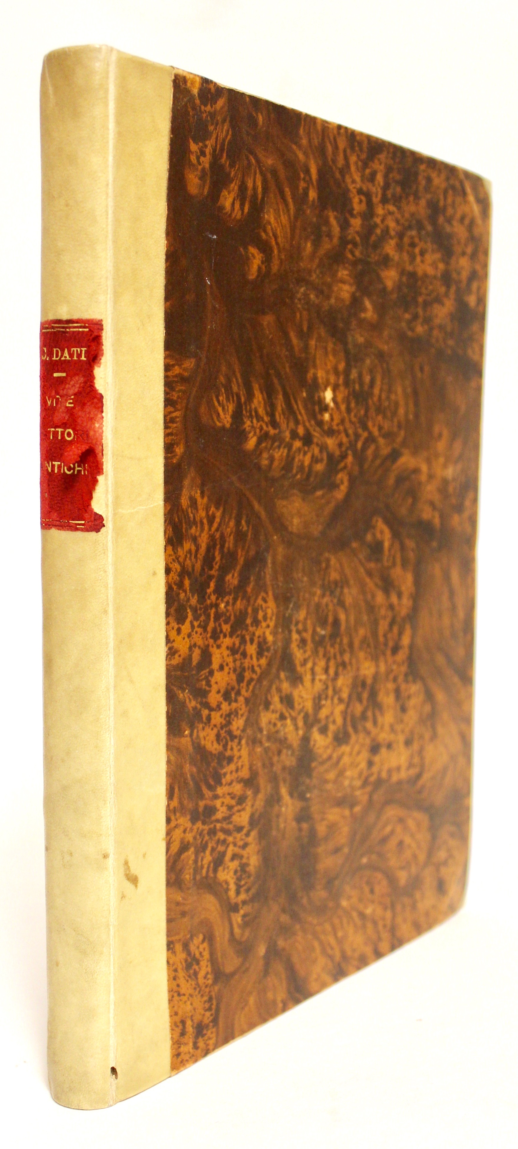 In 8° grande; pagg. (16); 182, (2); alcune vignette e fregi silogr., frontesp. in rosso e nero con vignetta, timbro biblioteca Galletti all’occhiello. Mezza pergamena mod. con angoli, con tit. su tassello. Buon esemplare genuino, a pieni margini in barbe, con normali leggere fioriture soprattutto ai margini, Errata all’ultima pagina con foro dovuto ad assottigliamento della carta; tassello parzialmente staccato. Tratta delle vite ed opere di Zeusi, Parrasio, Apelle e Protogene
