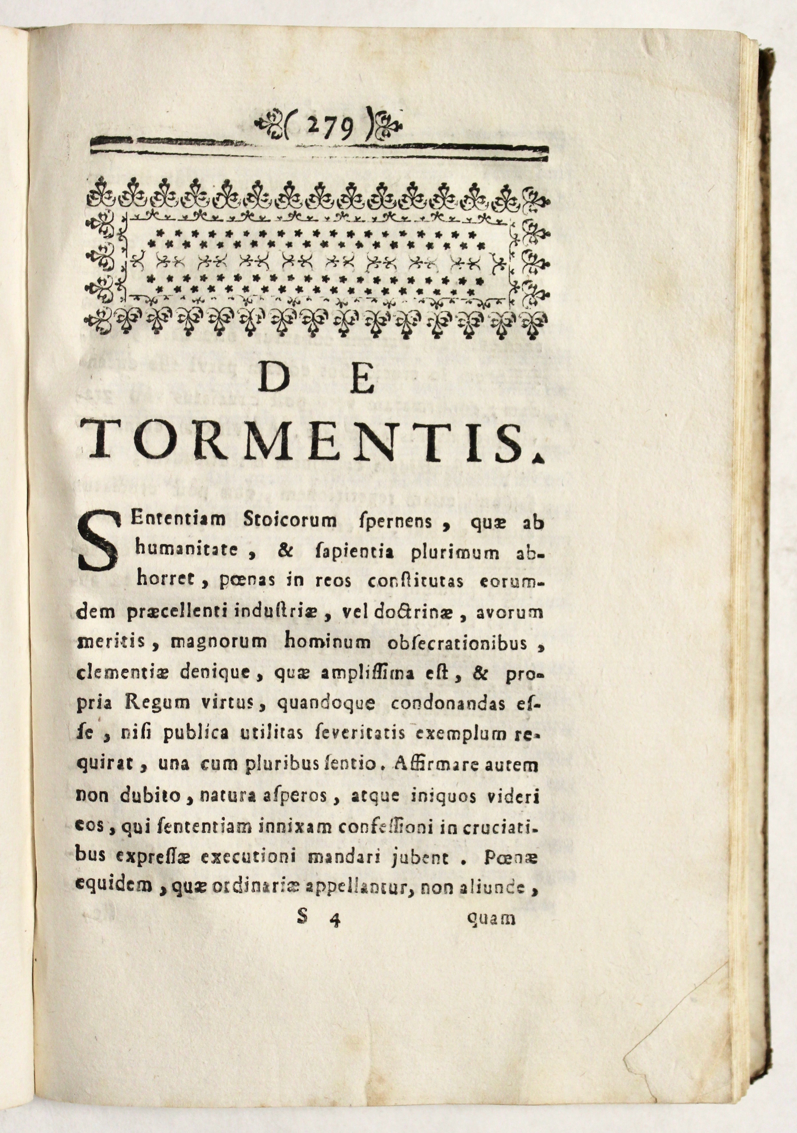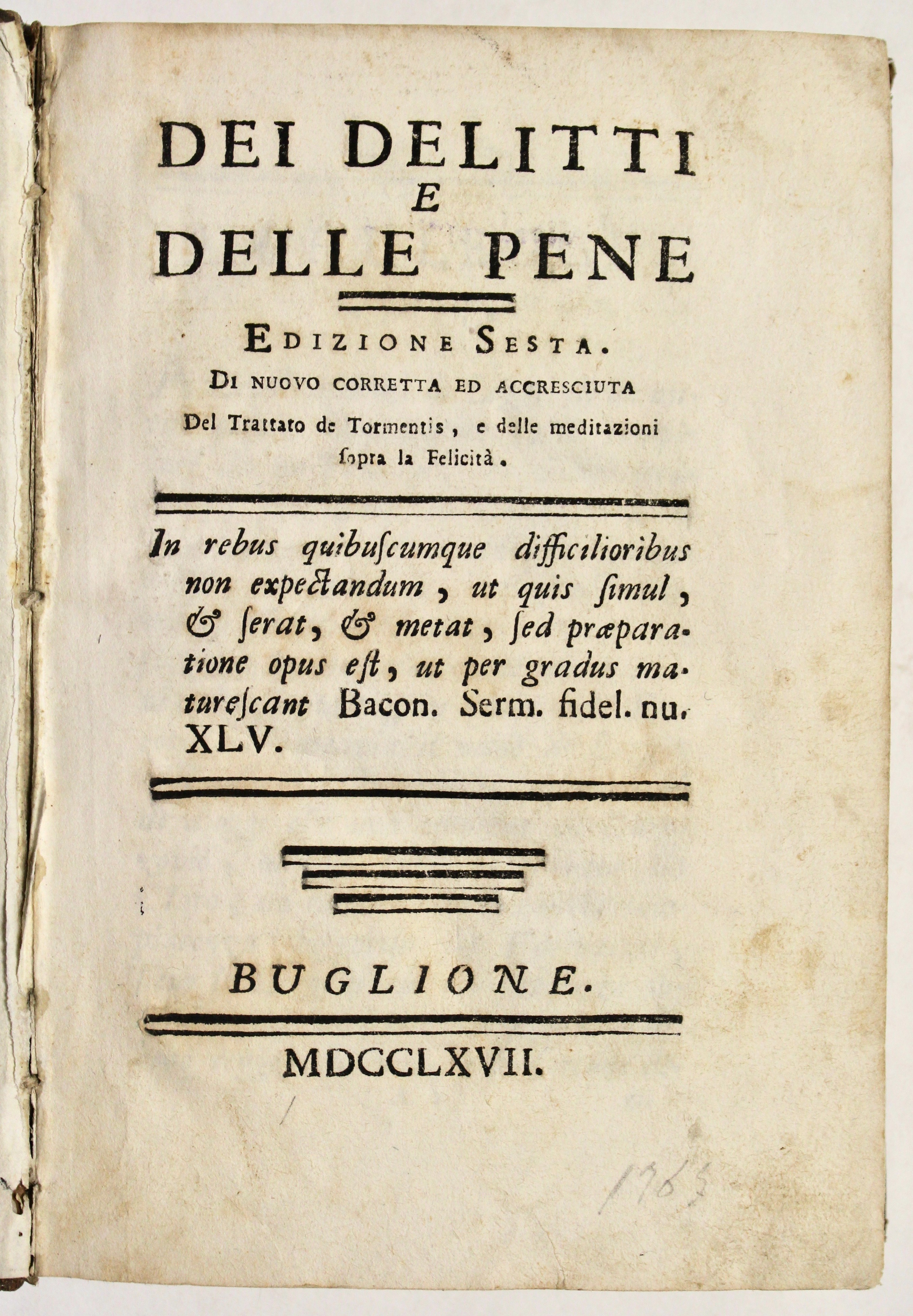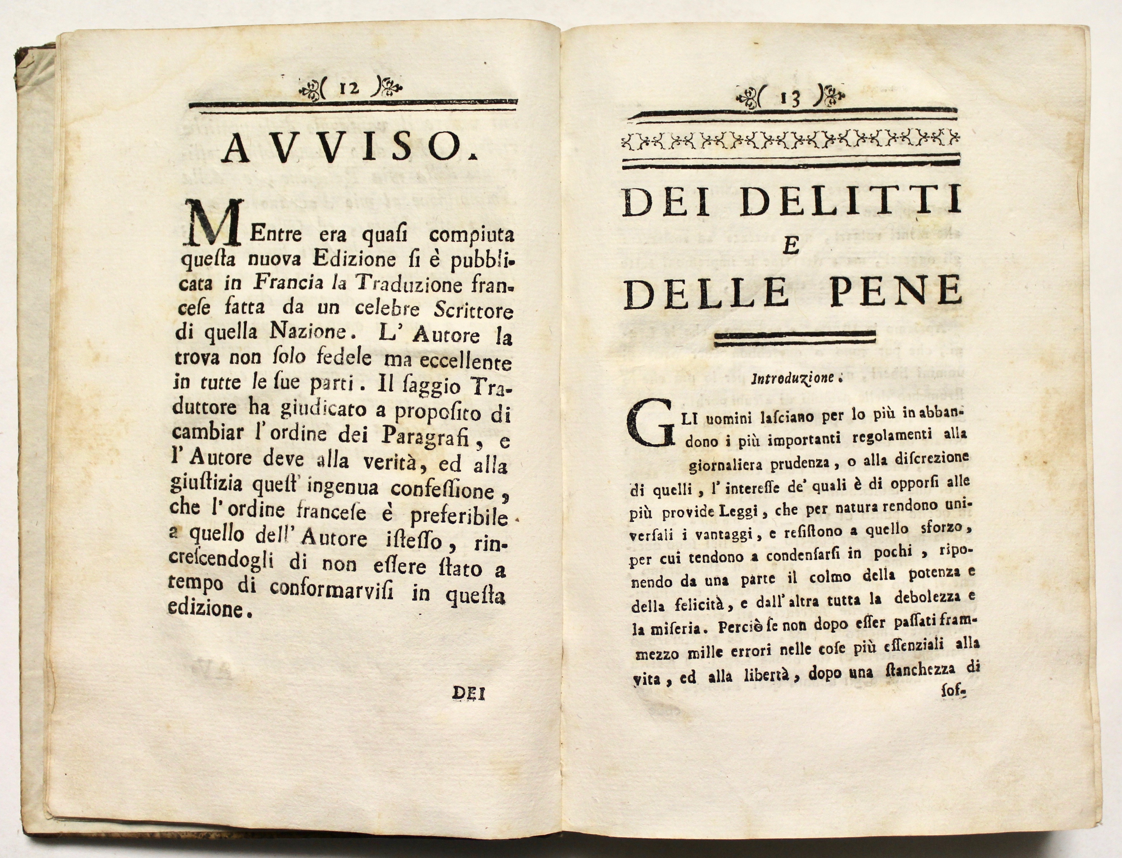 Ottima e rara edizione, probabilmente successiva alla sesta di Parigi 1766, quando il libro venne incluso nell'indice dei libri proibiti a causa della sua distinzione tra reato e peccato. Ricordando uno dei molti precetti contenuti in quest’opera, il Beccaria delinea un "teorema generale" per determinare l'utilità di una pena: "perché ogni pena non sia una violenza di uno o di molti contro un privato cittadino, dev'essere essenzialmente pubblica, pronta, necessaria, la minima delle possibili nelle date circostanze, proporzionata a' delitti, dettata dalle leggi".