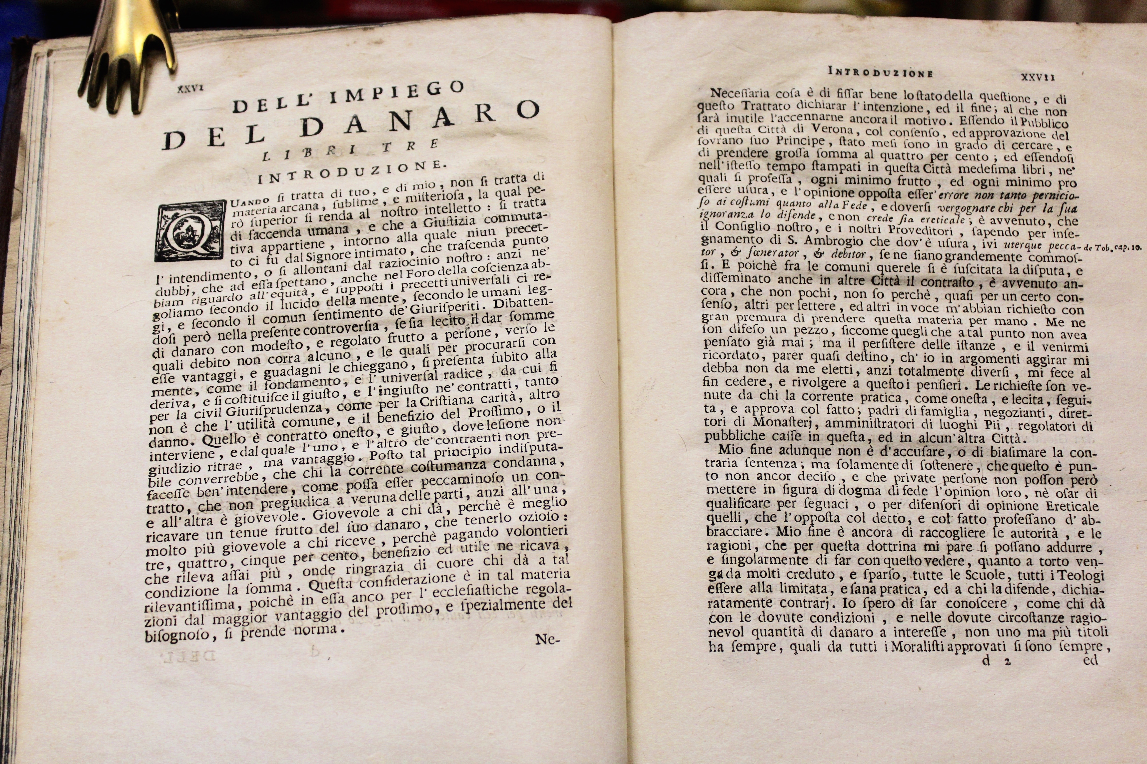 In 8° (mm 250X195); pagg. XXXII, 172. Frontespizio in rosso e nero con vignetta incisa in rame. Piena pella coeva dorso a cinque nervi, titolo in oro, tagli blu. Opera di notevole interesse, frutto di anni di studio sull’annoso problema dell’usura, in cui l’autore dichiara lecito un interesse sui prestiti di danaro. Maffei è fautore delle tesi liberistiche proprie dei paesi protestanti e grazie ad esempi pratici di mercatura legittima il prestito con interesse riaprendo la polemica economico-teologica; subito le autorità ecclesiastiche condannarono l’opera ordinandone il ritiro cosicchè nella seconda edizione appare una lettera a Benedetto XIV, in cui il Maffei assume una posizione più morbida nei confronti dell’argomento. Buon esemplare, firma di possesso manoscritta alla sguardia iniziale, lievi fioriture e bruniture. Tracce d’uso a spigoli e cerniere. Strappo anticamente restaurato alla sguardia iniz. Einaudi 3603 per la prima edizione. Venturi, p. 131. Kress, n. 4769. Bibl. Einaudi, n.3604