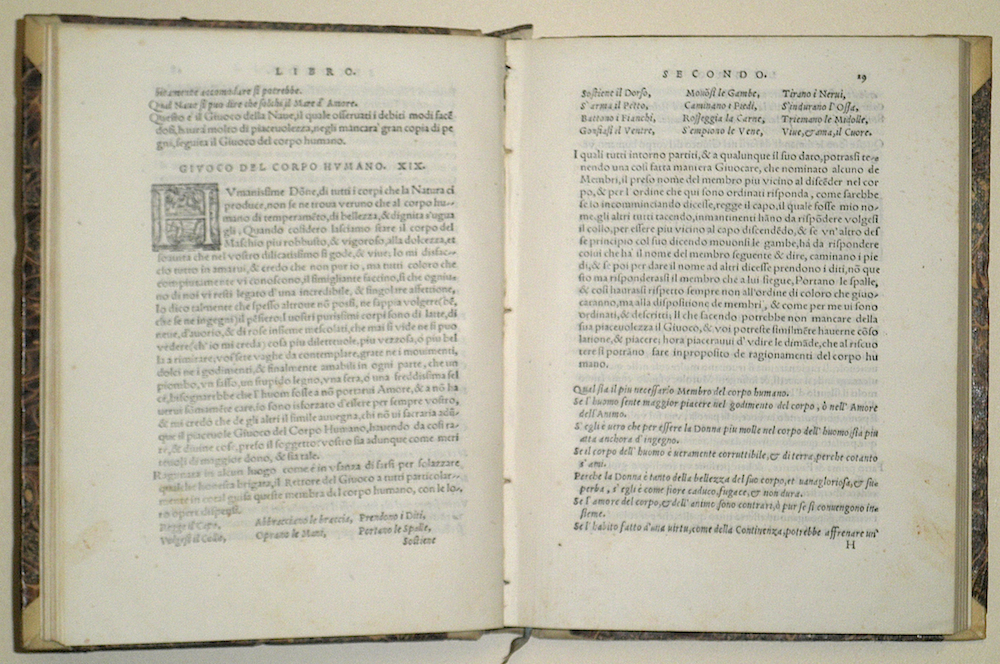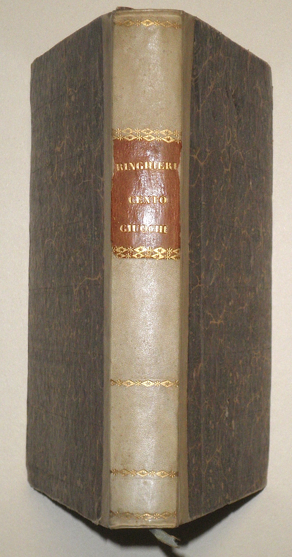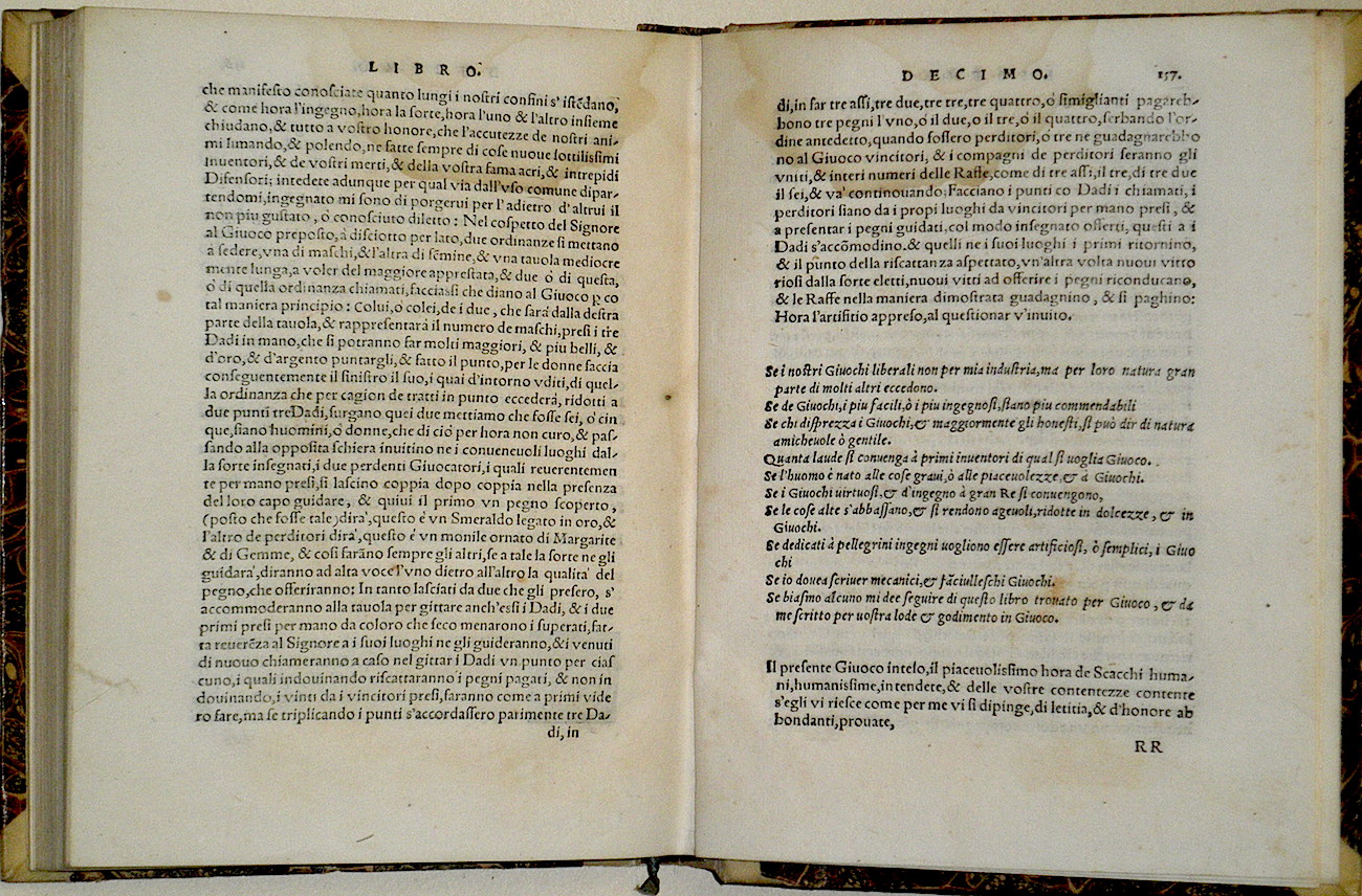 Edizione originale dedicata a Caterina de Medici, Regina di Francia. Sonetto dell’autore al verso del frontespizio. Non comune ed interessante opera che descrive 100 giochi intellettuali, di fantasia, logica e memoria delineando il gusto dei divertimenti all’epoca (il capitolo XCVIII riguarda gli scacchi). Singolari sono i “ludi” connessi alla musica, definita ora scienza dei numeri, ora come una essenza magica dal meraviglioso potere di dilettare anche “gli orecchi di coloro che non l’intendono”.