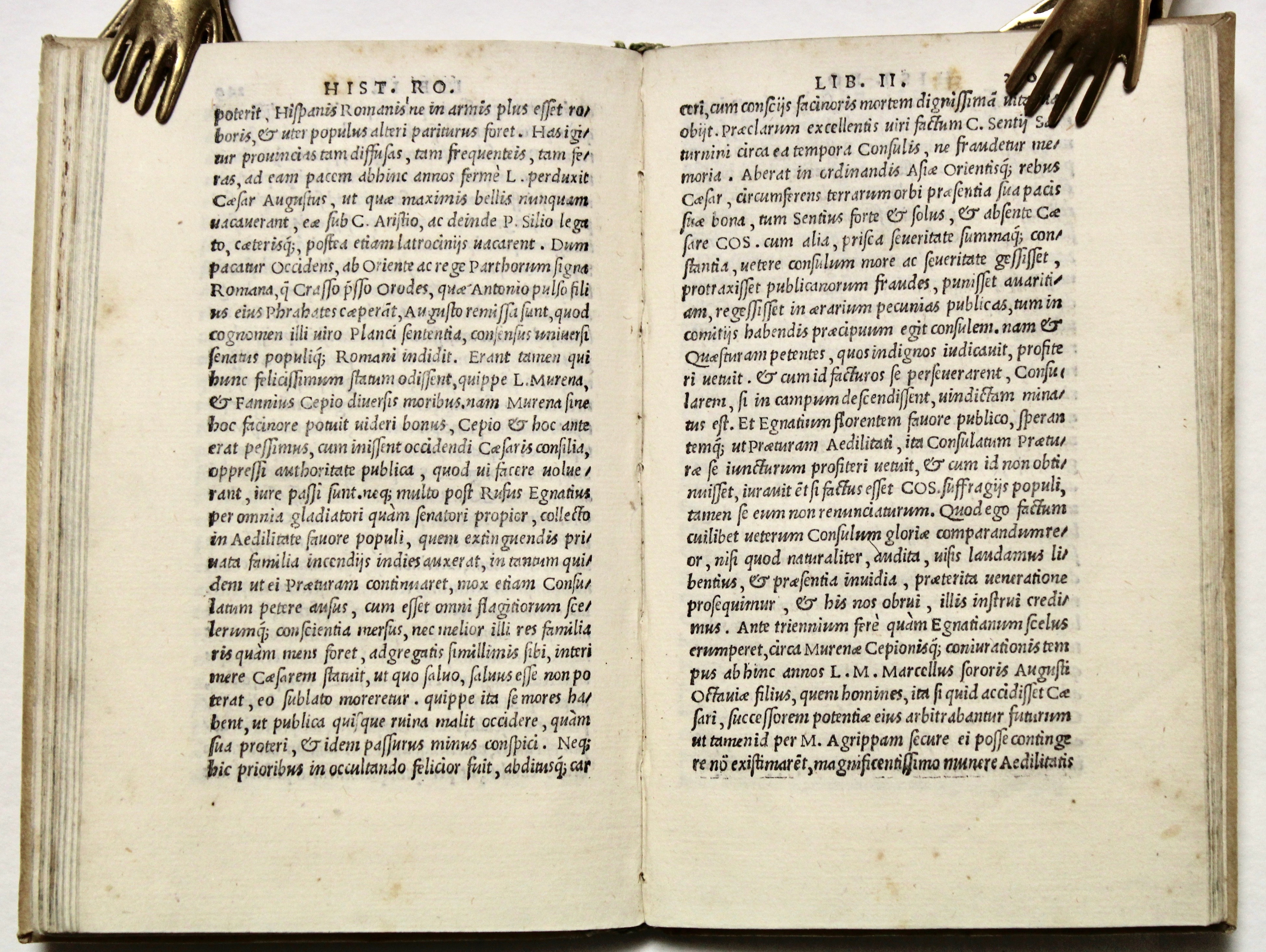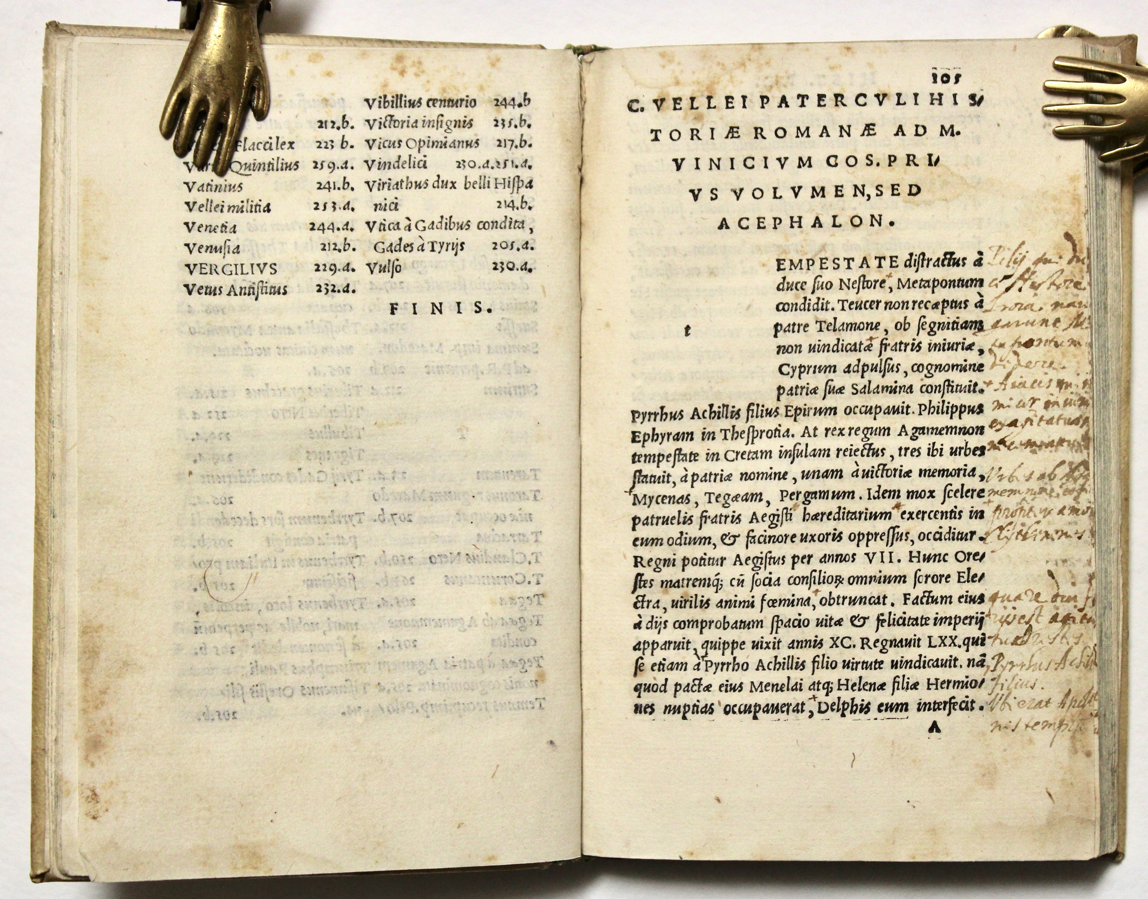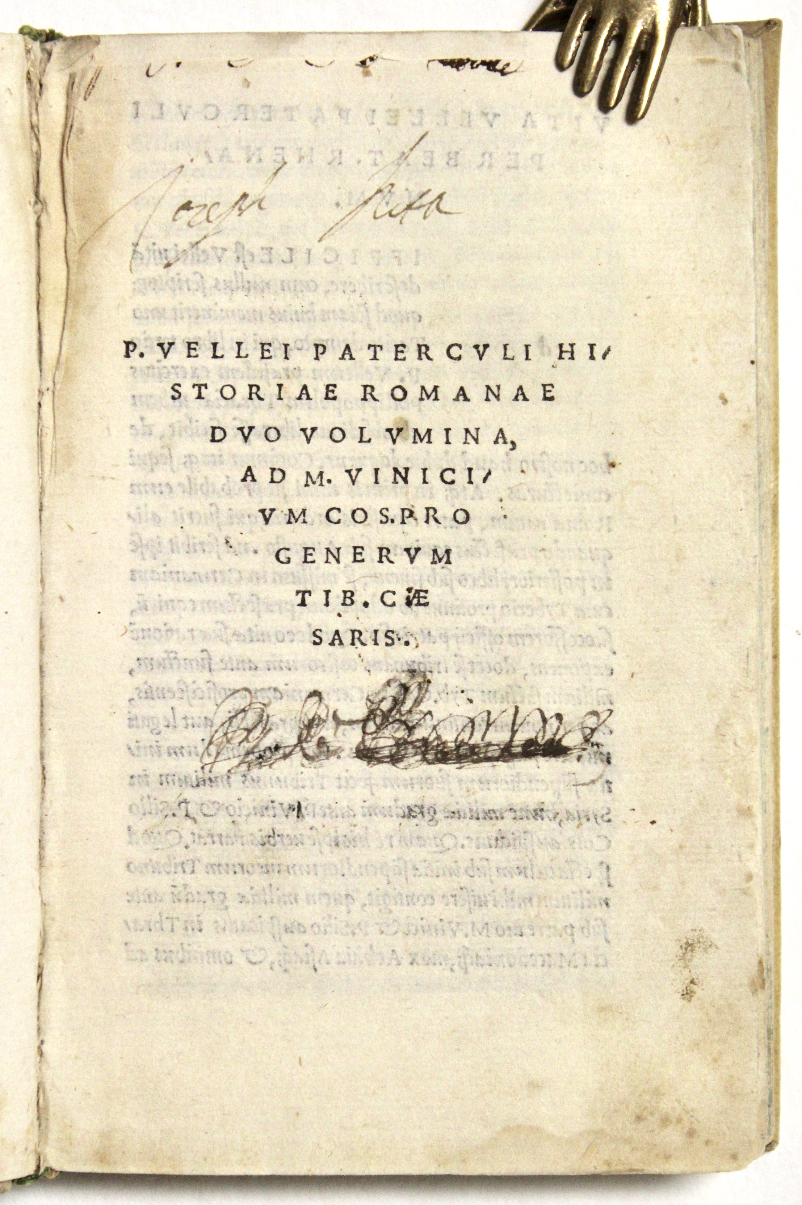 Prima edizione stampata in Italia delle Historie di Velleio Patercolo, storico romano del I secolo d. C. Si tratta del secondo volume dell’opera “Epitome Historiarum Trogi Pompeii” di Giustino che, nel primo volume (qui assente), comprende oltre all’opera citata nel titolo, le “Vitae imperatorum externorum” di Emilio Probo. E’una dei più importanti documenti storici sull’età di Augusto e Tiberio, Beato Renano scoprì il manoscritto nel monastero alsaziano di Murbach nel 1515 e pubblicò l’opera in collaborazione con Froben nel 1520.