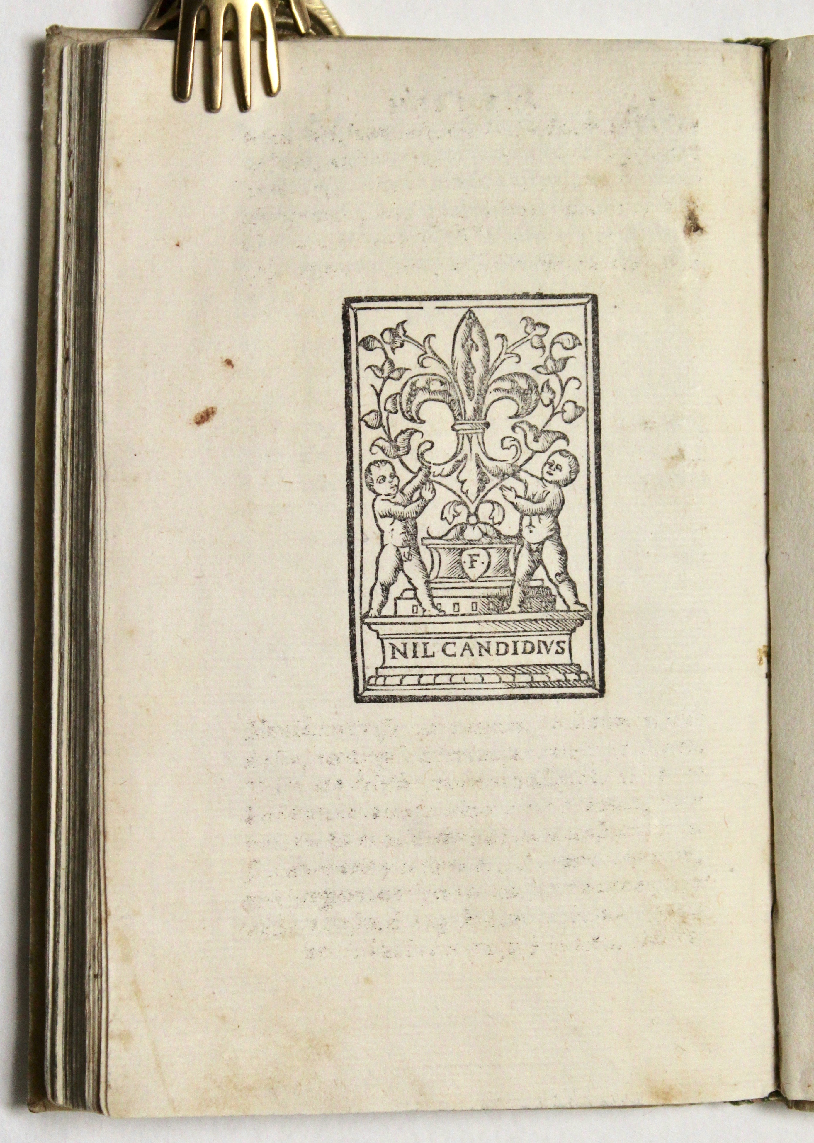 Buon esemplare, ricco di note manoscritte antiche nella prima parte. Nota di possesso alla sguardia superiore, altra nota di possesso cassata a penna; rifilatura al margine superiore della prima carta per eliminare un’ulteriore firma. Fioriture, qualche alone di umidità. Non comune cinquecentina fiorentina.