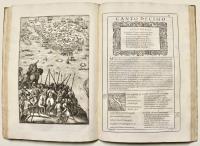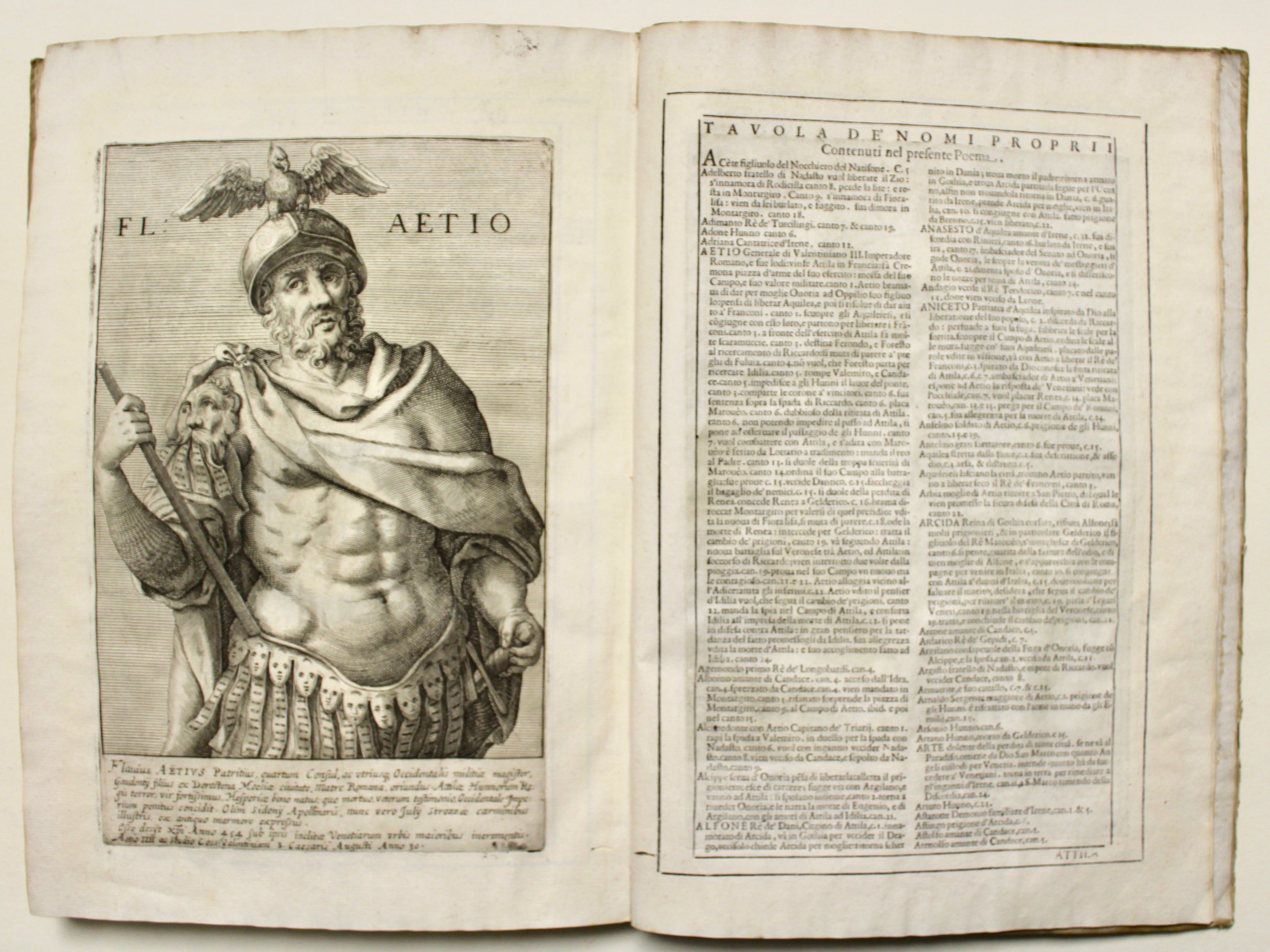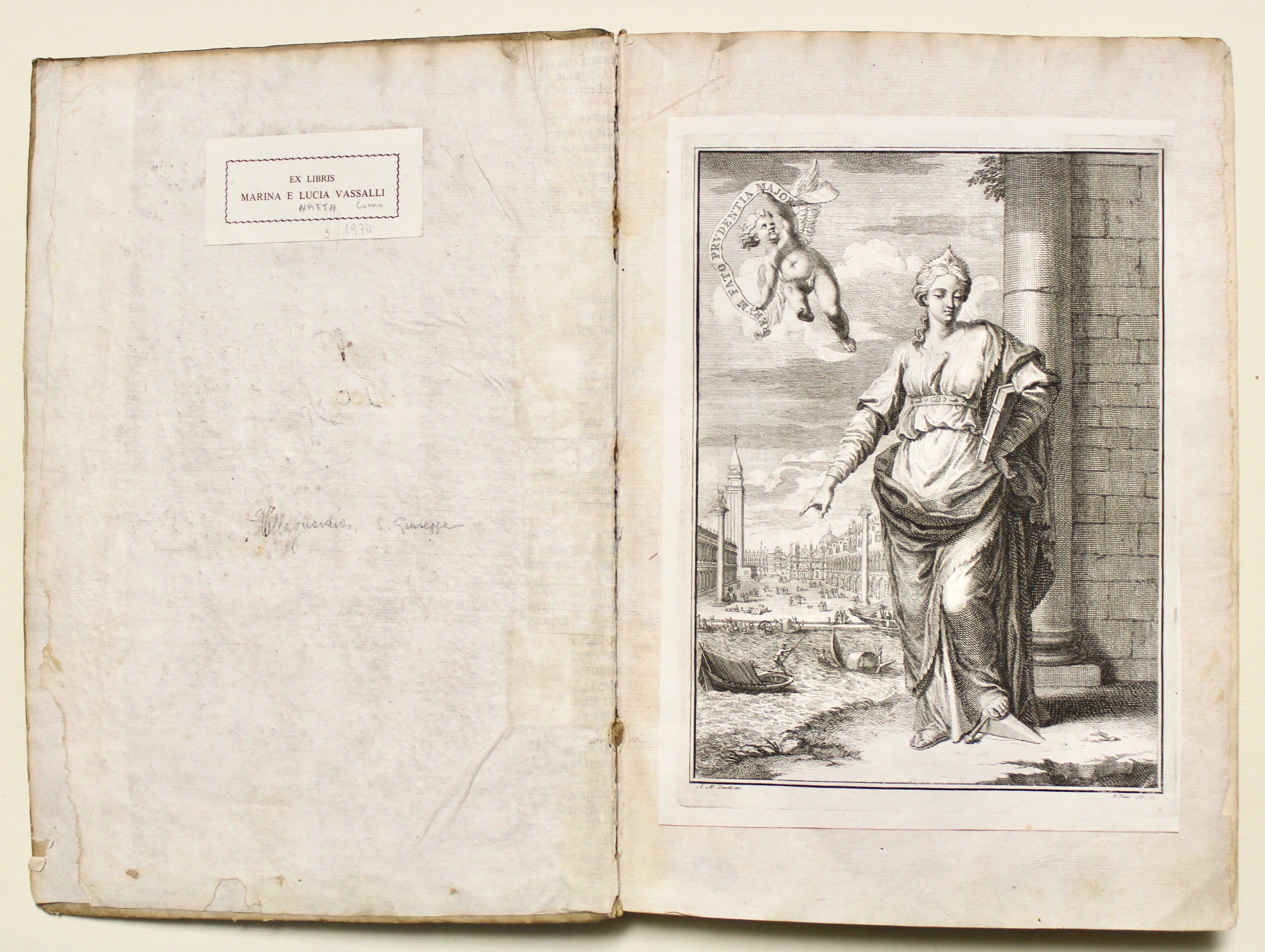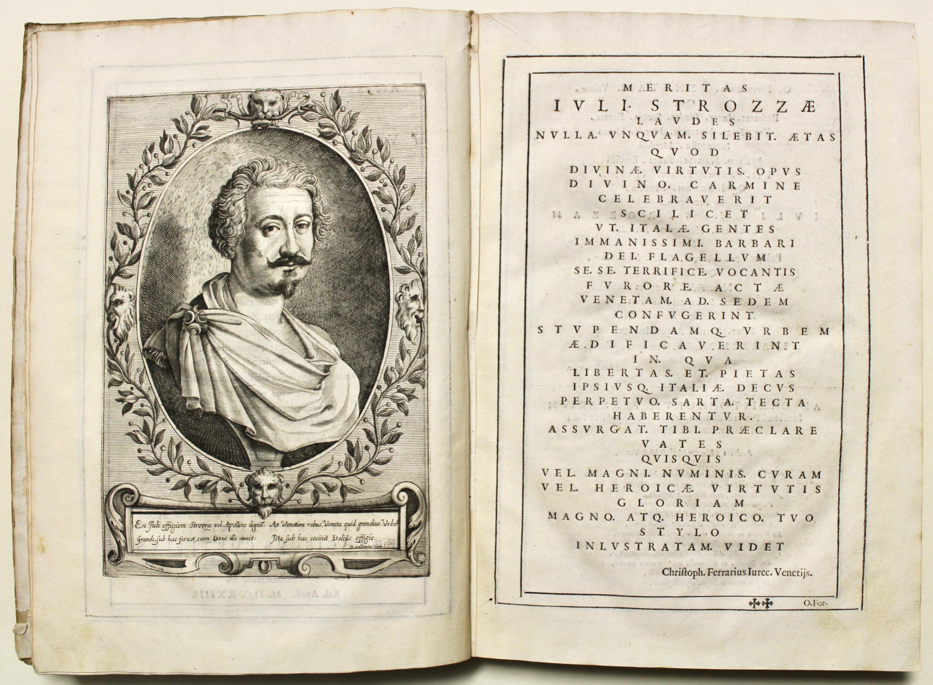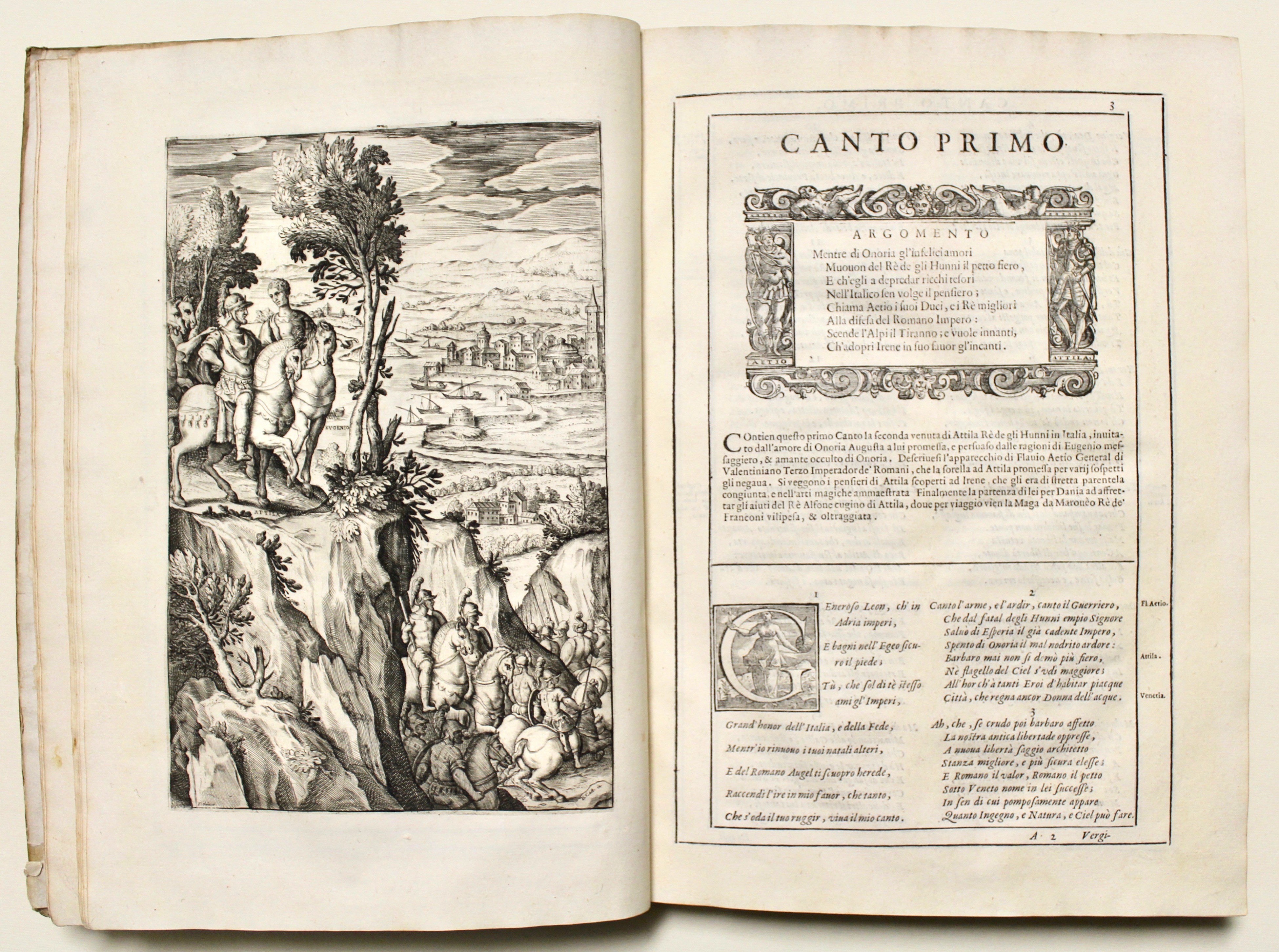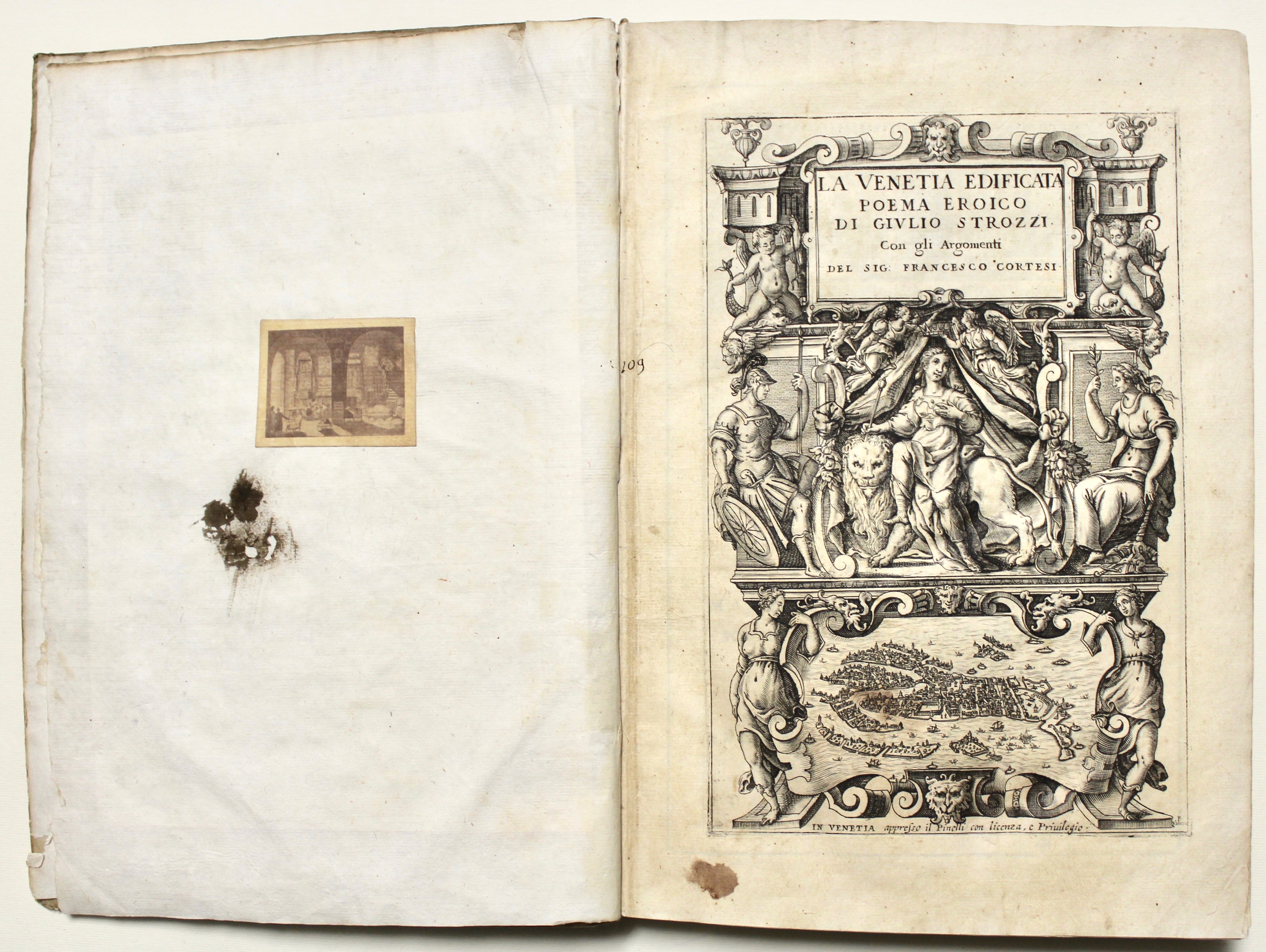 In 4° grande (mm 310x208); carte 12 non num., pagg. 248, carte 3 non num., marca editoriale all’ultima carta. Alla prima carta è stata aggiunta (incollata) una pregevole incisione di A. M. Zanetti, con in primo piano la figura allegorica di Venezia, in alto putto alato reggente un nastro con motto”Rerum fato prudentia major”; sullo sfondo la piazza S. Marco. Splendido frontespizio allegorico figurato con titolo entro cornice barocca, figure allegoriche varie, pianta prospettica di Venezia in basso; fregi, grandi iniziali istoriate e testatine silografiche ad ogni canto, testo di dodici strofe per pag. in ottava rima incorniciato da doppia bordura in legno, ritratto a p. p. dello Strozzi in rame inciso da Romiti. 24 raffinate tavole di rara bellezza nella cura dei dettagli, incise finemente in rame da Francesco Valegio, su disegni di Bernardo Castello, a piena pagina all’inizio di ogni canto, raffiguranti il tema principale dell’argomento trattato. Un ritratto a tutta pag. di Flavio Aetio ed uno di Attila alla fine sempre del Valegio. Pergamena rigida coeva. Rara e pregiata edizione originale di uno dei più bei poemi epici del ‘600, che celebra la fondazione e la gloria della Serenissima dipingendo nelle belle tavole del Valegio e descrivendo nel testo la vita di Venezia con molti interessanti particolari (vedi canto XII in particolare che descrive giochi, banchetti, regate ecc.); a riguardo Belloni nella sua opera “Il Seicento” scrive: “…La vita dei Veneziani è descritta qual’era ai tempi del poeta; Venere, fabbricatasi uno splendido palazzo all’isola di San Giorgio, vi tiene delle vere e proprie accademie, ove gli amanti, seduti in cerchi, si narrano le novità del giorno e giocano a carte e recitano commedie e danzano. Molto sviluppato nel poema dello Strozzi, è l’elemento sensuale…”. Nel 1612 era stata pubblicata da Ciotti la prima metà dell’opera con solo 3 tavole.
