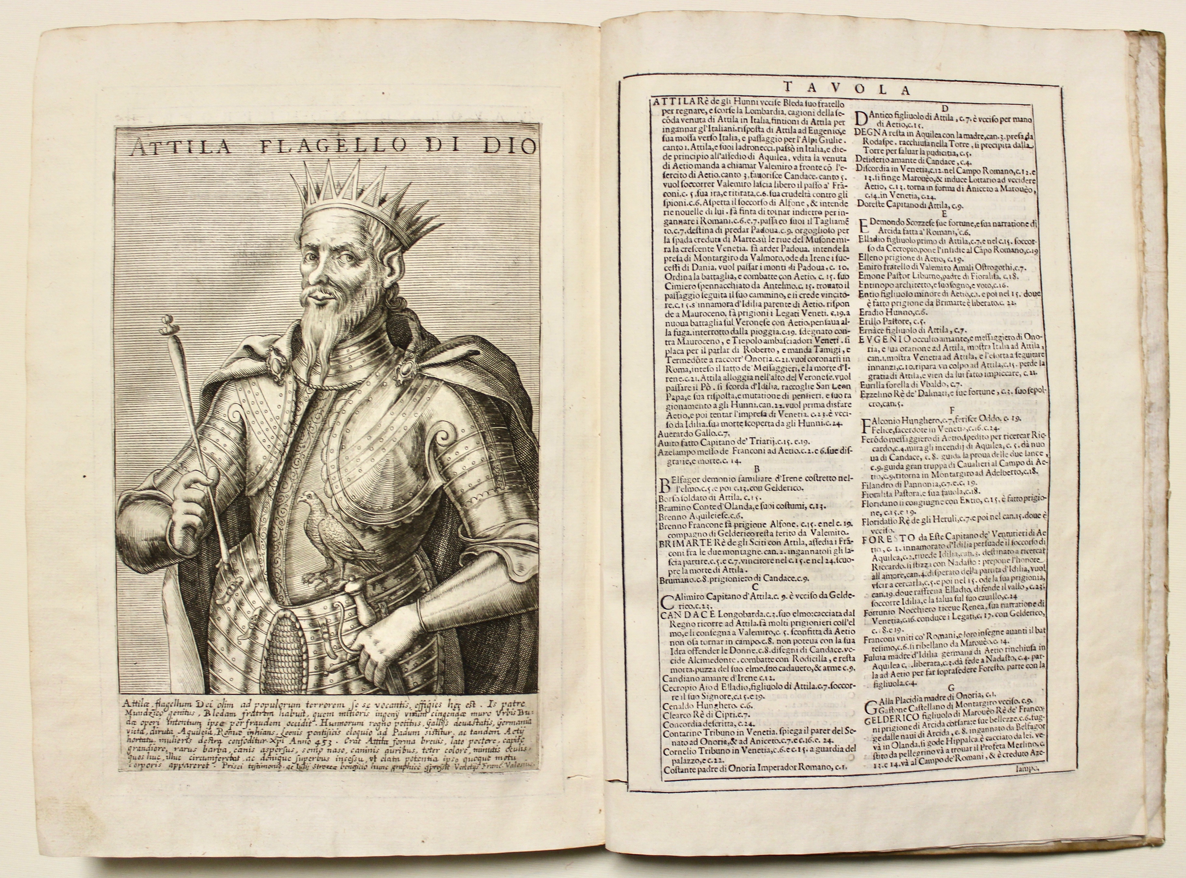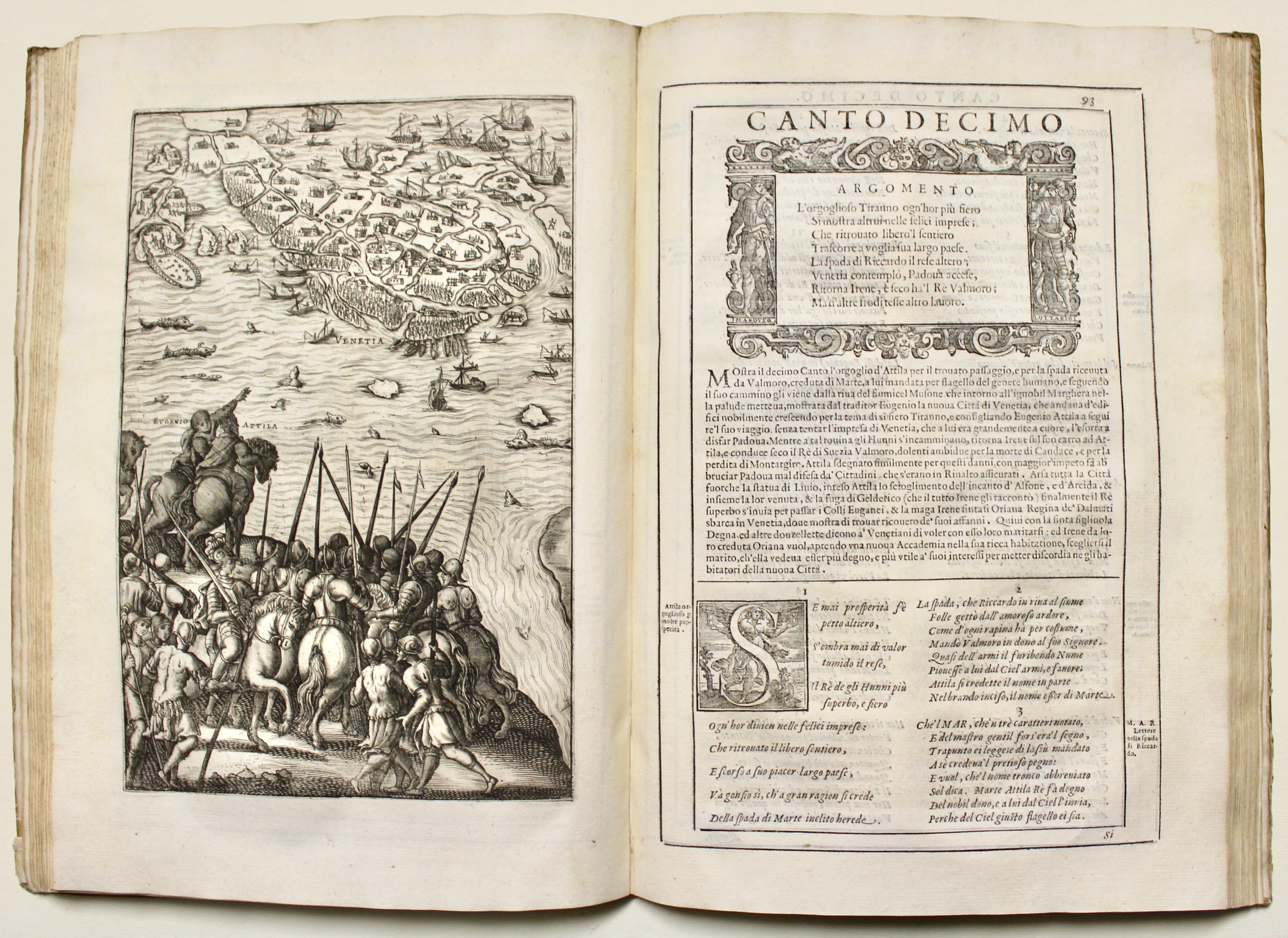 Cicogna 1827 Graesse VI, 512; Cicognara 1044; Brunet, supplemento II, 700 “Tres beau livre”; Piantanida III, 2853. Vinciana 2853: “ Il poema in 24 canti, tra I migliori del secolo, narra le vicende di Venezia e delle discese di Attila, concludendo felicemente un lungo ciclo di leggende popolari. Testo e tavole sono interessanti per la storia del costume.