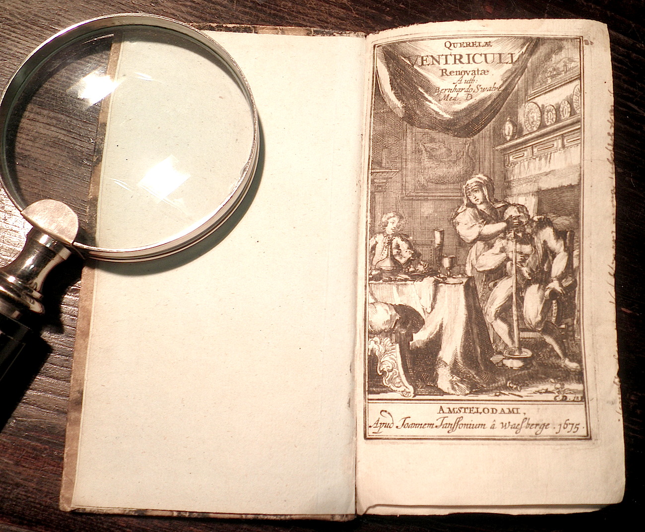 In 12°(150x85); antiporta fig. in rame, pagg. (10), 286, (10); cartonato settecentesco marmorizzato con semplice doppia etichetta al dorso. Seconda edizione di questo trattato di dietetica in cui umoristicamente il protagonista, lo stomaco, si lamenta del cattivo comportamento alimentare nelle diete consigliate dai medici o intraprese autonomamente dagli uomini. L’autore, un medico olandese stimato dai suoi contemporanei, analizza i cibi e le bevande. L’antiporta raffigura un uomo indisposto di stomaco dopo aver mangiato.