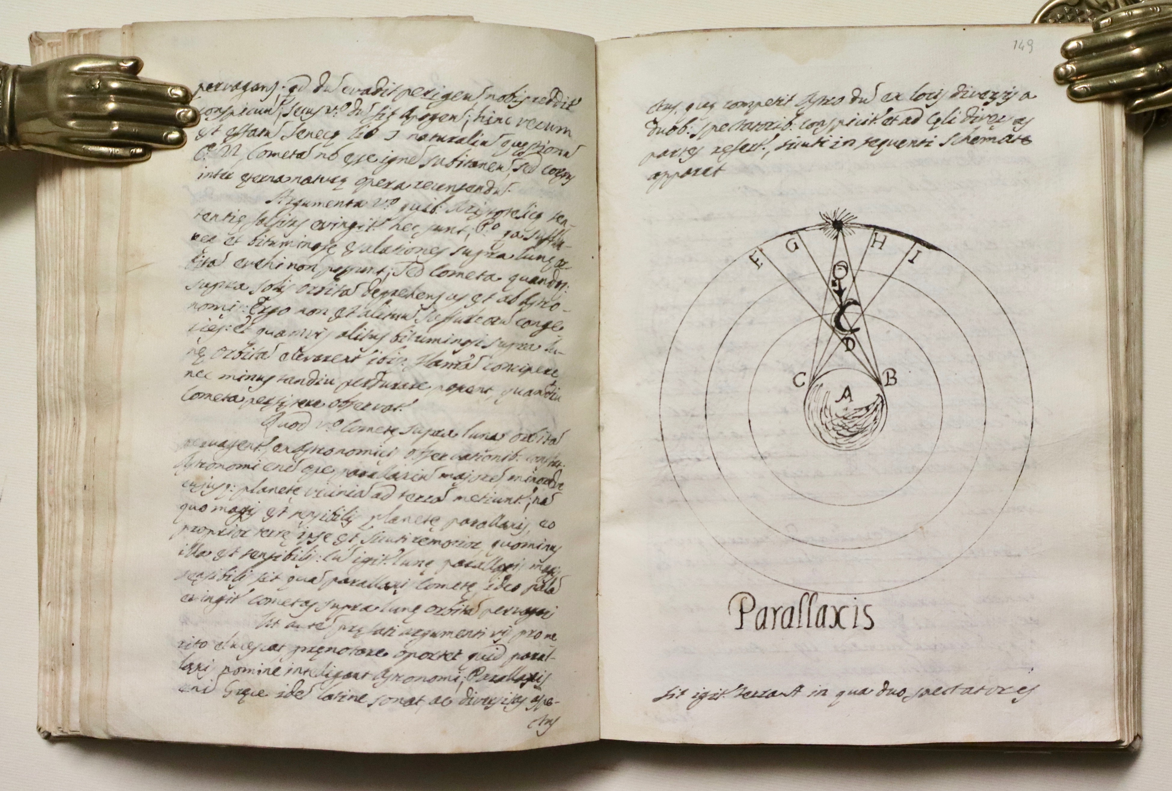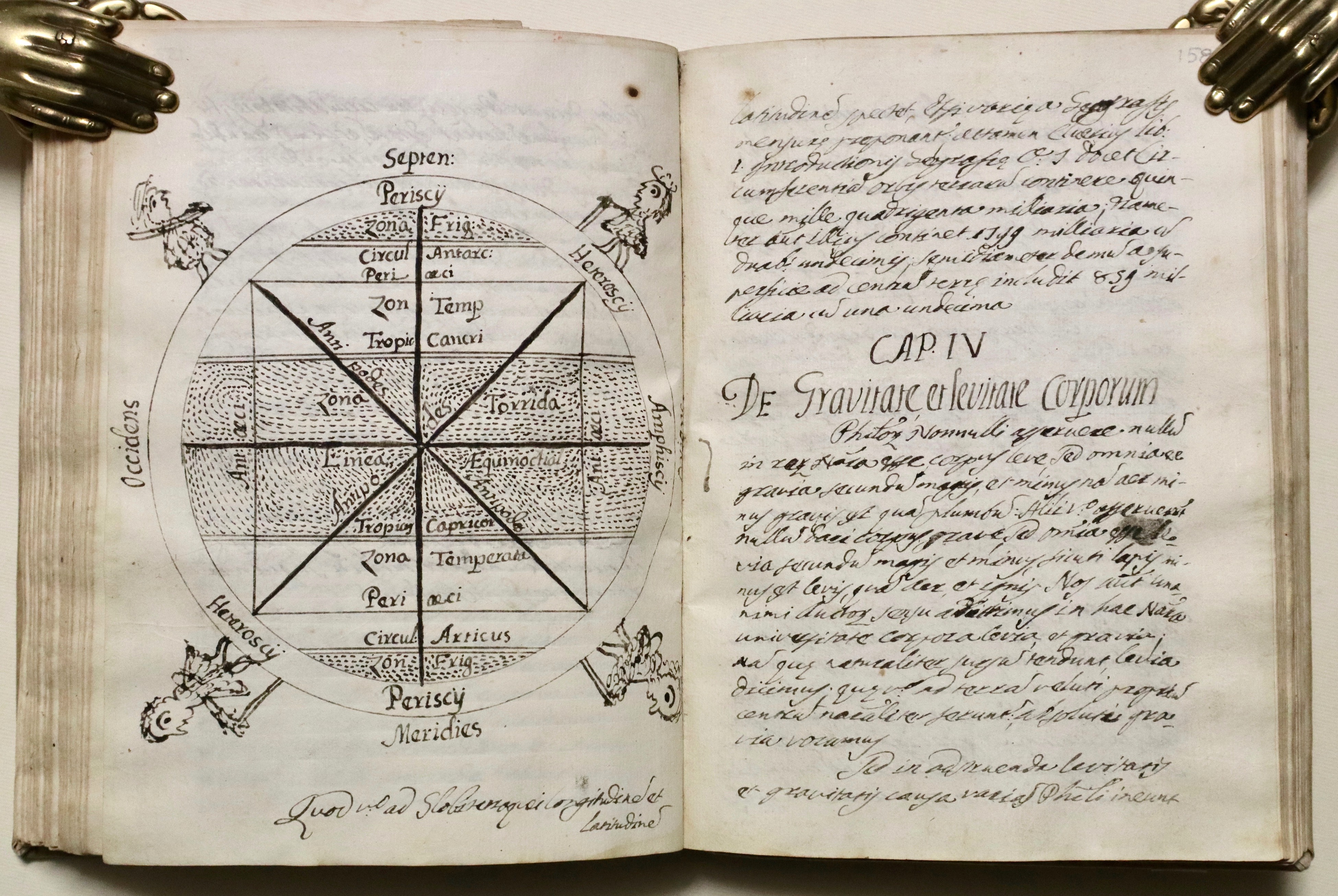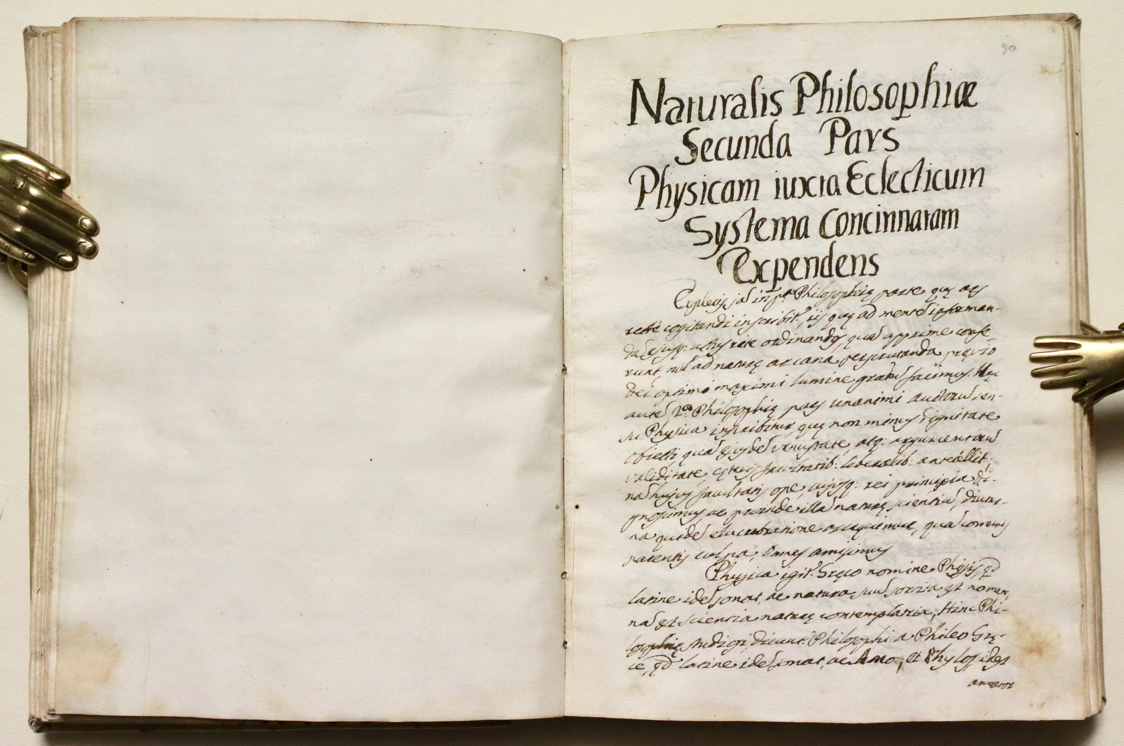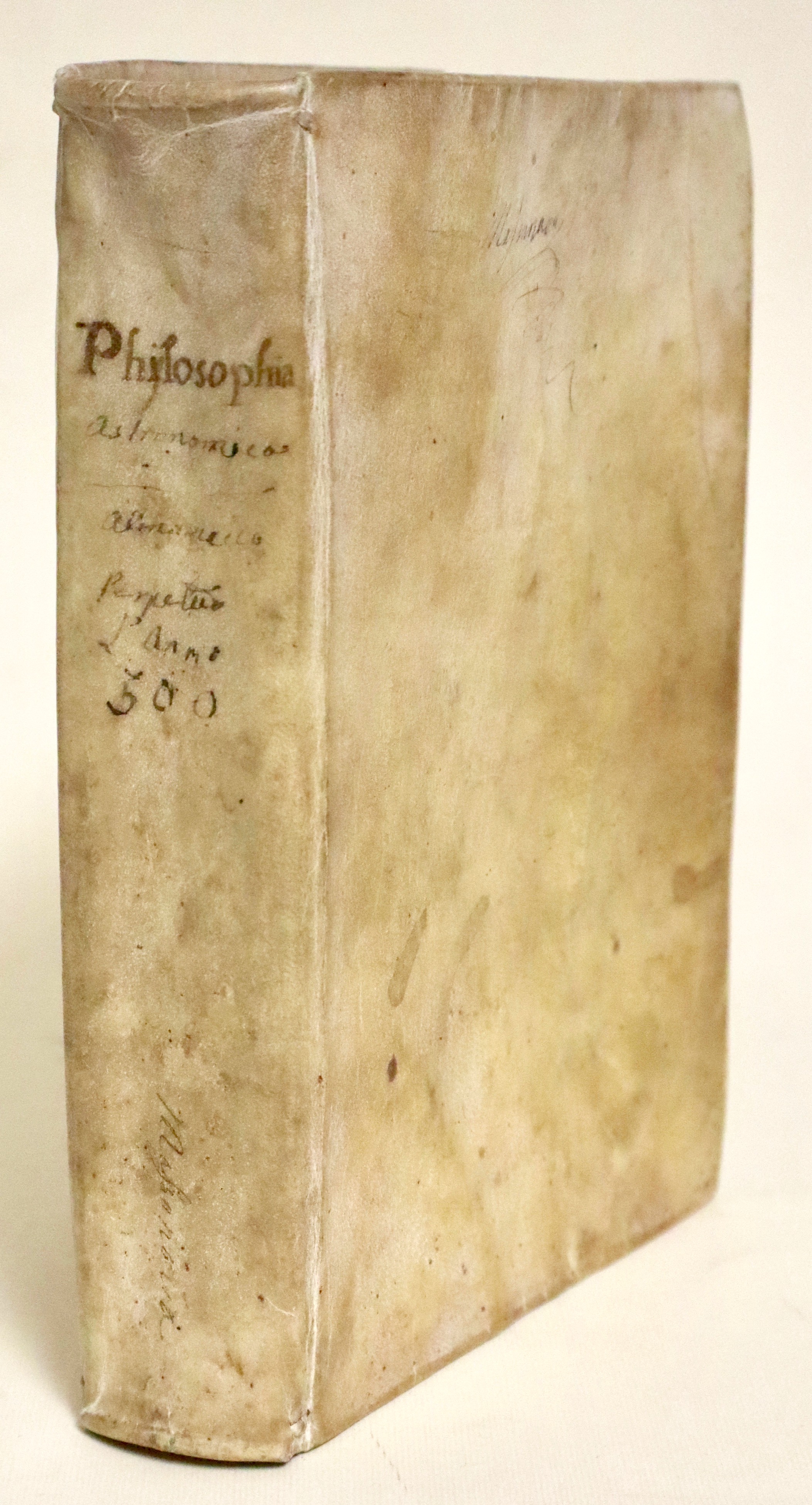 In 8°(mm 210x150). Due parti così suddivise: carte non numerate 231 per la prima parte, comprese 2 carte bianche e 9 tavole fuori testo con disegni astronomici (di cui 5 tavole ripiegate), diagrammi e sistemi cosmogonici ed altri riferimenti astronomici oltre a molti altri disegni nel testo eseguiti a inchiostro bruno fra cui una rosa dei venti; nella seconda parte, titolata Metaphisice seu generalis Philosophie prefatio 2 carte bianche, 51 carte n.n., 1 bianca con note manoscritte al verso. Testo manoscritto latino su carta vergellata a inchiostro bruno con marca d’acqua. Pergamena flessibile di fine ‘700, titolo manoscritto al dorso; il titolo si riferisce al vasto e sistematico corpo del pensiero Aristotelico, riprende nei vari libri e capitoli i saperi di quell’opera enciclopedica, che abbraccia logica, metafisica e il problema dell'universale, fisica e il modello geocentrico, etica, ricerca del fine, politica e scienza naturale, mirando a comprendere la razionalità dell’intera realtà attraverso l’osservazione e la classificazione, creando un sistema unificato del sapere umano. Tratta della logica, della natura delle idee, della loro verità e falsità, della specie e delle categorie aristoteliche, dei sillogismi sofistici e dell’arte del pensiero e del metodo filosofico, analitico e sintetico. La seconda parte, Metaphisice seu generalis Philosophie prefatio, tratta invece la fisica, ed è diviso in sei libri, fra cui l’interessante libro secondo sulla cosmografia che comprende la descrizione dei sistemi cosmogonici arricchiti di belle tavole di carattere astronomico. Il libro terzo descrive la terra e i suoi elementi, magnetismo, meteoriti, nubi e nebulose, tempeste e fulmini. Nel capitoletto successivo tratta degli aloni della corona solare; il libro cinque tratta degli animali, delle piante, della vita, dell’uomo, dell’unione della mente e del corpo, della sede della mente, invece dei moti e dei cinque sensi, dell’anima e passioni; tratta della dottrina relativa ai caratteri universali dell’ente, corrispondente alla ‘prima filosofia’ del più maturo Aristotele, detta poi ‘metafisica’: che è tradizionalmente considerata il fondamento di ogni sistema oggettivistico. Fascinoso oggetto, che presenta lievi fioriture saltuarie a poche pagine, alone dalla carta 64 fino alla 80, alone alla sguardia inf. Nota manoscritta a inchiostro bruno ai tagli con il nome della famiglia MASSANOVA allora proprietaria del volume, ripetuto più volte, così come al foglio di guardia iniziale dove al recto si riporta: Copia antica filosofia astronomia l’anno 500. Almanacco perpetuo scritto dall’antichi scienziati astronomi filosofi la quale posteriore à quest’opera vi sono dell’Almenachi in stampa. Con l’autore di Rutilio Ben Casa. Una piccola mancanza alla pergamena del piatto post. in basso. Al verso della carta 182 vi è un foglio rosa scritto dagli eredi Massanova, senza data ma del 1813 presumibilmente