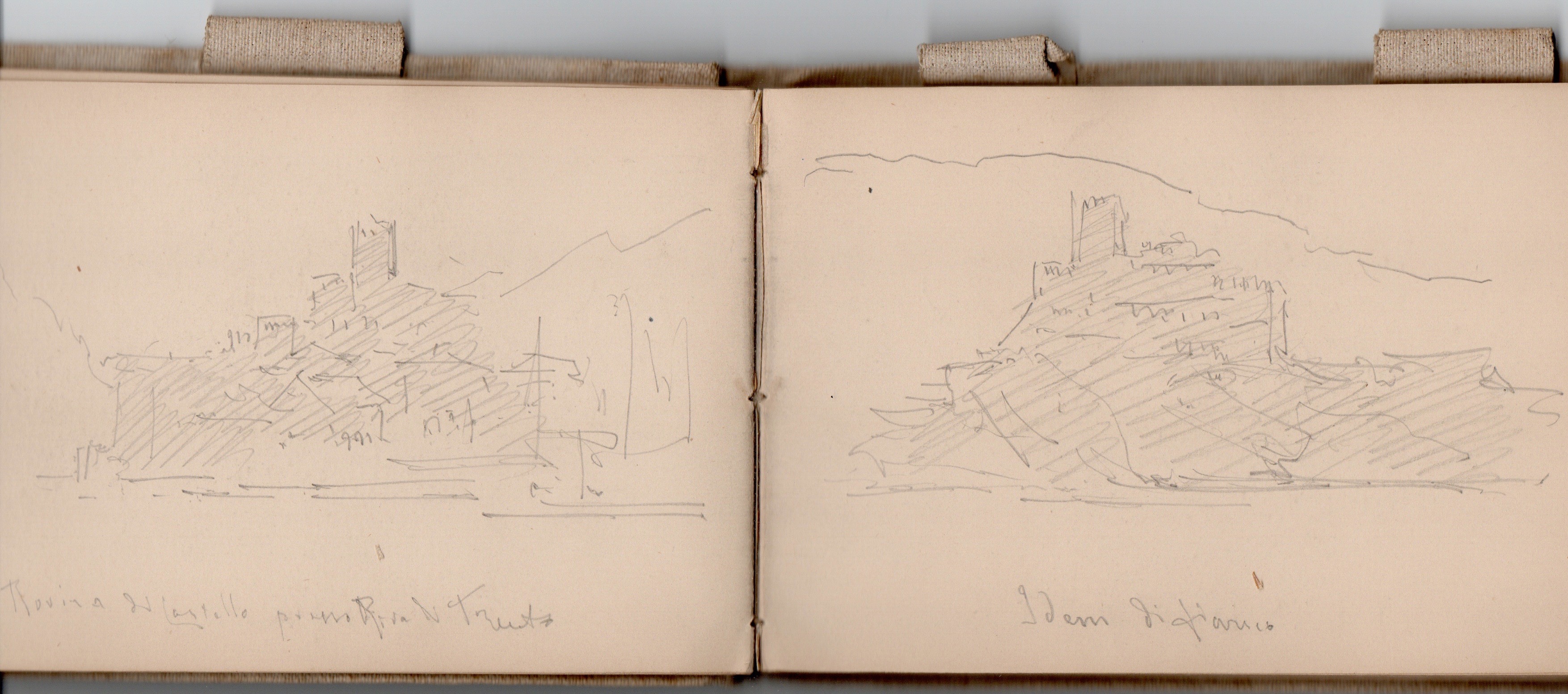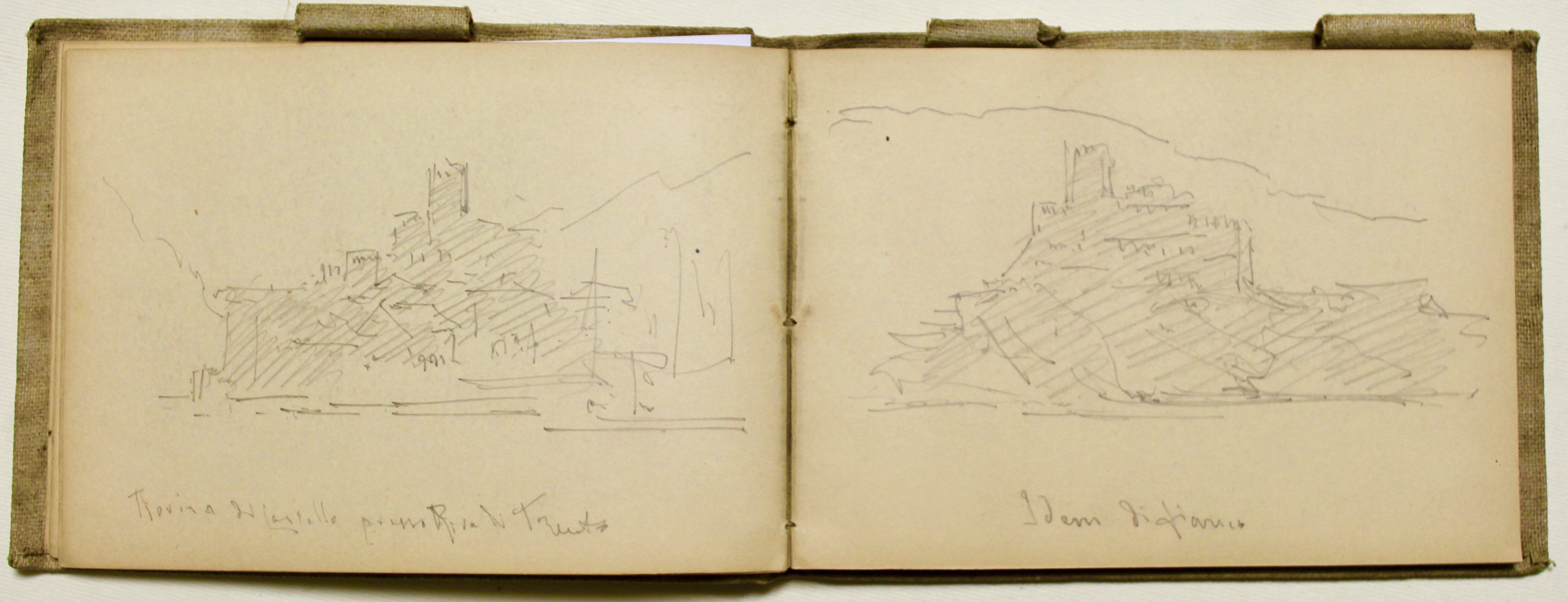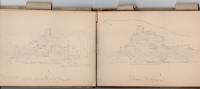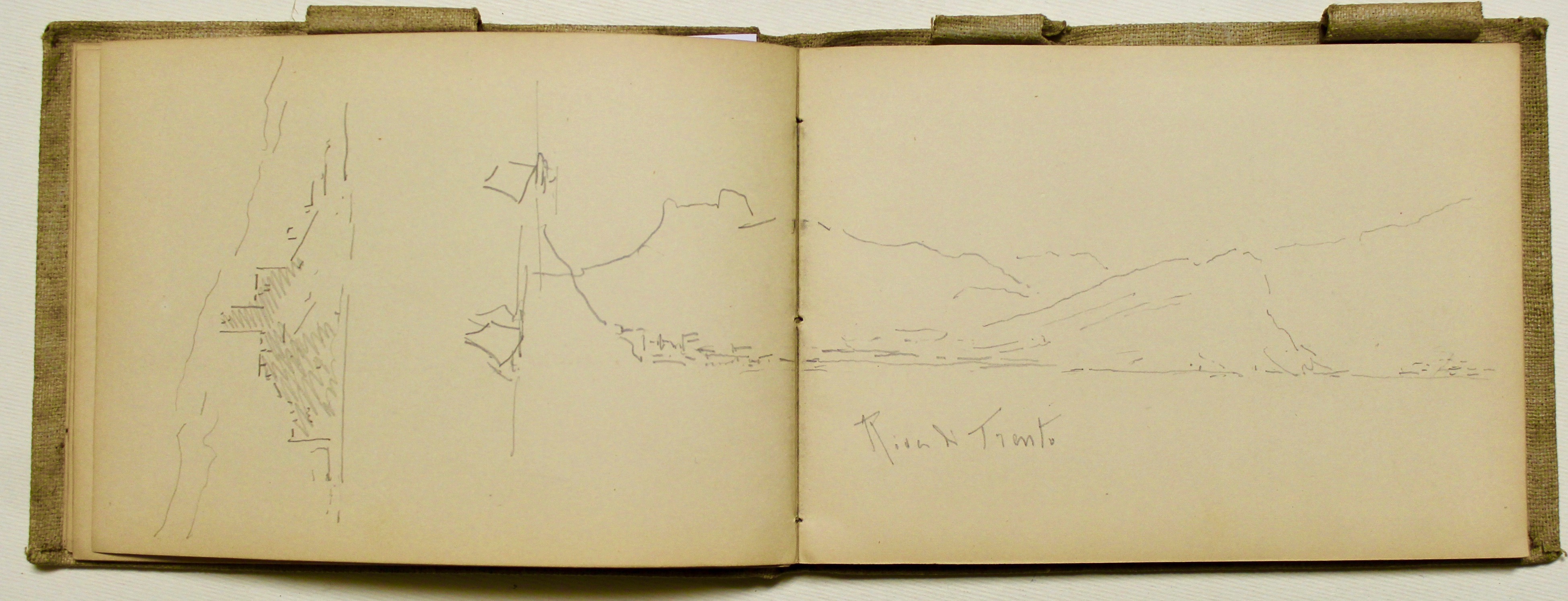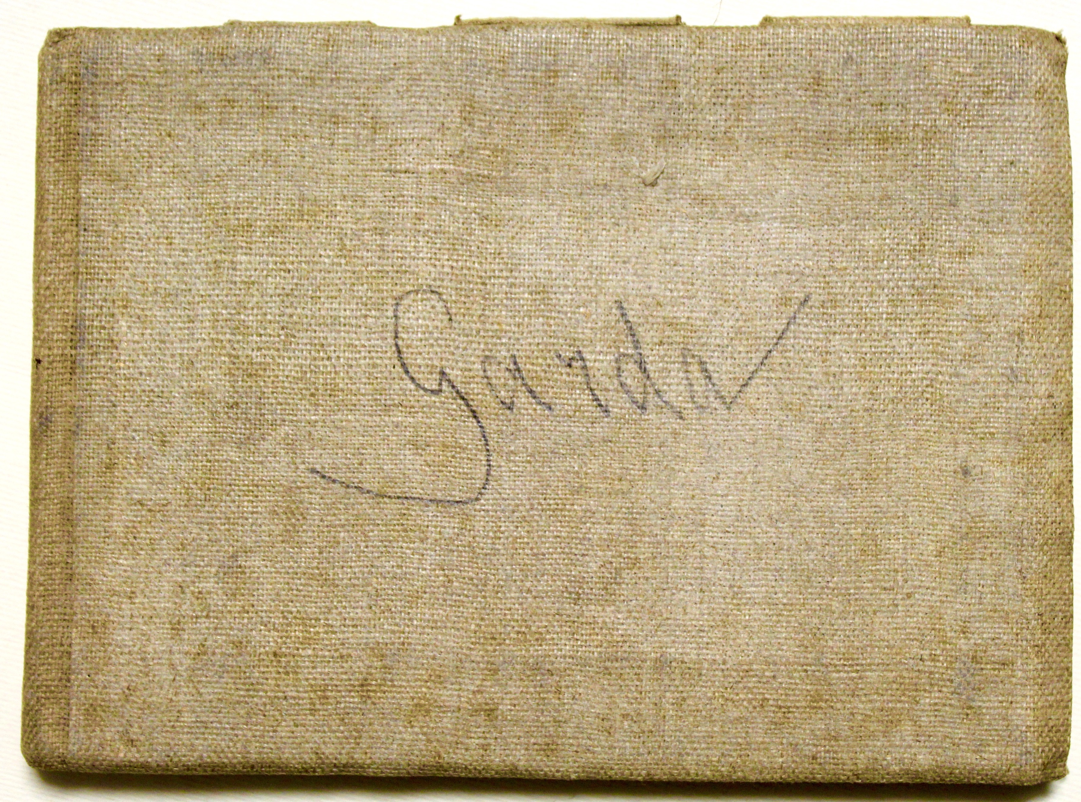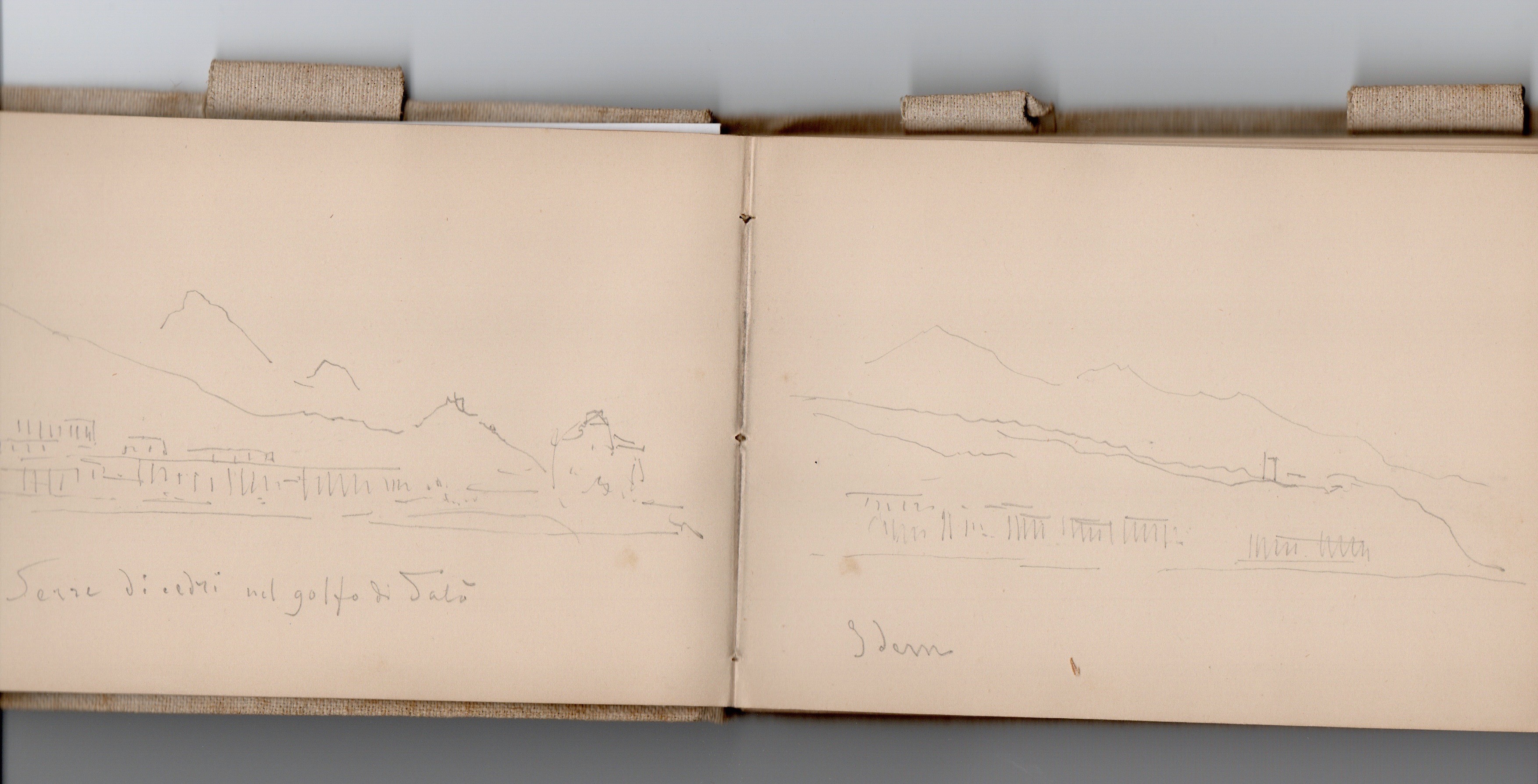 Album in oblungo in 12° (mm 110x158) manoscritto a lapis con disegni al tratto; 46 fogli con 52 facciate disegnate (16 fogli son bianchi). Tela coeva con titolo a matita « GARDA » al piatto anteriore. I soggetti sono generalmente paesaggi lacustri colti da una barca che delineano la costa, ma non manca qualche scena e qualche particolare. I soggetti sono appena abbozzati, forse non finiti, opera di un viaggiatore probabile artista amatore ma l’album risulta comunque interessante ; si raffigura Salò, Gardone, Maderno, l’isolotta, Riva del Garda. Ben conservato. All’interno vi è un’etichetta del negozio Carlo Cogiola di Milano.