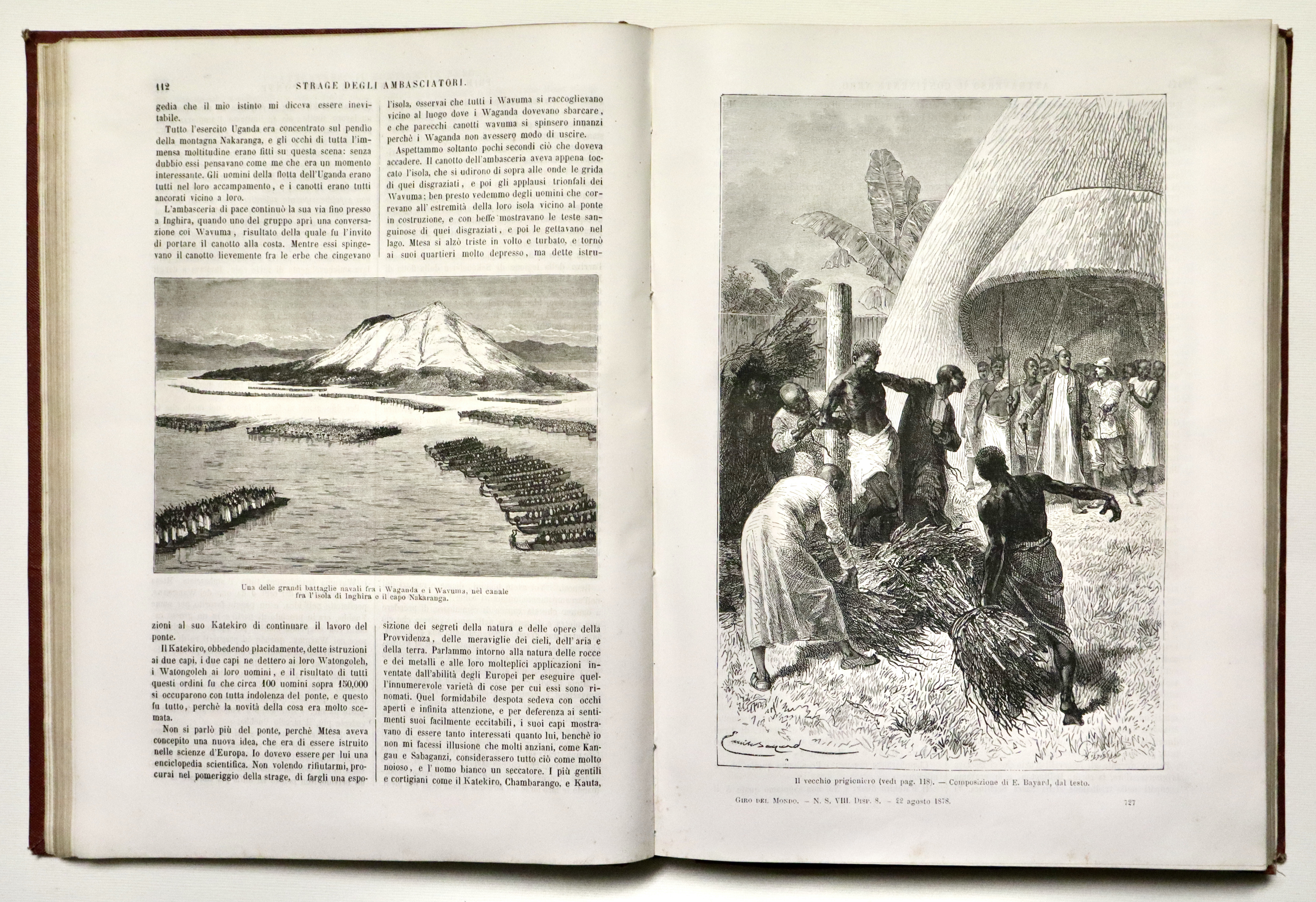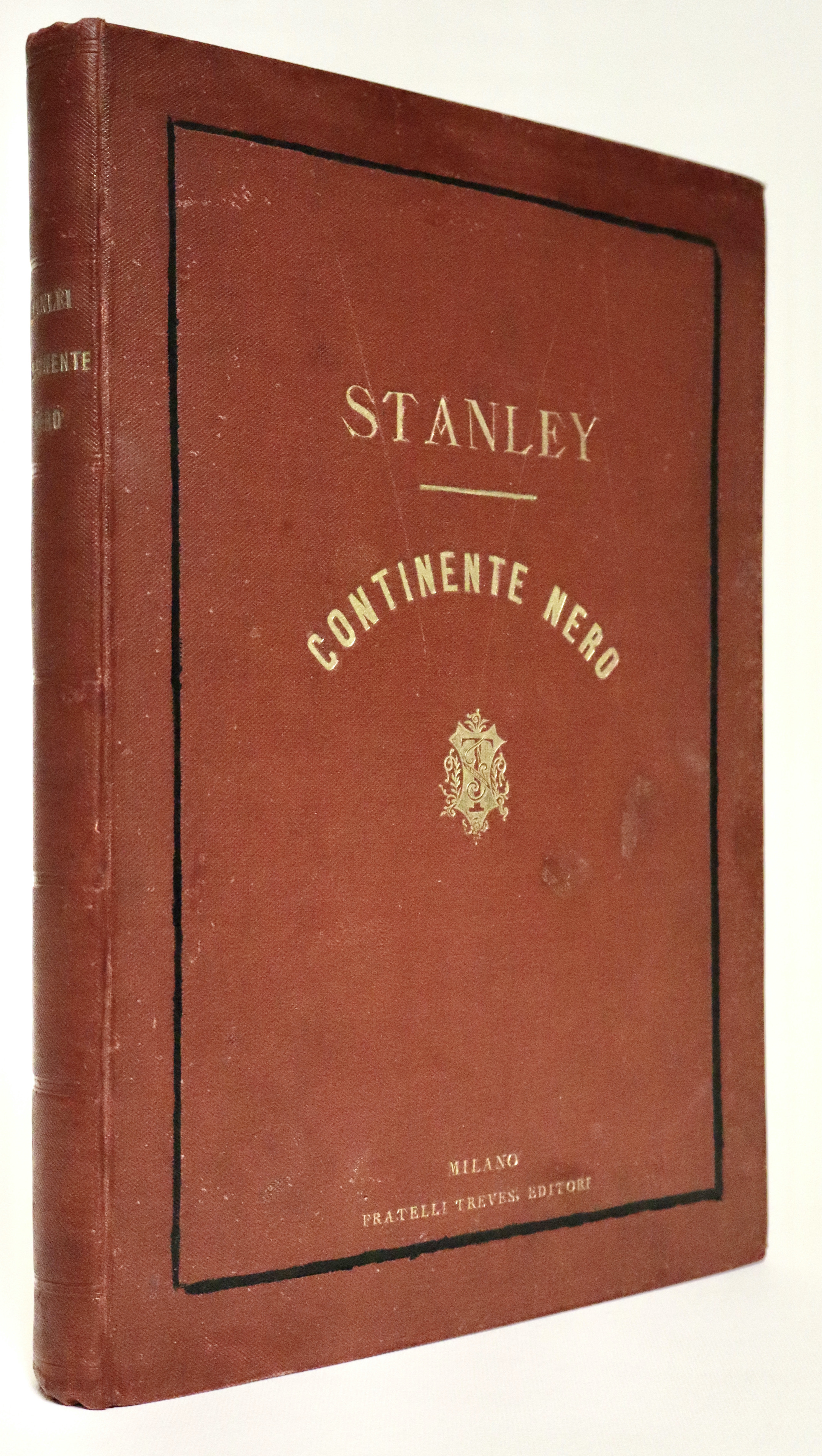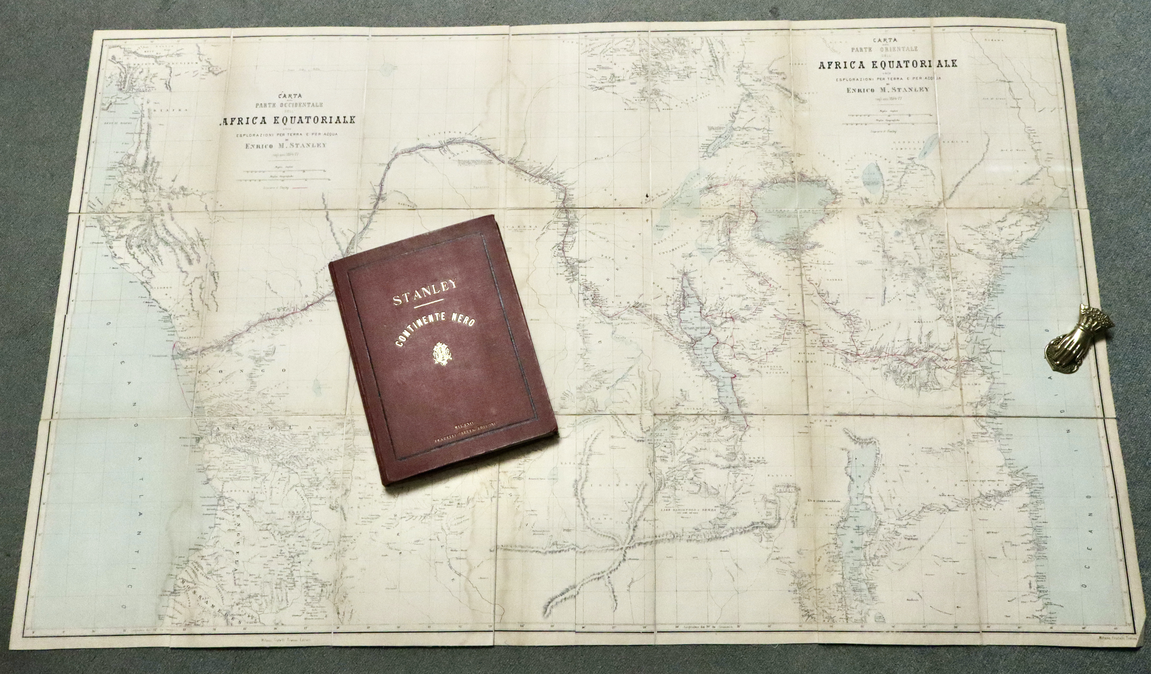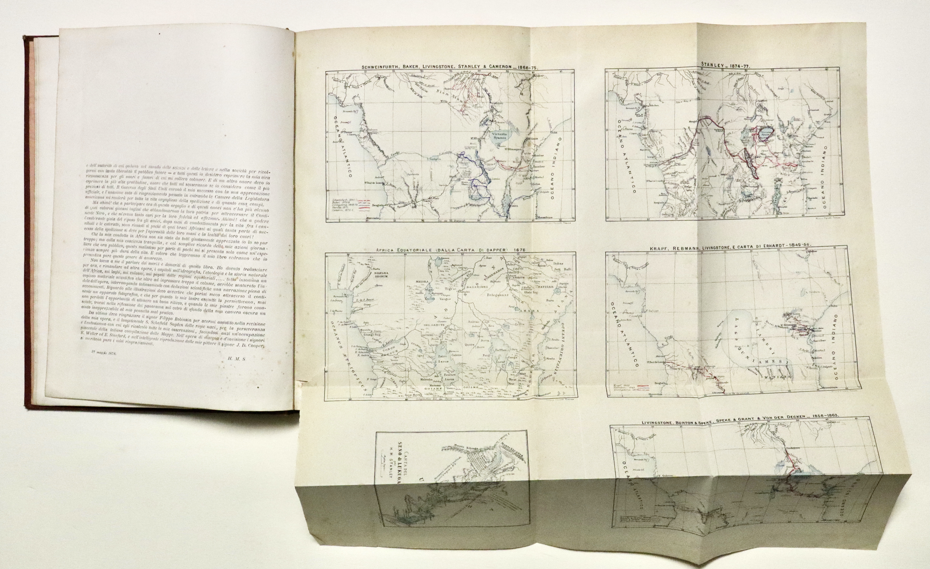 In 8° grande (mm 300x220); pagg. 4 non num. 374 con 6 carte piccole su un foglio fuori testo all’inizio ed una carta litografica di grande formato (mm 820x1340) ripiegata più volte alla fine intitolata Carta della parte occidentale (e orientale) dell’Africa equatoriale e delle esplorazioni per terra e per acqua di Enrico M. Stanley. Ottimo esemplare con qualche piccola fioritura della carta all’inizio. Tela editoriale granata con titoli impressi in oro a dorso e piatto (entro riquadro nero) Il viaggio di Stanley (1841–1904) del 1871–1872 alla ricerca di David Livingstone, poi proseguito al suo fianco lungo la parte nord del Lago Tanganica, segnò profondamente il giornalista, che decise di dedicare all’esplorazione dell’Africa il resto della sua vita. Sostenuto da un nuovo finanziamento del New York Herald, oltre che del Daily Telegraph, nel 1874 partì per un viaggio di tre anni che lo vide attraversare l’Africa equatoriale da est a ovest e percorrere, primo tra gli Europei, il corso del fiume Congo fino alla foce. Stanley raccontò il suo viaggio nel libro Through the Dark Continent (1878), che comprendeva anche questa Carta della parte occidentale dell’Africa equatoriale, che per la prima volta restituisce il corso del fiume Congo con grande precisione, soprattutto considerata la non vasta preparazione cartografica del suo autore. Gli itinerari di Stanley sono tracciati in rosso, come nella carta di Livingstone di cui la carta riprende lo stile in tutto e per tutto.