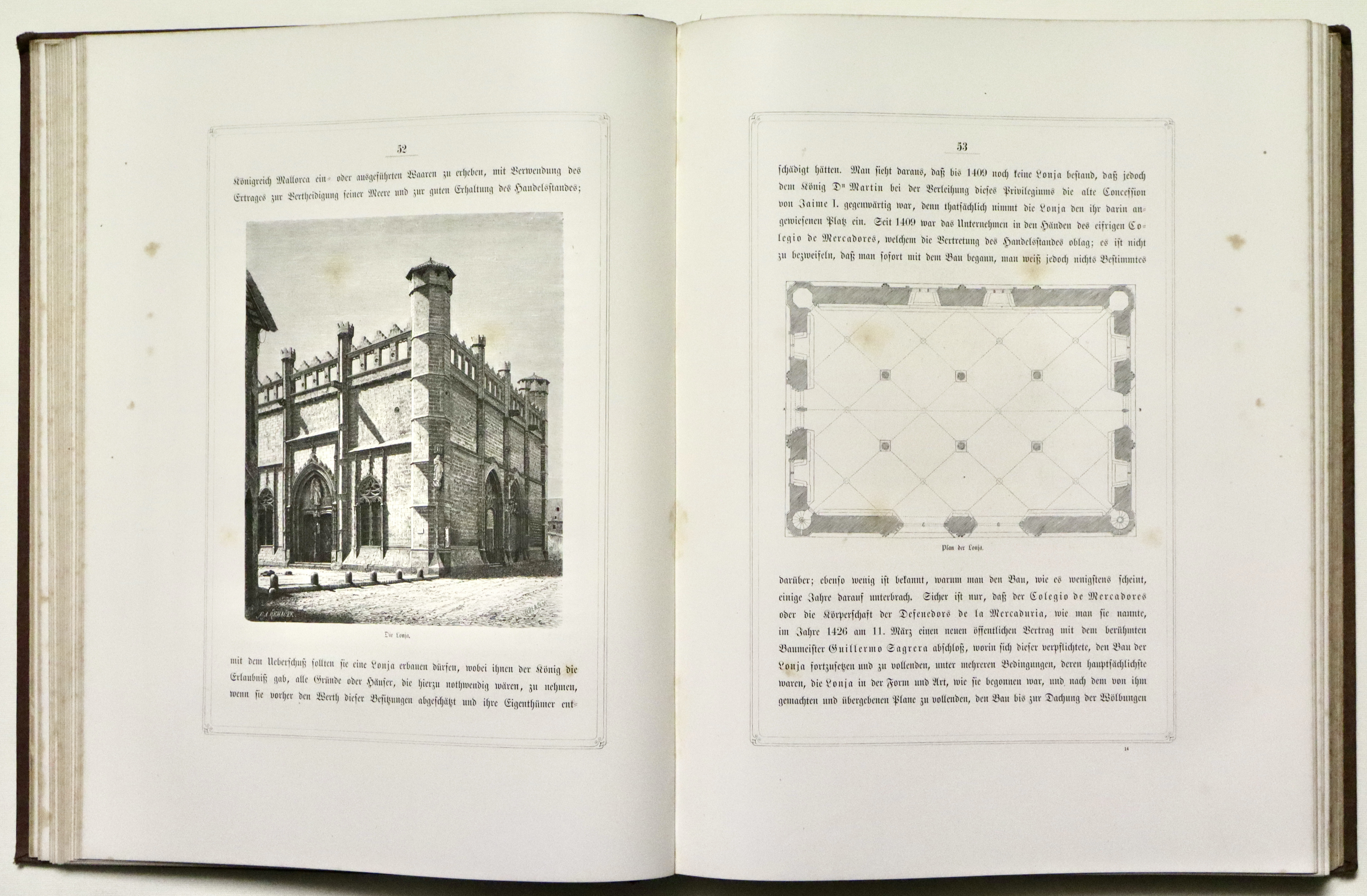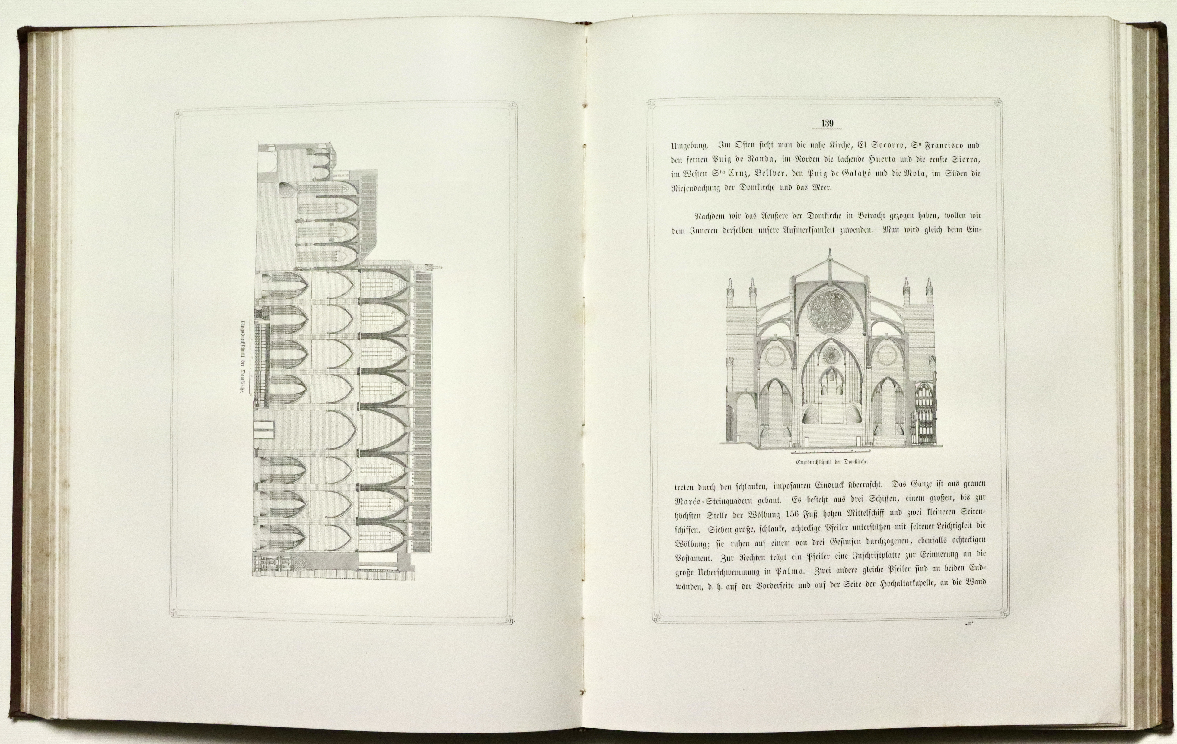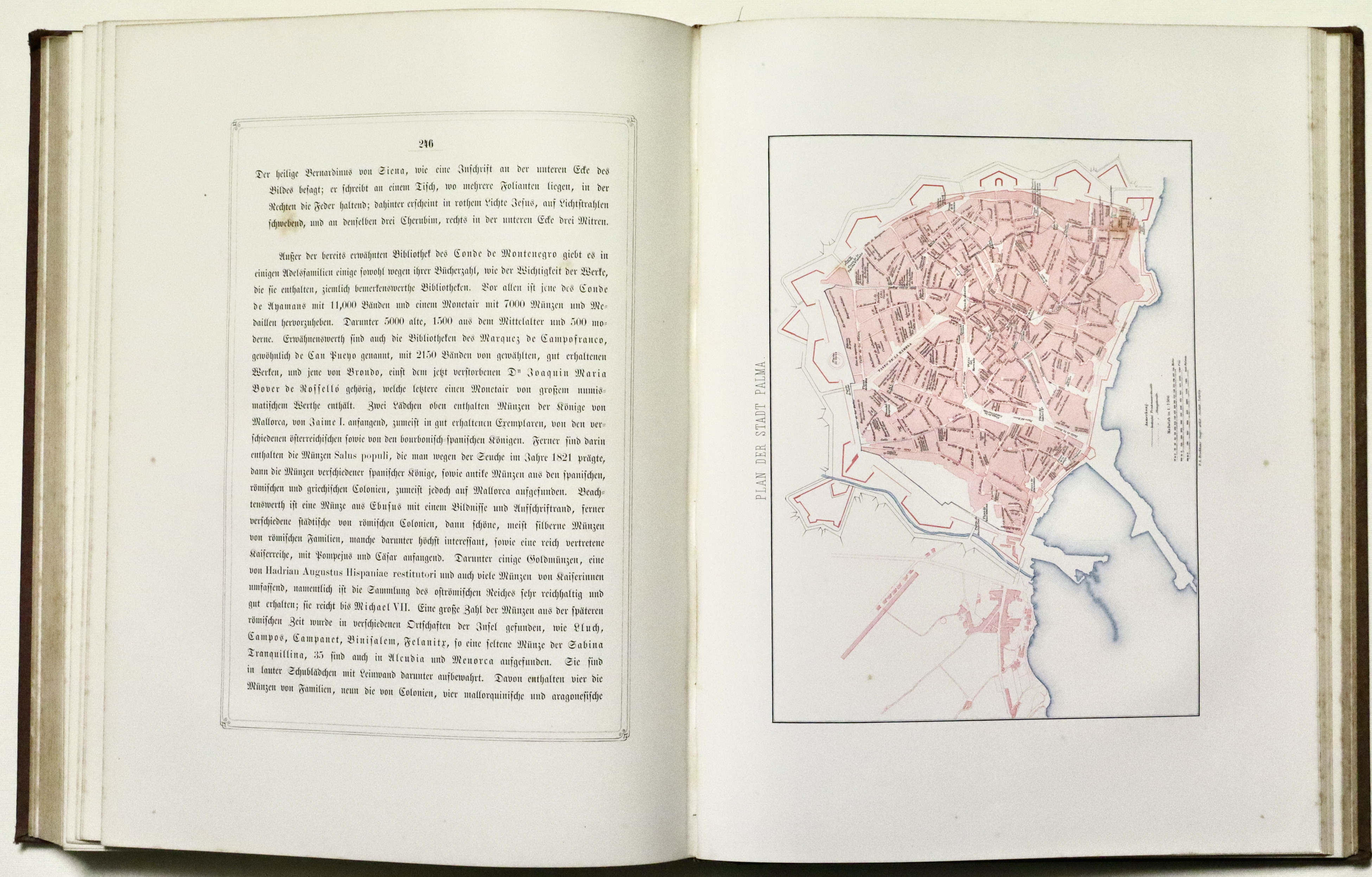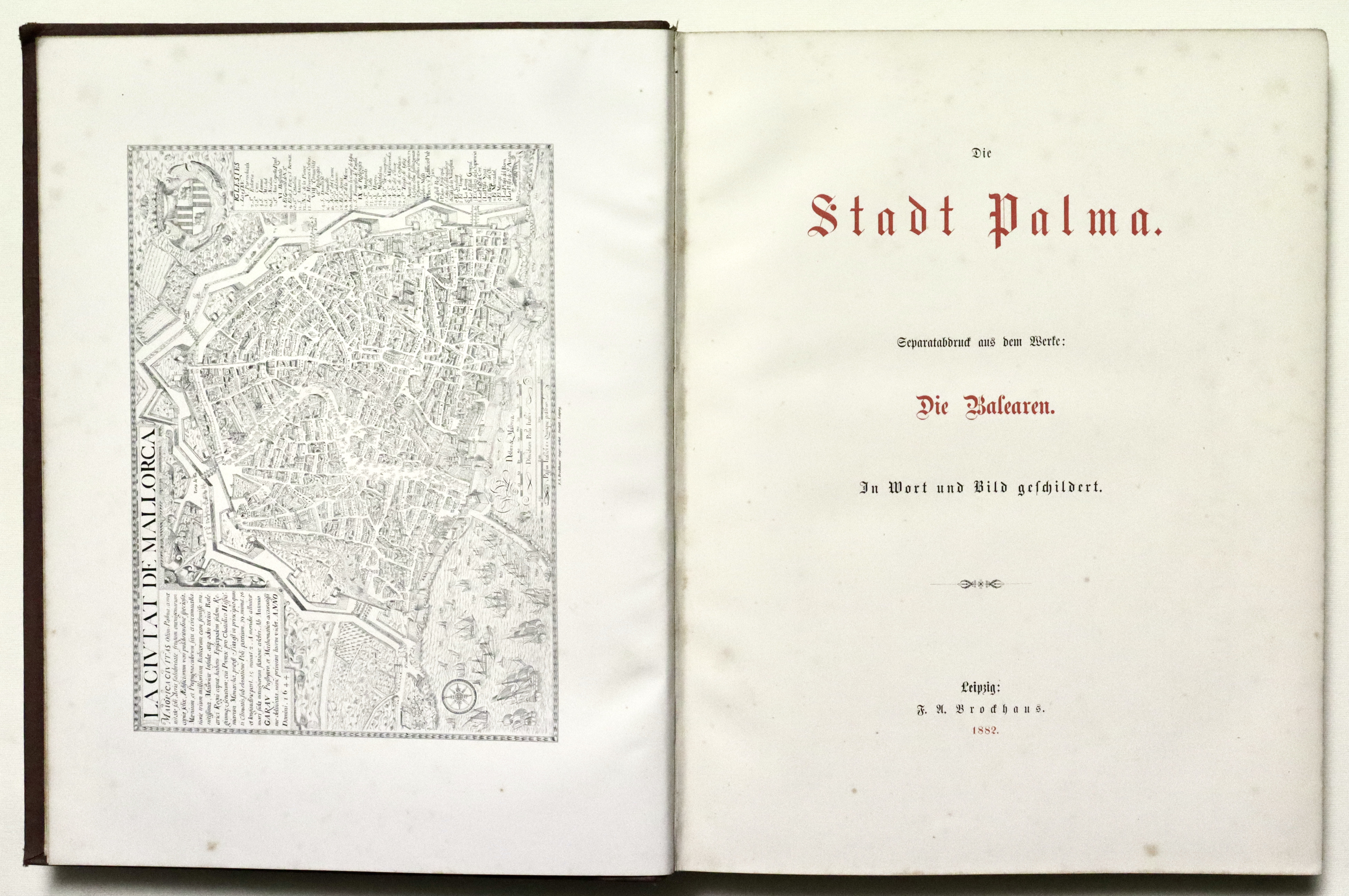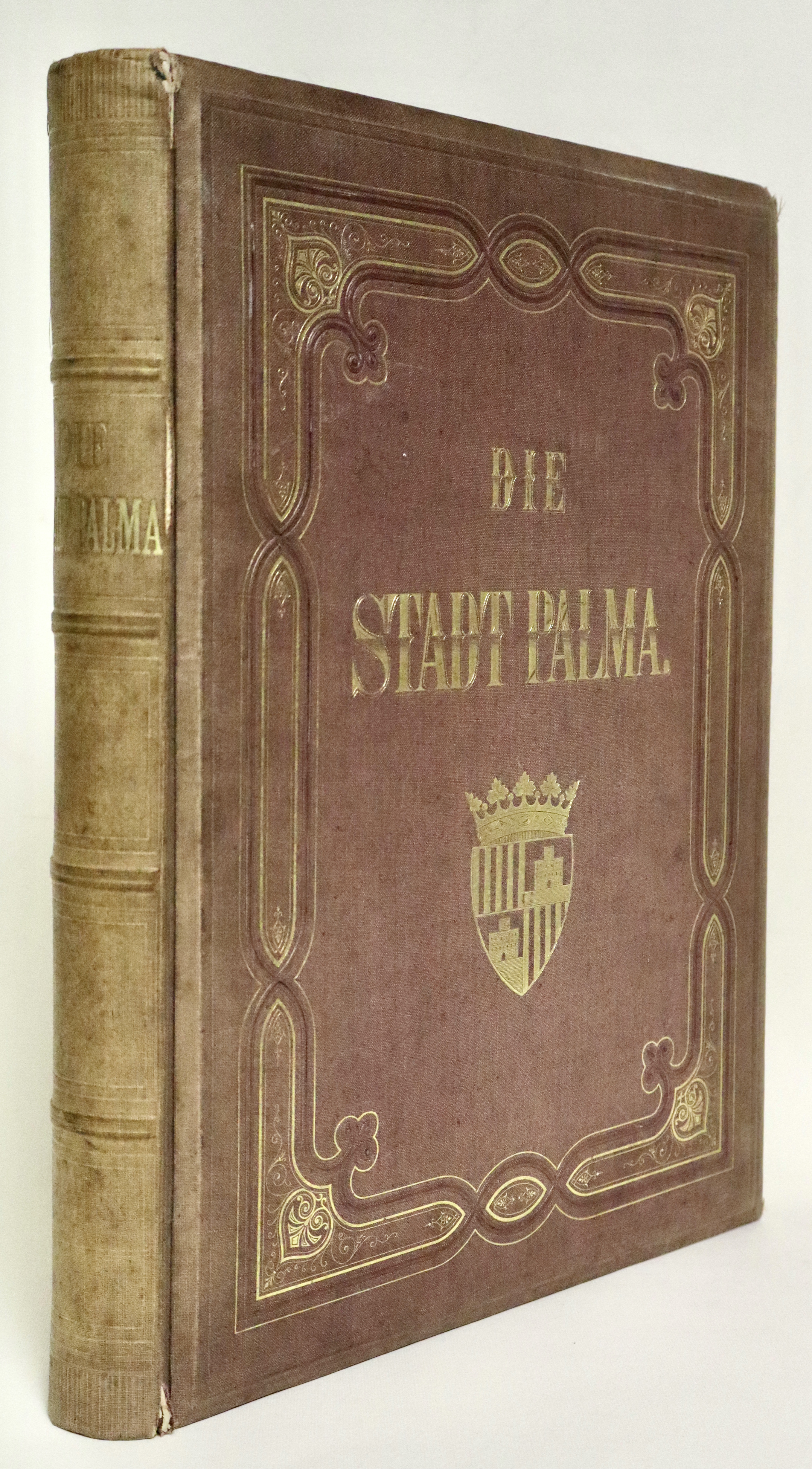 In folio (mm 402x300). Pagine [4], 309, [1] e con 3 tavole f.t. di cui due piante di Palma, una a colori e una in nero disegnata dall’ab. Antonio Garau., e una pianta del Duomo e 117 immagini in silografia nel testo basate su disegni che Ludwig Salvator aveva fatto sul posto, che non di rado sono il primo e allo stesso tempo il miglior materiale illustrativo degli oggetti descritti: Palazzi, piazze, strade, architetture... In quest’ottica, quest’opera e altri libri di Ludwig Salvator rappresentano un importante contributo alla conoscenza storica del mondo insulare mediterraneo.