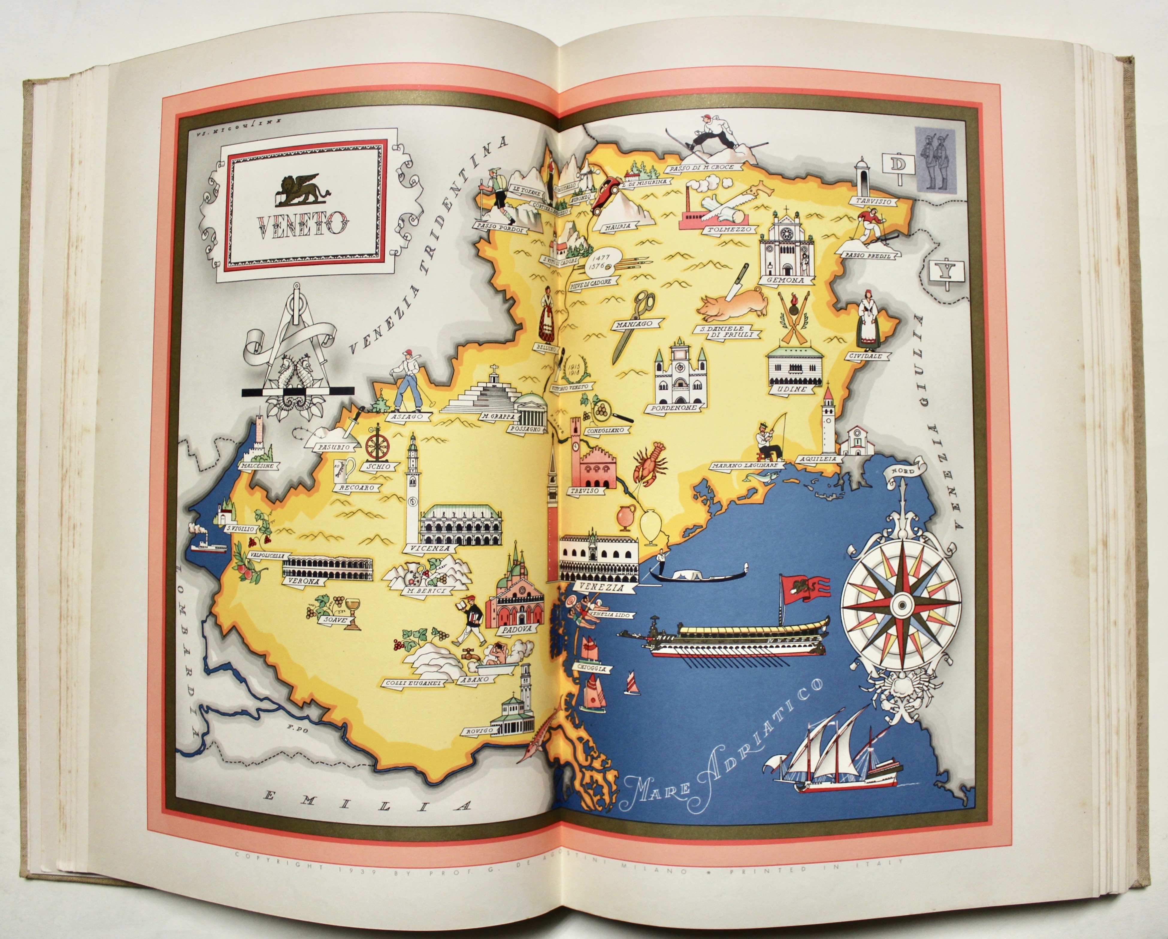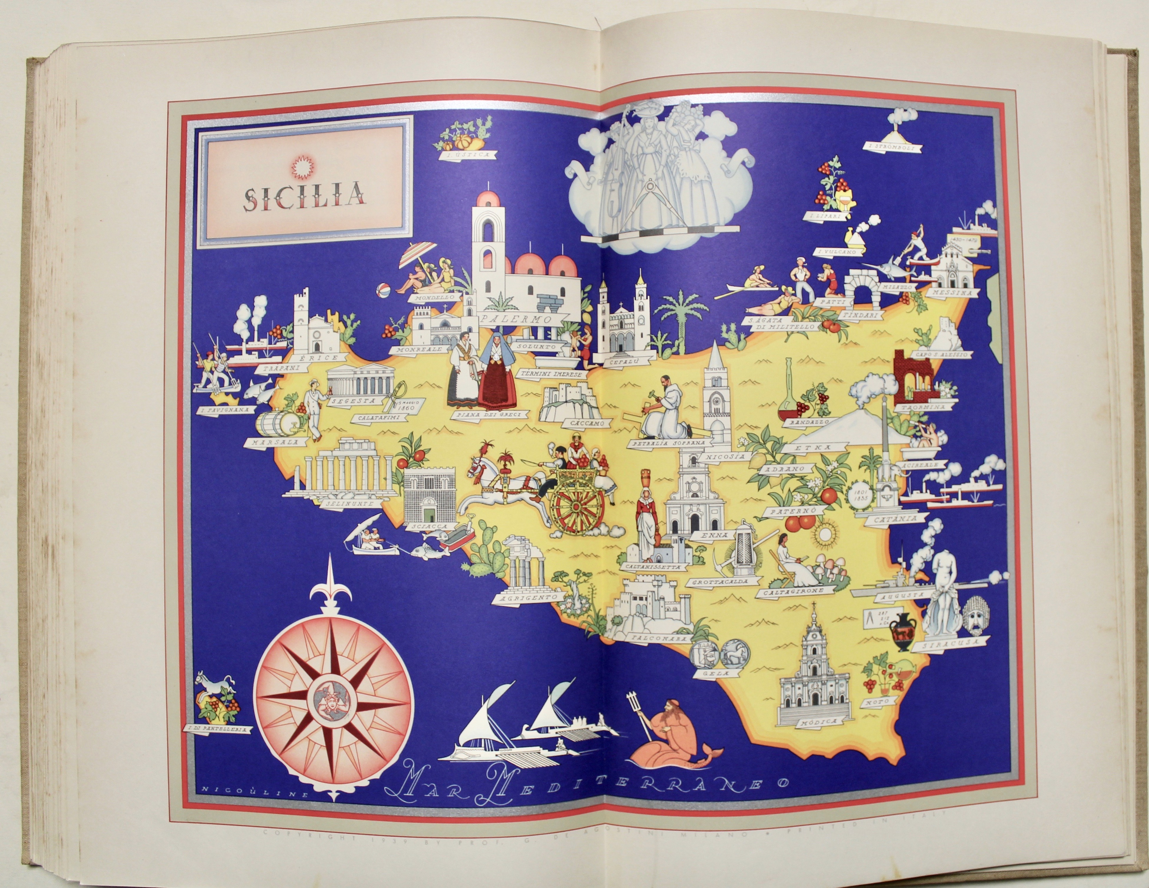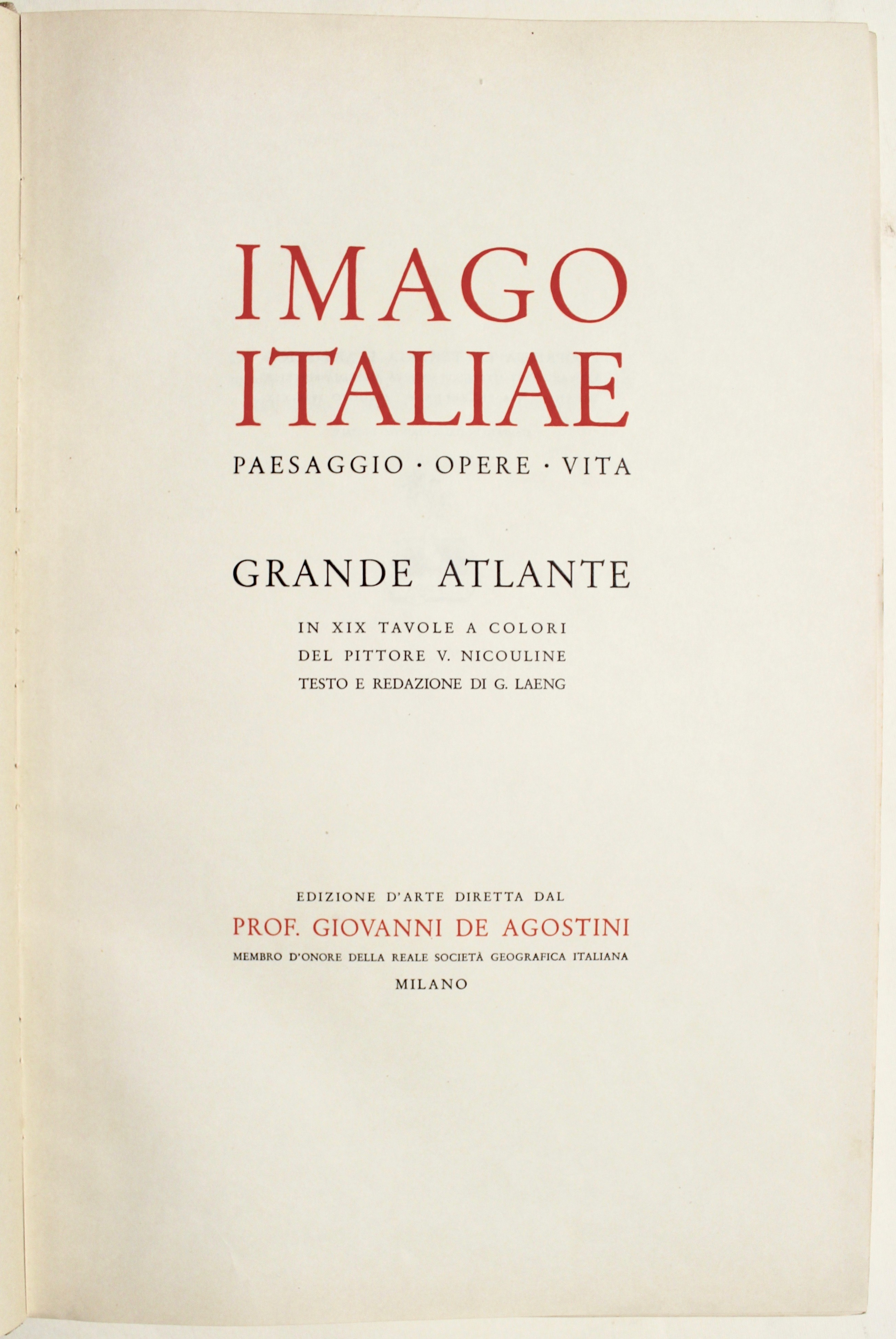 Due volumi in folio, mm 480x310, rilegati in tela editoriale chiara con titolo impresso in oro al piatto del solo volume principale, 20 carte complessive. Rara prima edizione di questo elegante e famoso atlante d’Italia pubblicazione diretta dal Prof. Giovanni De Agostini per conto dell’editore ItalGeo, corredato dall’interessante testo a due colori di G. Laeng. Completo del volume di appendice della Corsica, pubblicata in un volume a sé stante, spesso mancante. Con 19 mappe + 1 (Corsica) cromolitografiche opera dell’illustratore russo naturalizzato italiano Vsevolod Petrovič Nikulin (Nicouline). Vsevolode Nicouline nacque nel 1890; fu costretto all’esilio dopo la vittoria di Lenin; si trasferì in Italia dove si sposò, visse e morì lavorando come noto illustratore per pubblicità, riviste ed altro. Il suo innovativo gusto pittorico raffigura le regioni italiane con le città rappresentate con il loro edificio più rappresentativo oltre a personaggi attività agricole, prodotti tipici, animali. Tutte le carte sono arricchite da grandi rose dei venti, decorativi velieri e grandi cartigli. Edito in 999 copie numerate; questo nostro esemplare è il numero 90