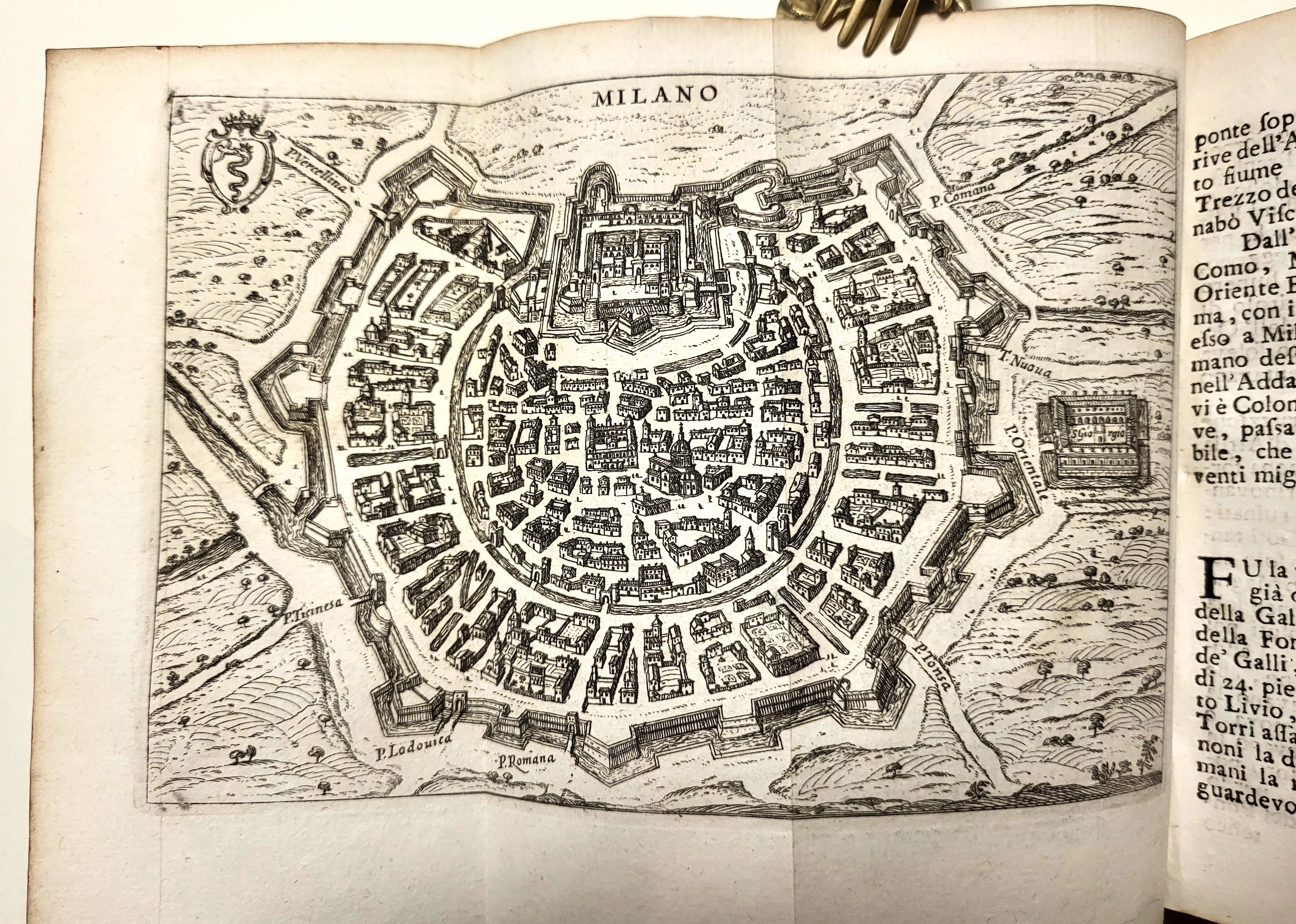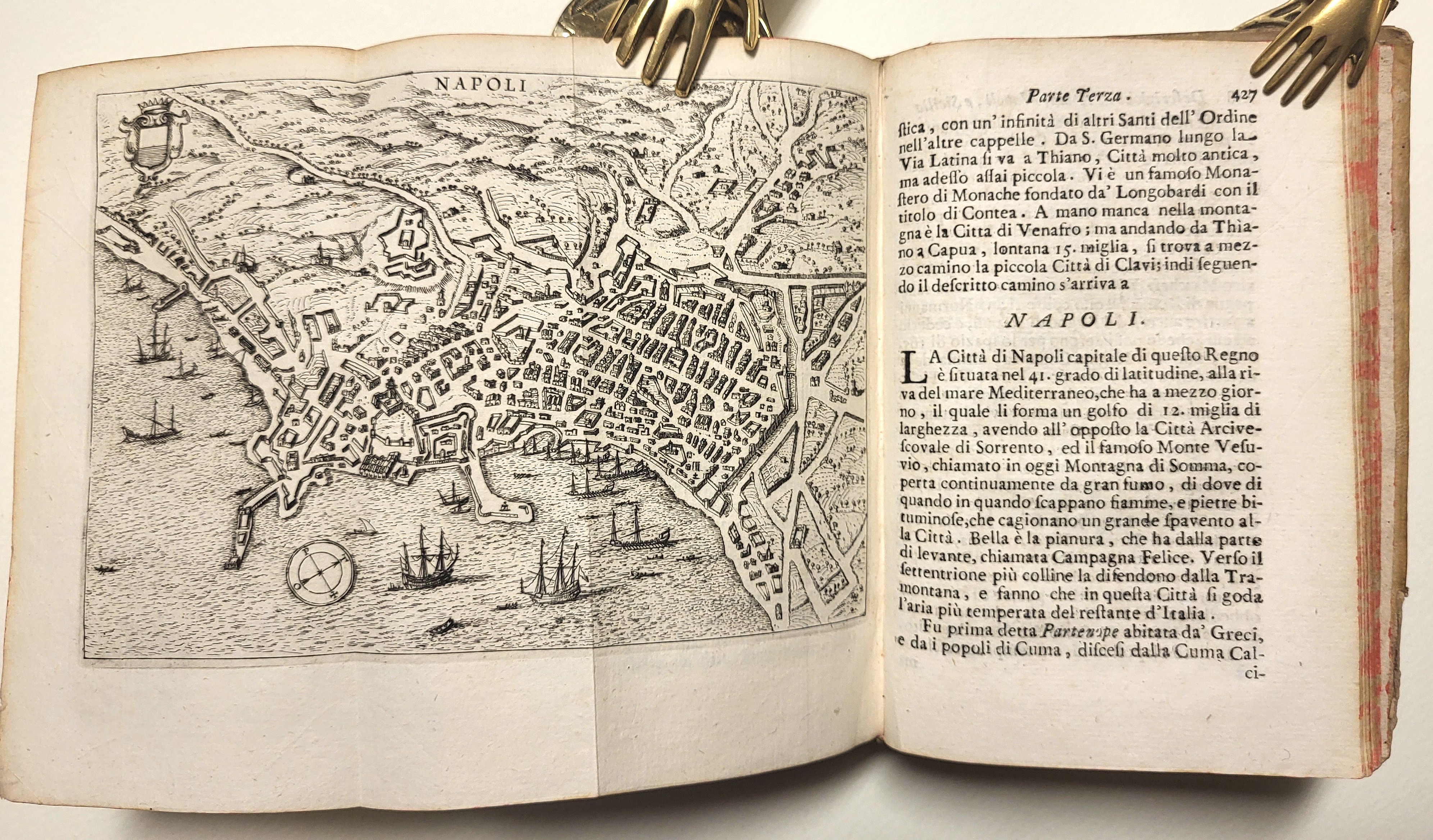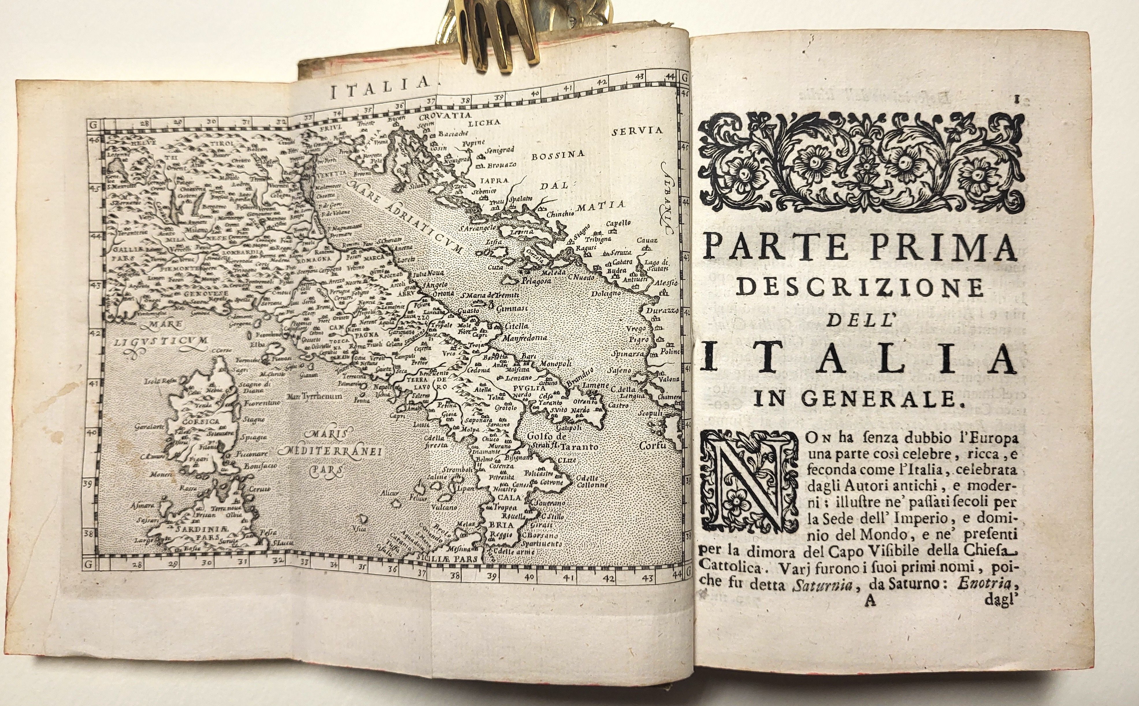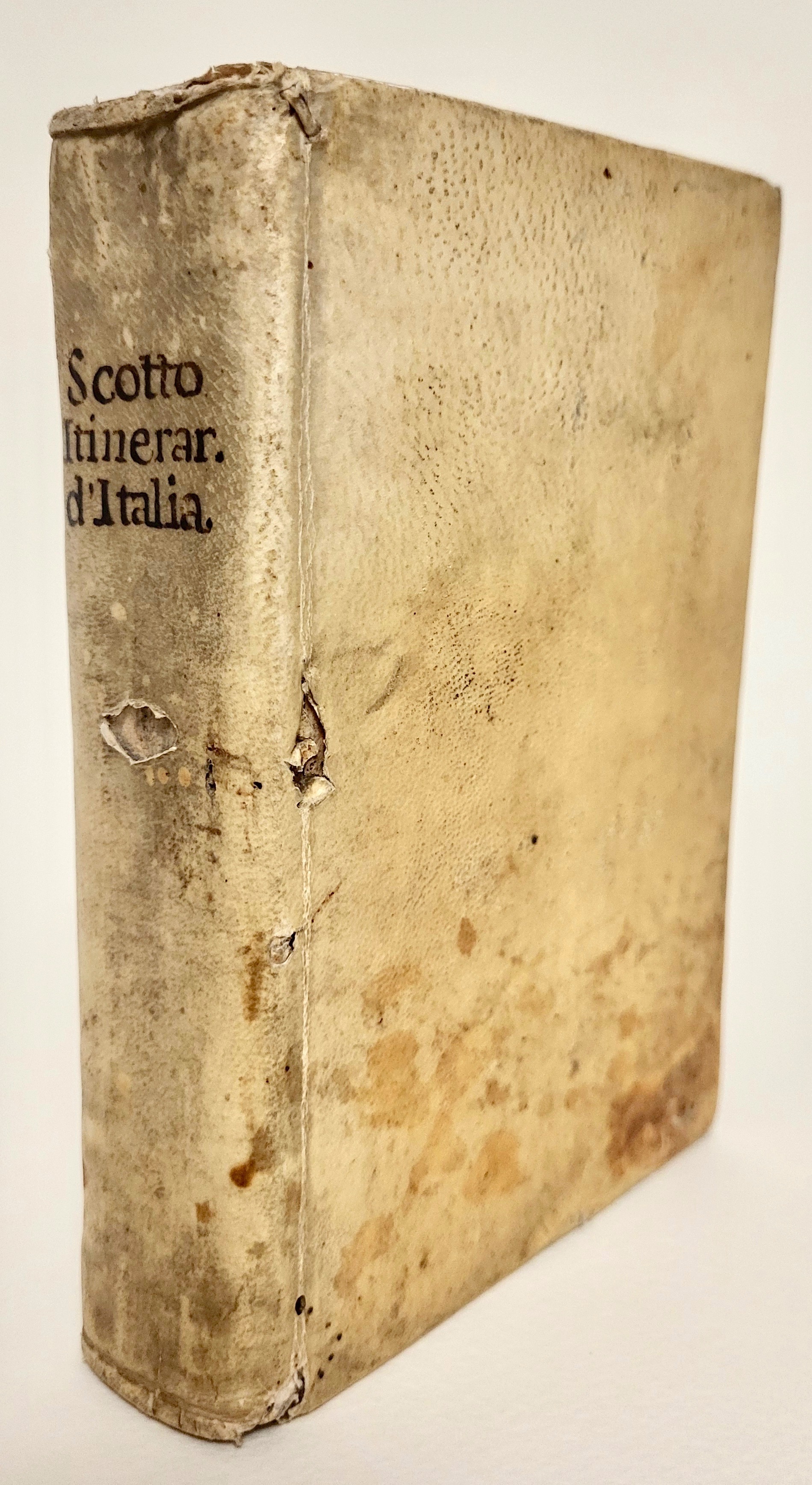 Buona edizione di una delle più note descrizioni geografico-storico-artistico della penisola, originariamente pubblicata in latino nel 1600 e poi tradotta nel 1615 in italiano. L’opera come asserisce nella prefazione “assolutamente priva di favole, o di falsità”, a detta del Marchese Maffei, risulta ricchissima di notizie curiose oltre che di descrizioni fedeli ai luoghi citati. La prima parte “Descrizione dell’Italia in generale”riguarda prevalentemente il nord Italia ma anche Toscana ed il centro Italia con relative tavole, la seconda parte “Viaggio di Francia a Roma” è un itinerario da Chambery a Roma, la terza parte è “Descrizione di Roma, Napoli e Sicilia”. Alla fine vi è “Notizia distintiva delle poste che si riscontrano in diversi viaggi principali d’Italia”.