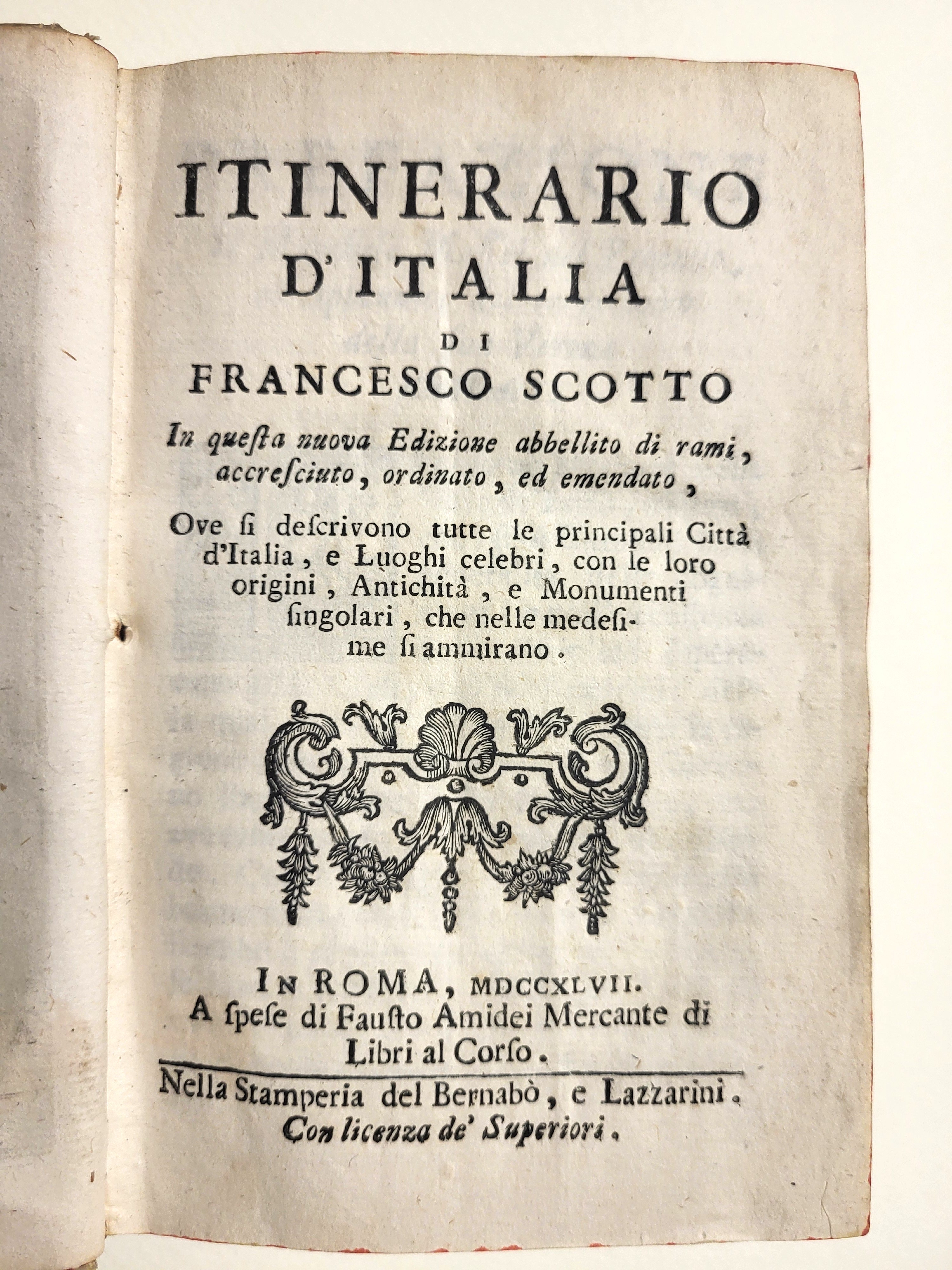 Itinerario d’Italia…in questa nuova edizione abbellito di rami, accresciuto, ordinato, ed emendato, ove si descrivono tutte le principali città d’Italia, e luoghi celebri, con le loro origini, antichità, e monumenti singolari, che nelle medesime si ammirano.