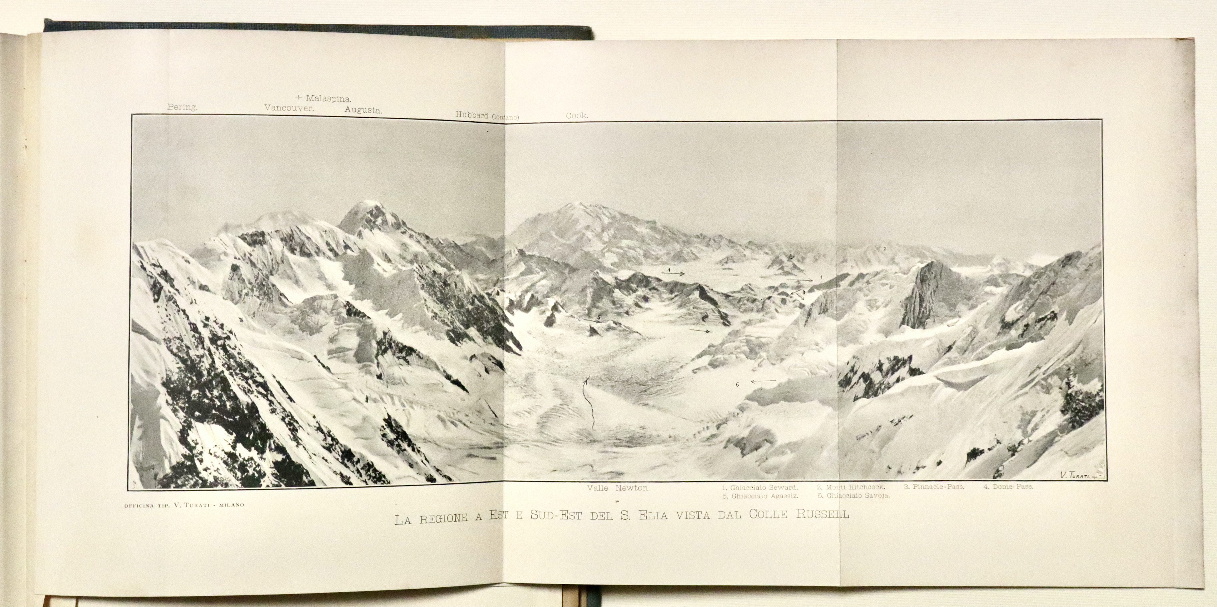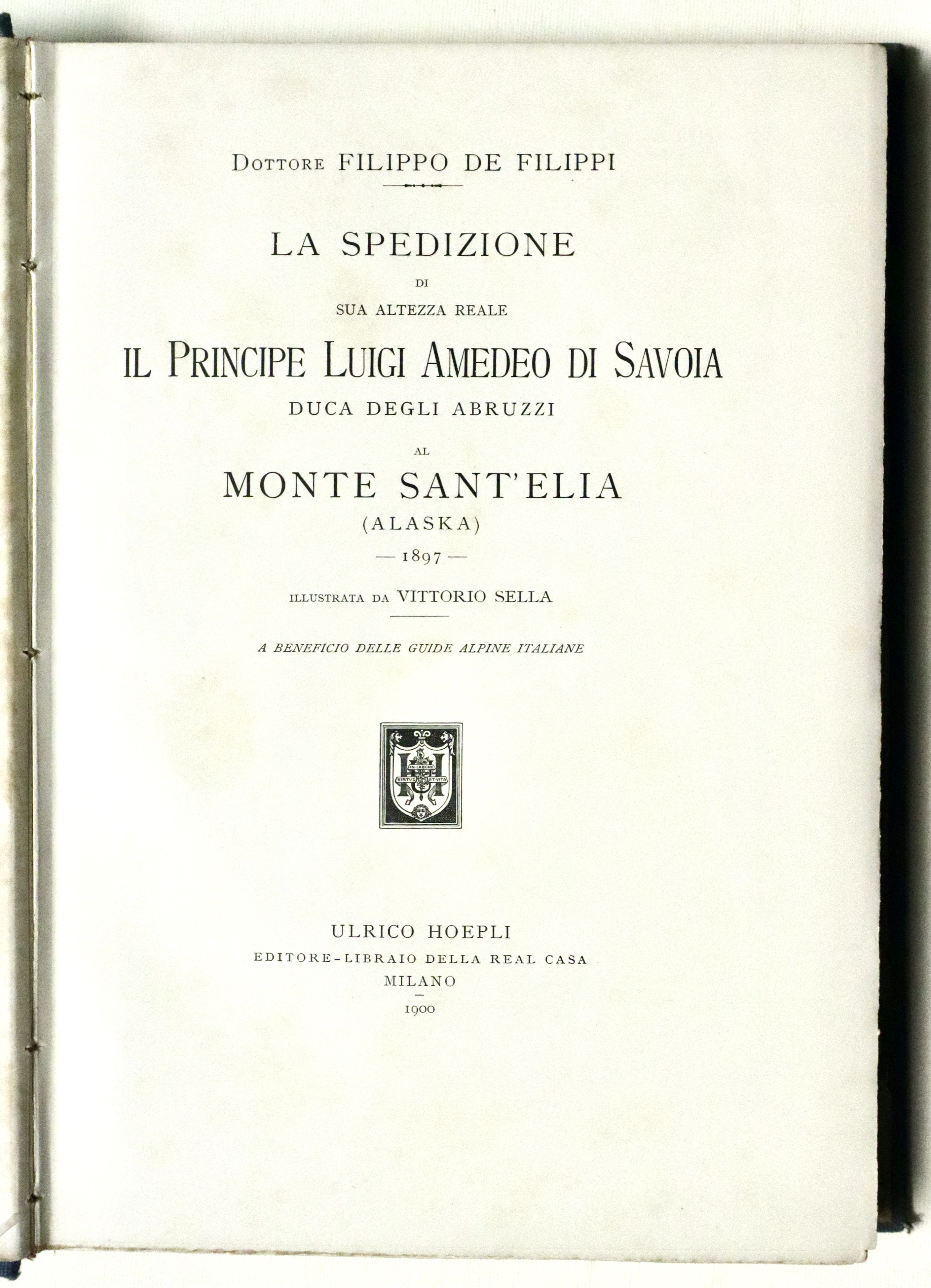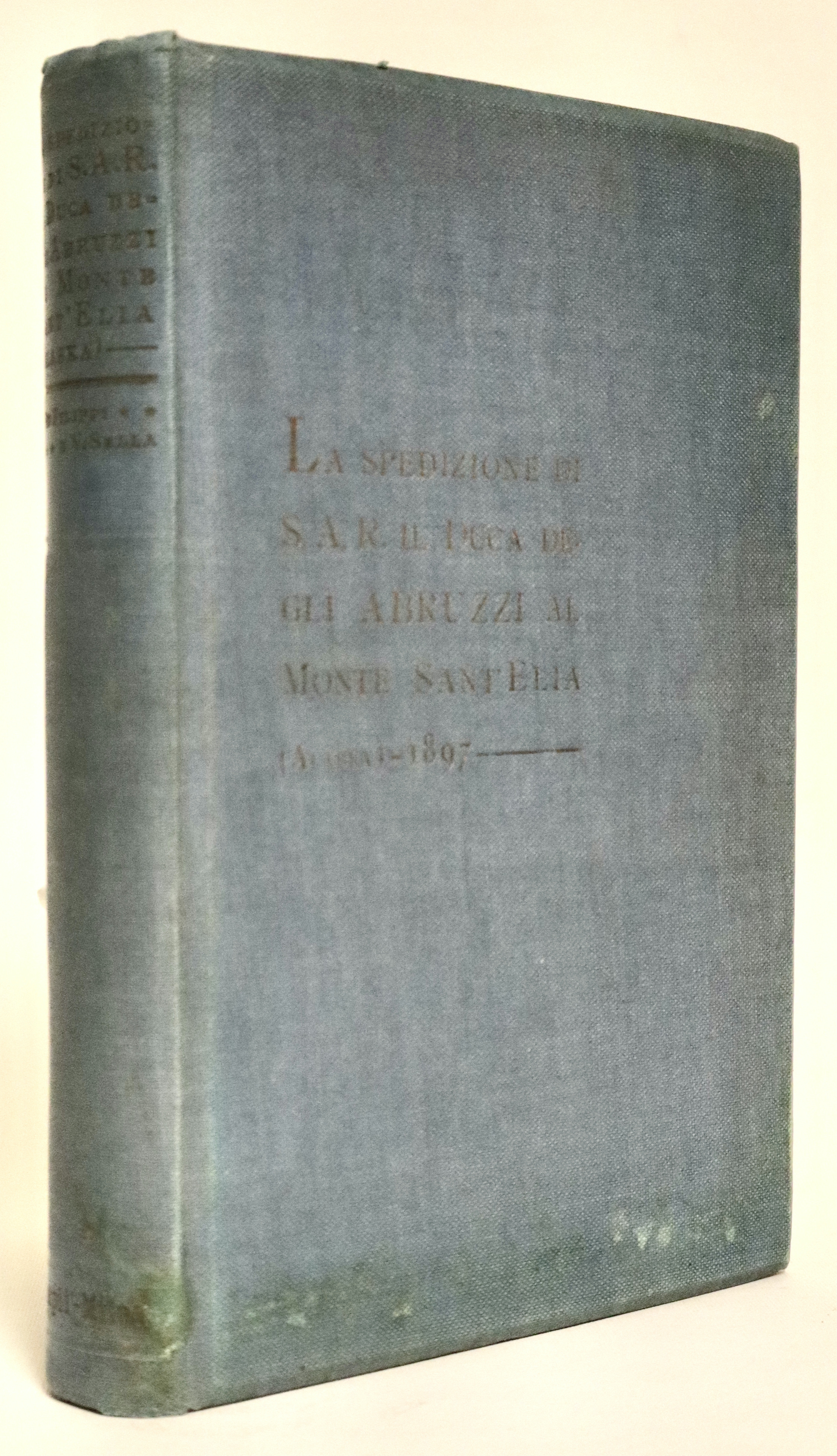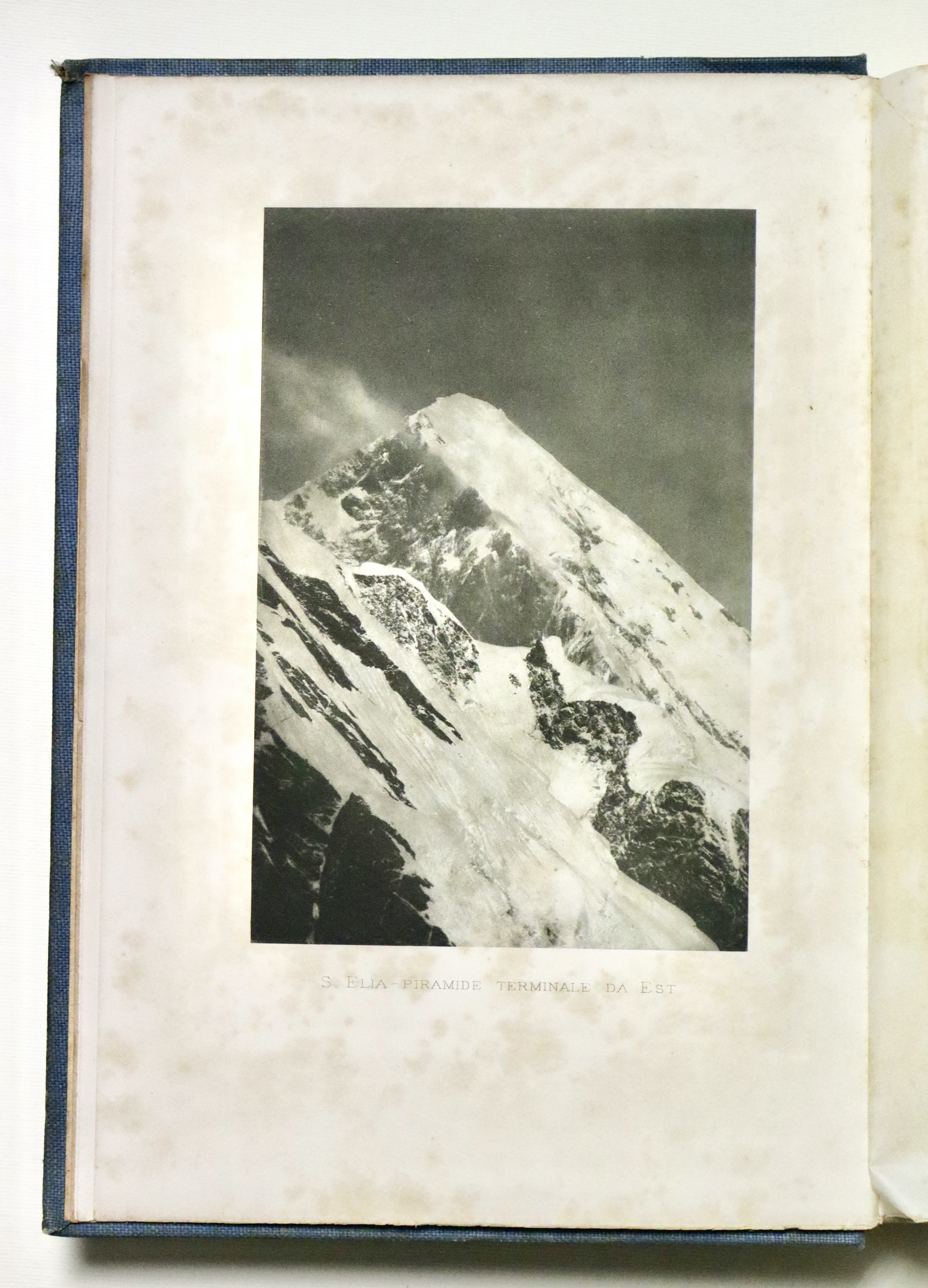 In 4° (mm 280x200); pagg. XII, 284 con 34 tavole f.t. e 4 panorami più volte rip. alla fine e due grandi carte geografiche piegate poste nella tasca alla fine, ”Schizzo della regione del monte Sant’Elia” e “Carta della costa nord-ovest dell’America settentrionale”. Tela editoriale con titoli impressi inoro a piatto e dorso, taglio sup. dorato. Interessante resoconto di viaggio illustrato dalle belle foto di Vittorio Sella. Buon esemplare con minime tracce del tempo e piccole mende, fioriture diffuse alle veline ed ai fogli fuori testo con le foto.