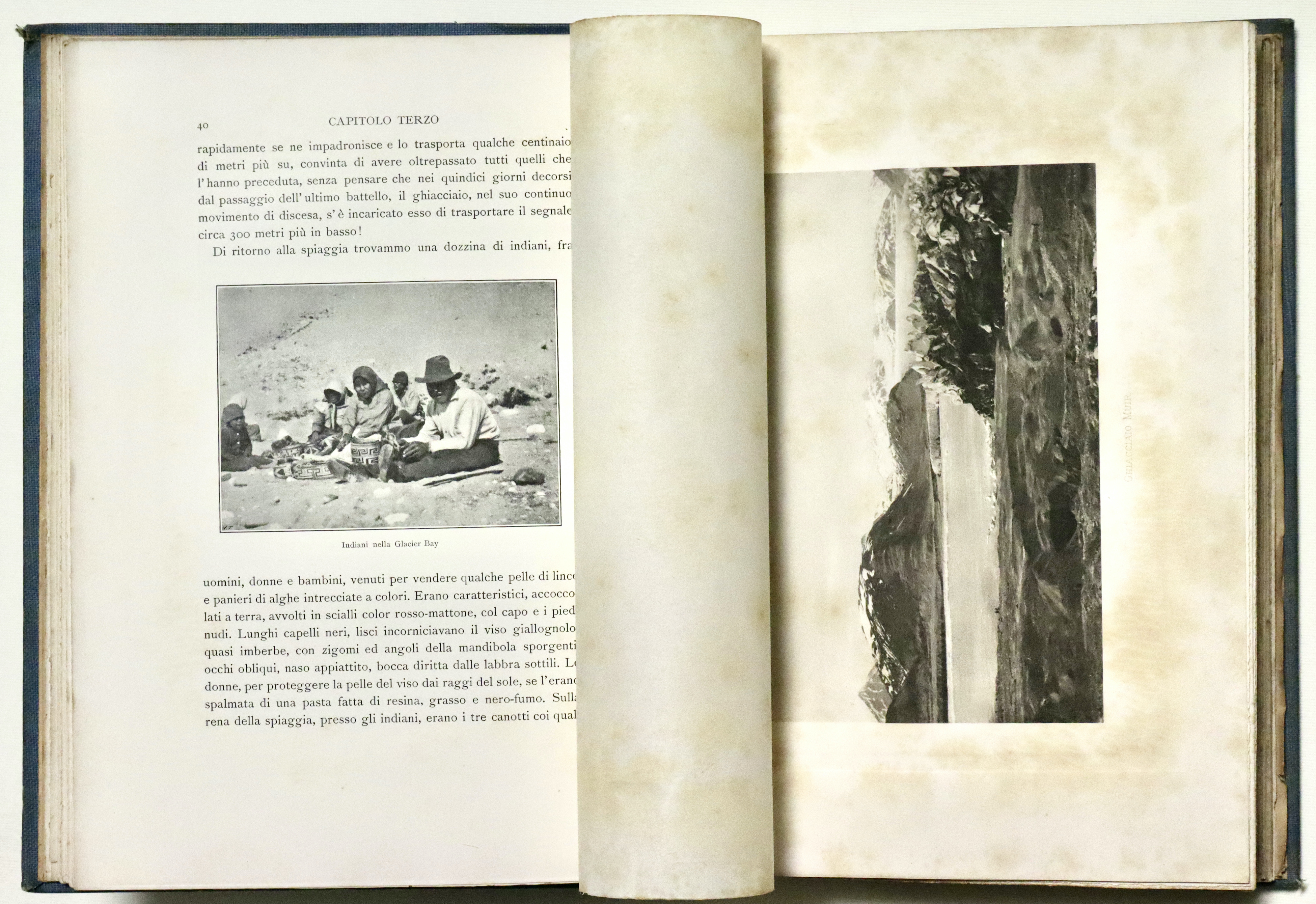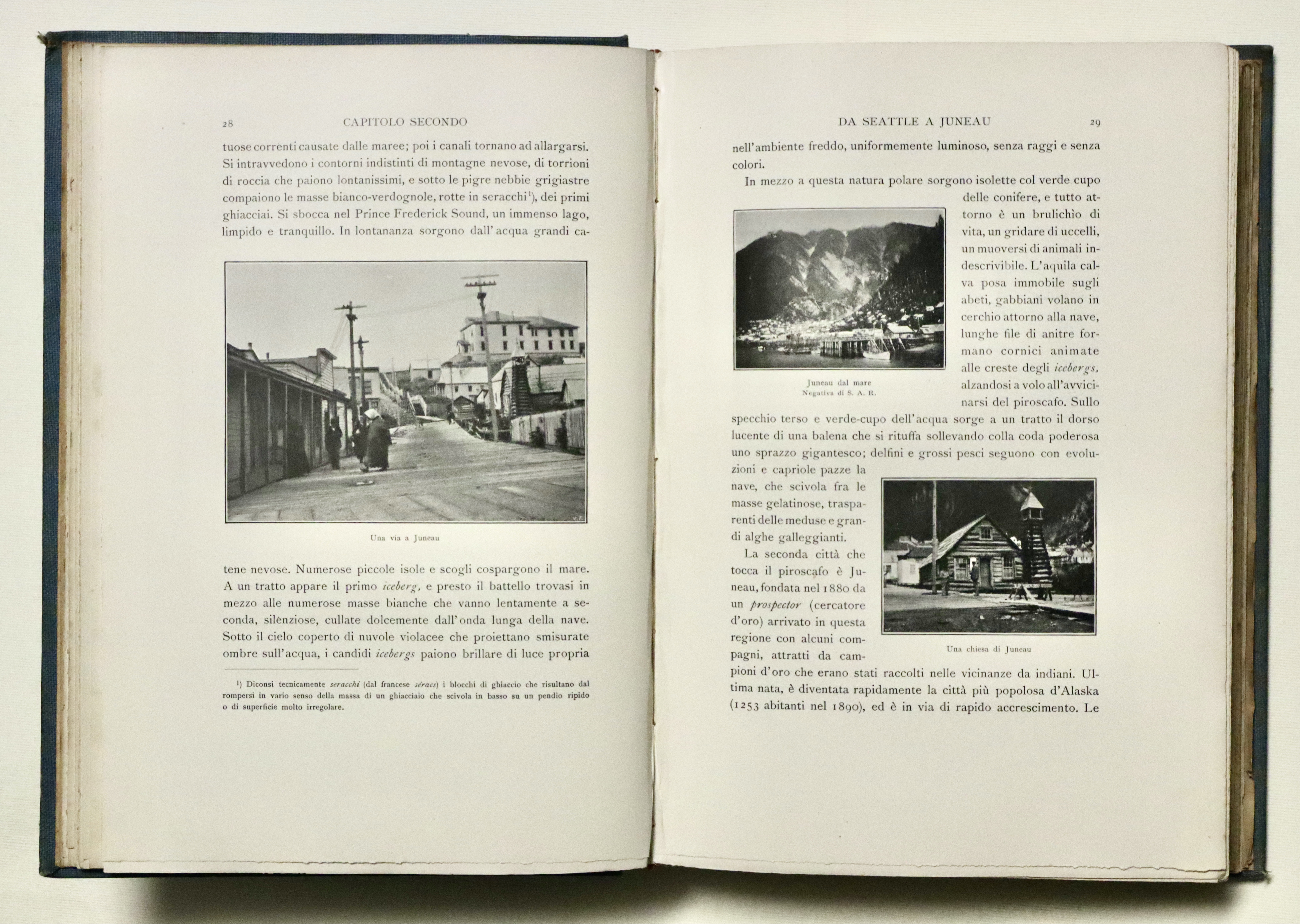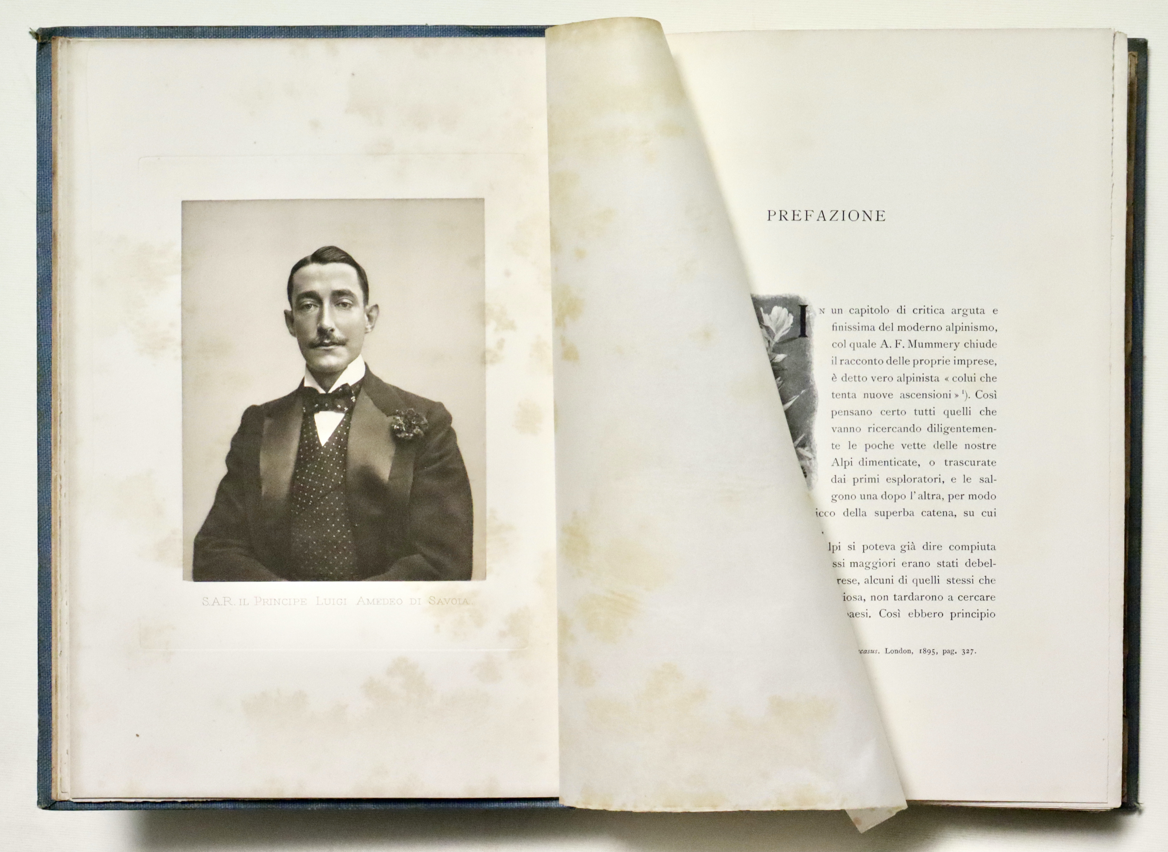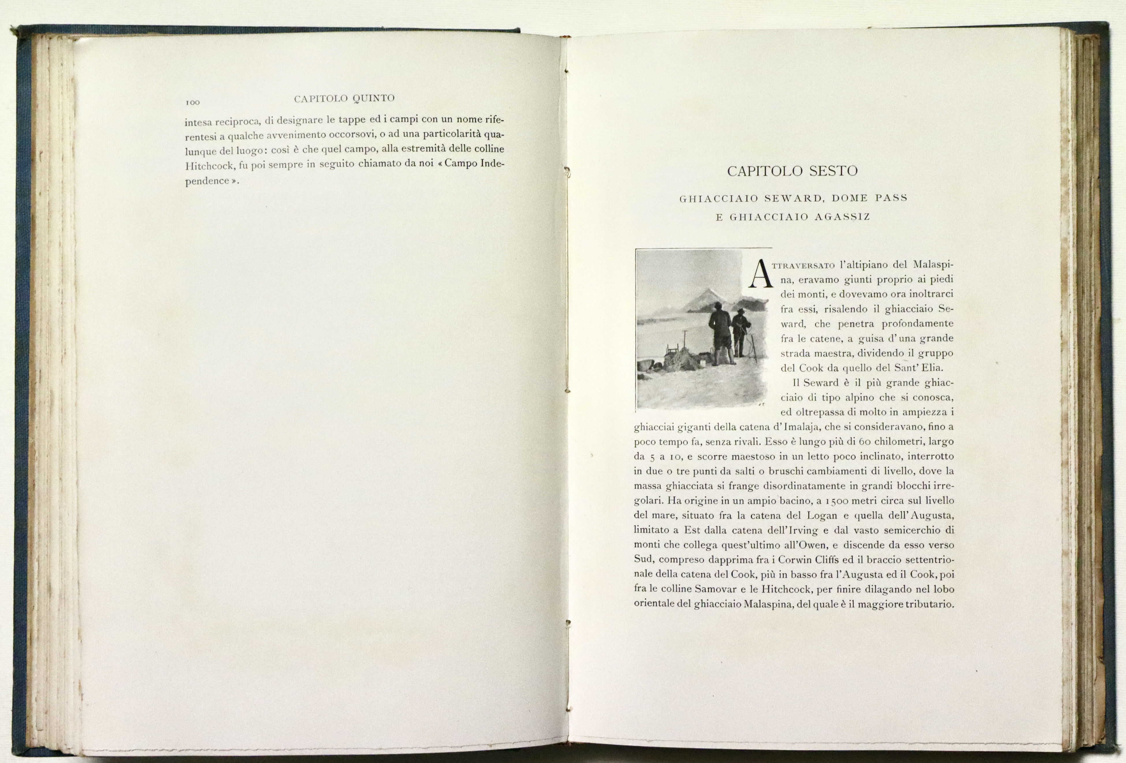 In 4° (mm 280x200); pagg. XII, 284 con 34 tavole f.t. e 4 panorami più volte rip. alla fine e due grandi carte geografiche piegate poste nella tasca alla fine, ”Schizzo della regione del monte Sant’Elia” e “Carta della costa nord-ovest dell’America settentrionale”. Tela editoriale con titoli impressi inoro a piatto e dorso, taglio sup. dorato. Interessante resoconto di viaggio illustrato dalle belle foto di Vittorio Sella. Buon esemplare con minime tracce del tempo e piccole mende, fioriture diffuse alle veline ed ai fogli fuori testo con le foto.