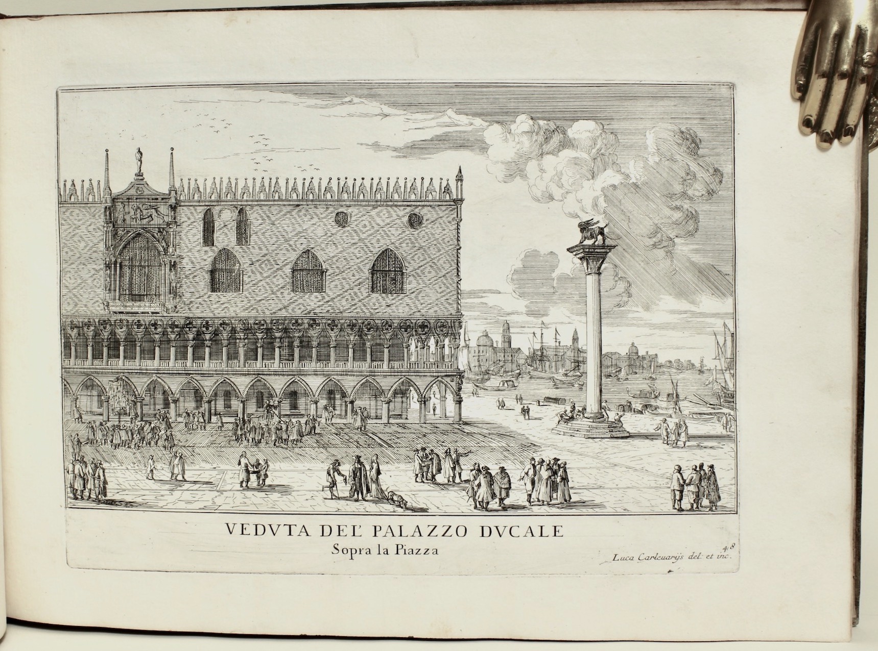 In folio oblungo (mm 280x408); frontespizio, foglio di dedica al Principe Luigi Mocenigo Doge di Venezia con testo inciso da Angela Baroni incorniciato da cartiglio architettonico, in alto campeggia il blasone dei Mocenigo e sullo sfondo veduta di Venezia, in basso a destra firma di Luca Carlevarijs; 103 vedute di Venezia incise ad acquaforte nel II stato con il numero arabo (101 numerate a stampa in basso a destra, le ultime due in basso a sinistra); la tavola 16 “Chiesa di S. Giustina monache Agostiniane” è erroneamente sostituita, per probabile errrore di rilegatura, dalla veduta della “Scuola del Spirito Santo su le Zattere”, che fu pubblicata solo nella prima edizione, (con numerazione manoscritta a inchiostro bruno). Esemplare in quinta edizione con l’aggiunta delle tavole 102 e 103 di Palazzo Zanne e Casino Zanne e l’eliminazione della nota editoriale di Finazzi al frontespizio. Legatura coeva in tutta pelle marmorizzata con doppia bordura ai piatti a secco, dorso a tre nervi, tagli a spruzzo rossi. Nota manoscritta all’interno del piatto anteriore. Bell’esemplare marginoso e ben conservato con internamente difetti veramente minimi qualche traccia di sporco superficiale ai margini di qualche tavola; nota manoscritta poco leggibile al frontespizio, legatura con normali segni del tempo.