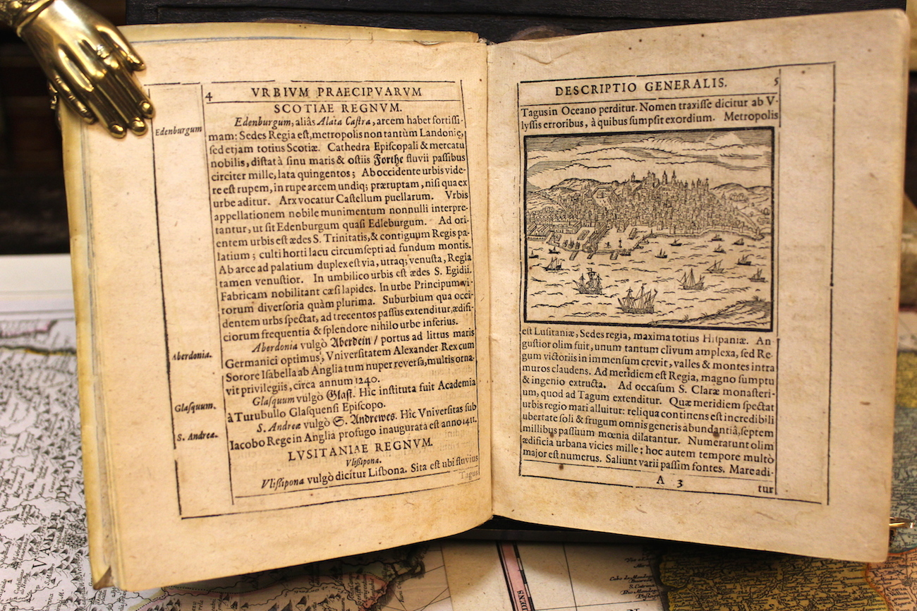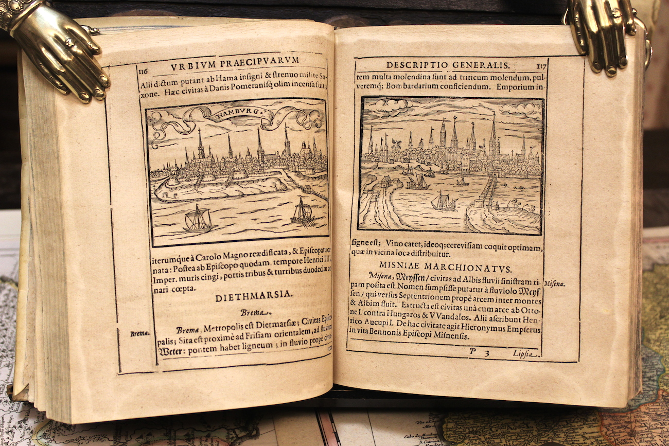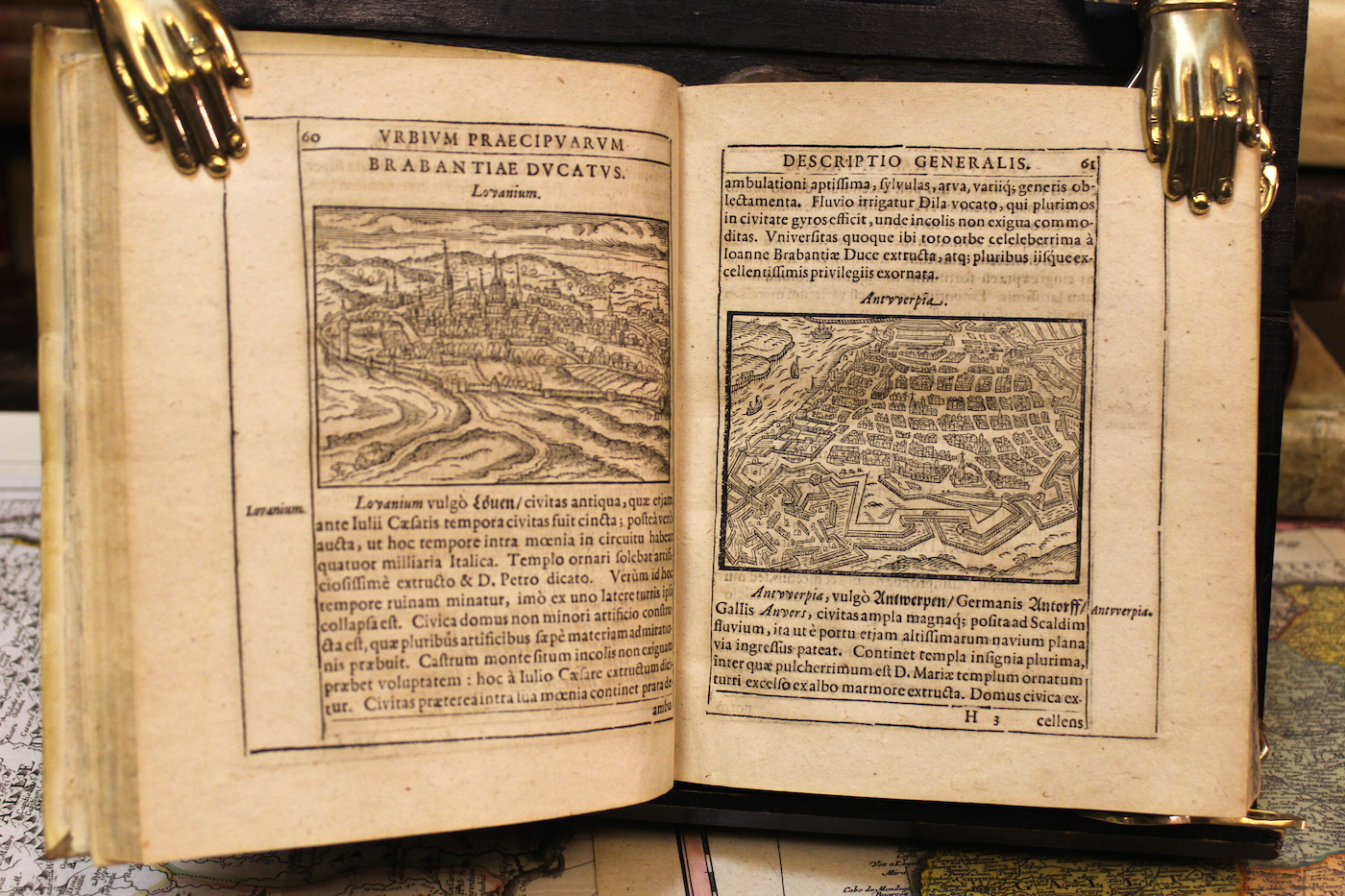 In 4° (mm190X155) Pagg. (8), 365 [ma 371], (25 di indice). Frontespizio in rosso e nero con marca editoriale, testo inquadrato da doppia bordura silografica, 67 incisioni in legno nel testo molte vedute e piante di città alla maniera di Braun and Hogenberg: Constantinopoli, Gerusalemme, Londra, Ginevra, Vienna, Parigi, Anversa, Brussell, Roma (a piena pagina), e molte altre città europee. Vi sono inoltre le descrizioni di Florida, Nova Francia, Nova Spagna, Nova Galicia, Yucatan, Cuba, Brasile, Perù etc.