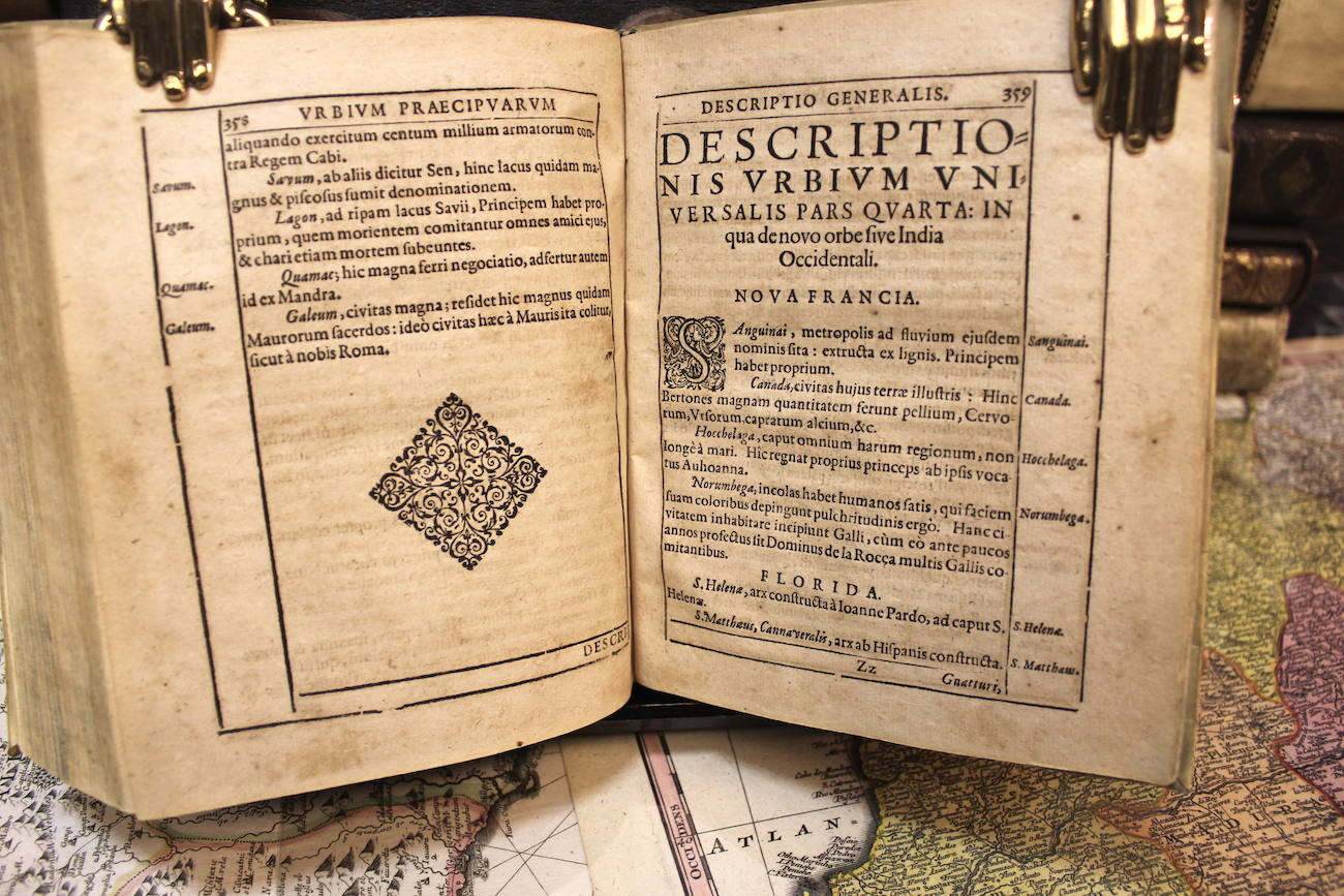 Pergamena parlante del XVII secolo con unghie rimontata, timbrino a secco al piatto anteriore e data incisa in oro, titolo manoscritto al dorso. Tagli blu. Bell’esemplare che presenta alcune pagine arrossate. Adams R 694; Sabin 73000 contains descriptions of Florida, New-France, New-Spain, Nova Galicia, Yucatan, Cuba, Brazil, Peru, etc."; Alden 595; Bachmann 14;Muller 1376.