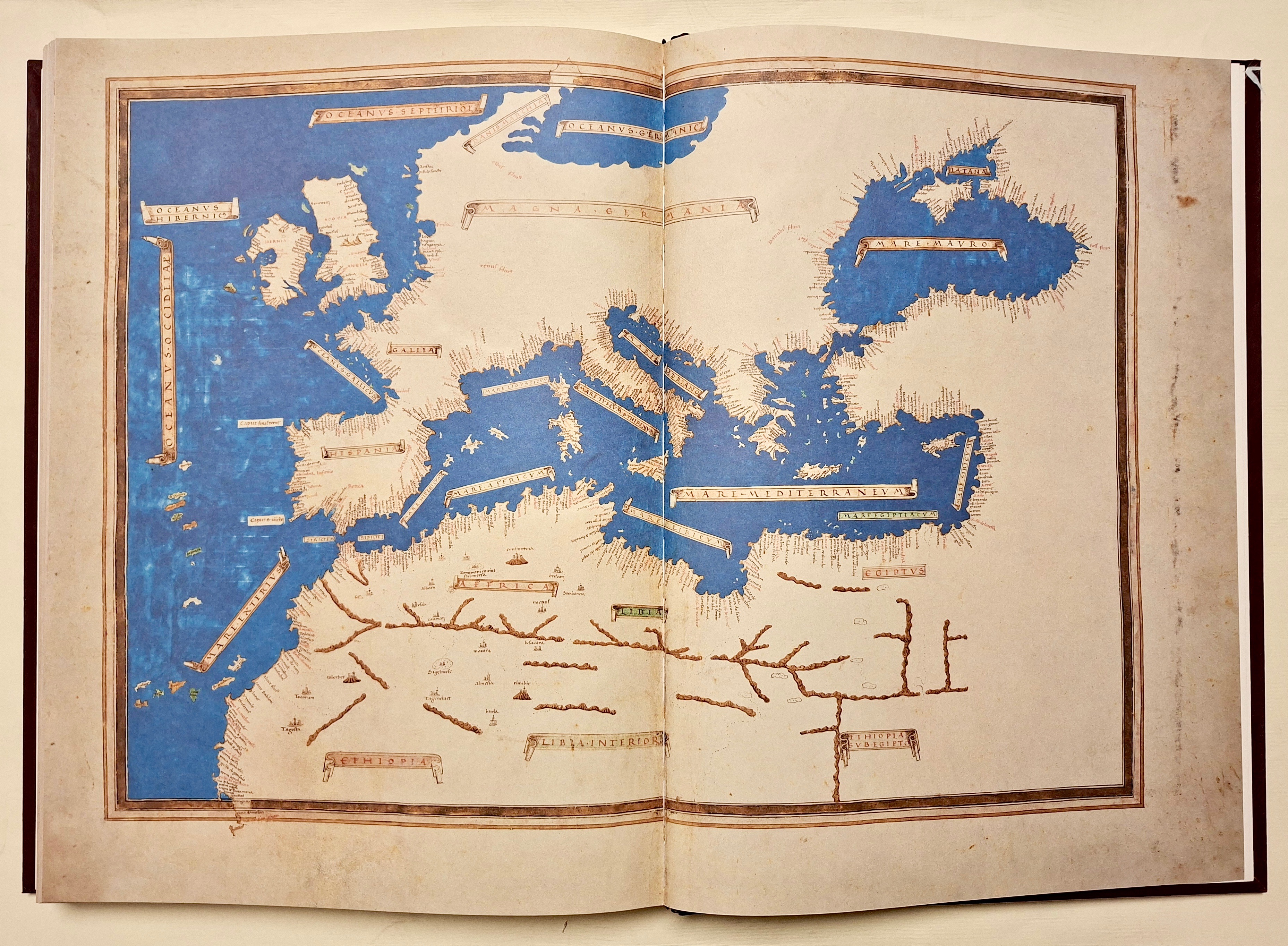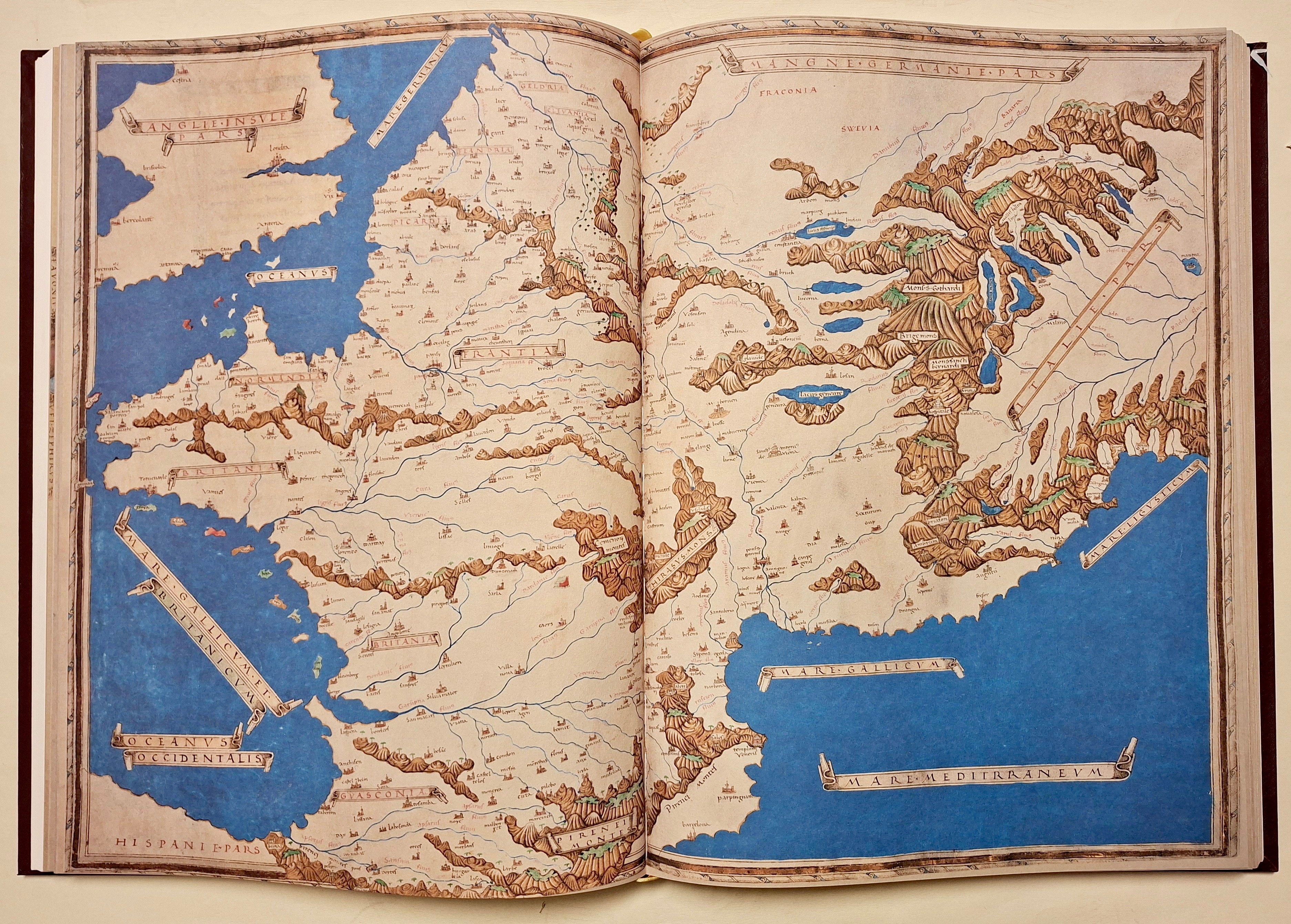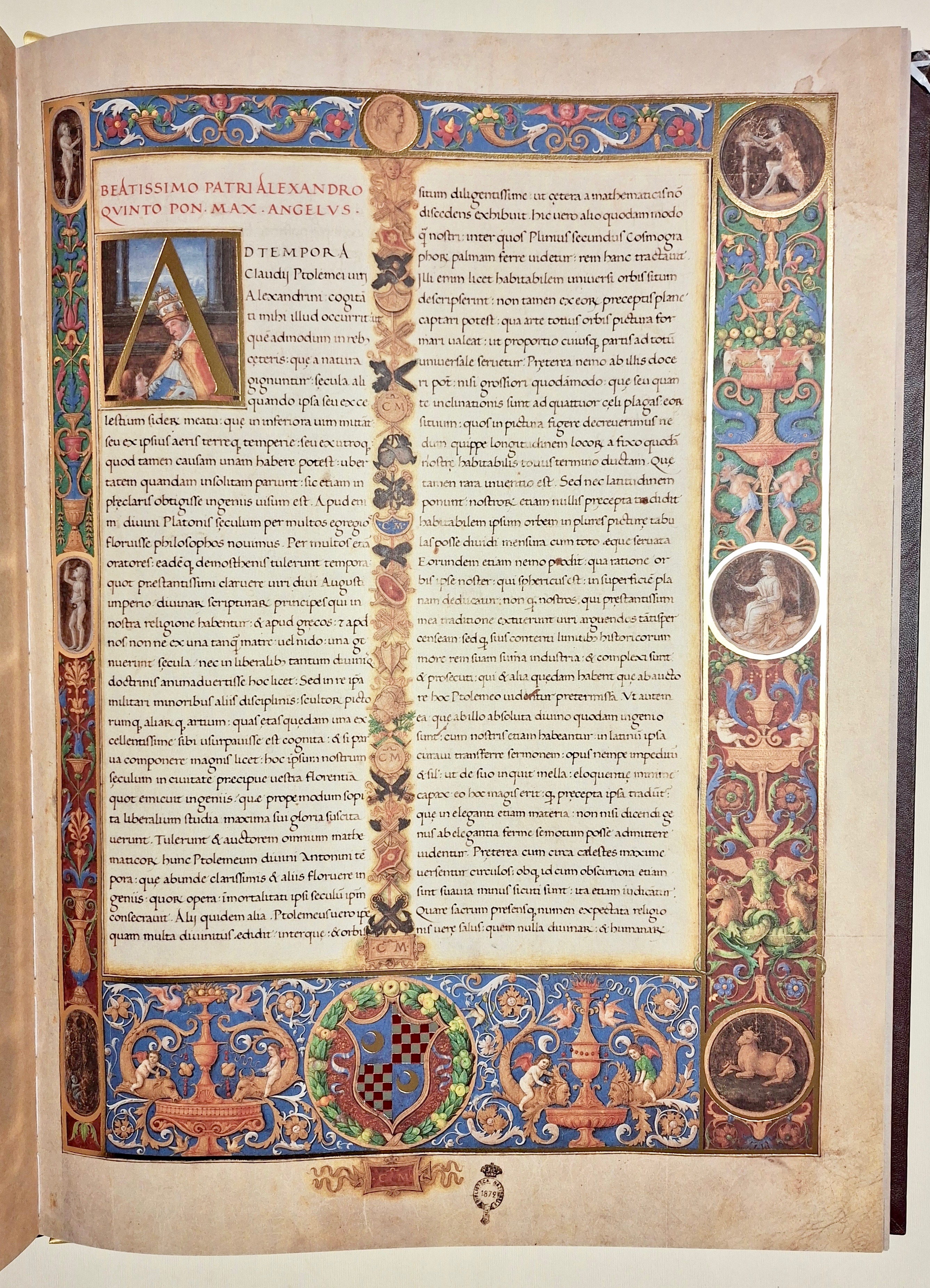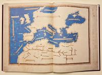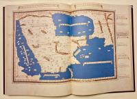 In folio (mm 590 x 430). Pp. 55, (3) d'introduzione con immagini a colori, seguite dalla riproduzione della Cosmographia in 39 tavole a colori a doppia pagina, alcune anche ripiegate su carta speciale Magnani di Pescia. Sontuosa legatura editoriale in piena pelle con ricche decorazioni in oro eseguita da L’arte del Libro di Todi. Edizione a tiratura limitata di 1000 esemplari numerati (ns. n. 270) Bella riproduzione dettagliata a colori del codice originale. Il Codice Magliabechiano, noto anche come Grande Tolomeo, fu realizzato intorno al 1480 a Firenze da Enrico Martello Germano e contiene 39 mappe basate sugli studi di Tolomeo. Commissionato dalla famiglia Vitelli di Città di Castello, il codice è un documento storico di significativa importanza, che unisce le antiche conoscenze greche, alle recenti esplorazioni europee. Le tavole disegnate da Enrico Martello colpiscono per la vivacità dei colori, l’ azzurro e il blu intenso, per mari, fiumi e laghi, l’oro, il marrone, il verde, spesso usati per le montagne, per la ricchezza dei particolari, le città sono indicate con un castello o con edifici, torri e chiese in color nocciola e sfumature in giallo. I nomi di mari, popoli e regioni sono collocati all’interno di cartigli con sfondo rosa, mentre in rosso quelli dei fiumi e di parte dei notabilia. La gradazione di latitudini e longitudini, posta ai bordi delle tavole, è contornata da una cornice tipica dei codici di Enrico Martello. La c.88v – 89r è il “Planisfero ecumenico in seconda proiezione tolemaica ” ovvero come è illustrato nel capitolo 24 del libro I della Geographia, in cui i paralleli e i meridiani sono linee curve per ricreare l’illusione della sfericità della Terra. Nel planisfero è rappresentata la classica ecumene tolemaica che definisce la parte conosciuta e abitata del mondo, con l’aggiunta a Nord delle regioni baltiche: Norvegia, Svezia e “Gotia”, le attuali Danimarca e Finlandia, e che si estende dall’Asia centrale all’India, alla Cina, con le coste asiatiche e ampia conoscenza dell’Africa. L’Oceano Indiano viene rappresentato come un mare chiuso, circondato da una fascia continentale che collega l’Africa all’estremo Oriente, la Terra Incognita. Il Baltico e le regioni baltiche ignote a Tolomeo sono l’unica modifica introdotta da Martello, il Mediterraneo allungato e senza il golfo della Sirte, l’Africa senza le scoperte portoghesi, viene rispettato il modello tolemaico puro che era già stato aggiornato nelle carte nautiche già in uso , Martello invece di correggere il planisfero affiancherà le tavole moderne a quelle antiche. Circondato da dieci teste umane che rappresentano i venti il planisfero grande di Martello , (575X840 mm. ) è una meraviglia per gli occhi e lo sfarzo e l’armonia dei colori ne fanno un raro gioiello rinascimentale. Perfetta conservazione, in stato di nuovo.