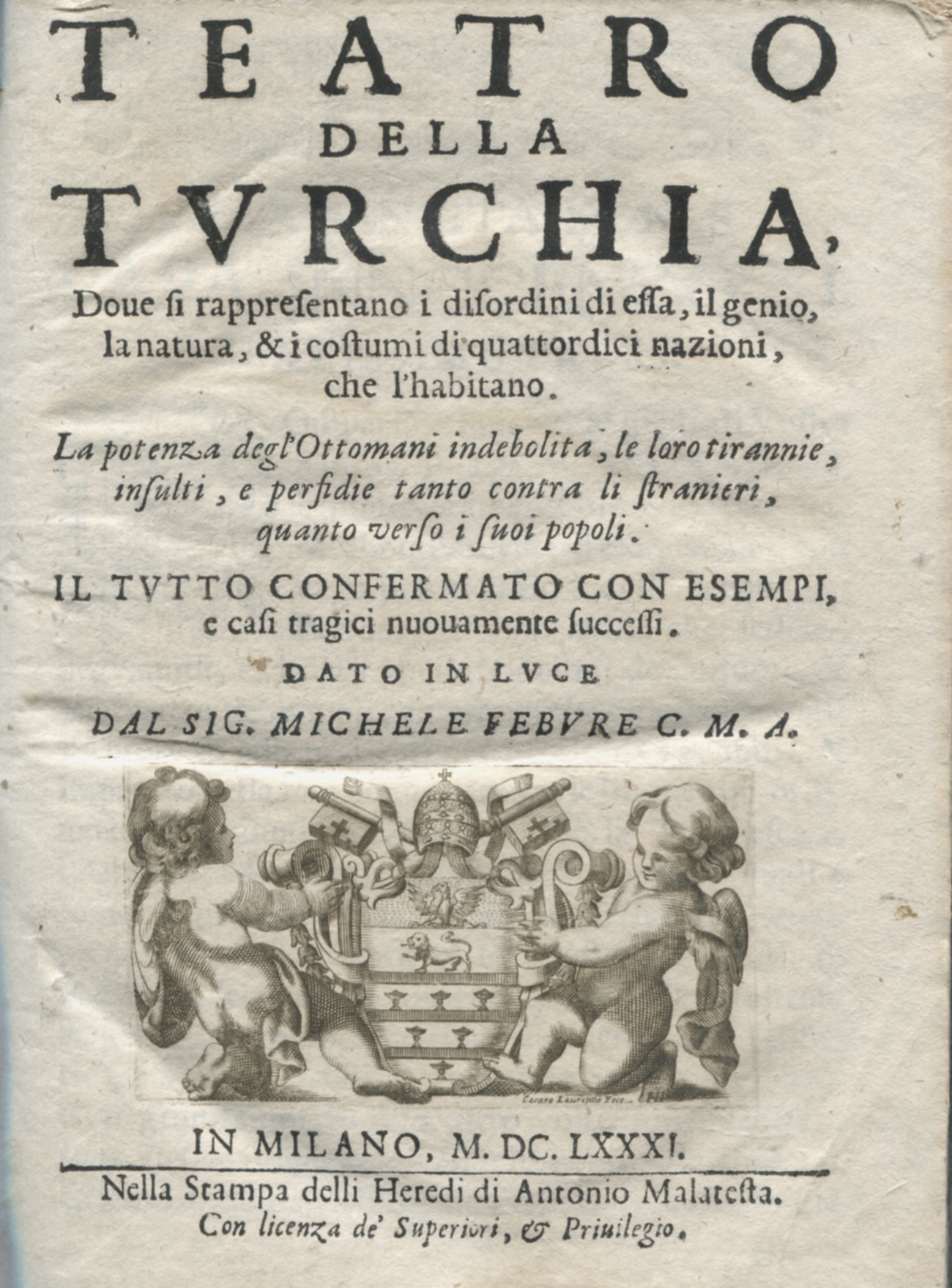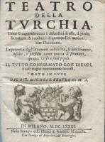 Teatro della Turchia: Dove si rappresentano i disordini di essa, il genio, la natura, & i costumi di quattordici nazioni, che l’habitano. La potenza degl’Ottomani indebolita, le loro tirannie, insulti, e perfidie, tanto contra li stranieri, quanto verso i suoi popoli. Milano, Malatesta, 1681.