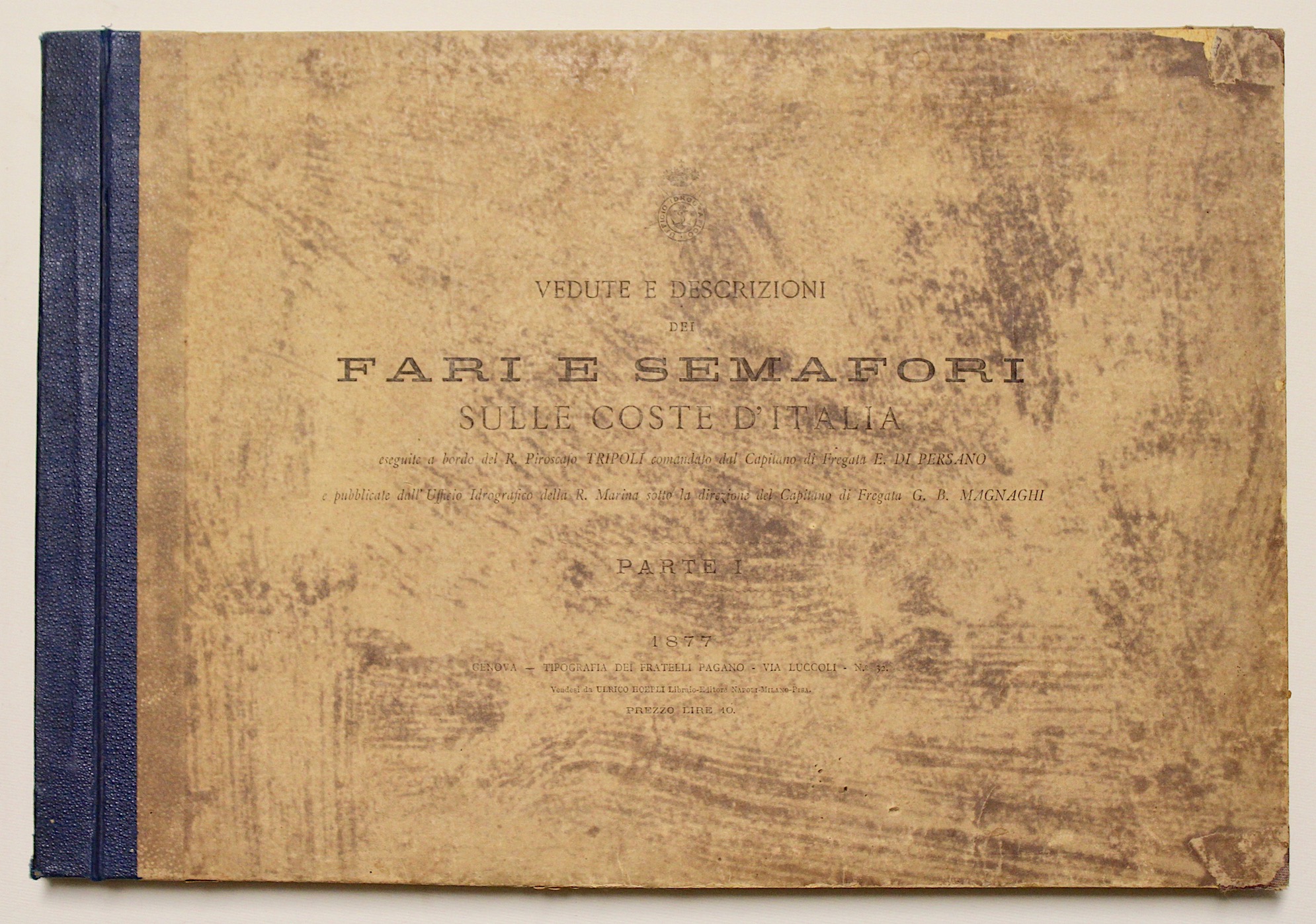 Vol. I di quest’interessante opera che descrive scenograficamente le linee di costa con la posizione dettagliata dei fari, dei fanali dei moli, degli isolotti, delle cassa di tonneggio ecc.; eseguite a bordo del regio piroscafo “Tripoli” comandato dal capitano di fregata E. di Persano e pubblicate dall’Ufficio Idrografico della R. Marina sotto la direzione dell’autore. Le descrizioni riferiscono oltre alla descrizione fisica dei fari, loro pregi e difetti, la tipologia della loro luce e la distanza da cui può essere visibile per i bastimenti. Nel nostro volume sono presenti I fari delle coste di Sardegna, Liguria, Isole Eolie, Sicilia, Calabria e Golfo di Taranto. Ottimo esemplare, con qualche minima fioritura marginale.