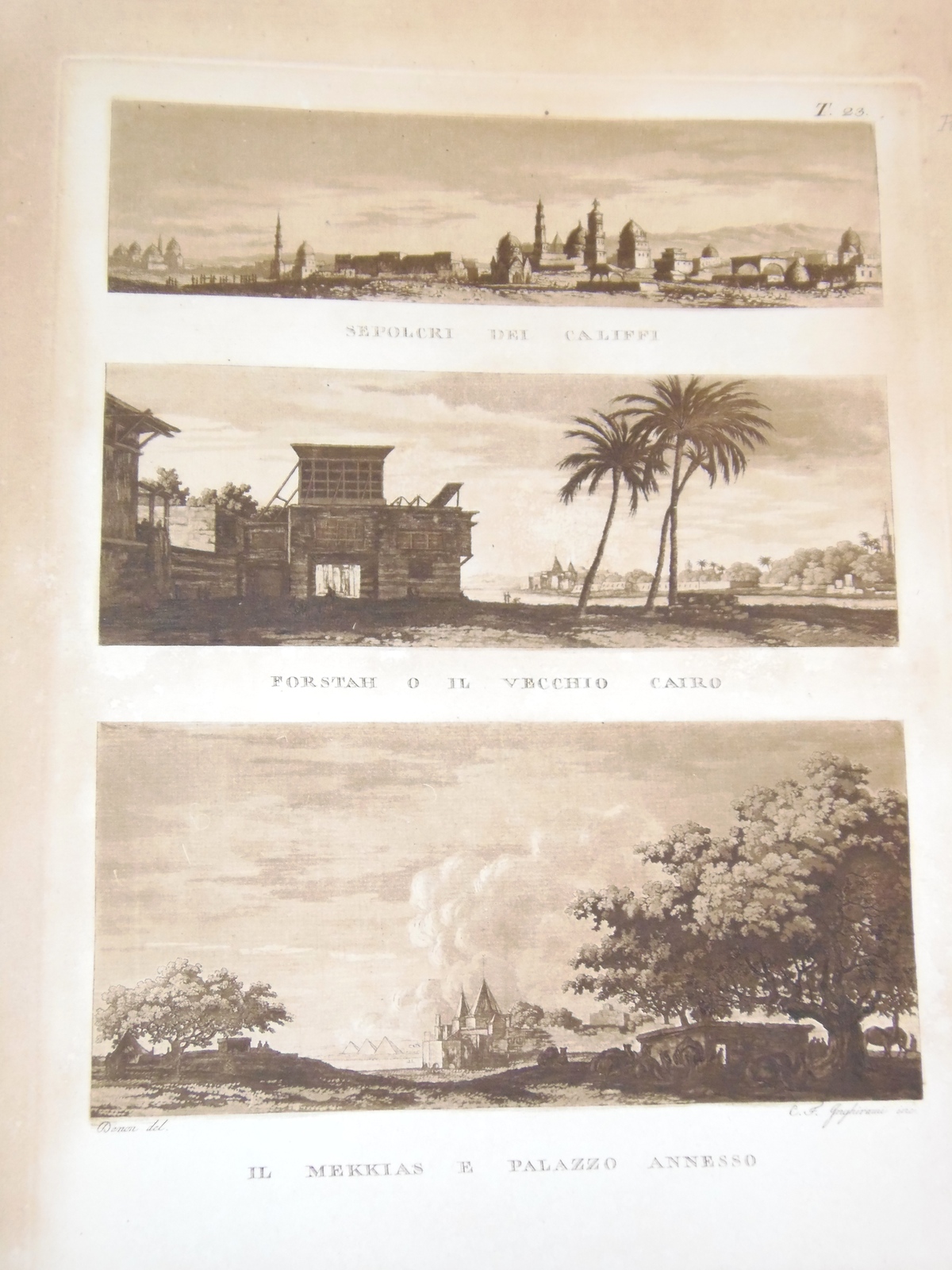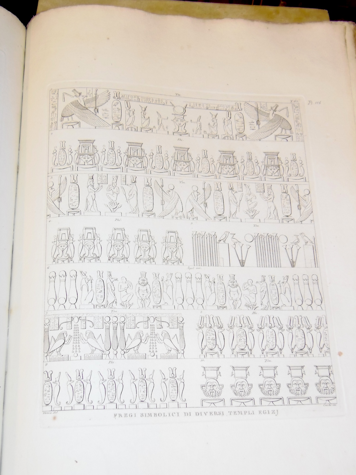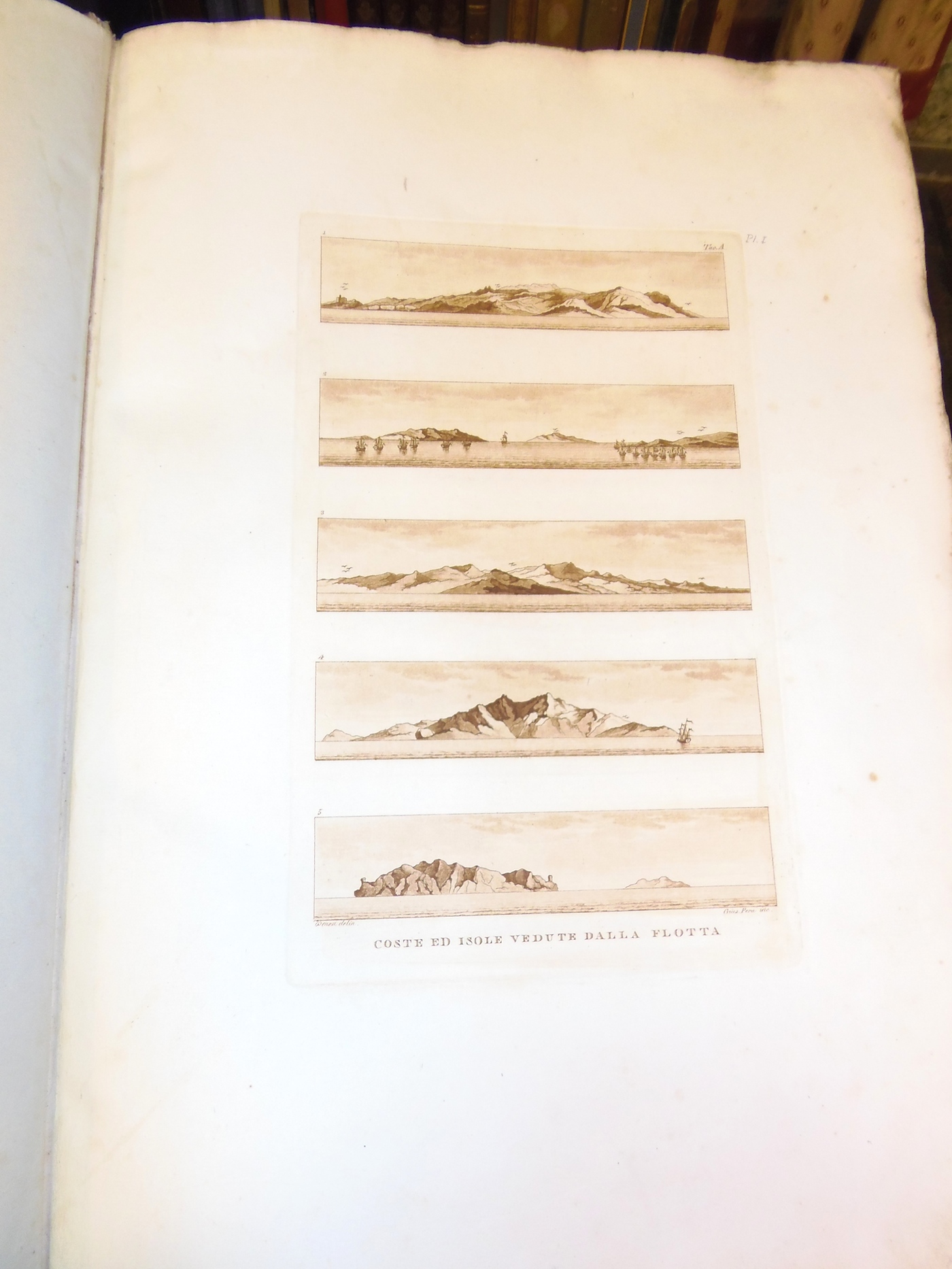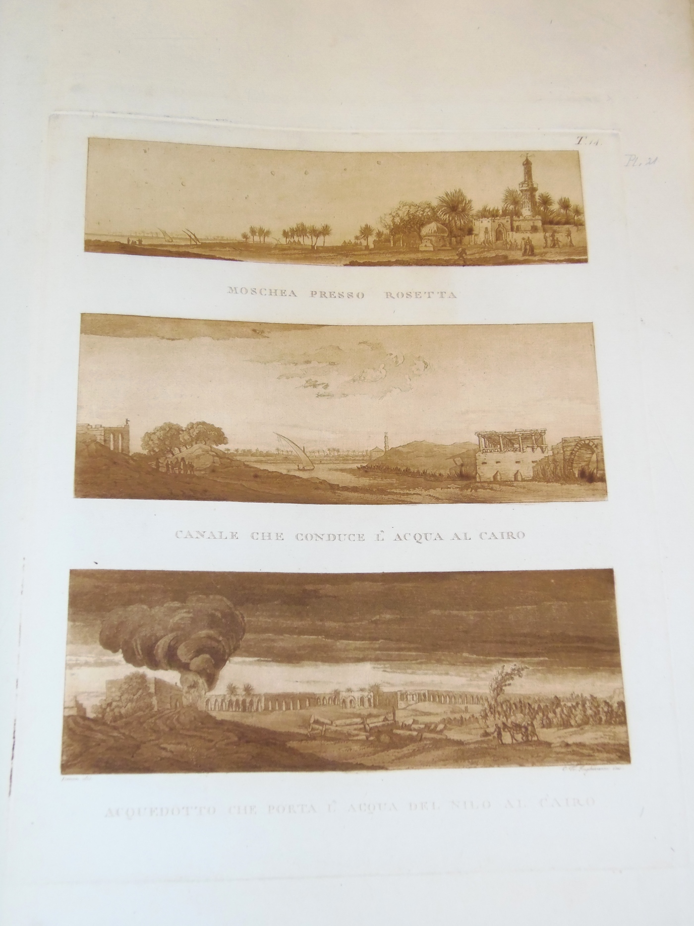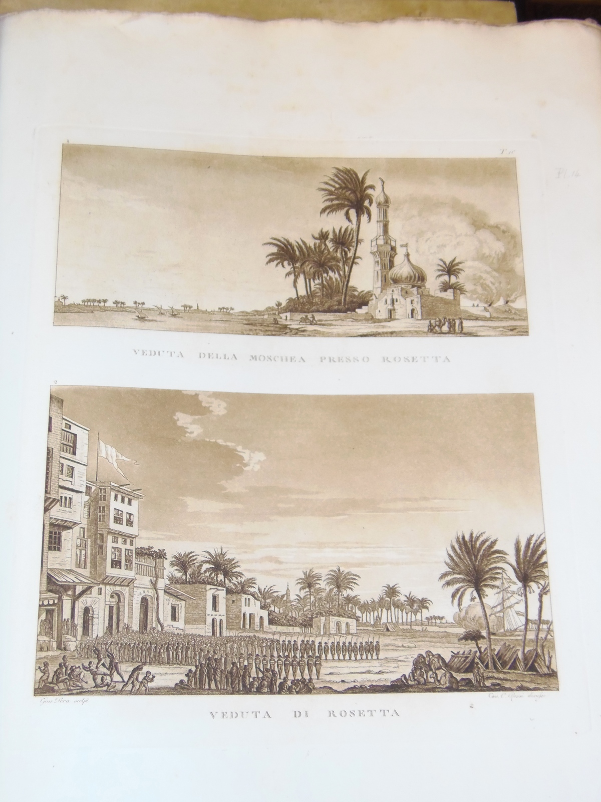 2 voll. In folio (mm. 580 x 400), mezza pergamena coeva con titolo su tassello in oro al dorso e piatti marezzati. Vol I: pagg. XI, (1), 214, una bianca, con la dettagliata spiegazione delle tavole. II volume II: raccoglie 151 magnifiche tavole (molte con piu figure) incise quasi tutte in acquatinta a piena o doppia pag. numerate A-G e 1-144. Le tavole sono il risultato di un lavoro eseguito da un’equipe di artisti italiani quali: Angelo Volpini, Francesco Inghirami, Giovanni Battista Cecchi, Giovanni Pacini, Giuseppe Pera e Luigi Sabatelli, su disegni e schizzi originali del Denon stesso. Le tavole raffigurano vedute, piante, ritratti, carte geografiche, planimetrie, particolari archeologici, costumi popolari.