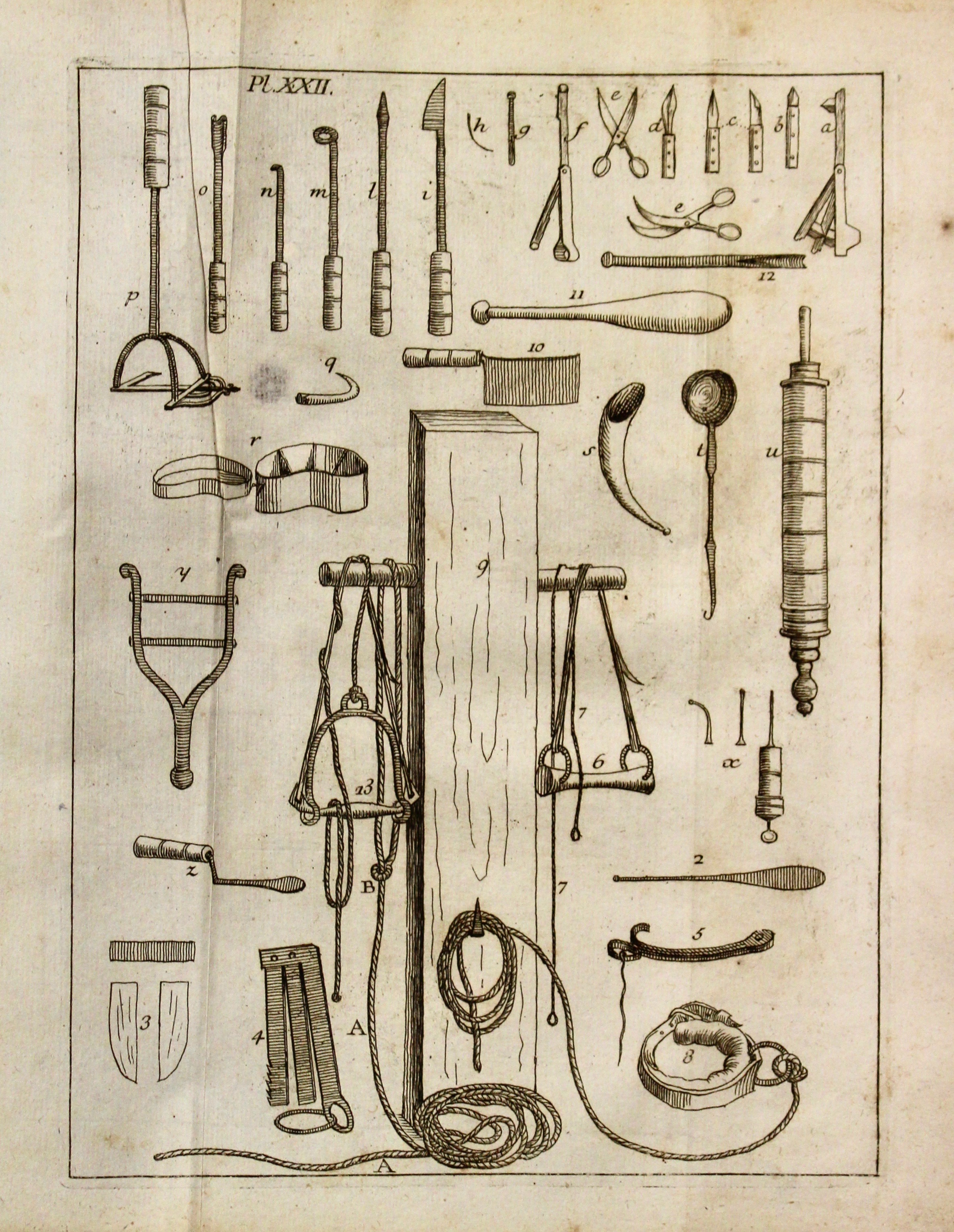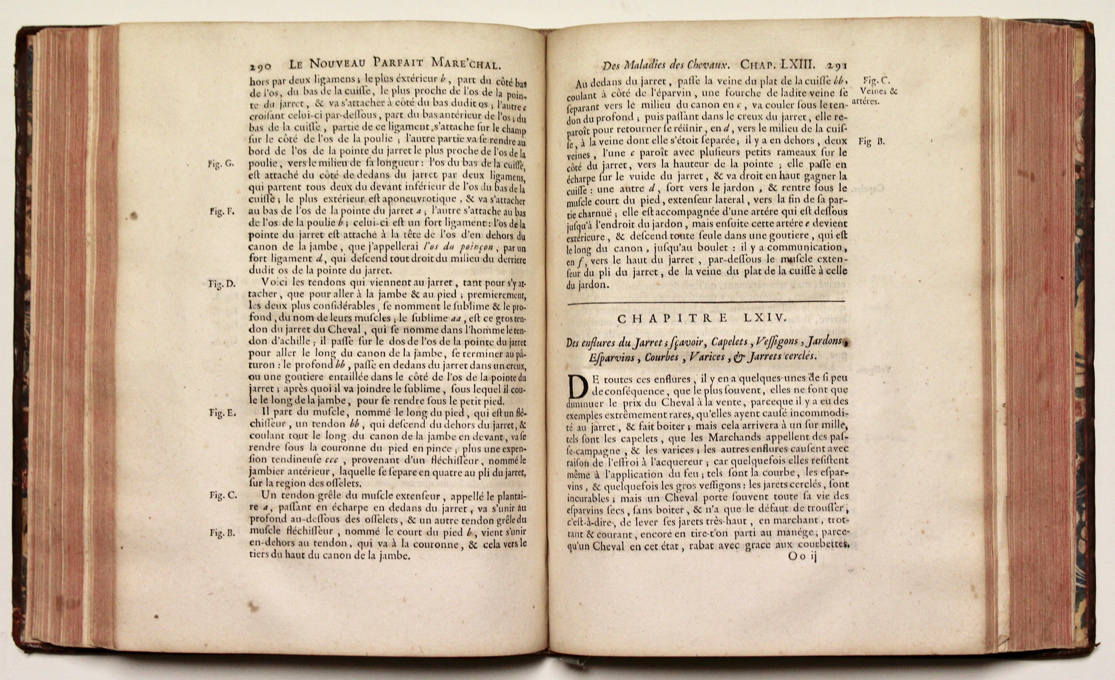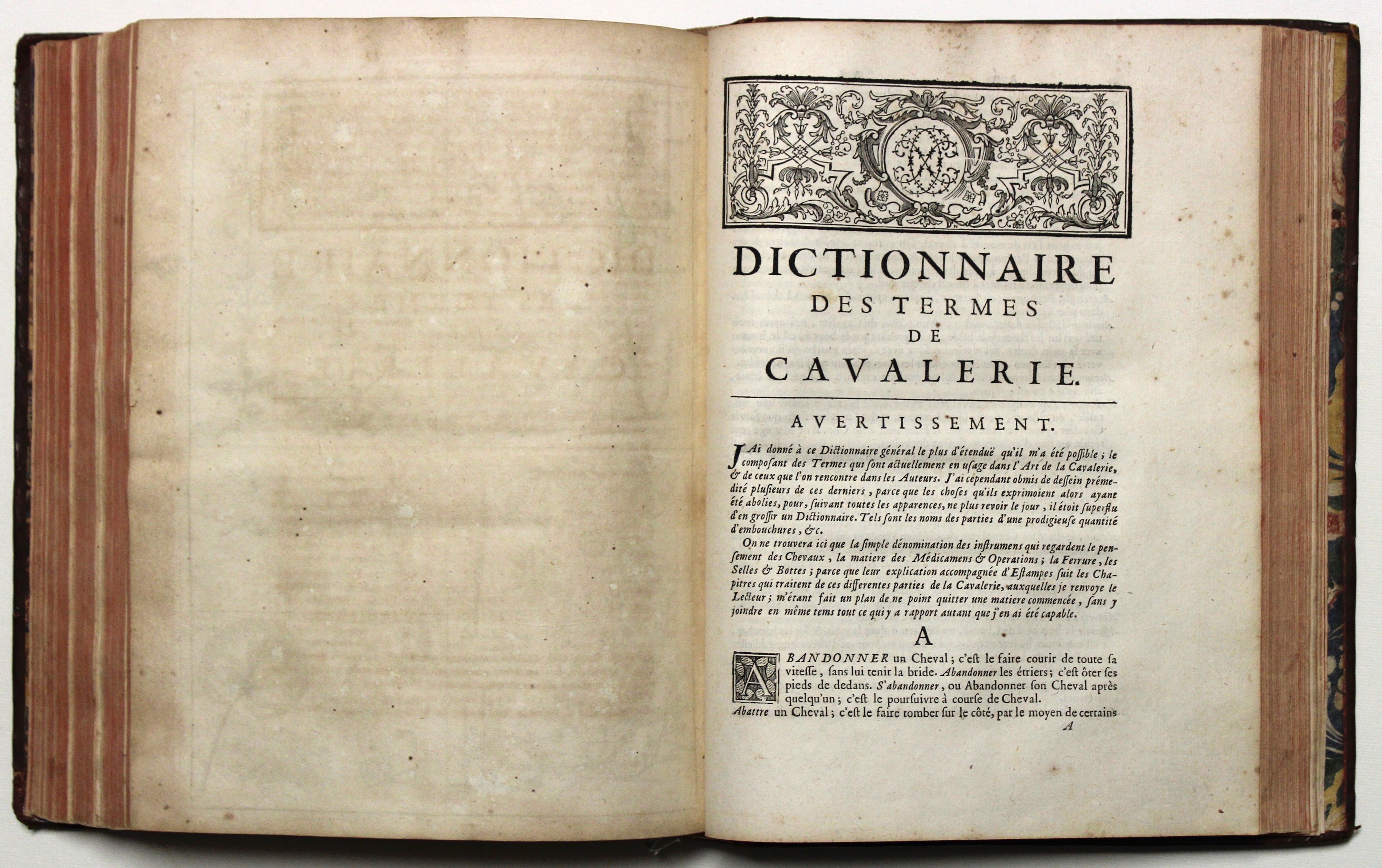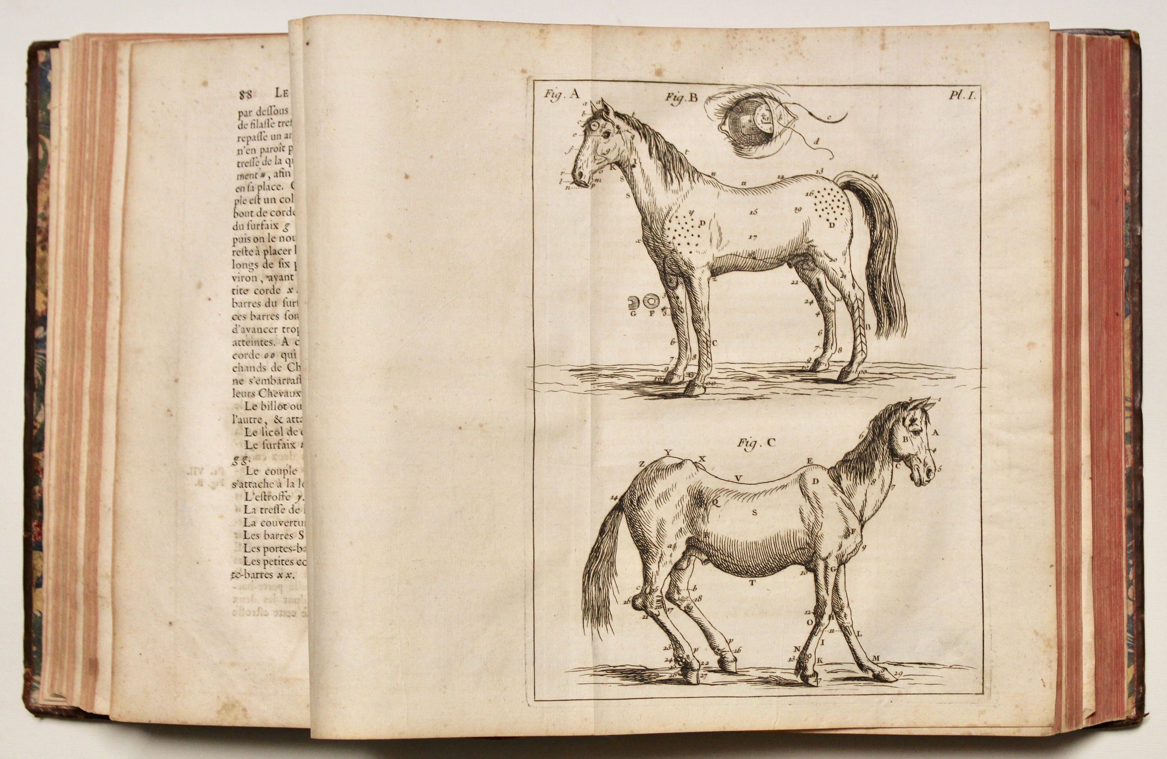 In 4° (mm 255x195), pagg. 2 b., occhietto, (34), 512, CXXVII. Frontespizio in rosso e nero, grandi e raffinate testatine e capolettera incisi in silografia. Completo delle bellissime 49 tavv. descrittive, incise finemente in rame, ripiegate f.t. disegnate dal vero dall'Autore; le prime 29 tavole, intercalate nel testo, raffigurano varie razze di cavalli, loro caratteristiche fisiche, finimenti ed accessori vari; le successive 20, rilegate in fine, riproducono vari tipi di piante medicinali. Solida piena pelle coeva marezzata con dorso a cinque nervi, titolo in oro su tassello e ricchi fregi dorati eseguiti a piccoli ferri. Prima edizionedi quest'opera divulgativa, pensata per quanti lavoravano nel mondo del cavallo. Suddivisa in: Trait de la construction du cheval; Trait du haras; Trait de l’ecuyer; Le medecin, ou trait des maladies des chevaux; Le chirurgien ou trait des luxations, fractures, absces, playes et operations; Trait du marechal ferrant; L'apoticaire ou trait des medicamens; Dictionnaire des termes de Cavalerie.Il grande successo che questo testo riscosse nel corso del XVIII secolo fu determinato dalla sua facile consultazione e dalla qualità delle illustrazioni.Bell’esemplare che presenta lievi fioriture internamente. Cerniere restaurate. Una macchia al piatto inf. Graesse, III, p. 31; Hunt 32.