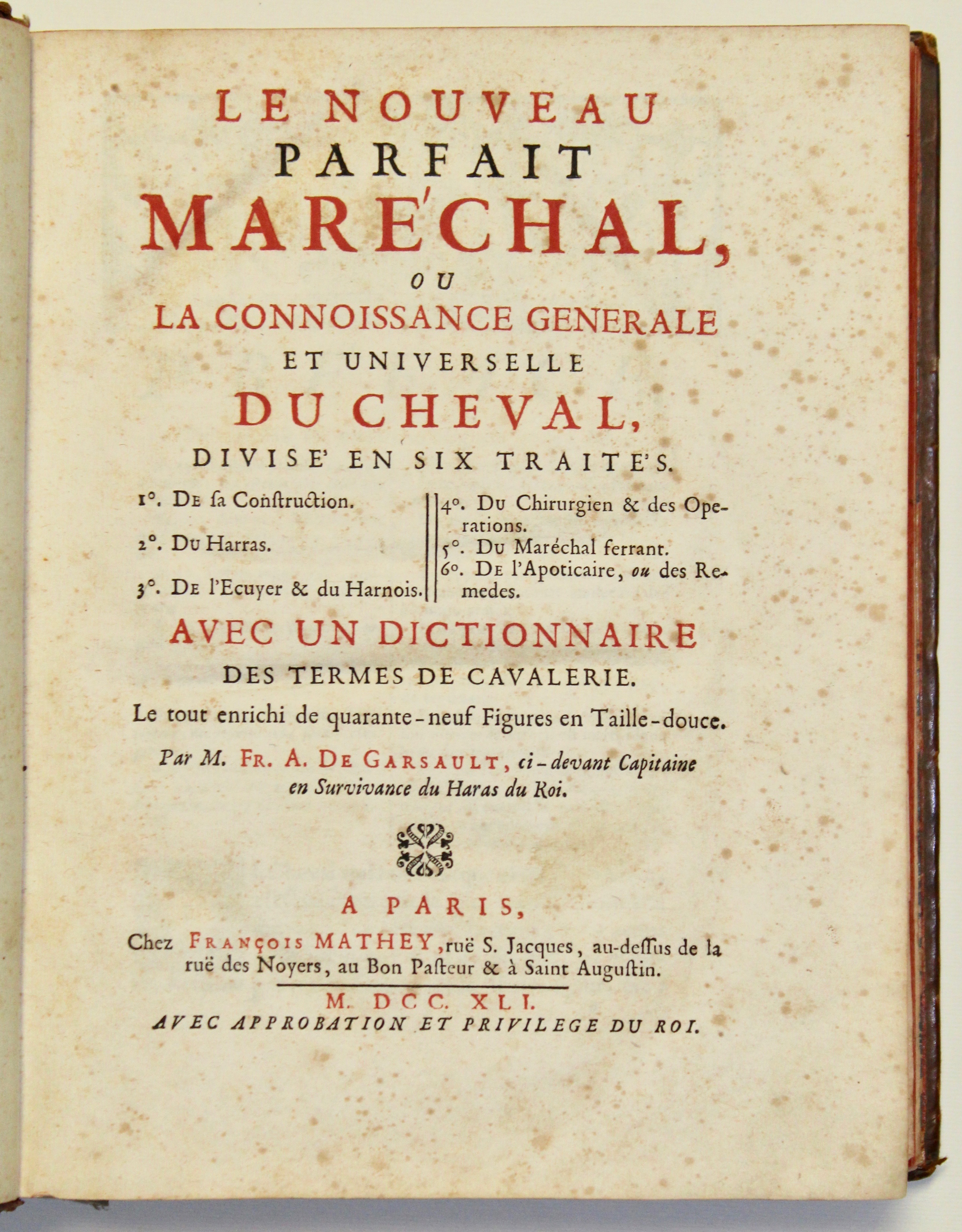Le nouveau parfait Marechal, ou la connoissance generale et universelle du cheval divis en six traite’s, avec un dictionnaire des termes de chevalerie. Le tout enrichi de quarante-neuf figures en taille-douce.