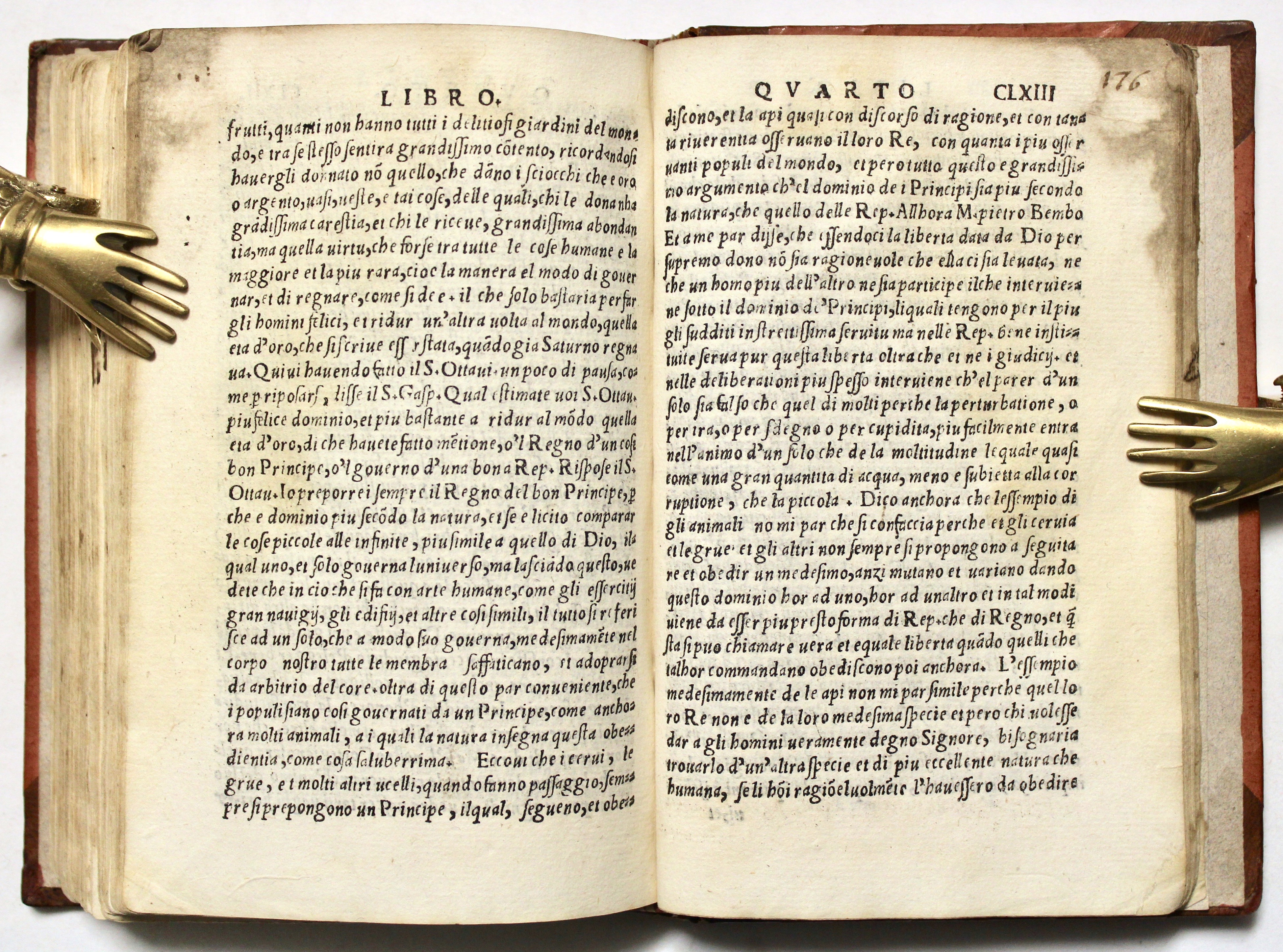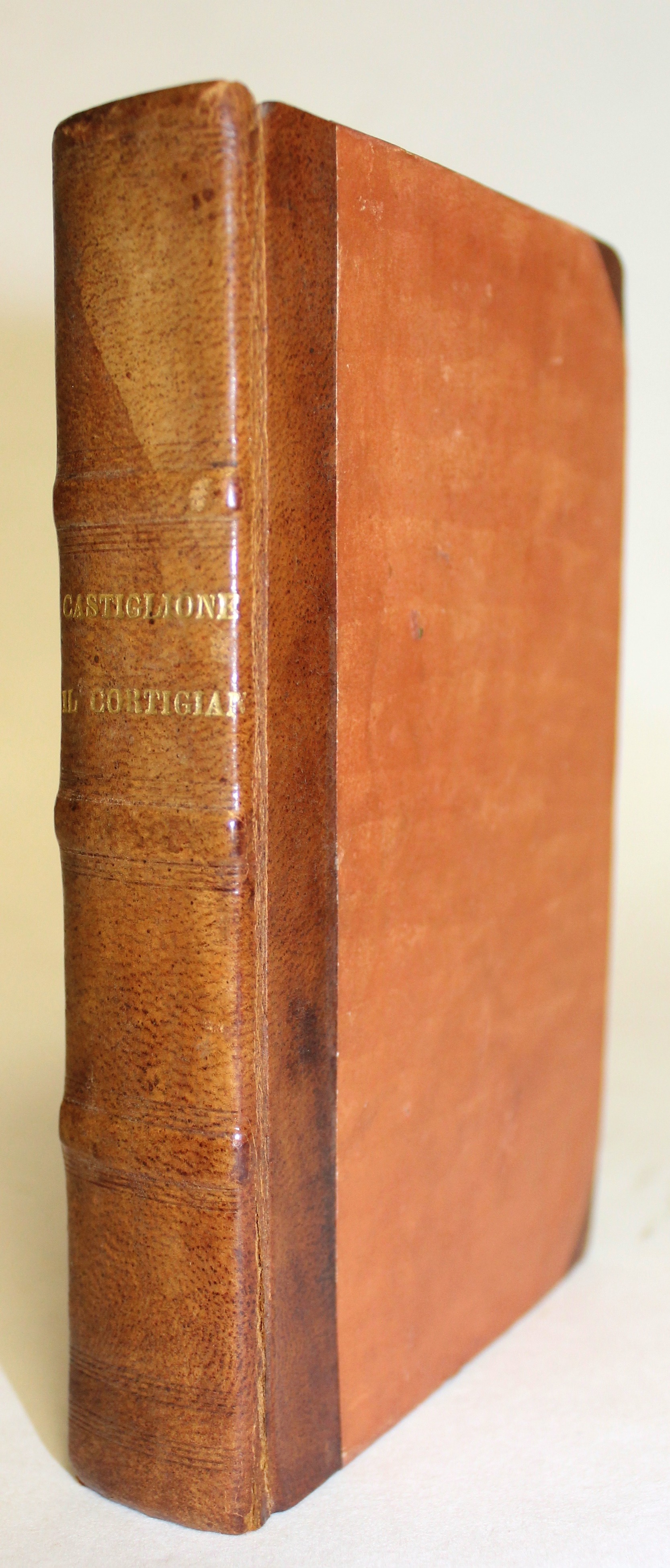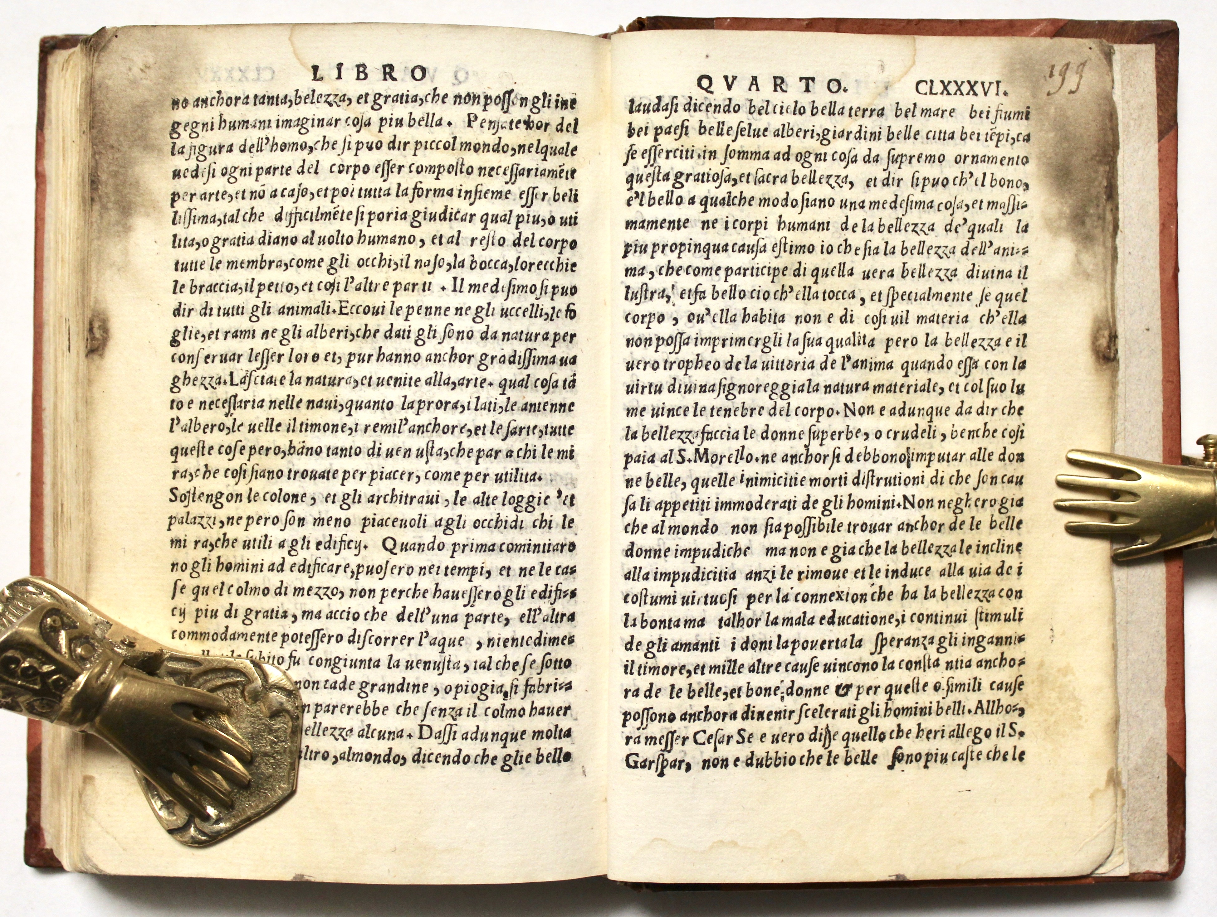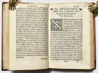 In 16°(mm 150x100); frontespizio con ricca cornice calcografica e figure allegoriche, 5 carte n.n. con le tavole "de tutte le materie”, 2 carte bianche, 4 c.n.n. (su 5, mancante il secondo frontespizio posta in carta A1, che precede la lettera dedicatoria al vescovo Michel de Silva), carte numerate CXCV con parecchie malnumerazioni (numerate anticamente a mano 208), (1); testo corsivo, capolettera parlanti al primo, secondo, terzo e quarto libro, in silografia. Legatura in mezza pelle ottocentesca con angoli, sguardie moderne, titolo in oro al dorso con tre nervi.