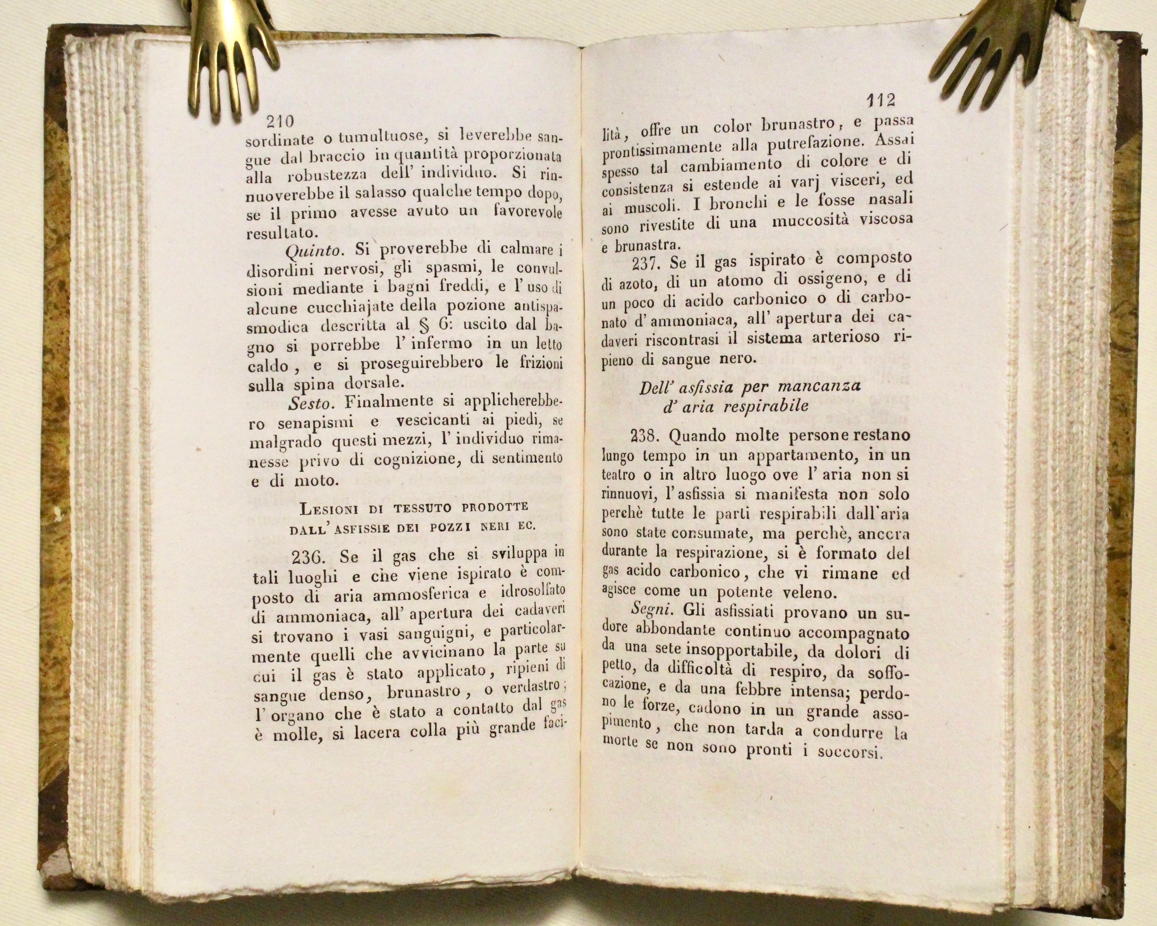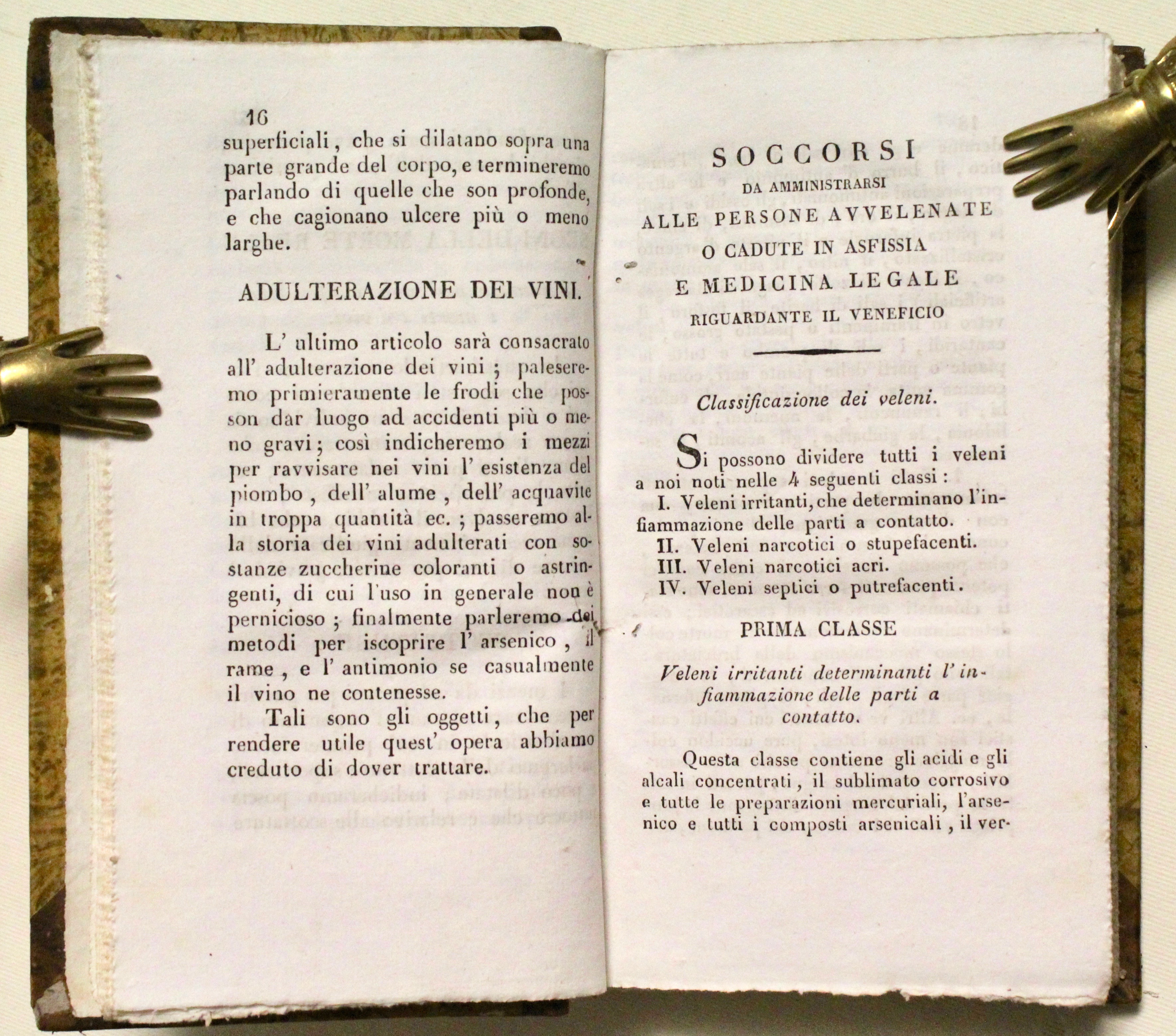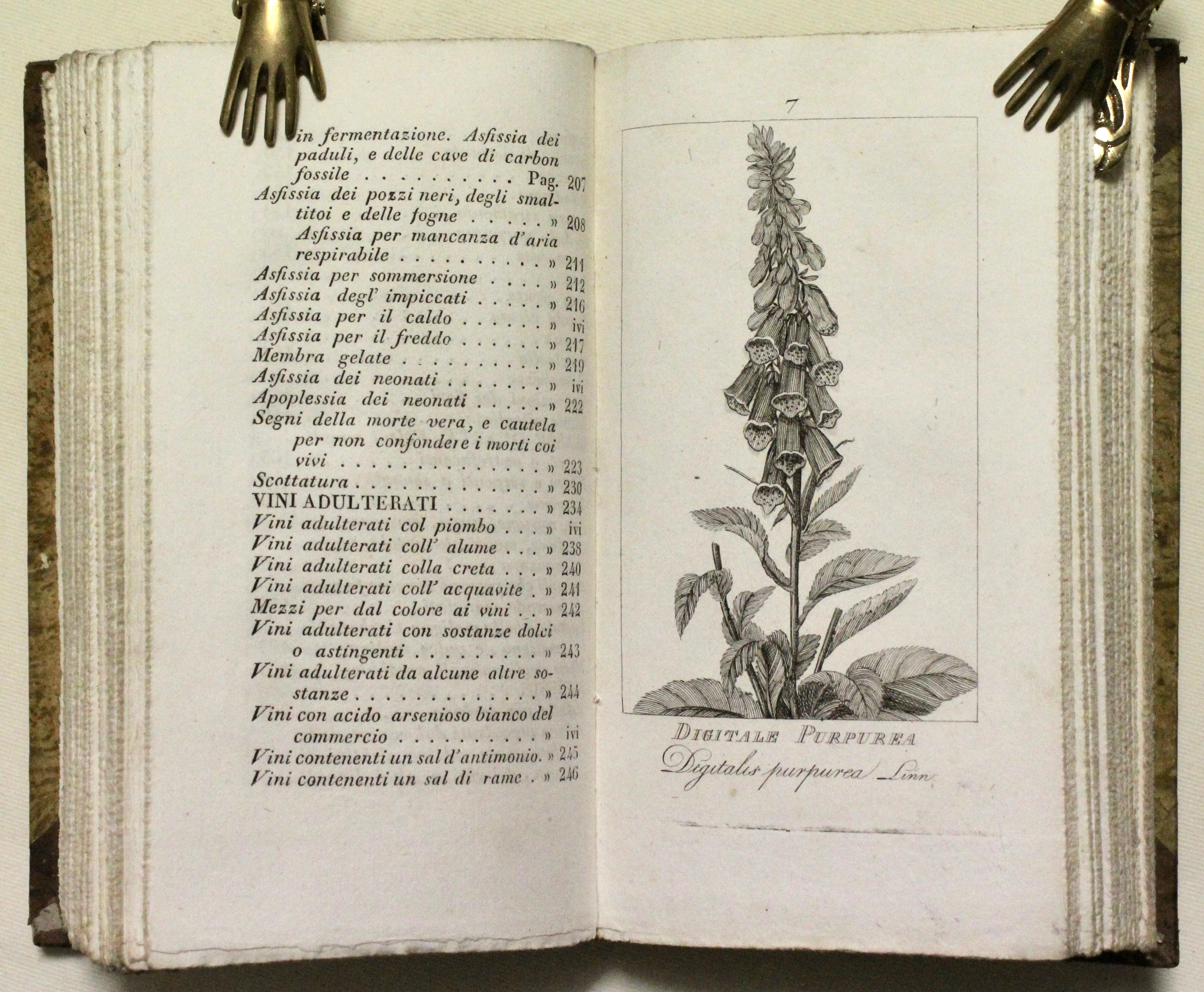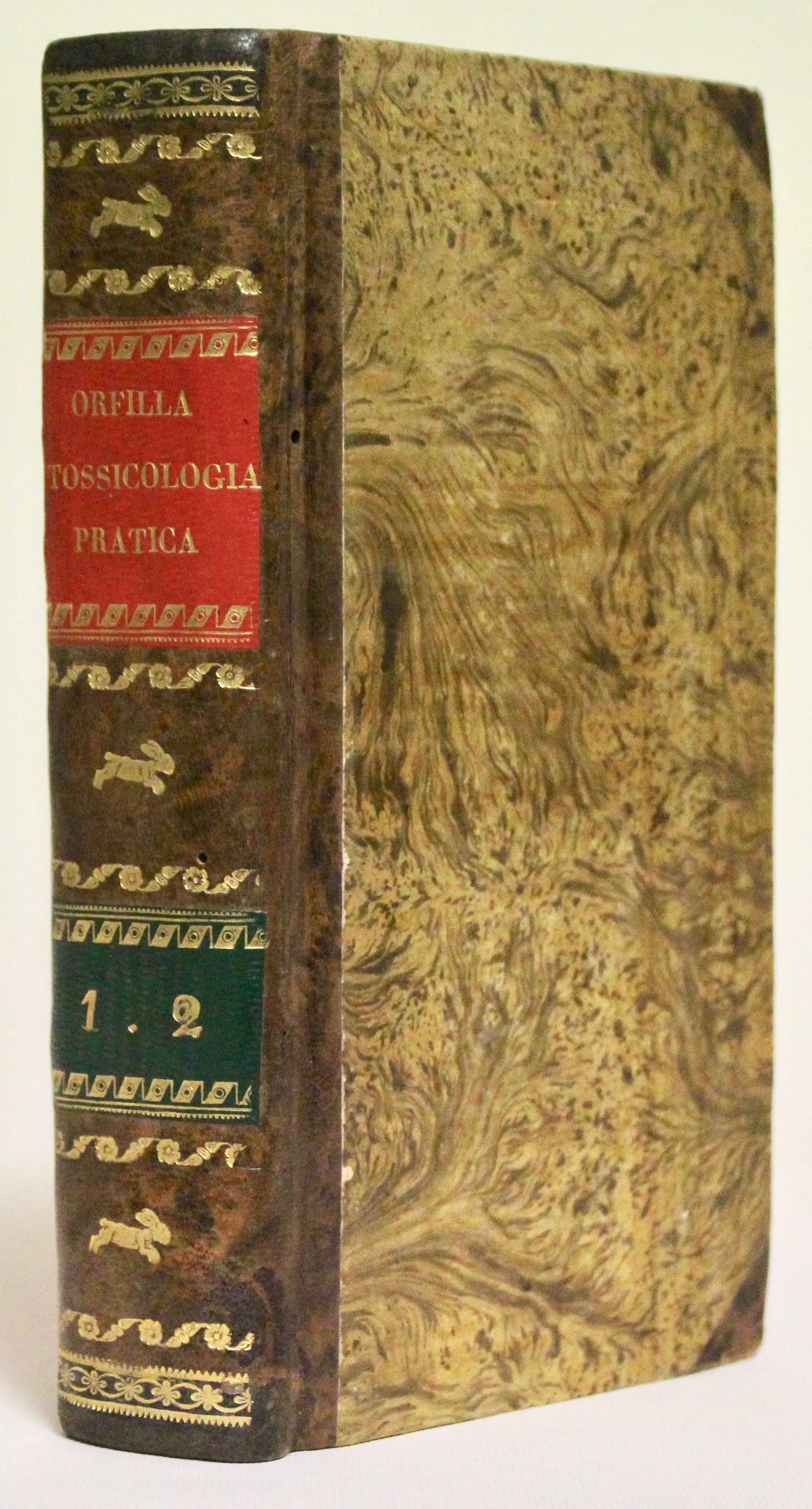 2 voll. in un tomo. In 16° (mm 198x115); pagg. 426, XIII (di Indice), con 14 raffinate tavole incise finemente in rame, di cui 6 a colori in fine, che illustrano la classificazione di alcuni funghi, insetti e piante velenose. Seconda edizione con nuove aggiunte del dott. Michelotti. Orfila (1787 – 1853) chimico e fisiologo spagnolo, ma di adozione francese, è considerato il padre della tossicologia moderna; in questo interessante trattato egli descrive delle malattie per asfissia e avvelenamento, allo scopo di rendere popolare le proprie cognizioni, e indicare ciò che è relativo fare per prestare soccorso “alle creature che vengono alla luce senza dar segno di vita, ai caratteri che distinguono la morte vera dalla morte apparente, alle scottature, e all’adulterazione dei vini”.