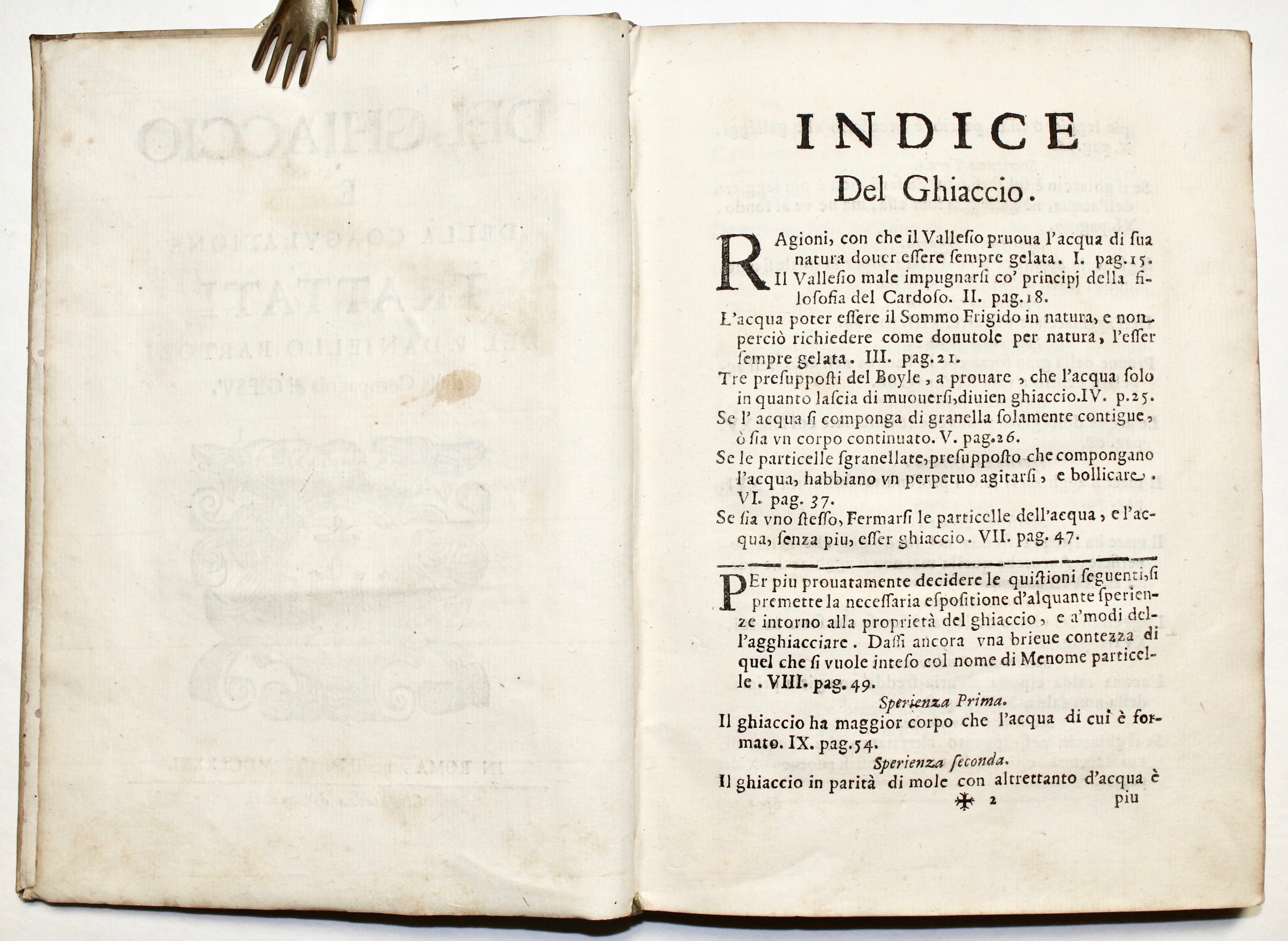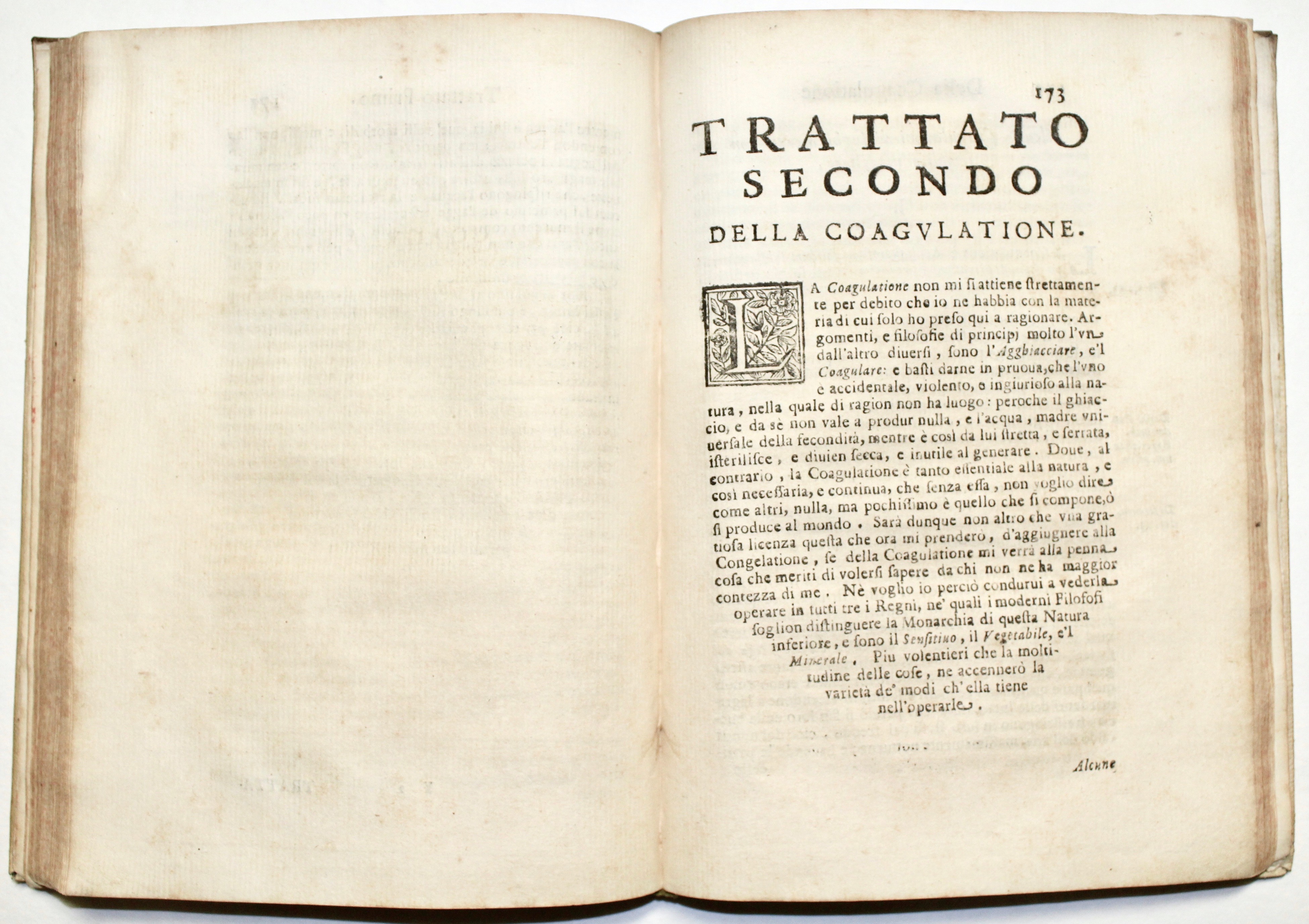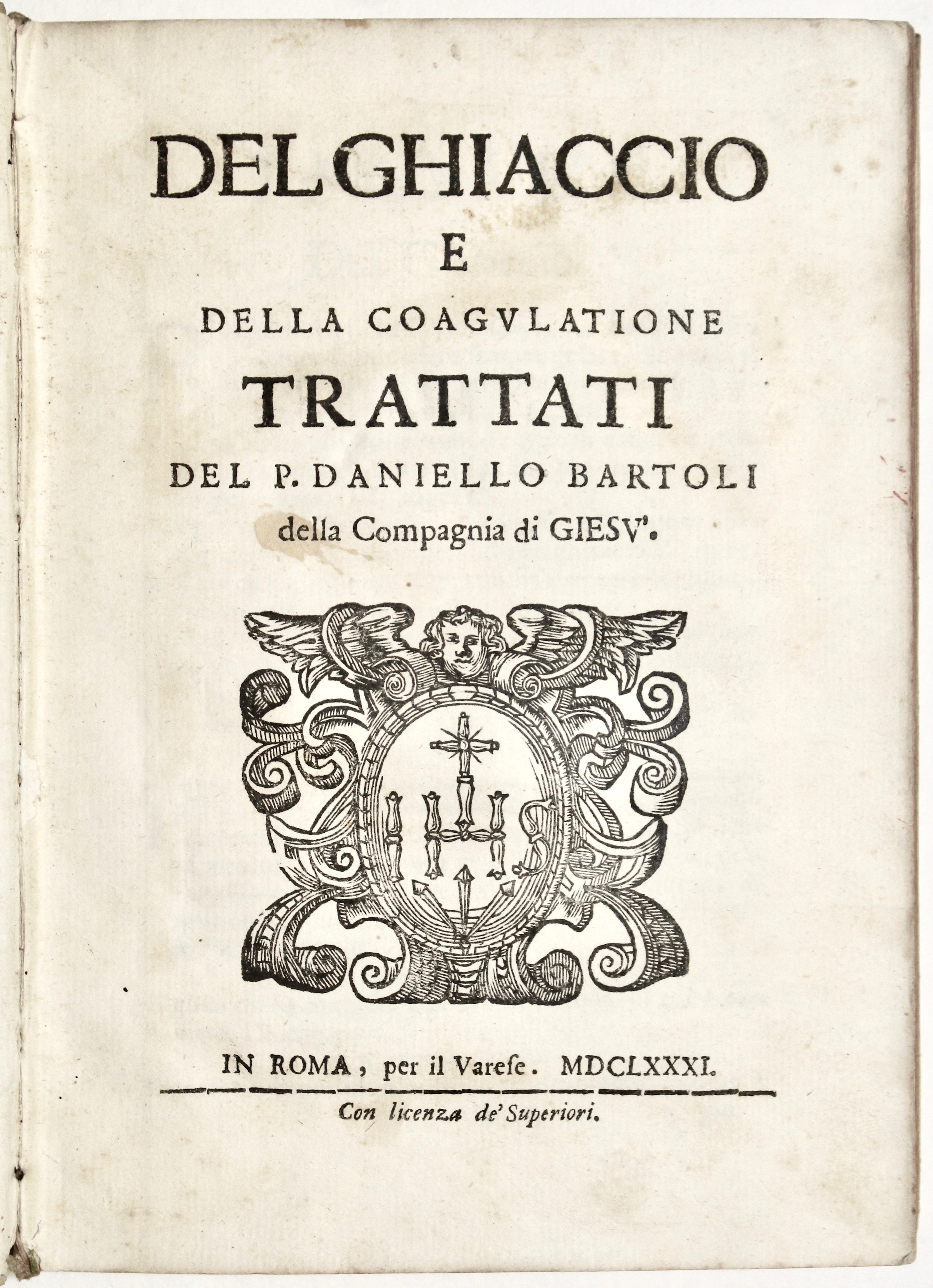 Prima edizione piuttosto rara di questa nota opera relativa a chimica e fisica; riguarda anche il mare e riporta due capitoli, X e XVIIII su vino e birra: “l’aggelarsi del vino e delle parti serose che sono in lui. Separatamente e adunatamente de gli spiriti della cervogia e del vino quando se ne agghiacciano le botti”. Il gesuita ferrarese Bartoli (1608-Roma 1685) fu autore di numerose opere di vario genere, dallo scientifico al morale, dallo storico al geografico.