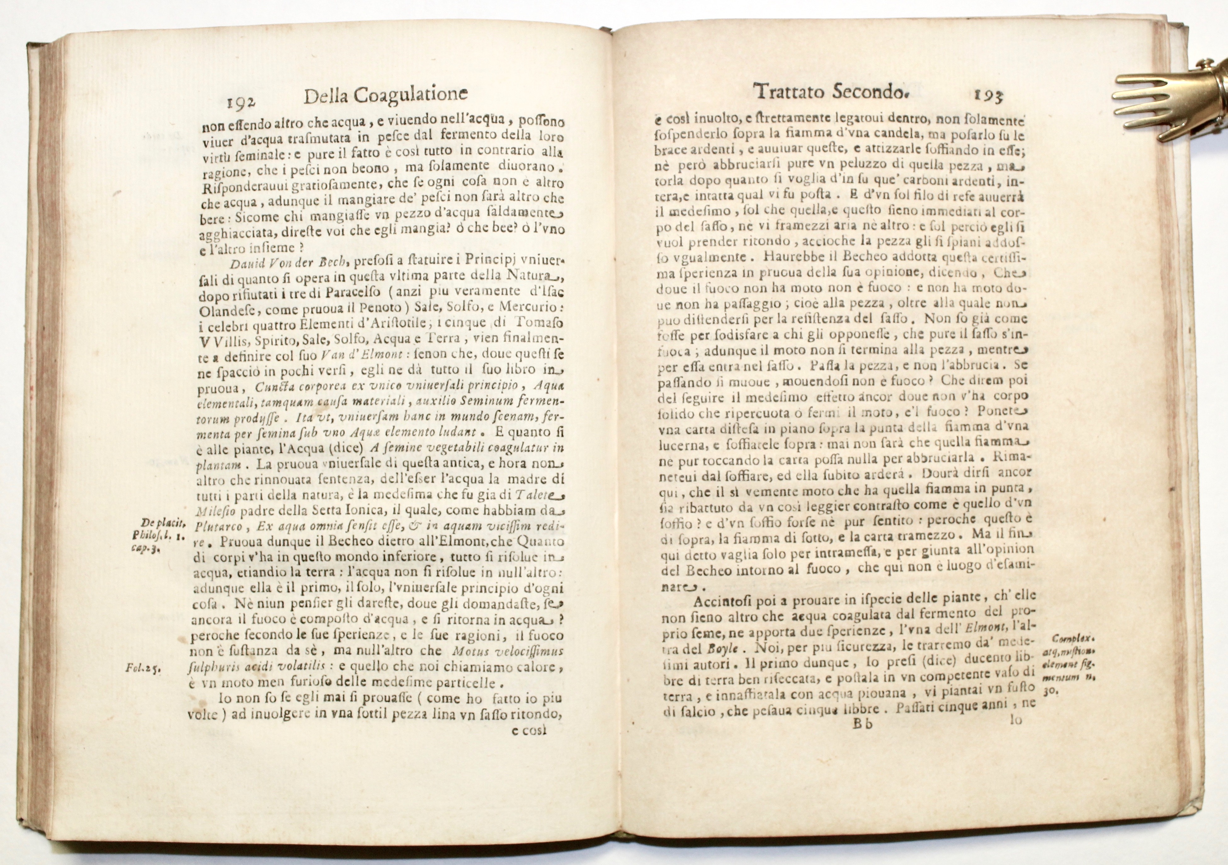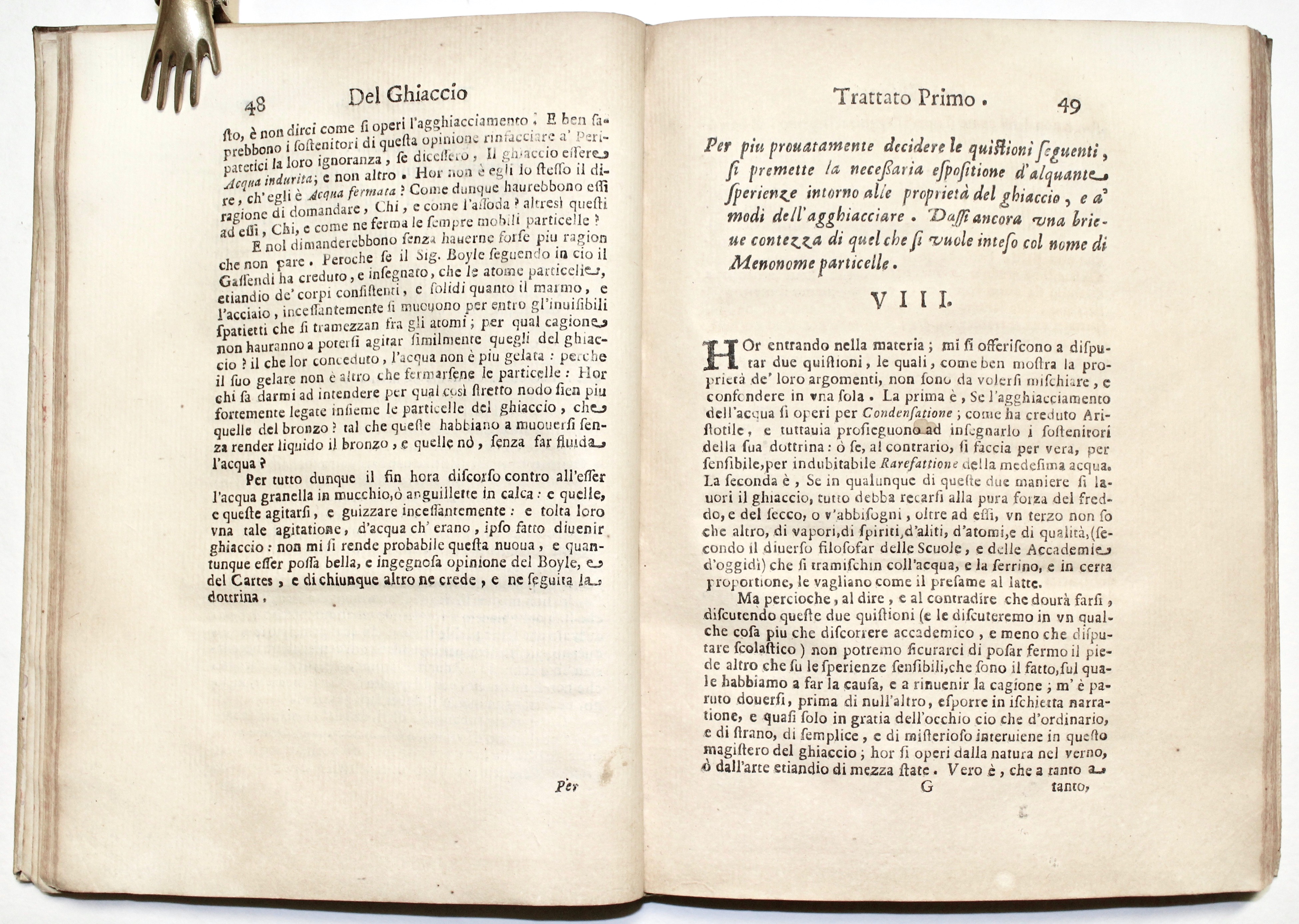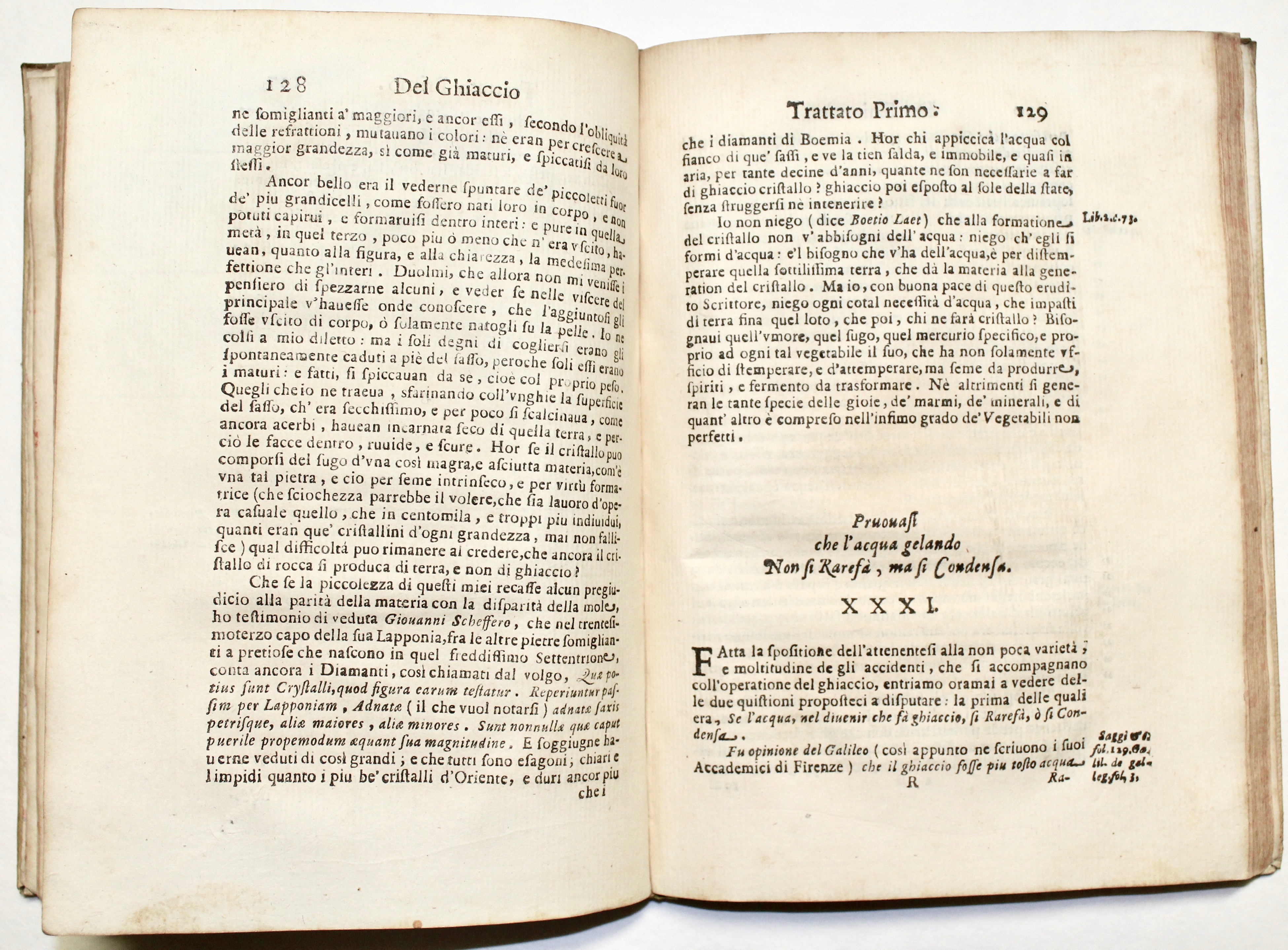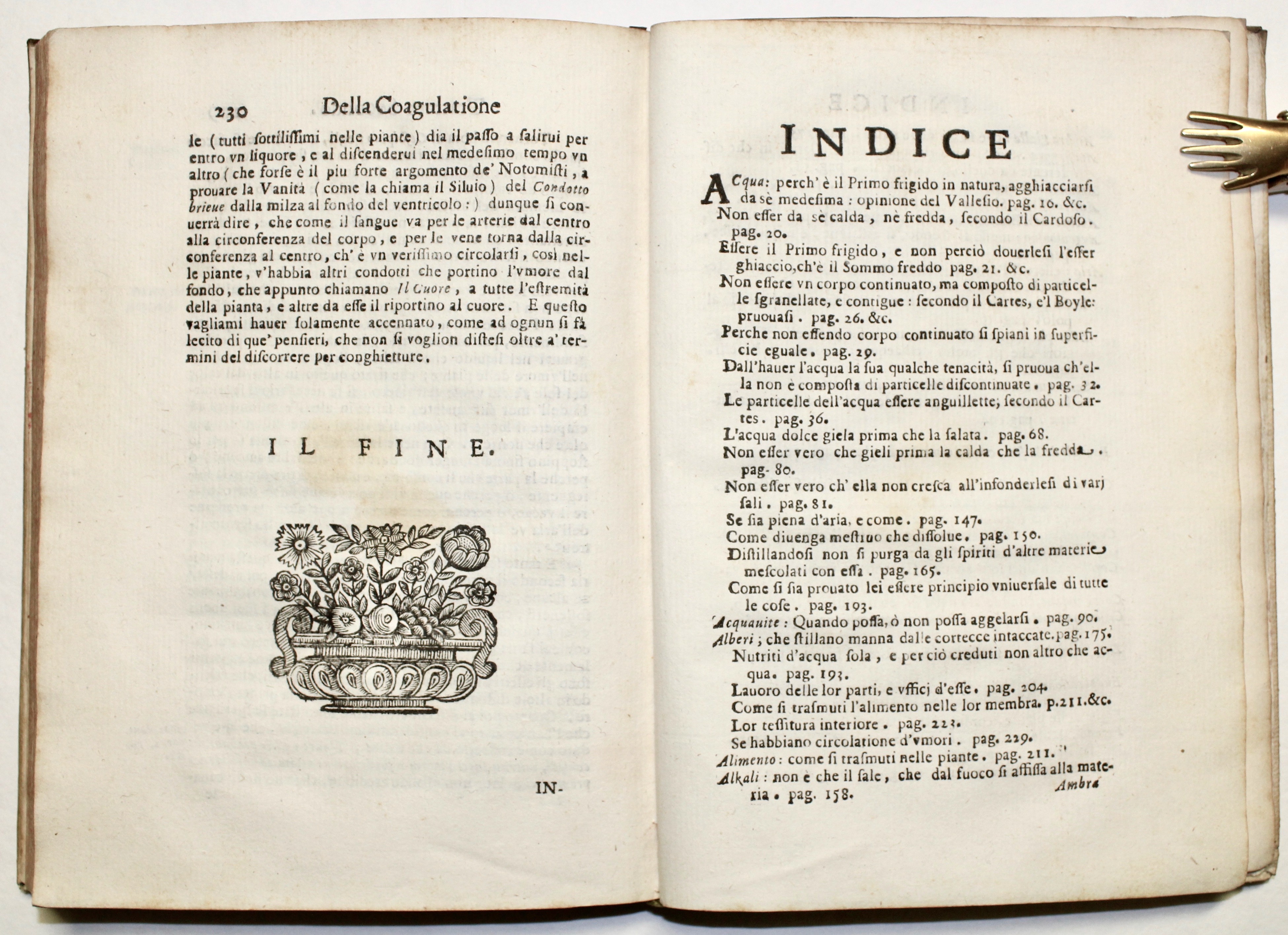 Prima edizione piuttosto rara di questa nota opera relativa a chimica e fisica; riguarda anche il mare e riporta due capitoli, X e XVIIII su vino e birra: “l’aggelarsi del vino e delle parti serose che sono in lui. Separatamente e adunatamente de gli spiriti della cervogia e del vino quando se ne agghiacciano le botti”. Il gesuita ferrarese Bartoli (1608-Roma 1685) fu autore di numerose opere di vario genere, dallo scientifico al morale, dallo storico al geografico.