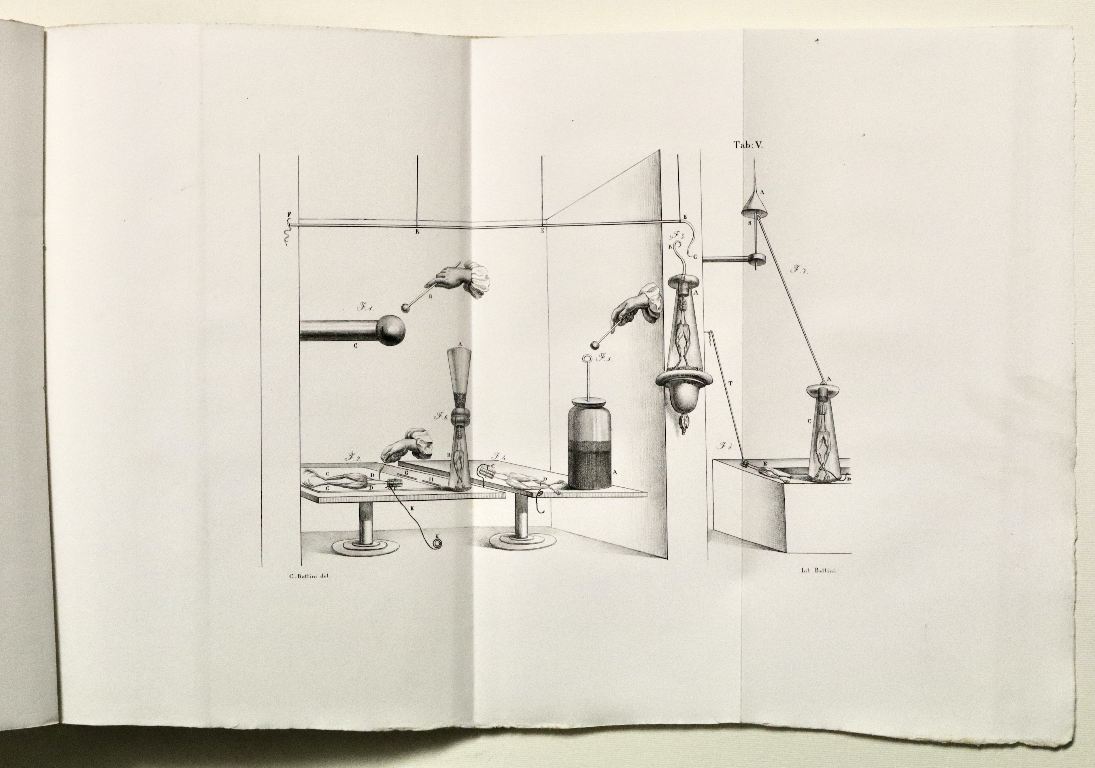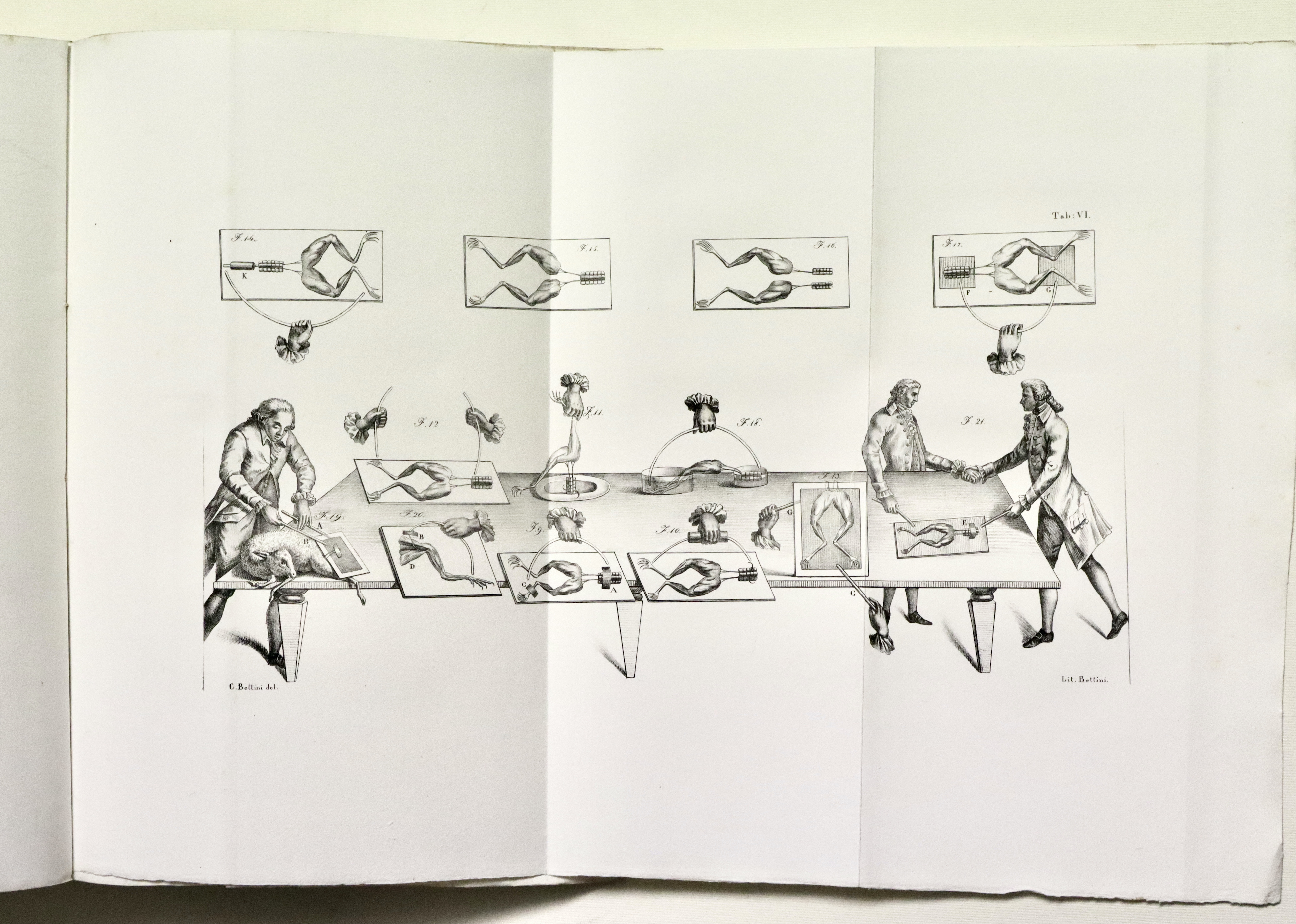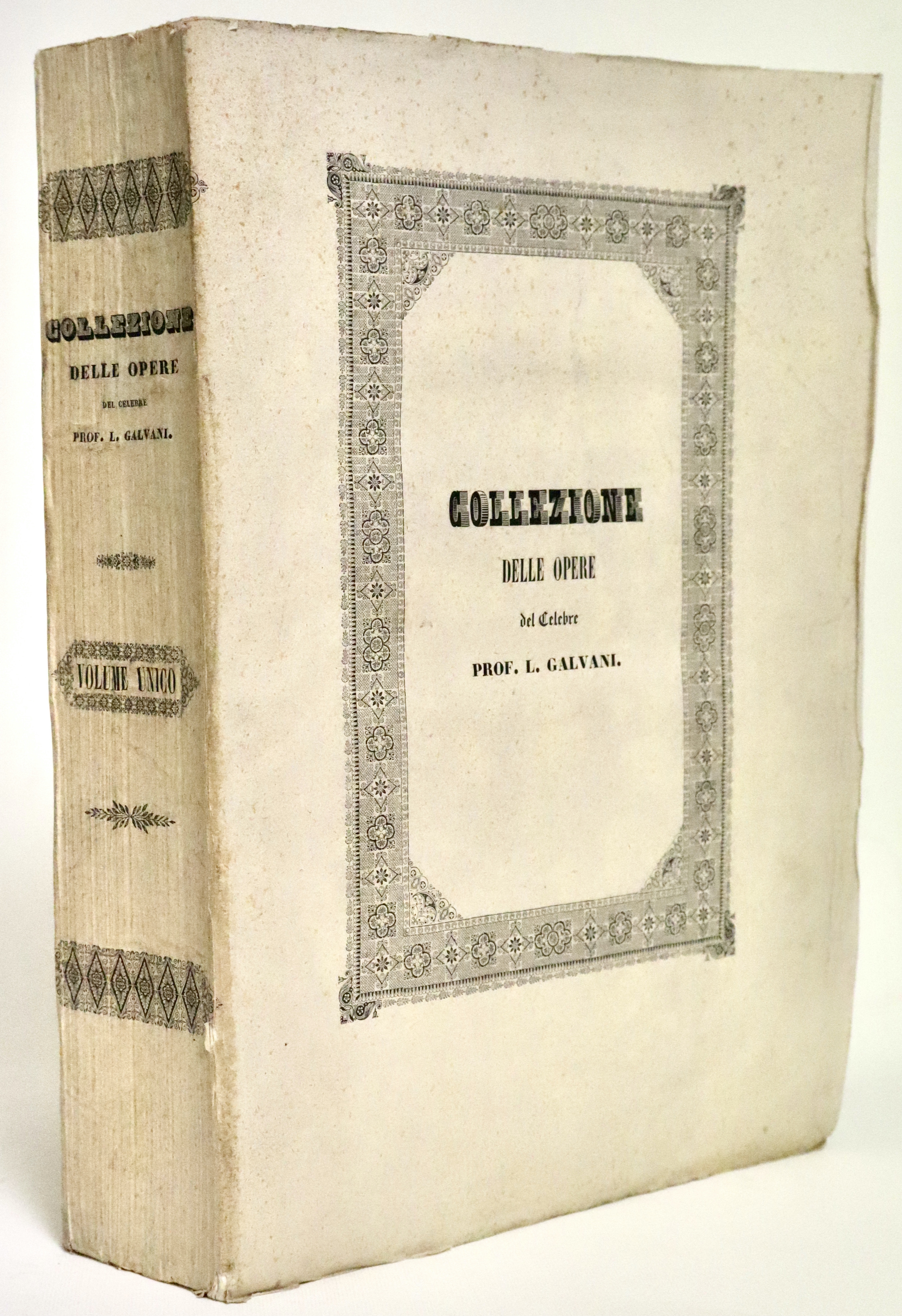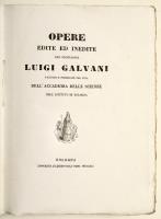 In 4° grande (mm 310x230); pagg. 120, 505, (3), ritratto di Galvani inciso in rame da Marchi su disegno di Spagnoli, tavola litografica che riproduce in facsimile una lettera dell’aut., con 9 tavole, di cui 4 ripiegate. Brossura editoriale a stampa. Prima edizione collettiva, che contiene anche alcune parti in prima edizione, prima edizione critica del “De viribus electricitatis”. Esemplare immacolato, con barbe ed intonso. Rossetti Cantoni, pag. 45.