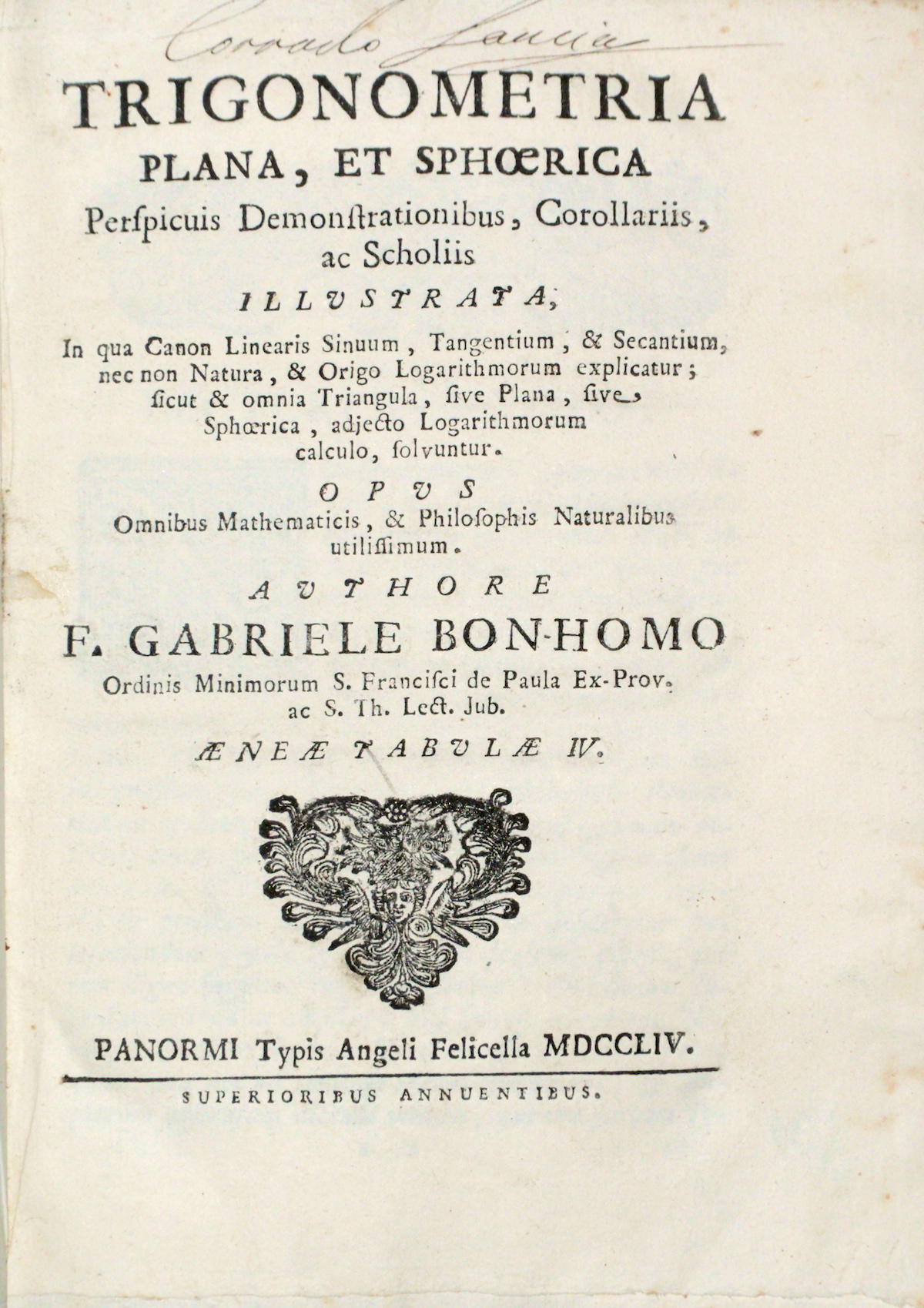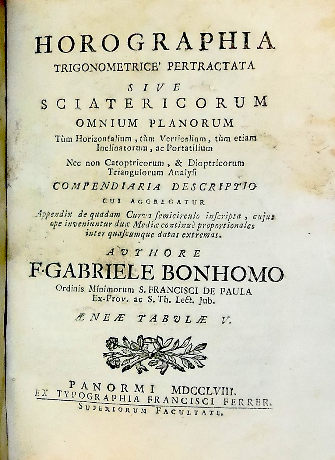 Queste non comuni opere qui rilegate insieme, sono il frutto del valente frate Gabriele Bonomo (Nicosia, 1694 – Palermo, 1760) che fu teologo, matematico e filosofo appartenente all'Ordine dei Minimi. Fu il fondatore dell’Accademia delle Matematiche nel convento di Sant’Oliva a Palermo, a cui aderirono anche lo Spedalieri e l’Abati. Fu di sua invenzione un orologio automatico. La Trigonometria plana è suddivisa in quattro libri mentre l’Horographia trigonometricae in sette capitoli,