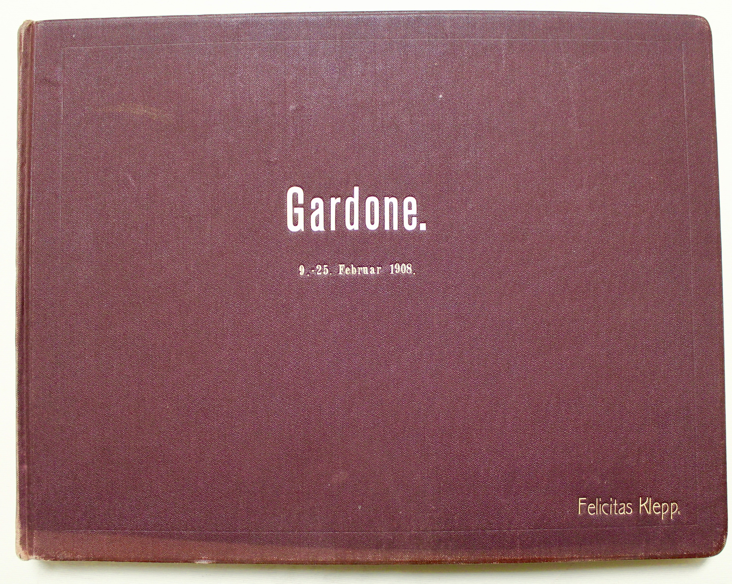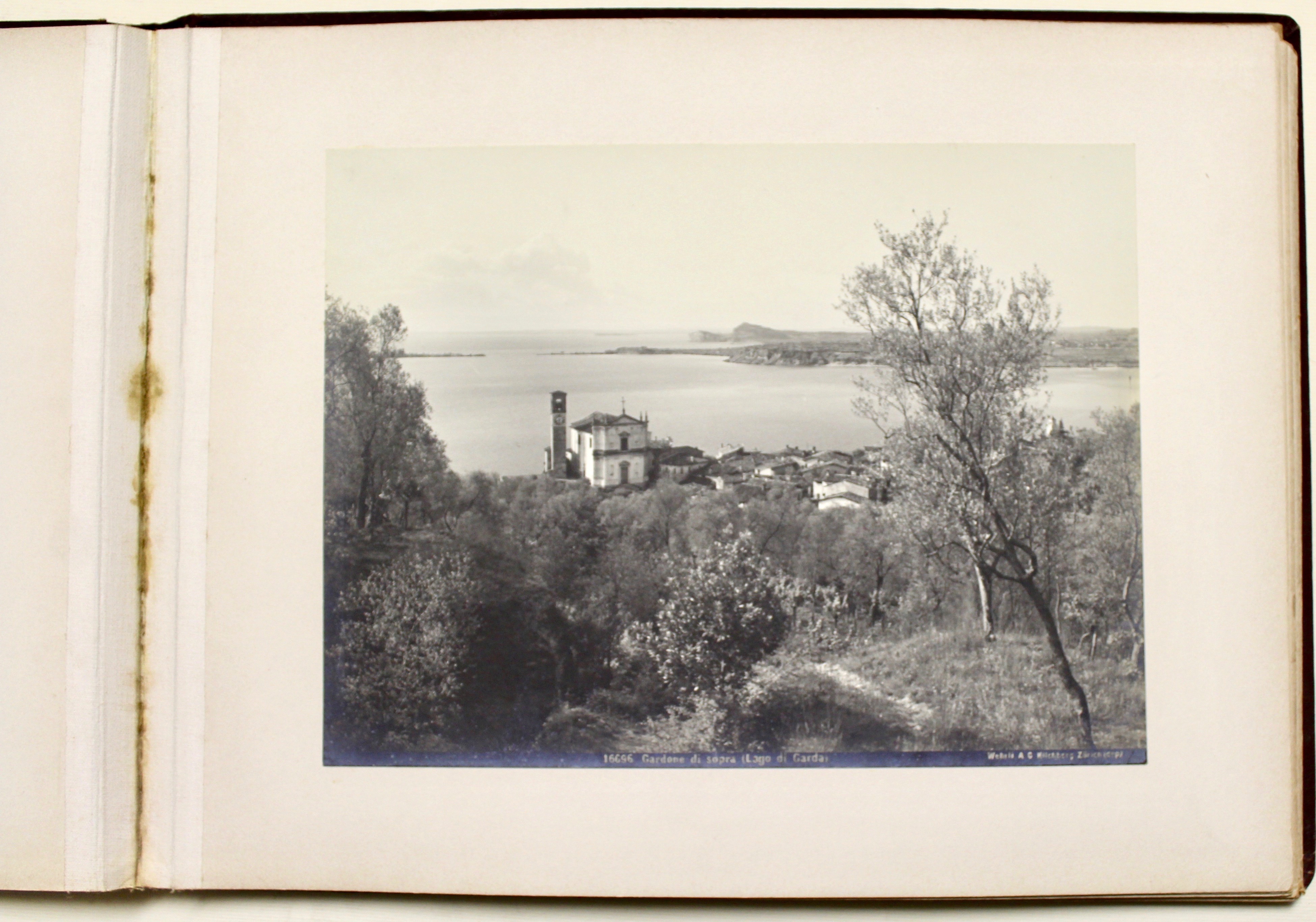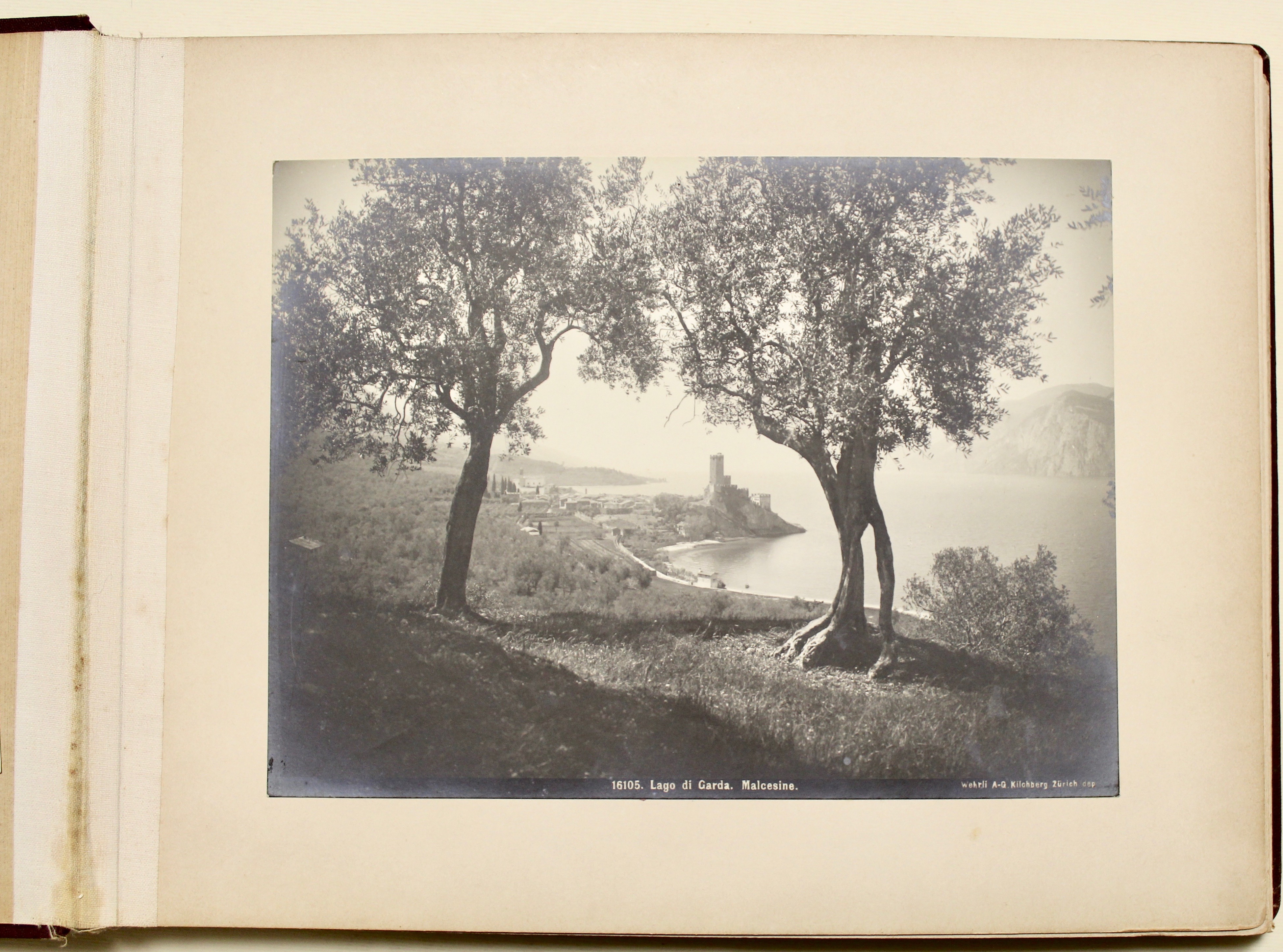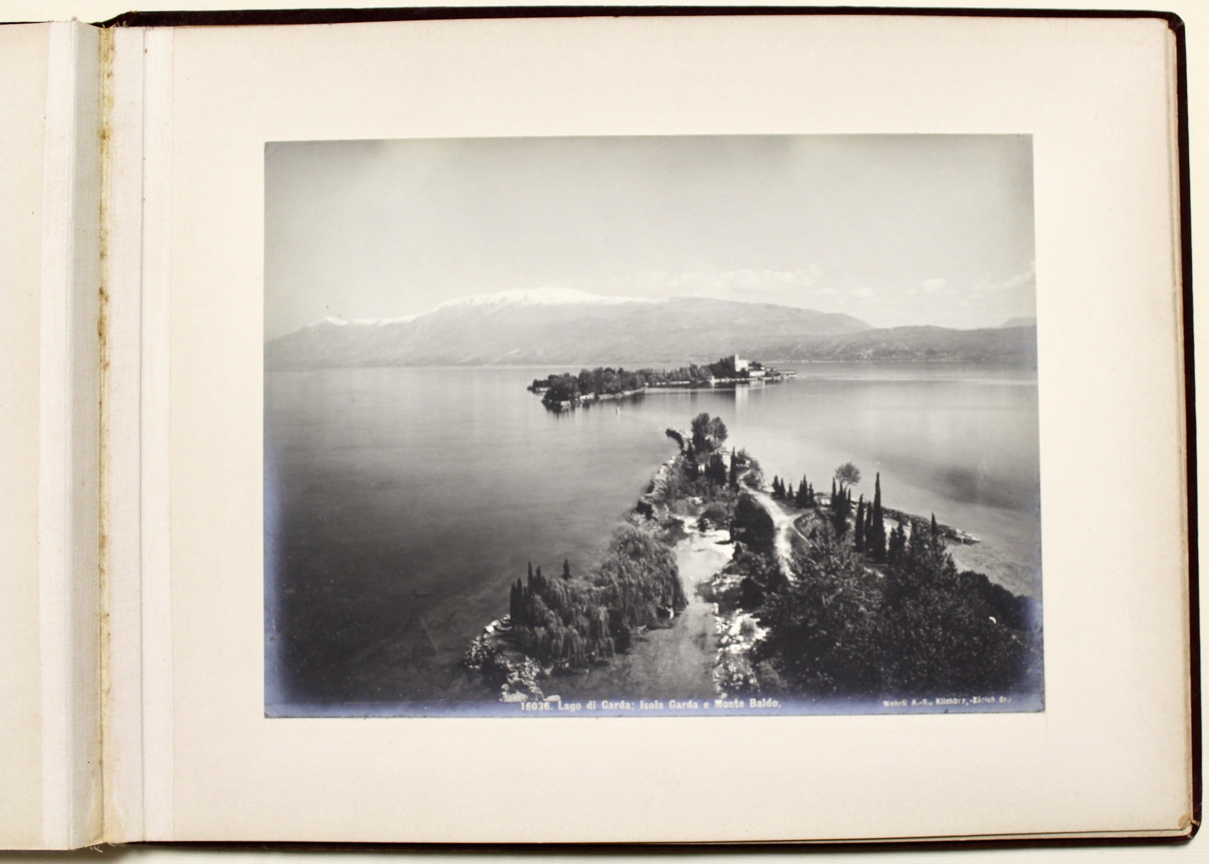 In 8° oblungo (mm 235x305). Interessante e inusuale album fotografico con 16 foto (160x220) dello svizzero Wehrli di Kilchberg-Zurigo, che ritraggono ameni paesaggi d’altri tempi del Lago di Garda: Malcesine, Limone, Gargnano, Maderno, Maina di Toscolano, Fasano, Gardone di Sopra, Gardone, Salò, Isola del Garda. Legatura in tela, titolo al piatto in oro.