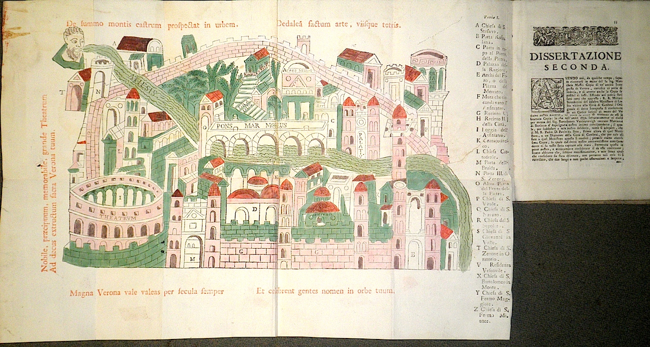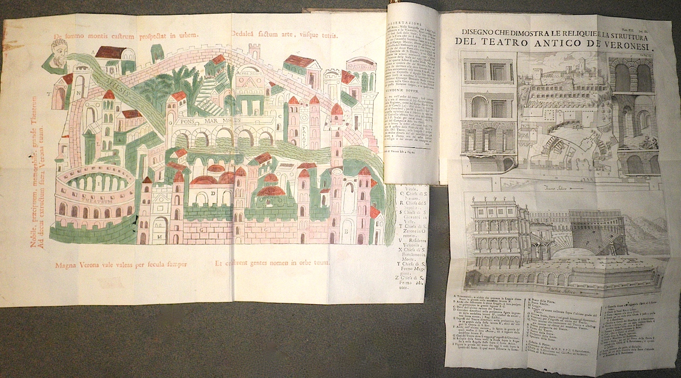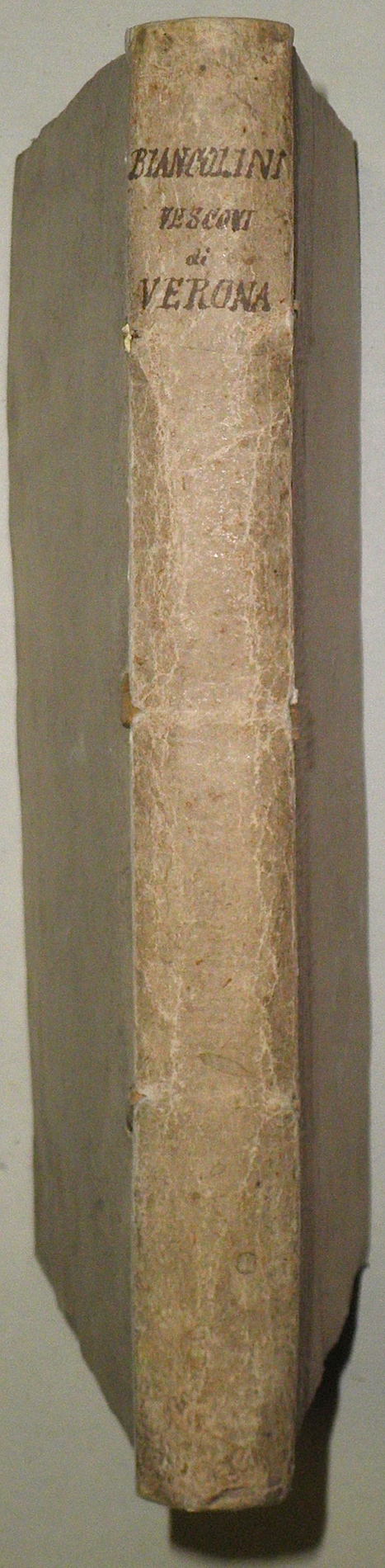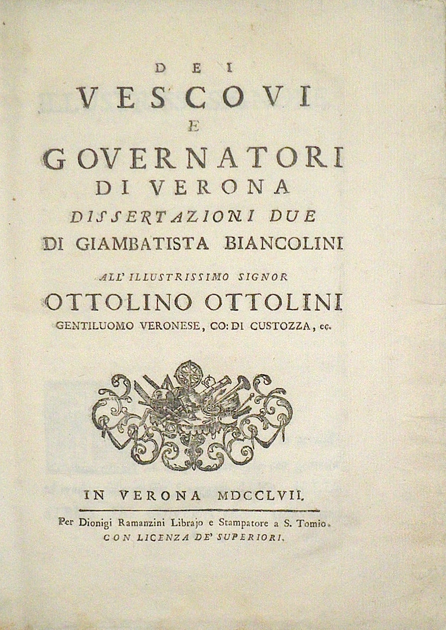 In 4° (265x195); pagg. (4), 199, (1) con 12 tavole incise in rame (alcune ripiegate), con la grande tavola Rateriana tutta a colori d'epoca. Capilettera istoriate, testatine silografiche. Dedica al Sig. Ottolino Ottolini conte di Custoza. Esemplare con barbe e pieno fascinoso cartonato coevo con titolo manoscritto al dorso. Rara edizione originale. Le due dissertazioni riguardano rispettivamente la cronologia dei Vescovi veronesi ed il Ritmo Pipiniano, il più antico documento relativo all'argomento e la cosiddetta Iconografia Rateriana, visionata da Biancolini presso il Maffei, che l'autore si premurò di incidere a stampa e di inserire nell'opera; questa seconda parte traccia anche la storia della città, e fornisce notizie di carattere artistico-architettonico, nonché la cronologia dei governatori con molte copie di documenti originali.