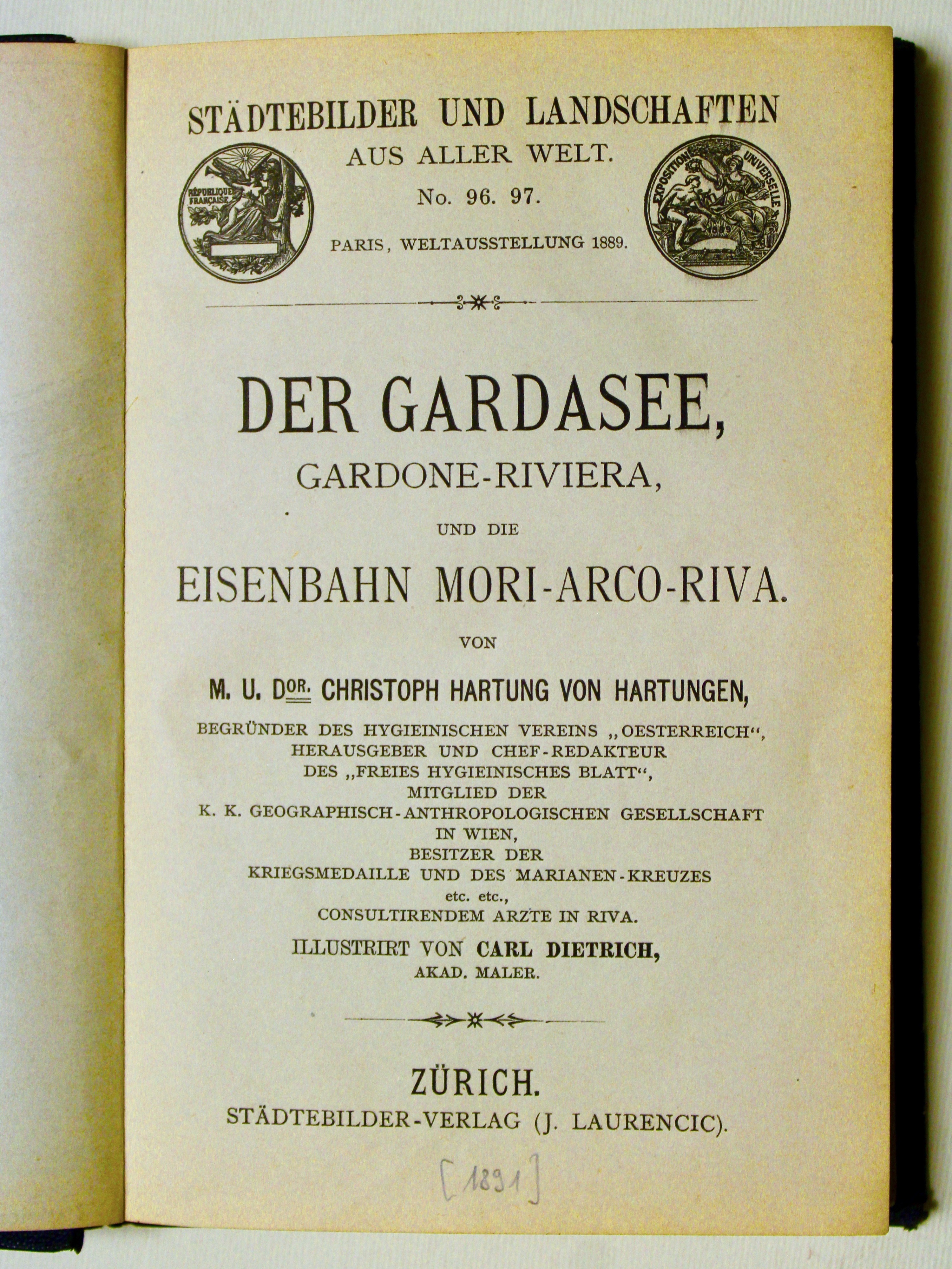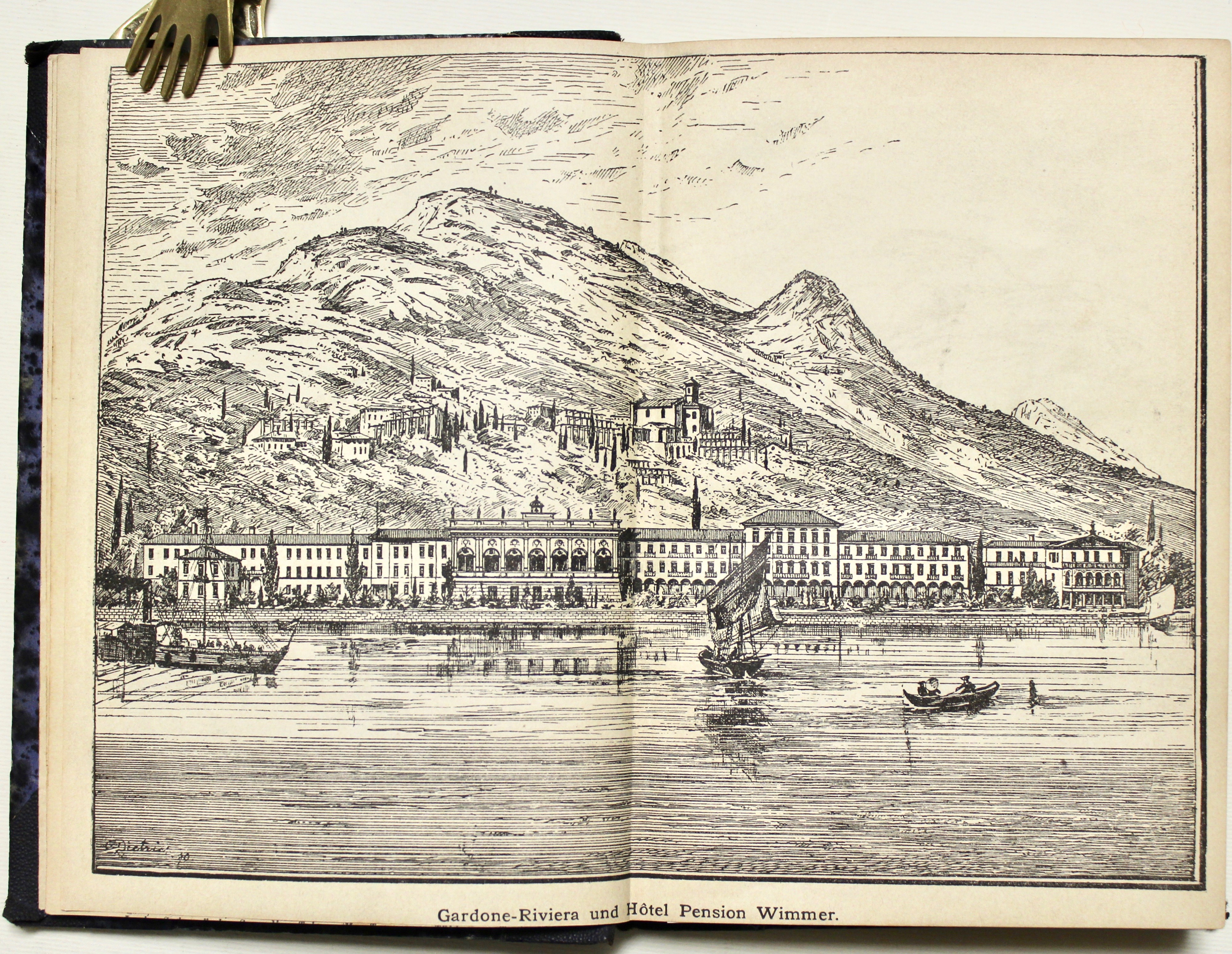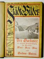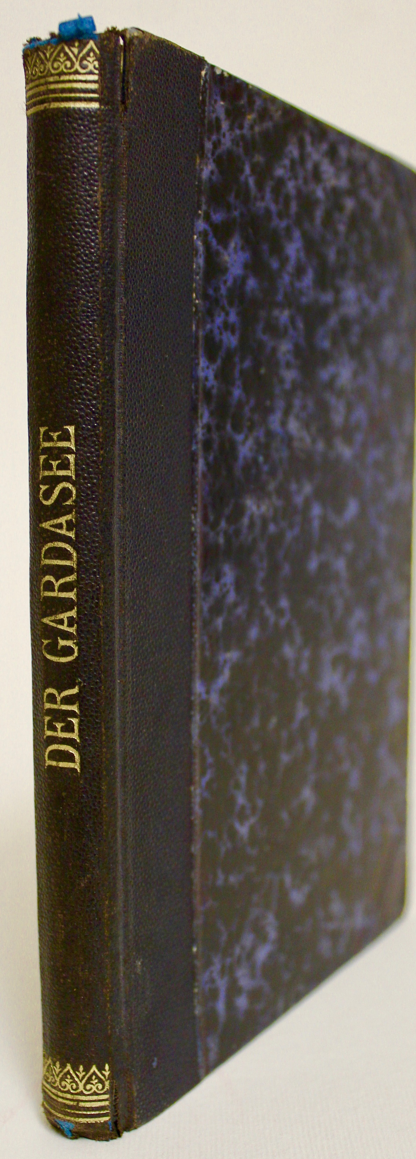 pagg. 89 con una grande carta del Garda rip. più volte, una tavola f.t. a doppia pag. di Gardone Riviera ed una decina di altre vedute a tutta pagina oltre a decine di illustrazioni nel testo su disegno di Carl Dietrich; pagg. 96 con 31 vedute ed una pianta di Salisburgo. Legatura posteriore in mezza tela con angoli con titolo in oro al dorso, che protegge le brossure editoriali policrome illustrate con vedute in copertina enpianta di Salisburgo al verso della seconda opera. Il primo tomo descrive ad opera di Joseph Fischer inizialmente la nuova ferrovia che partiva da Mori e raggiungeva Arco e Riva, inaugurata appunto nel 1891. Continua poi con descrizione di tutti i paesi del circondario compresi Torbole, Nago, Tenno, Tremosine, Malcesine. Una seconda parte riguarda invece la riviera bresciana. Dalla serie “Städte-Bilder und Landschaften aus aller Welt”