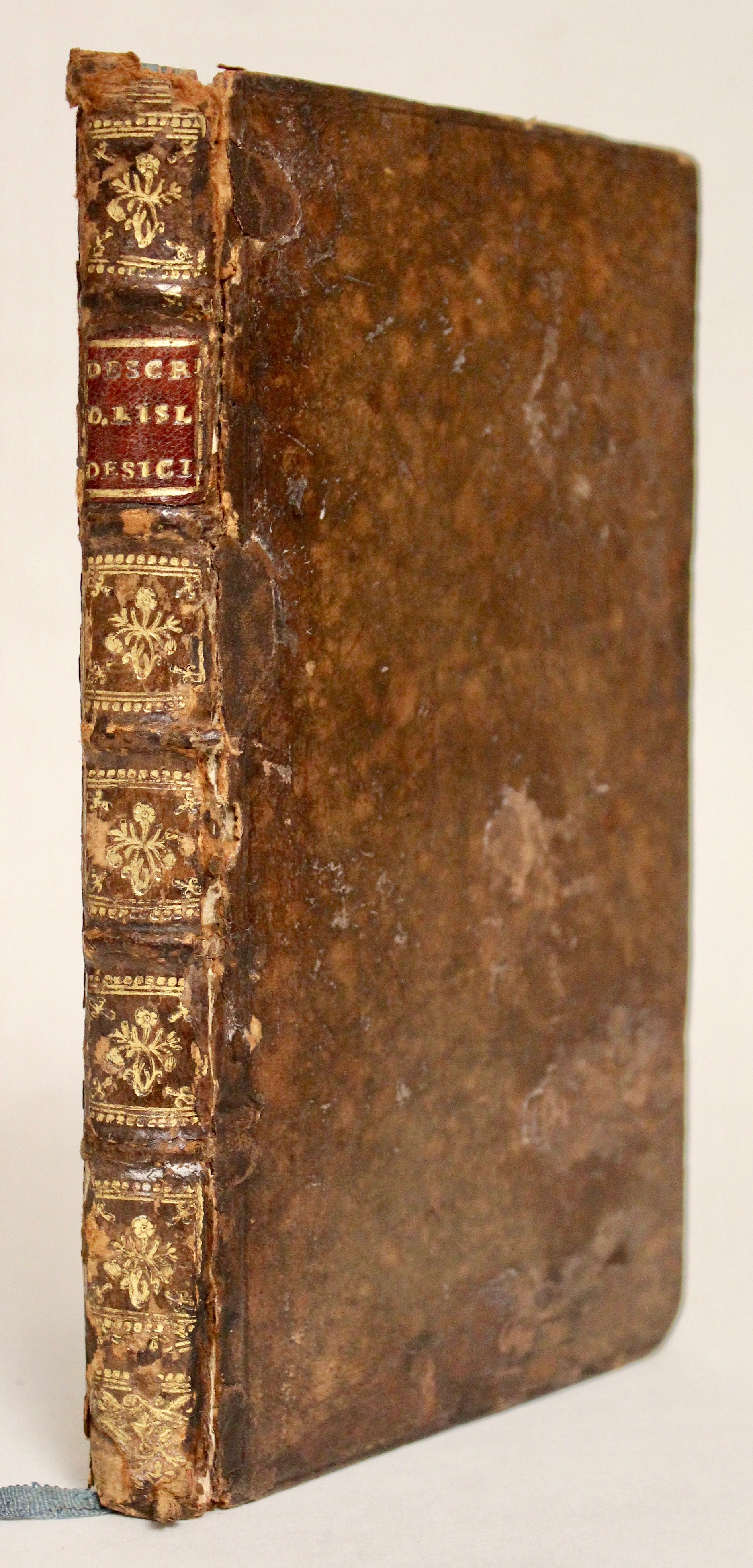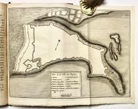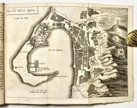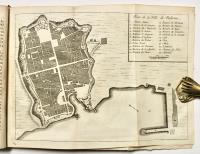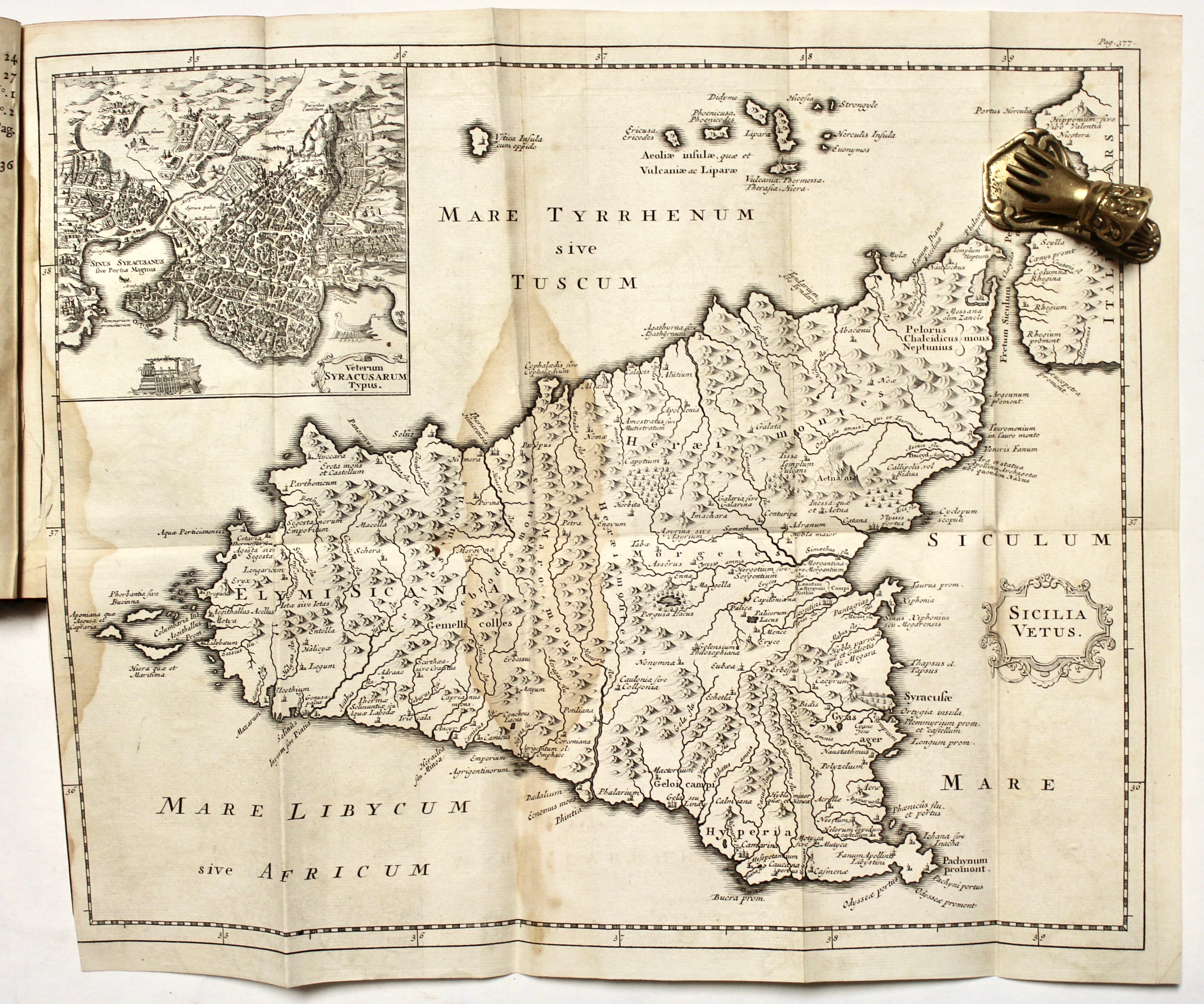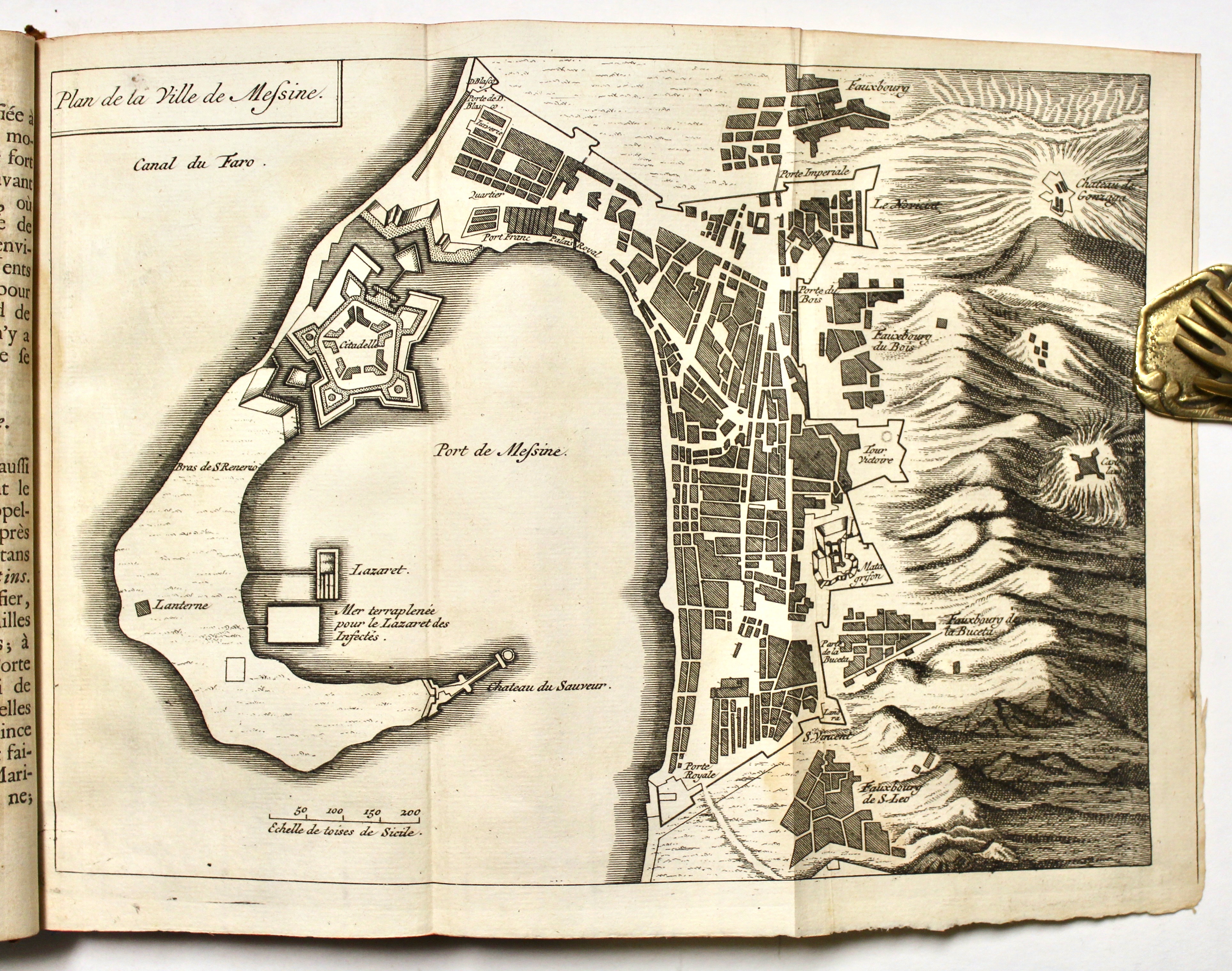 In 8°(mm 200x 120); pagg. (4), 86, (2); due magnifiche grandi carte geografiche della Sicilia f.t. incise in rame ripiegate più volte, 15 tavv. f.t. per lo più a doppia pagg. di piante di città, sempre in rame; fregi silografici e iniziali ornate. Piena pelle coeva con cinque nervi, ricchi fregi e titoli oro su doppio tassello. Tagli rossi. Frontespizio della prima opera in rosso e nero. Buon esemplare genuino, lievi fioriture e aloni saltuari.