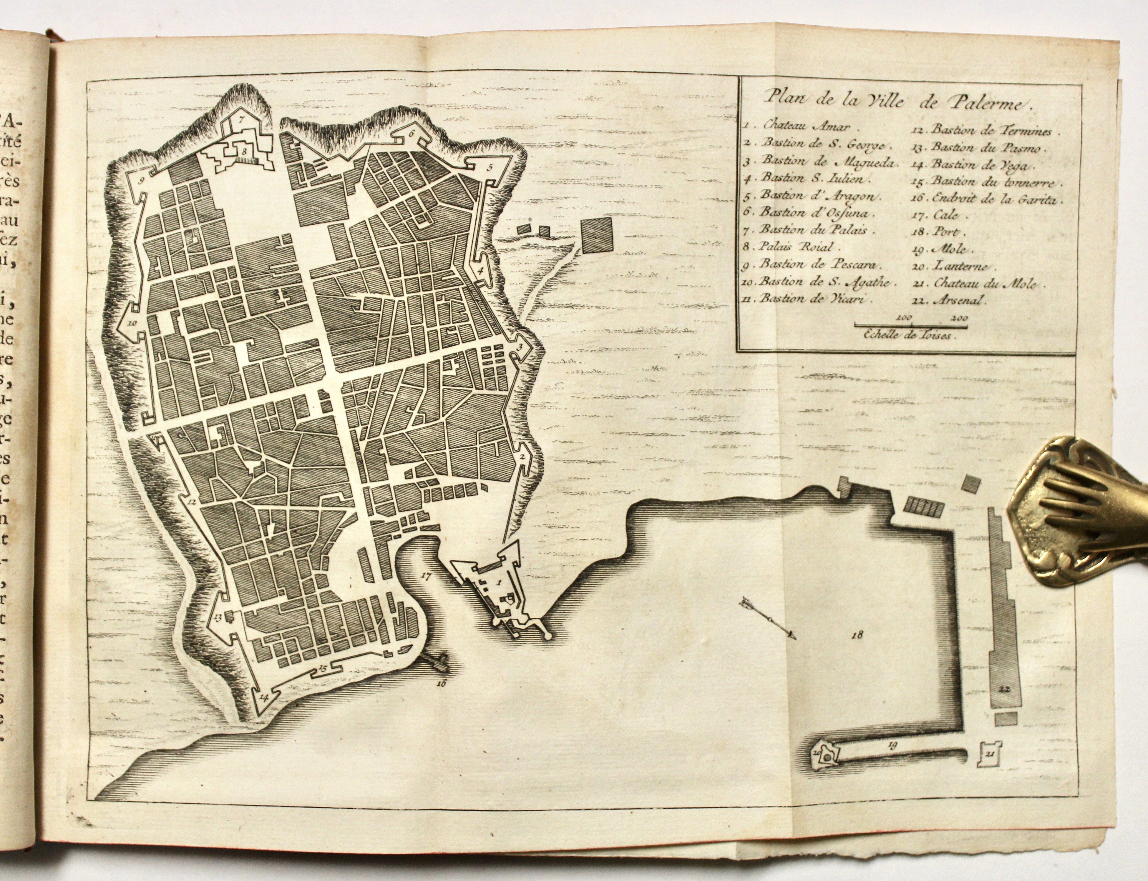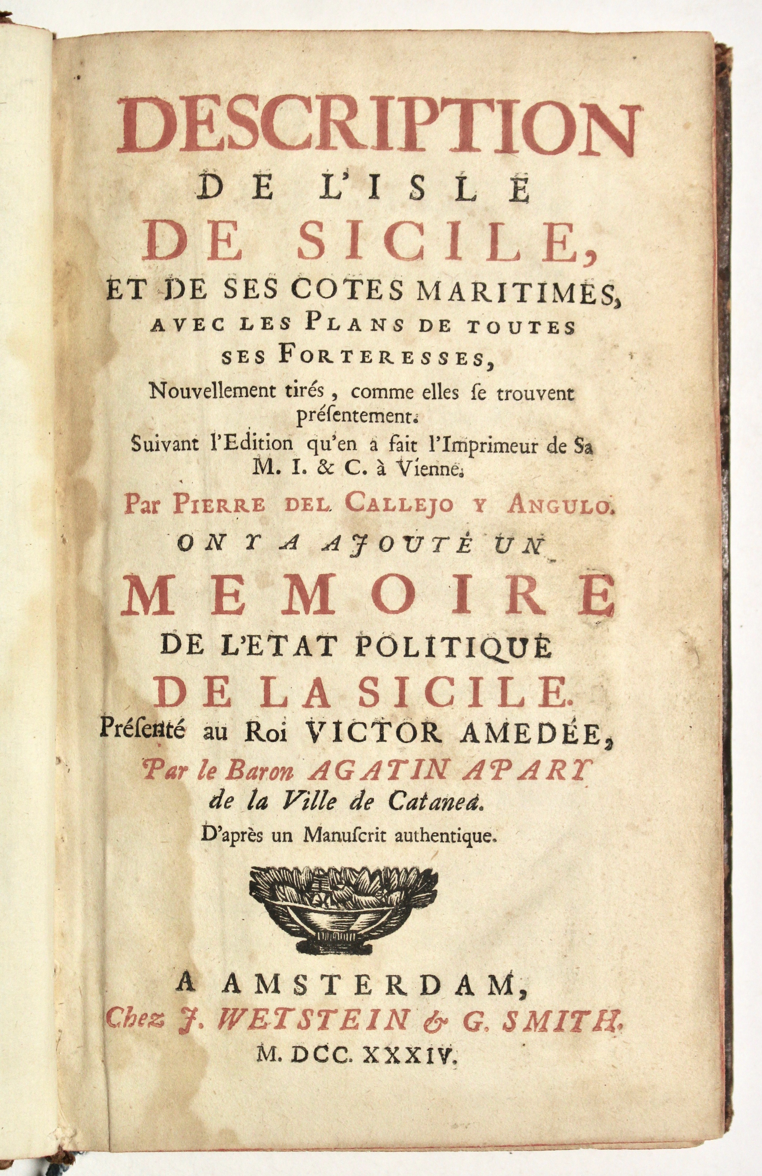 Description de l ‘isle de Sicile et de ses cotes maritimes avec les plans de toutes ses forteresses. Nouvellement tirés, comme elles se trouvent présentement…On y a ajuté un Memoire de l’etat politique de la Sicile. Par le Baron Agatin Apary de la ville de Catanea.