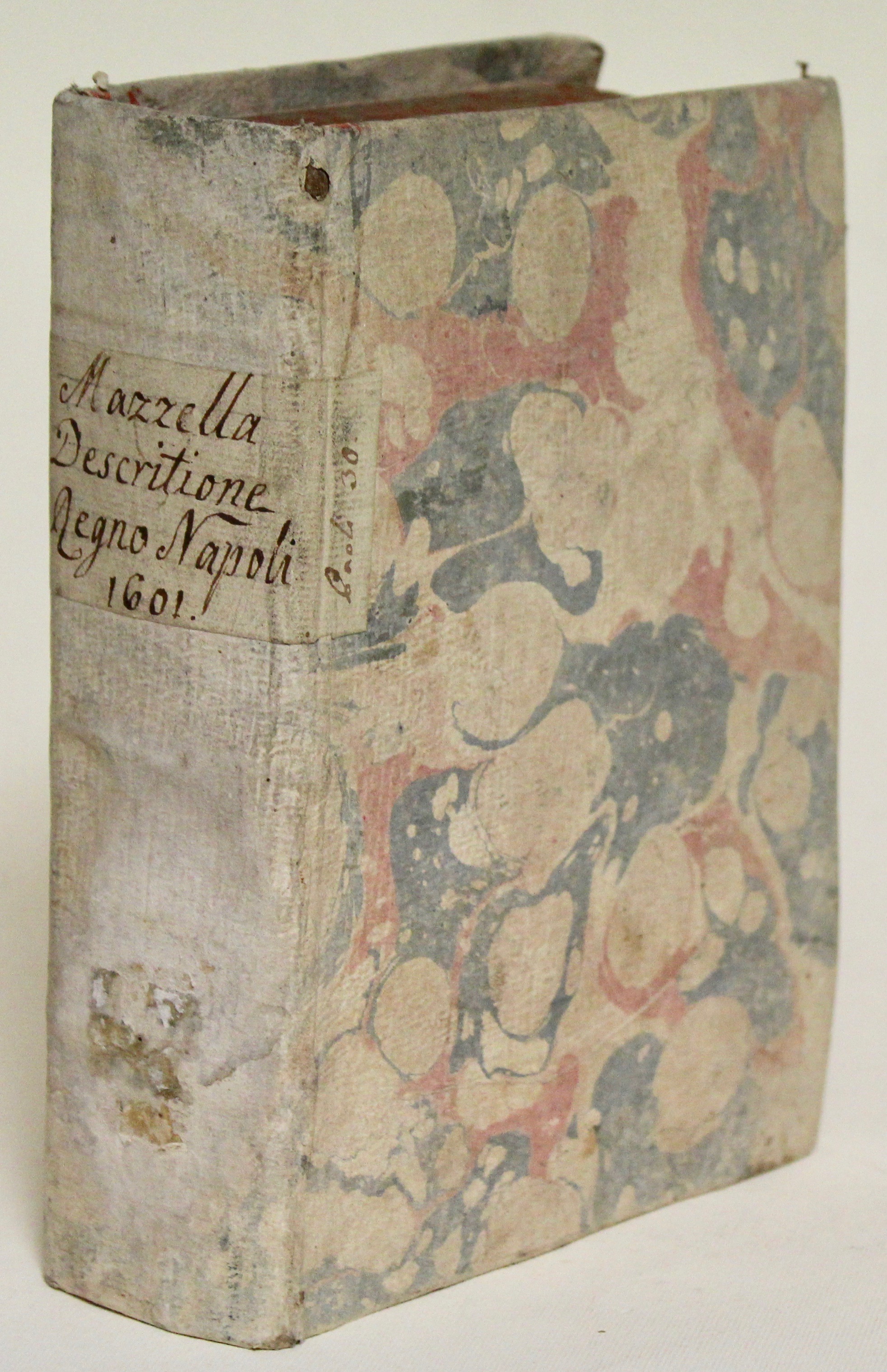 In 4º (mm 210x160); pagg. (12), 790 (i.e. 744), (8). Il secondo libro ha un proprio frontespizio a pag. 320 con bella vignetta in rame marca editoriale della Stamperia della Stigliola: (Napoli, Stamperia della Stigliola, 1597); da pag. 132 vi sono 6 pagg. fuori numerazione e una bianca. Numerose malnumerazioni. Cartonato marezzato con titolo su etichetta manoscritta al dorso. Seconda edizione. Raffinata la veste editoriale con un ricco apparato iconografico, più di 500 eleganti incisioni silografiche con le armi di nobili famiglie spagnole e italiane; grandi capolettera, fregi e decori, finalini incisi in legno. Mazzella, scrittore e storico, nacque a Napoli verso la metà del XVI secolo e vi morì, presumibilmente nei primi anni del XVII secolo.