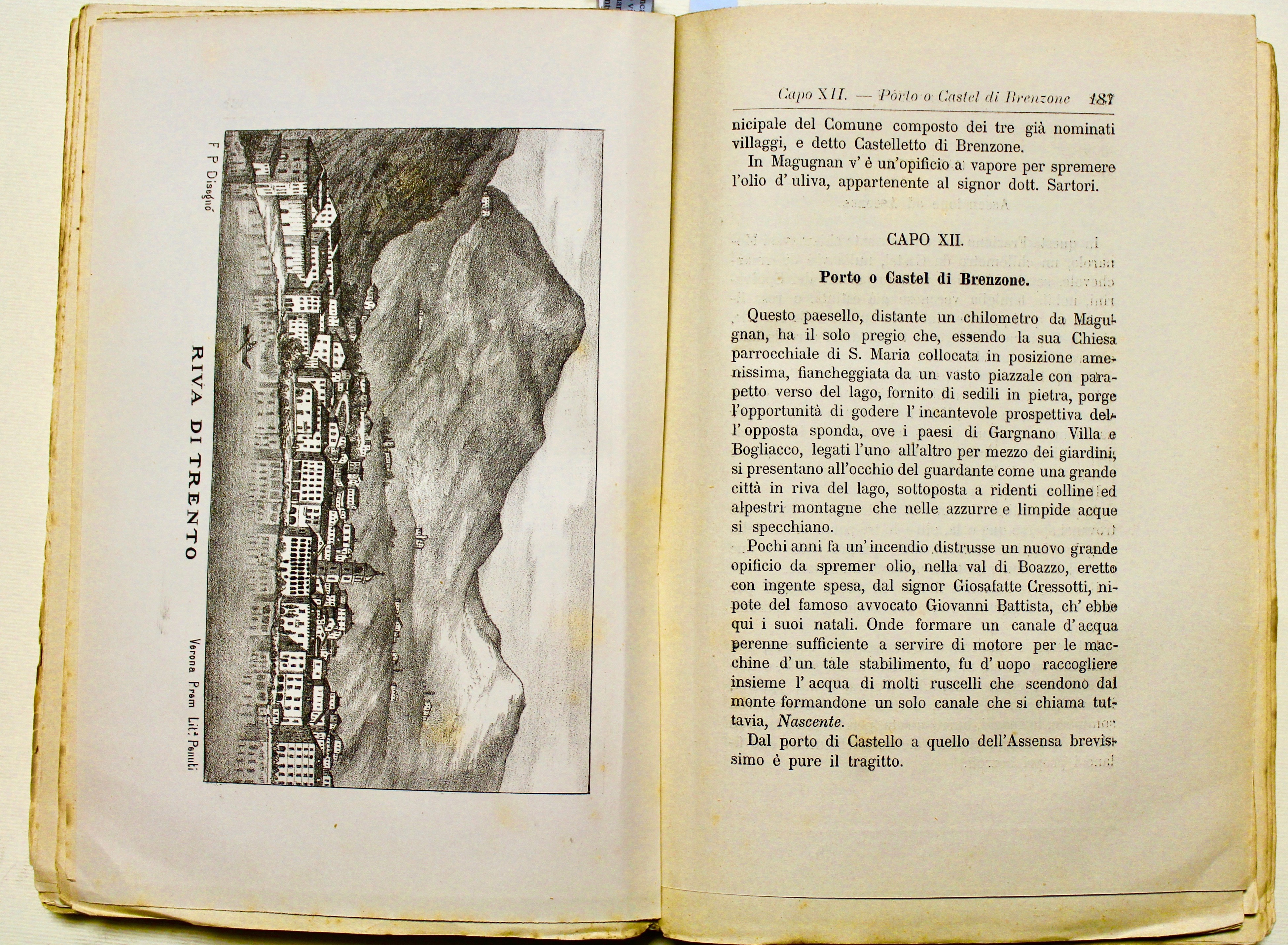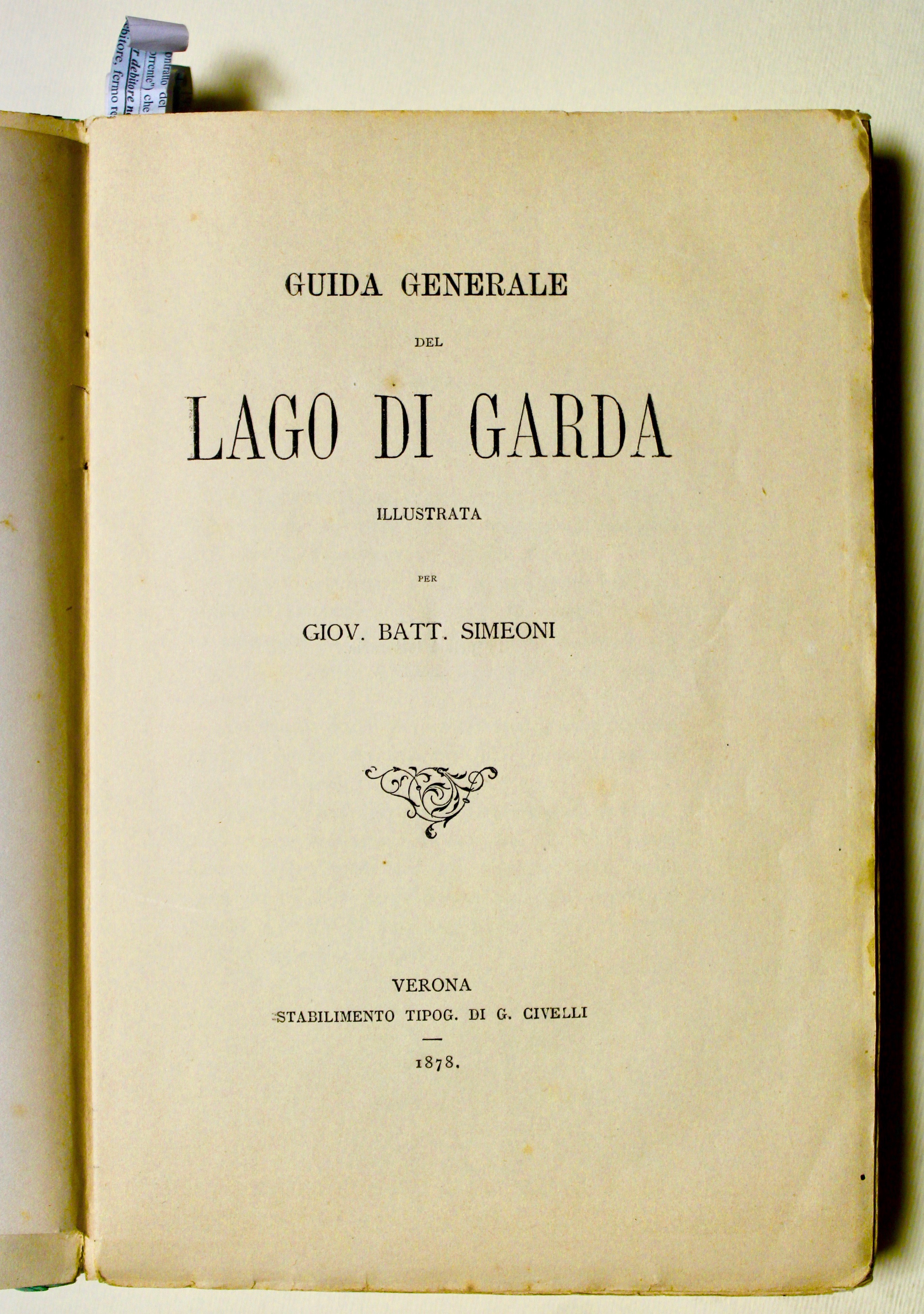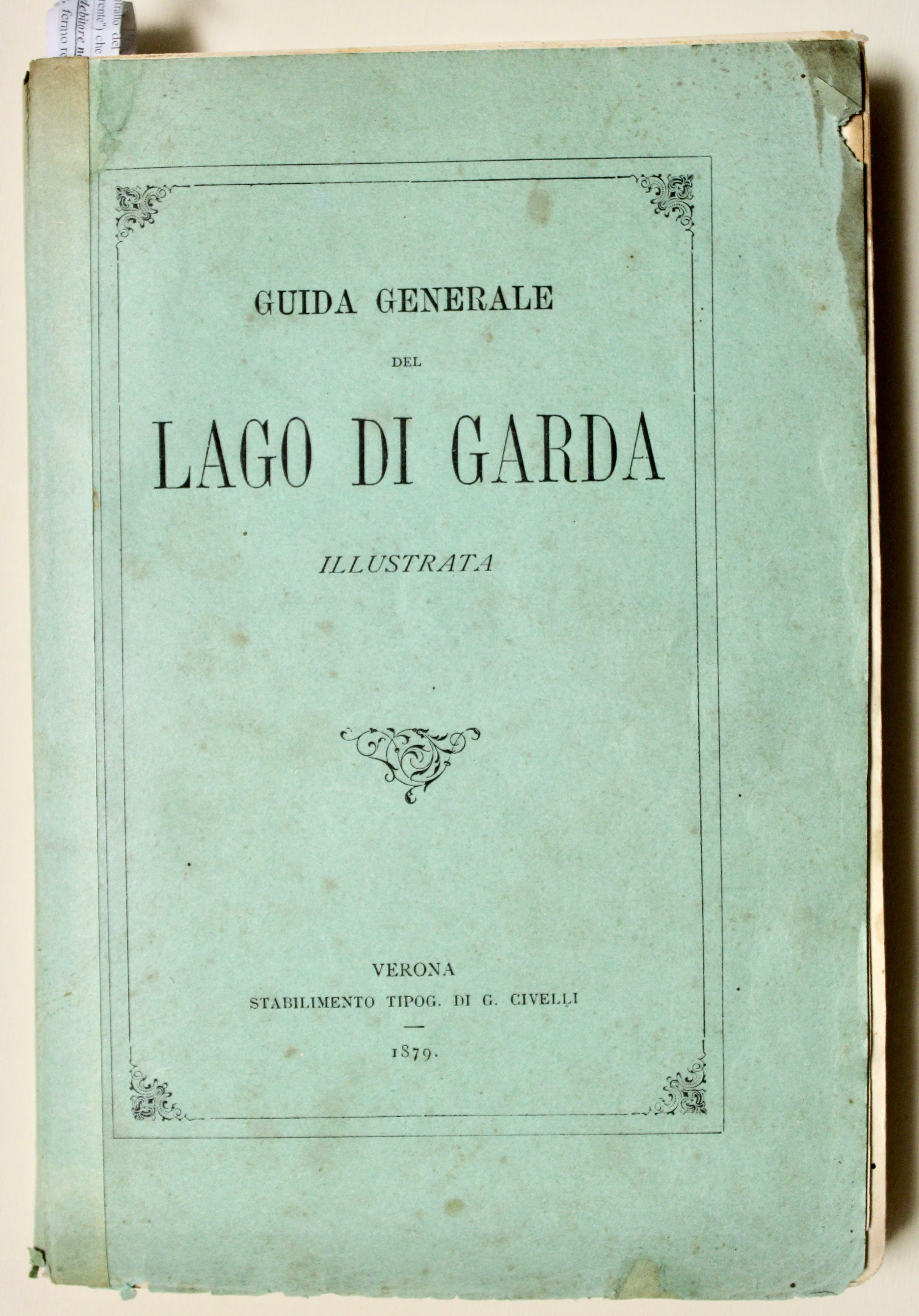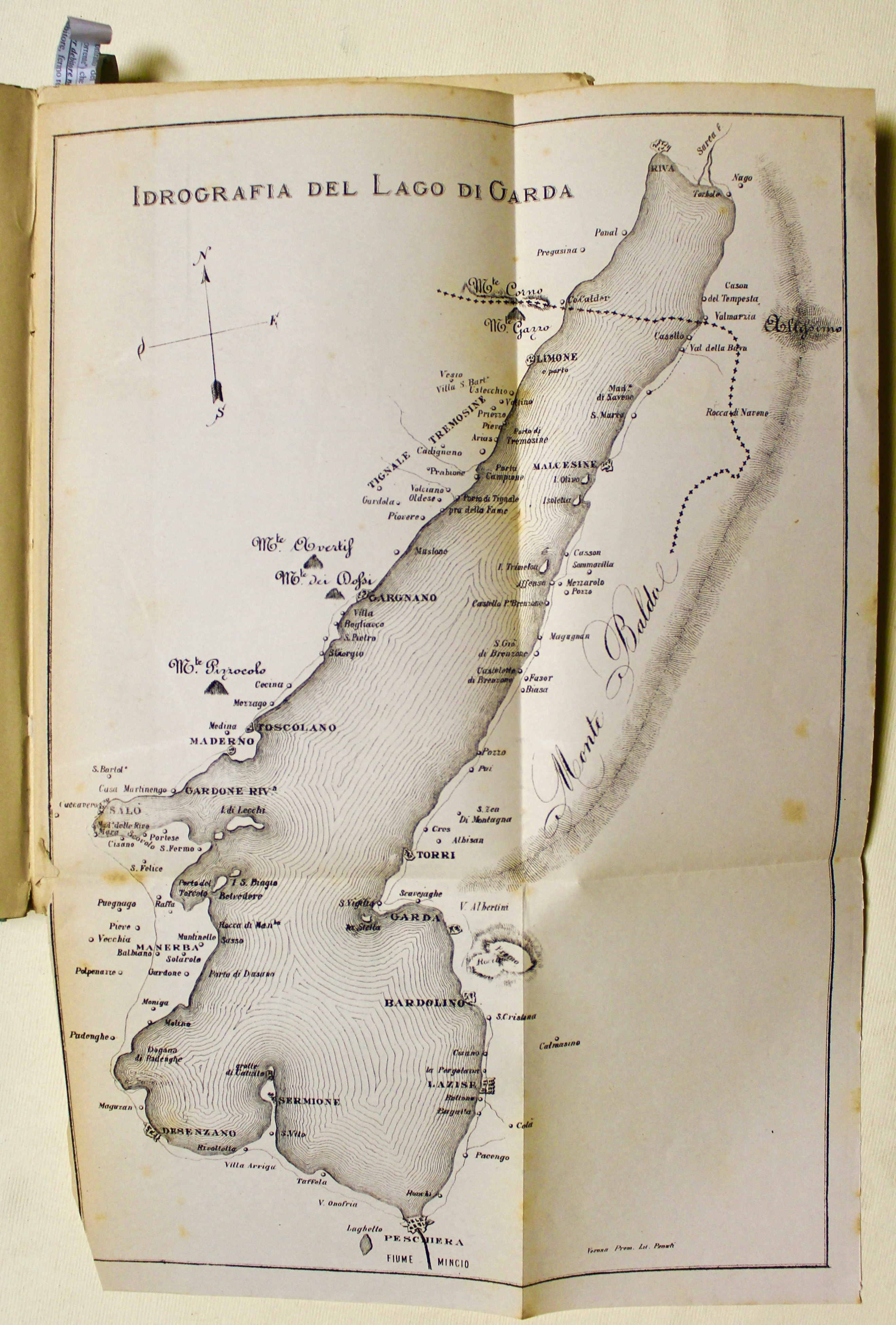 In 8°(mm 220x150). Pagg. 425, 16 piacevoli tavole f.t. del litografo veronese Fioravante Penuti, più una tav. dell’idrografia del lago ripiegata; le tavole raffigurano le principali località del Garda: Peschiera, Lazise, Bardolino, Garda, Torri, Malcesine, Torbole, Riva, Limone, Campione, Gargnano, Maderno, Salò, Isola di Lecchi, Desenzano, Sirmione. Interessante e completa guida che descrive tutti i paesi del Benaco, la prima relazione (le precedenti risultano sempre guide parziali) così accurata dal punto di vista artistico - letterario, naturalistico e archeologico. Brossura a stampa verde coeva, dorso rinforzato. Obiettivo principale della nostra guida, oltre a dedicare un encomio all’illustre e prediletto Garda, è quello di accompagnare orientando il visitatore nei vari percorsi, spiegando le esatte nozioni storiche e topografiche dei luoghi, regalando i più soavi scorci, gustandone autentiche emozioni. Ottimo esemplare in barbe.