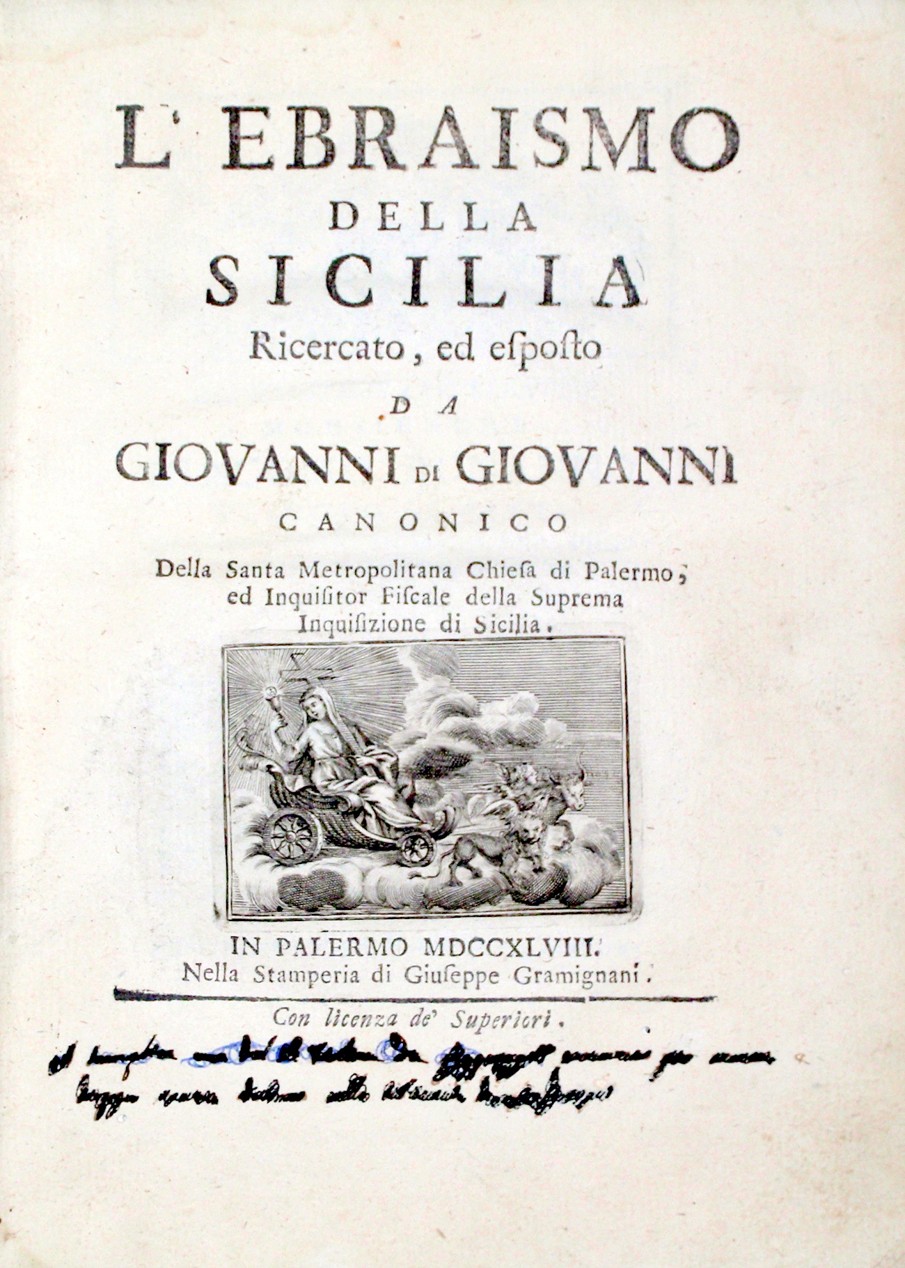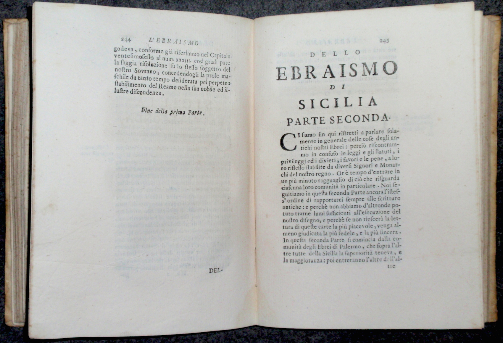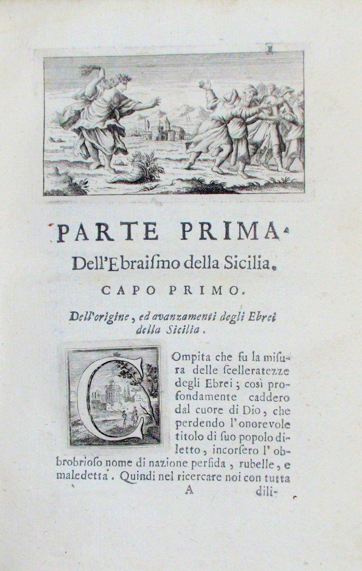 In 4°(240x170mm); pagg. (2), XX, 424. Bella vignetta in rame al frontespizio, altre due testatine incise una con le armi di Mons. Giacomo Bonanno, vescovo di Patti, a cui l'opera e' dedicata; altra vignetta a pag. 1, due iniziali incise sempre in rame. Pergamena rigida coeva con titolo impresso in oro al dorso. Prima edizione di questa rara opera sulla storia degli Ebrei di Sicilia, terra ricca di comunità ebraiche. L'opera e' divisa in due parti. Nella prima tratta della condizione degli ebrei nell'isola; nella seconda descrive tutte le loro comunità nelle località siciliane.