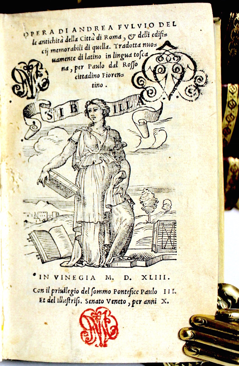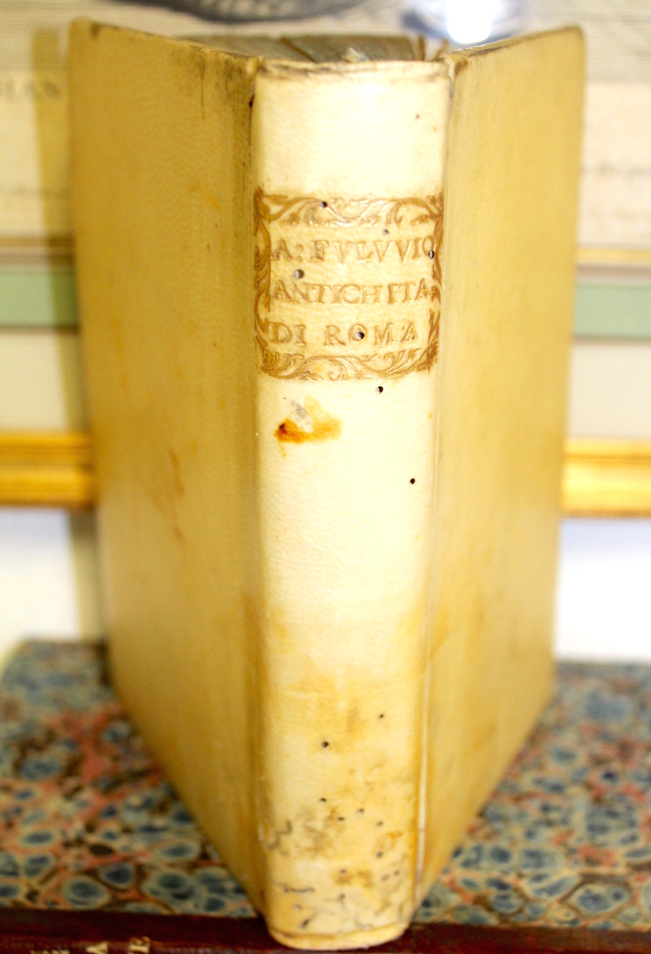 In 16° (153x100). Carte non num. 4, carte numerate 224, 8 carte n.n., (di cui le prime 6 con la tavola di tutte le cose .., l’ottava ed ultima con la marca tipografica raffigurante la Sibilla incisa in legno che è ripetuta anche al frontespizio). Leg. settecentesca in pergamena rigida con titolo in oro al dorso, tagli azzurri. Prima edizione italiana della prima vera descrizione topografica di Roma, redatta dall’erudito umanista ed antiquario Andrea Fulvio, (1470 – 1527), nella quale fornisce una chiara descrizione di quanto era rimasto delle antiche vestigia romane nel primo cinquecento; l’autore dedica inoltre delle pagine all’introduzione della stampa a Roma e delle prime collezioni private di antichità, tra cui quella di Colocci e quella di numismatica, del cardinale Andrea Della Valle. Buon esemplare genuino, ben impresso, che presenta alcuni tarletti restaurati al margine int. delle prime carte ed altri fori al medesimo margine in tutto il libro. Dorso con traccia di tarli restaurati in basso. Alone persistente alle ultime carte. Timbrini con monogrammi al frontespizio. Schudt 599; Rossetti 5155, G - 302; Graesse, II, 646; Adams, F-1154.